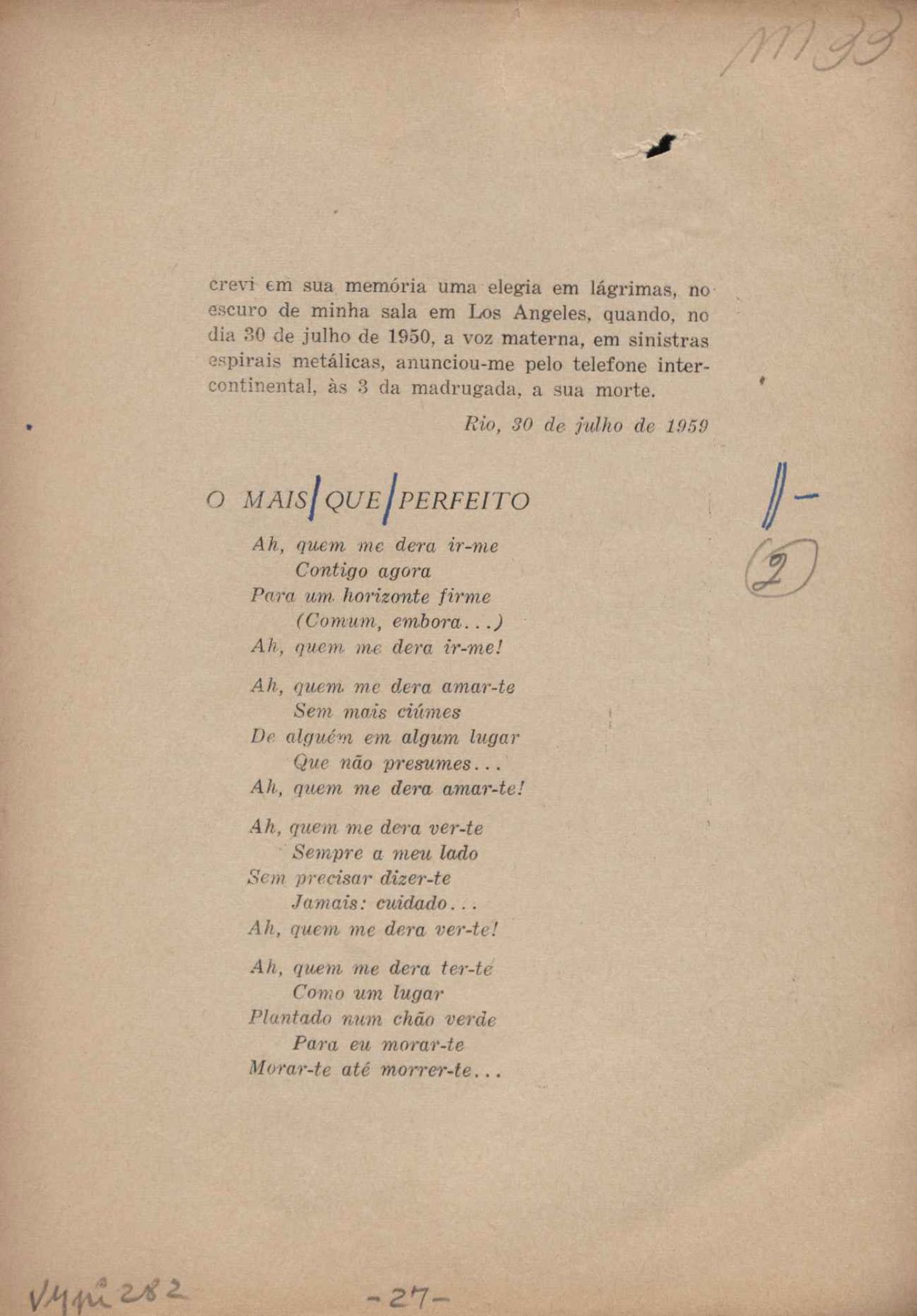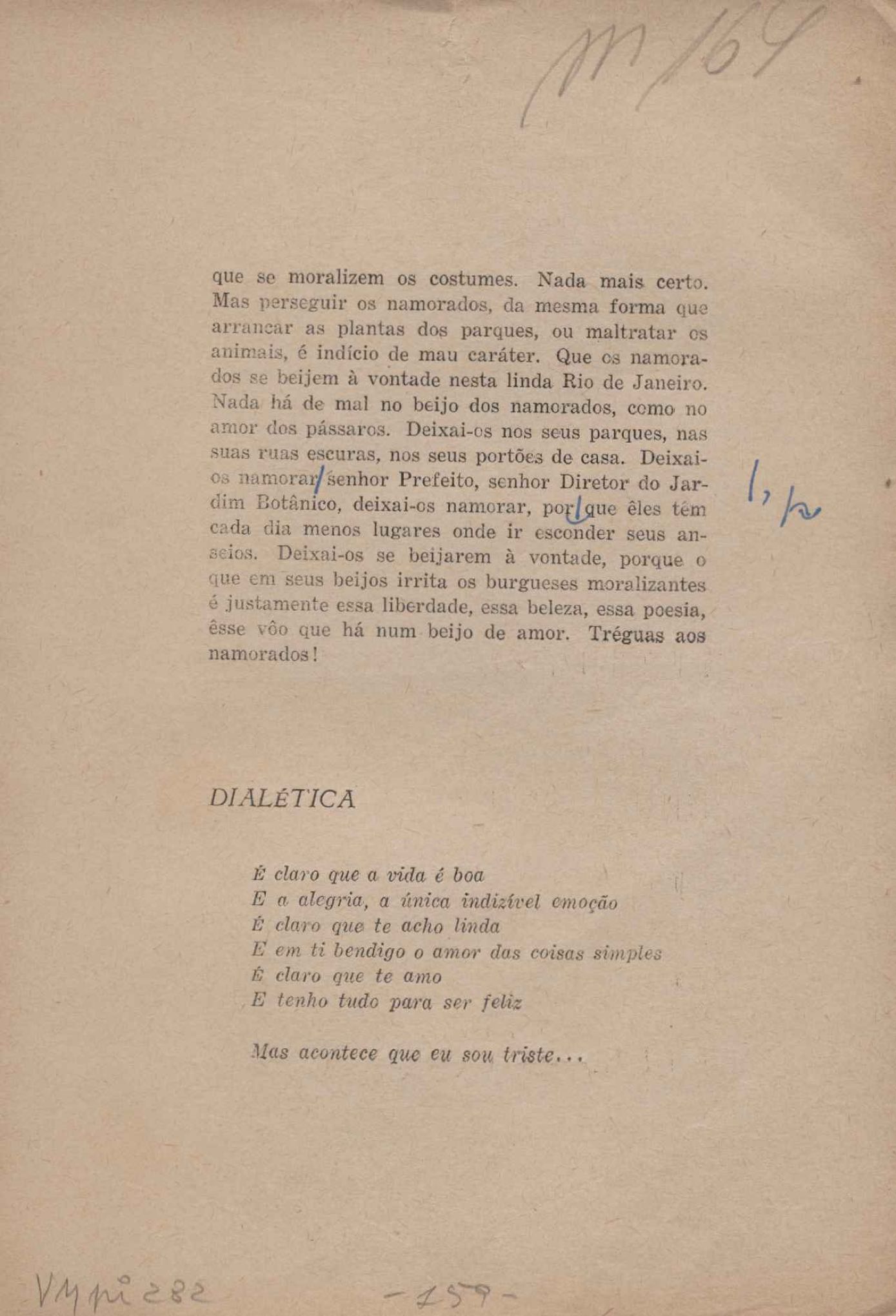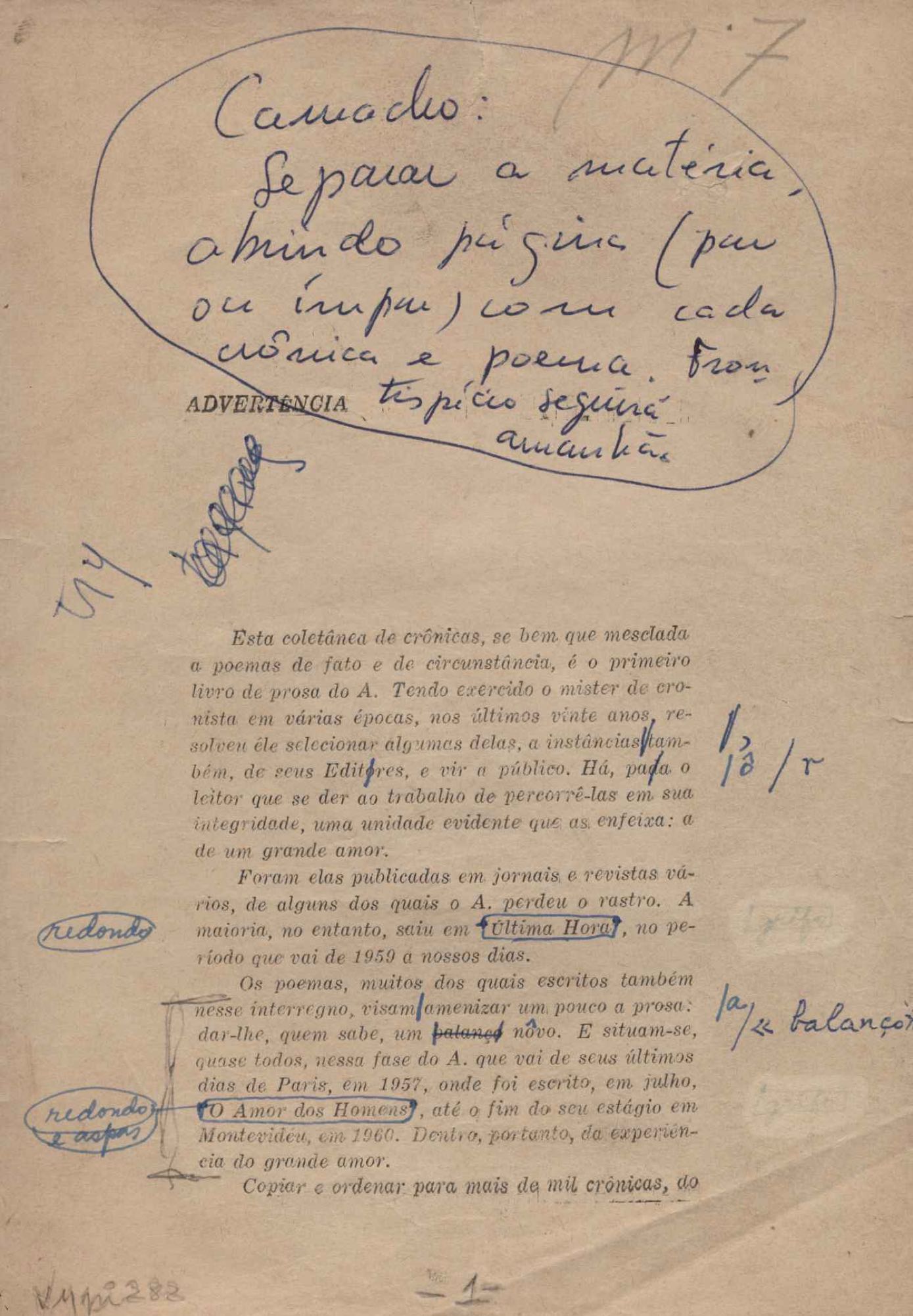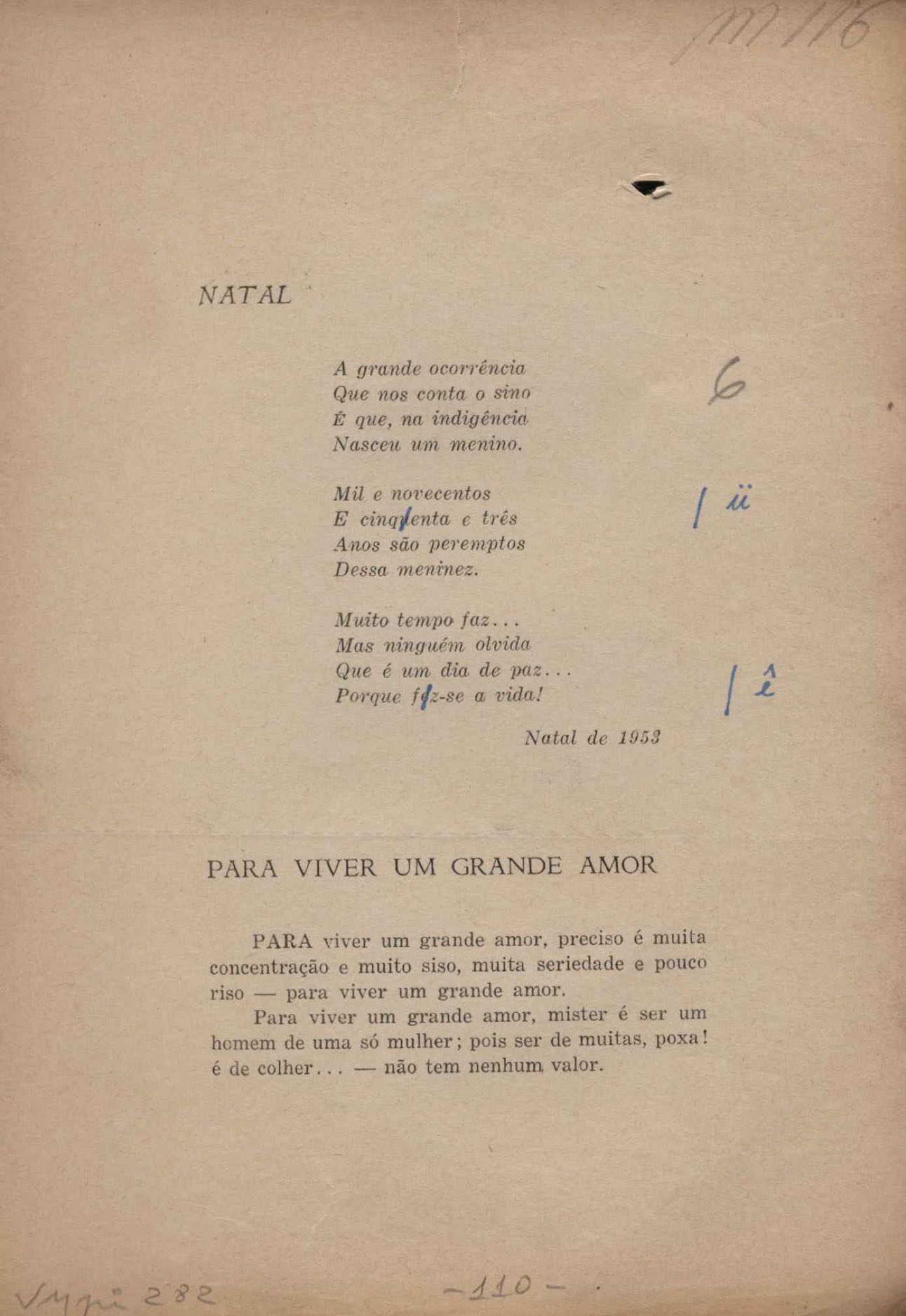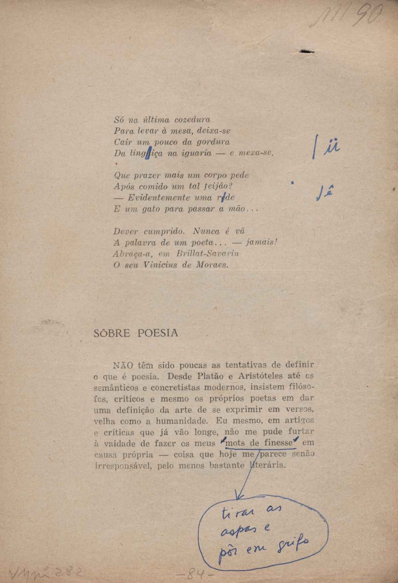 Prova tipográfica da [primeira edição?]. Prosa (1). Anexo: 1. Prova tipográfica incompleta; 2. Outras versões manuscritas e datilografadas, com emendas de: "O amor dos homens", "Antiode à tristeza", "Um beijo", "Blues para Emmett Louis Till", "Canção para a amiga dormindo", "Carta aos puros", "Carta do ausente", "... Deinde Philosophari [publ. "O mosquito"], "Dialética", "Dois poeminhas com Sputnik", "Duas canções de silêncio", "Of gold and God [publ. "Of God and gold"], "Look here, Mr. Buster..." [publ. "Olhe aqui, Mr. Buster..."], "O mais-que-perfeito", "O Margarida's", "As mulheres ocas", "Namorados no mirante", "Natal", "O ônibus Grayhound atravessa o Novo México", "Para viver um grande amor", "Pedro, meu filho", "Poema para Gilberto Amado", "O poeta aprendiz", "O poeta e a rosa", "O poeta", "Quinta rima" [publ. "Lapa de Bandeira"], "Teu nome" e "A última viagem de Jayme Ovalle".