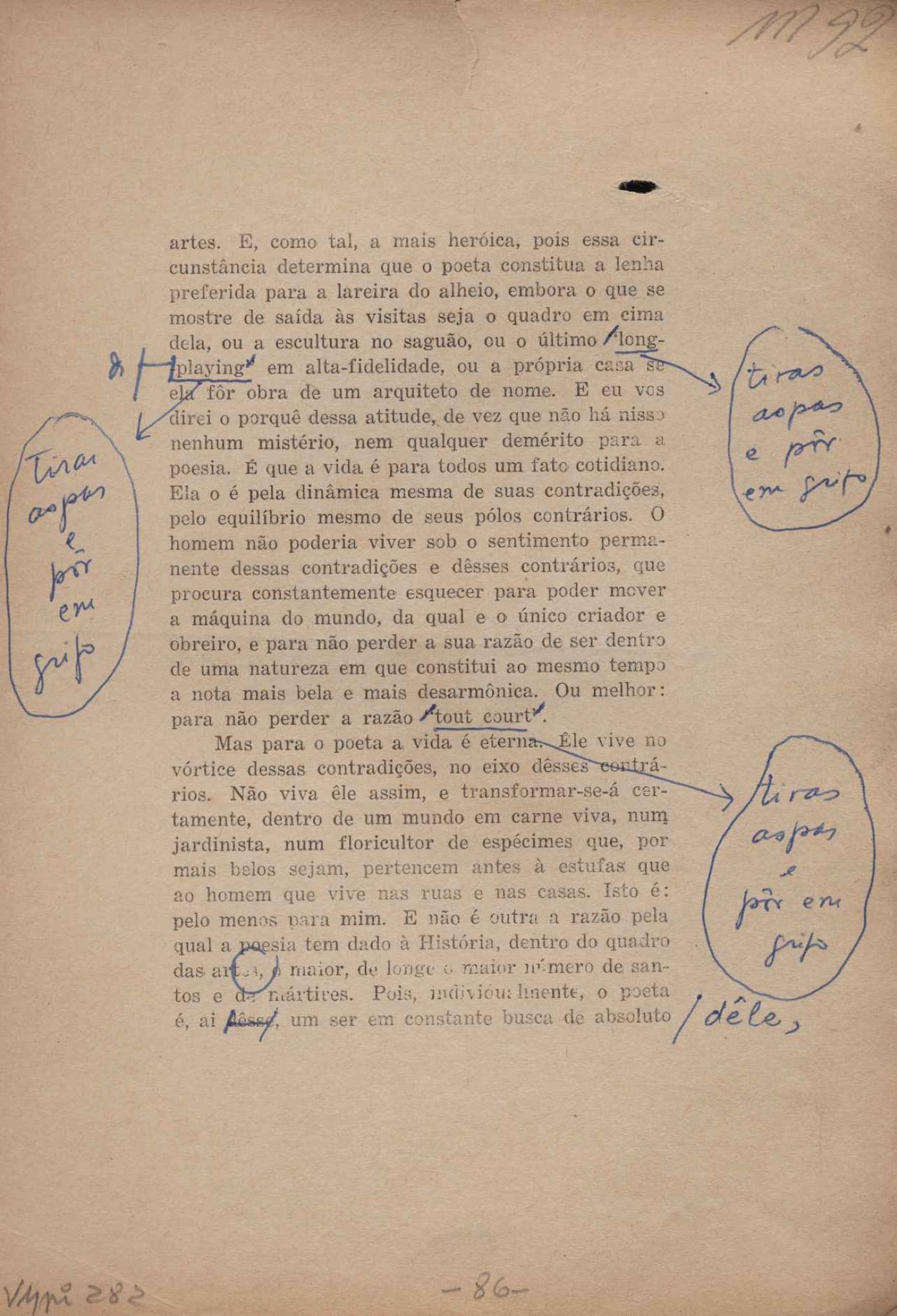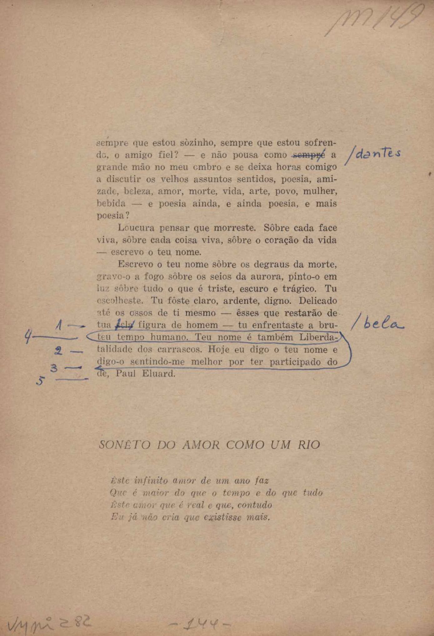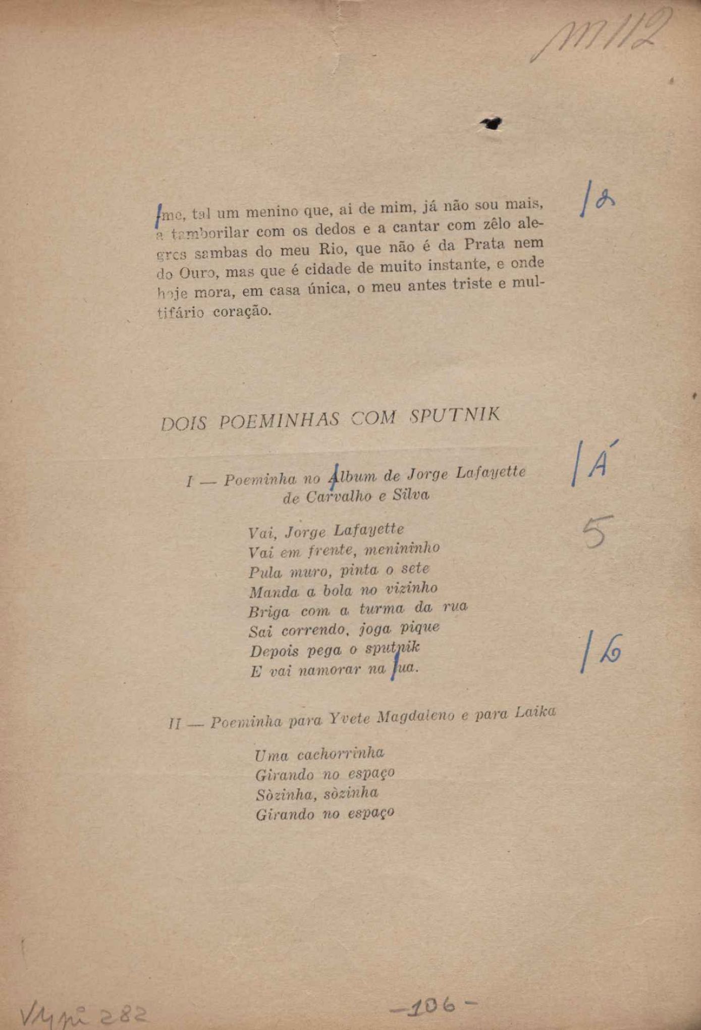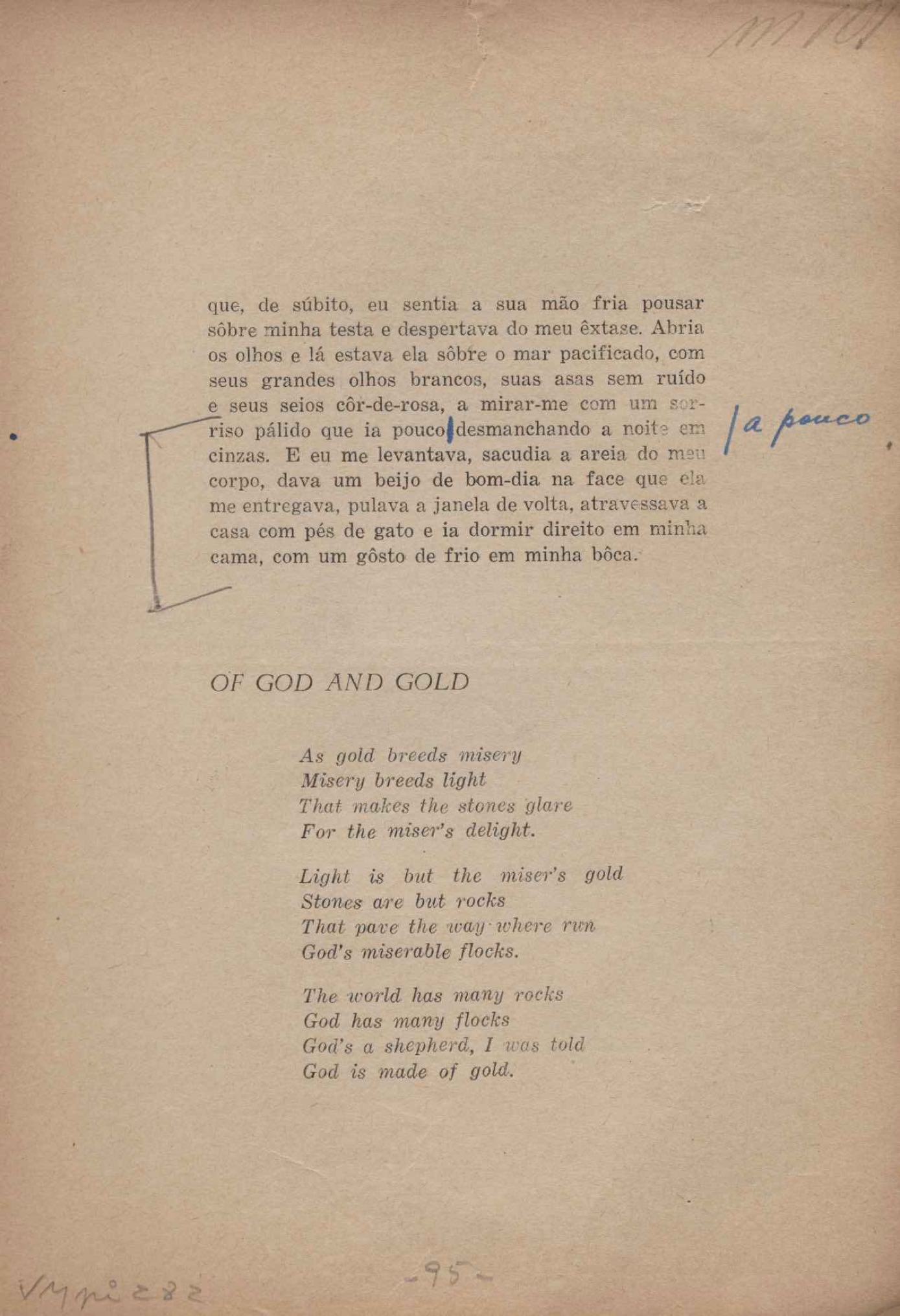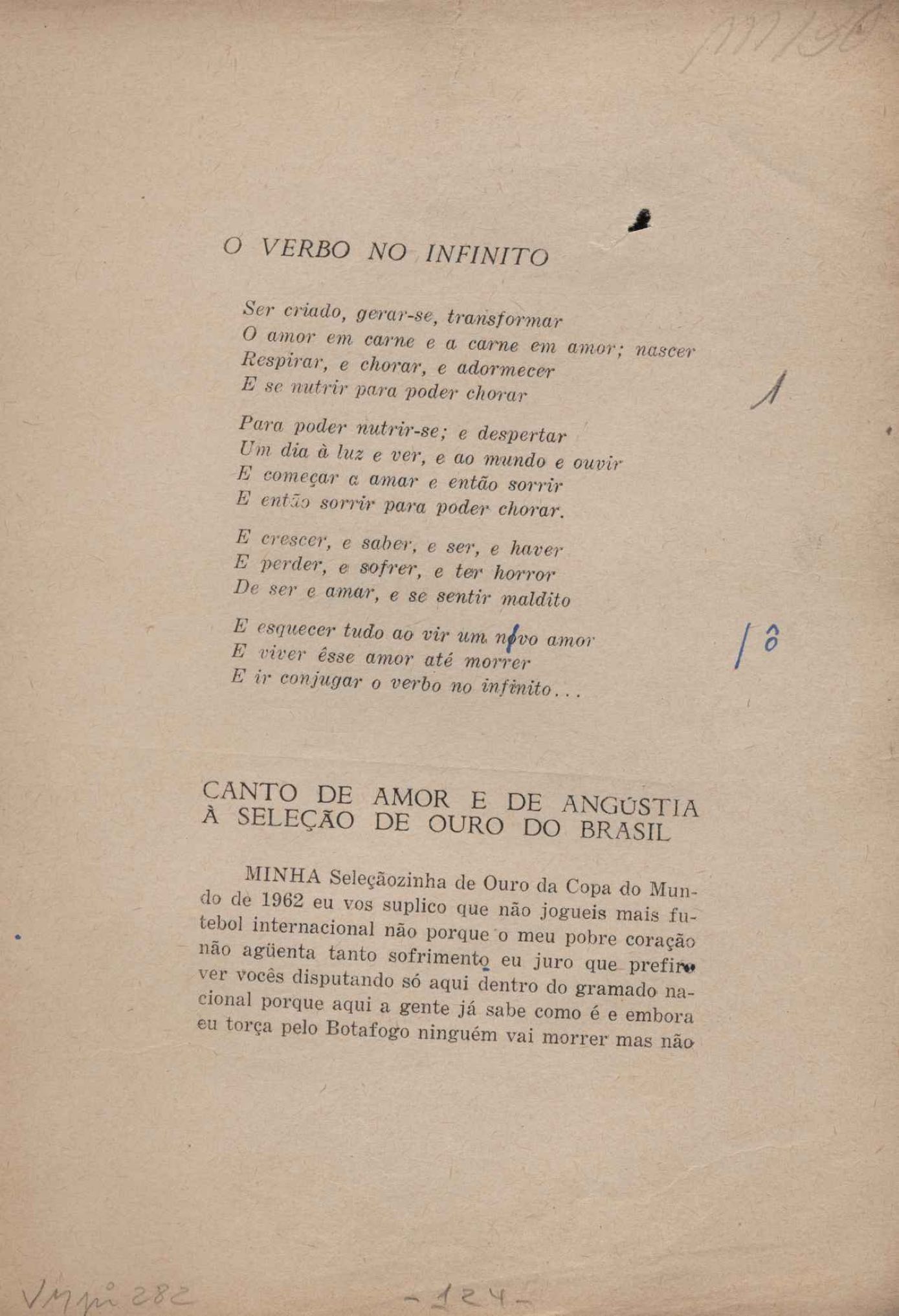 Prova tipográfica da [primeira edição?]. Prosa (1). Anexo: 1. Prova tipográfica incompleta; 2. Outras versões manuscritas e datilografadas, com emendas de: "O amor dos homens", "Antiode à tristeza", "Um beijo", "Blues para Emmett Louis Till", "Canção para a amiga dormindo", "Carta aos puros", "Carta do ausente", "... Deinde Philosophari [publ. "O mosquito"], "Dialética", "Dois poeminhas com Sputnik", "Duas canções de silêncio", "Of gold and God [publ. "Of God and gold"], "Look here, Mr. Buster..." [publ. "Olhe aqui, Mr. Buster..."], "O mais-que-perfeito", "O Margarida's", "As mulheres ocas", "Namorados no mirante", "Natal", "O ônibus Grayhound atravessa o Novo México", "Para viver um grande amor", "Pedro, meu filho", "Poema para Gilberto Amado", "O poeta aprendiz", "O poeta e a rosa", "O poeta", "Quinta rima" [publ. "Lapa de Bandeira"], "Teu nome" e "A última viagem de Jayme Ovalle".