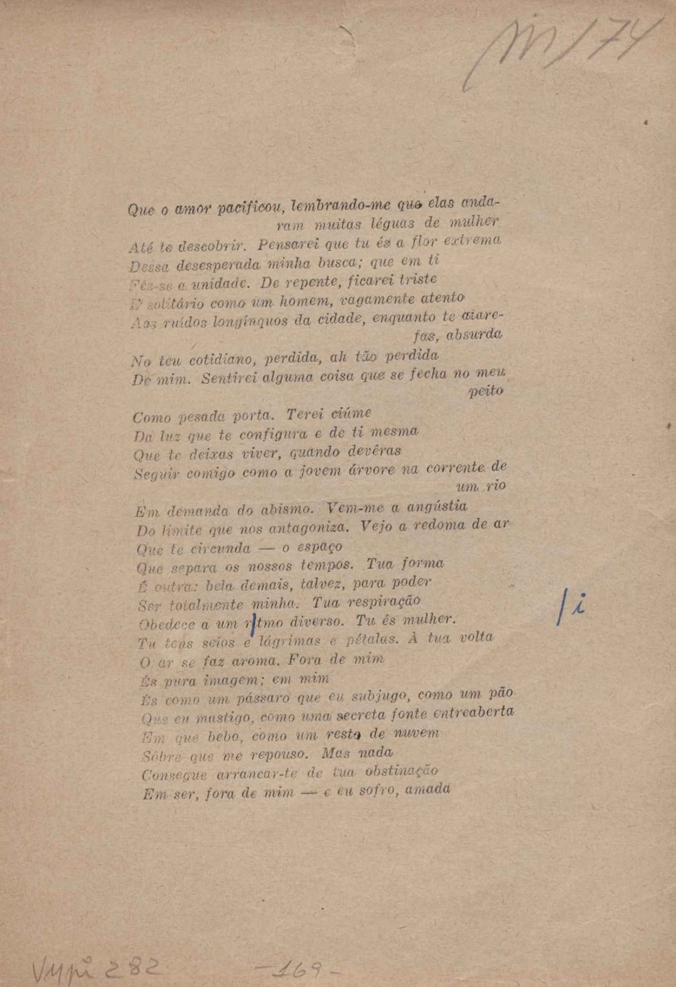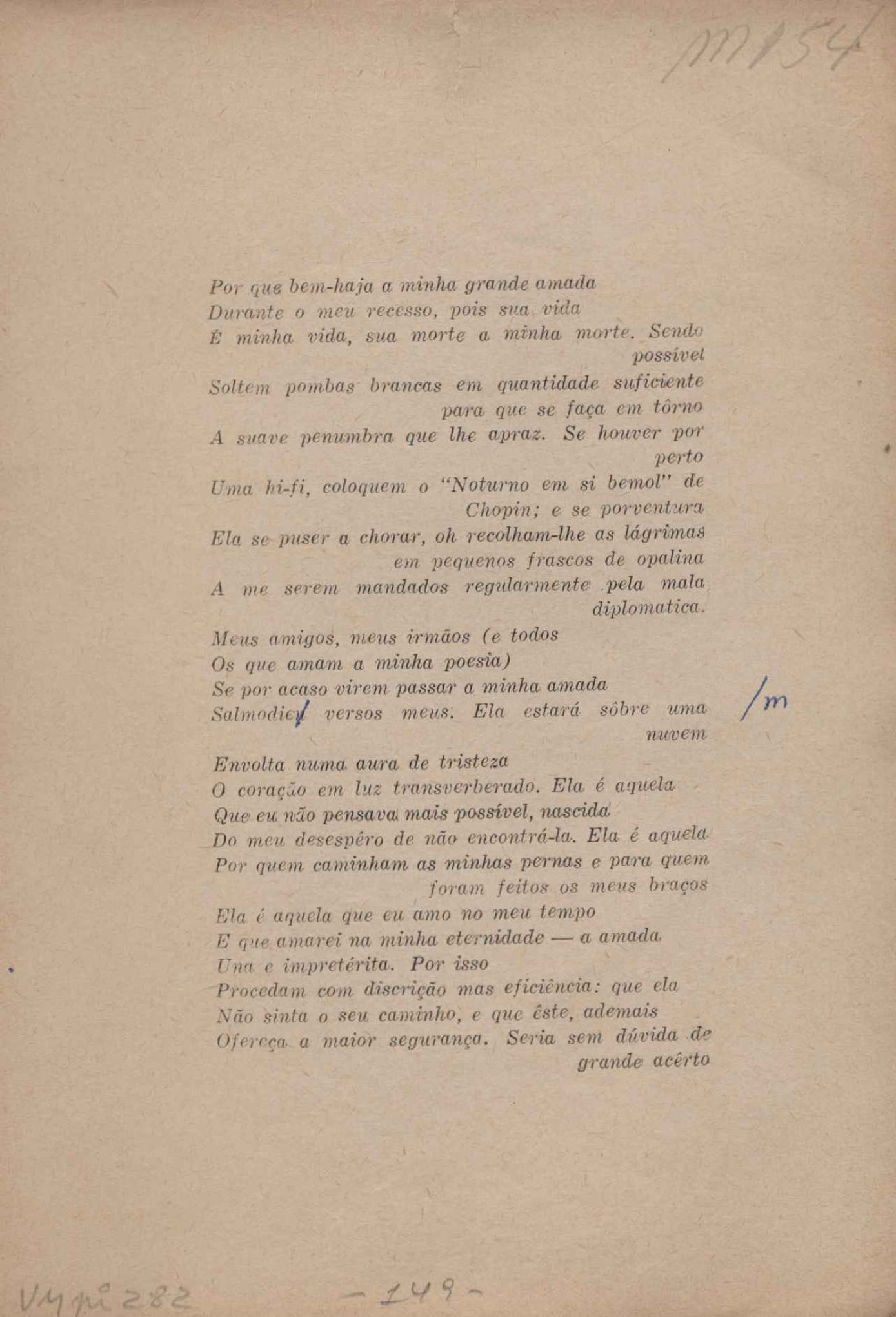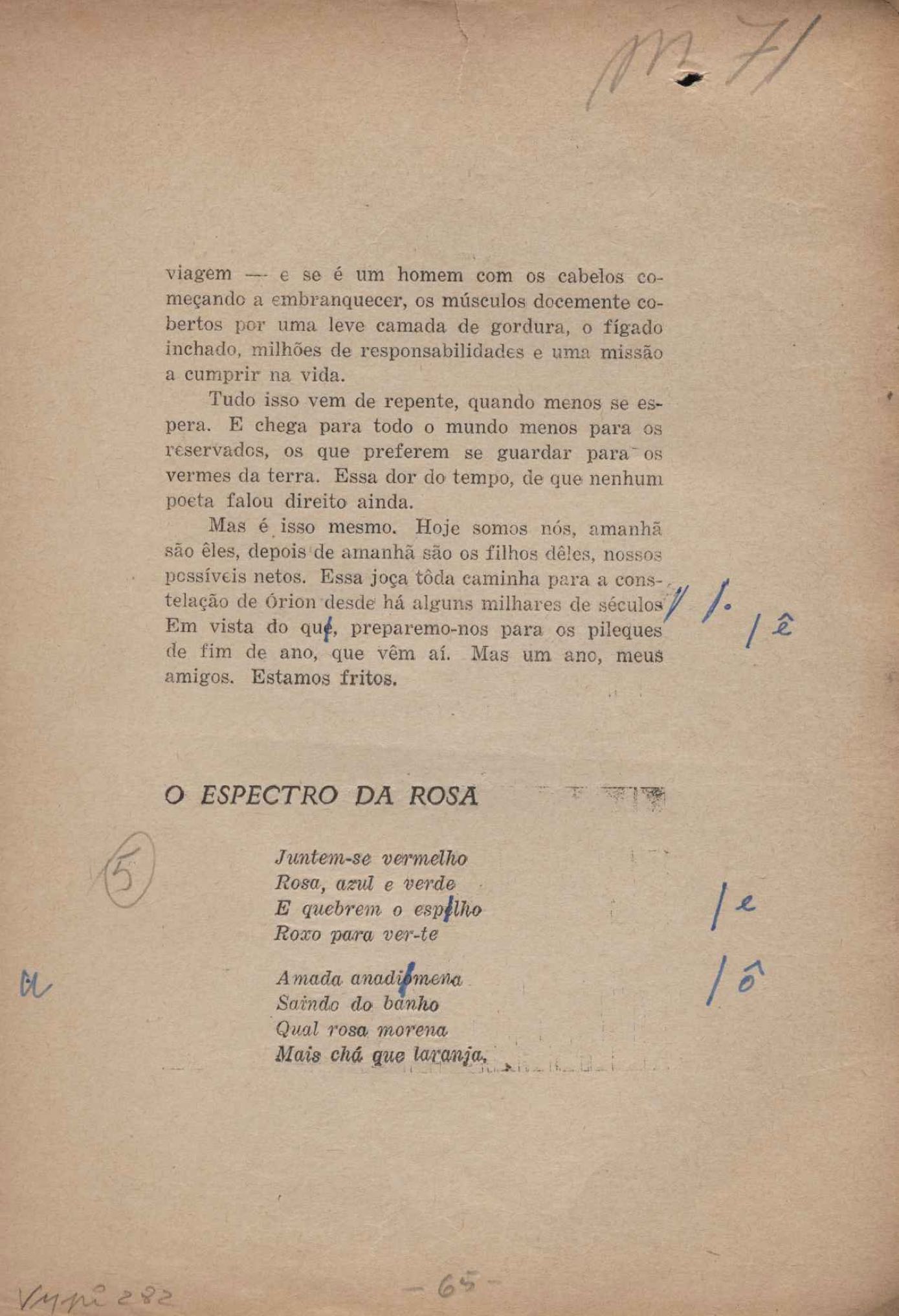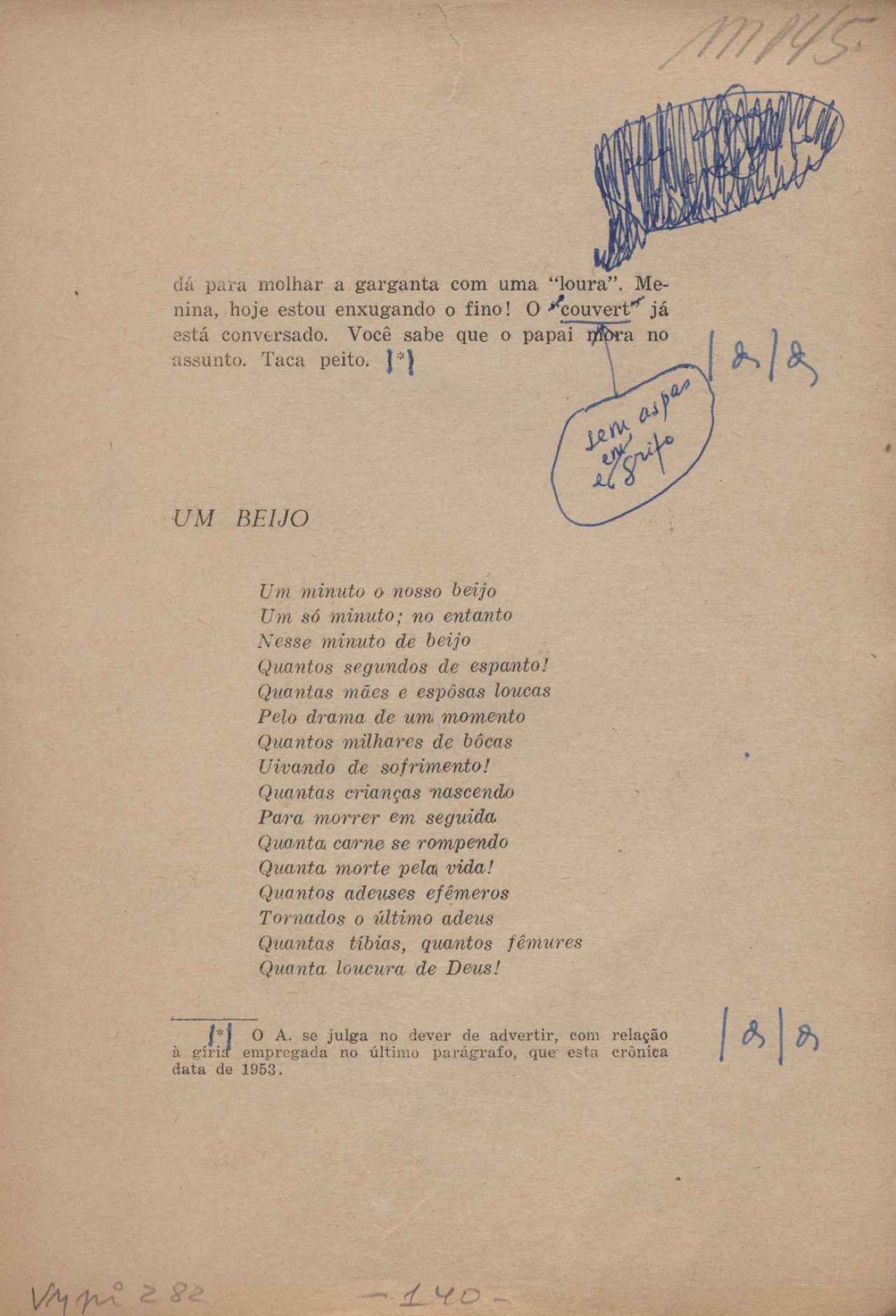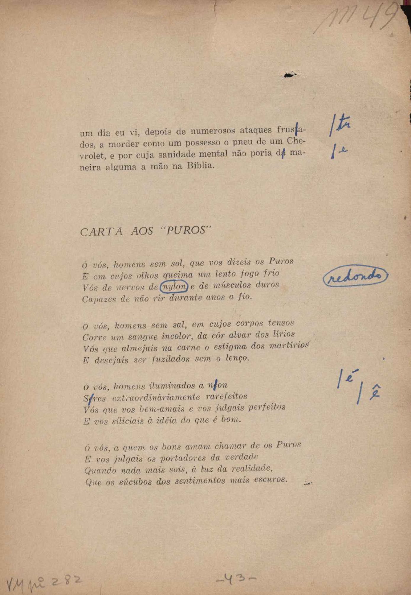 Prova tipográfica da [primeira edição?]. Prosa (1). Anexo: 1. Prova tipográfica incompleta; 2. Outras versões manuscritas e datilografadas, com emendas de: "O amor dos homens", "Antiode à tristeza", "Um beijo", "Blues para Emmett Louis Till", "Canção para a amiga dormindo", "Carta aos puros", "Carta do ausente", "... Deinde Philosophari [publ. "O mosquito"], "Dialética", "Dois poeminhas com Sputnik", "Duas canções de silêncio", "Of gold and God [publ. "Of God and gold"], "Look here, Mr. Buster..." [publ. "Olhe aqui, Mr. Buster..."], "O mais-que-perfeito", "O Margarida's", "As mulheres ocas", "Namorados no mirante", "Natal", "O ônibus Grayhound atravessa o Novo México", "Para viver um grande amor", "Pedro, meu filho", "Poema para Gilberto Amado", "O poeta aprendiz", "O poeta e a rosa", "O poeta", "Quinta rima" [publ. "Lapa de Bandeira"], "Teu nome" e "A última viagem de Jayme Ovalle".