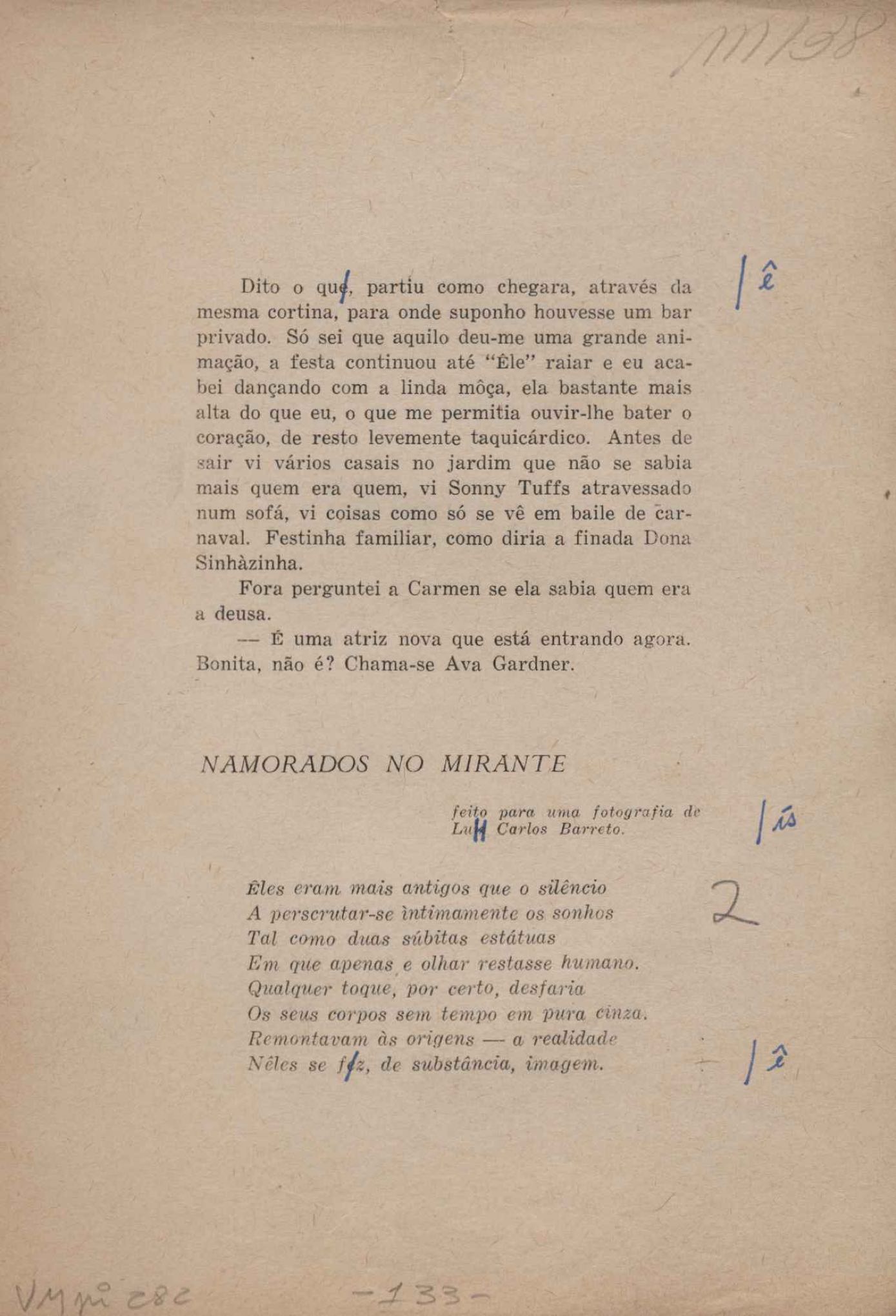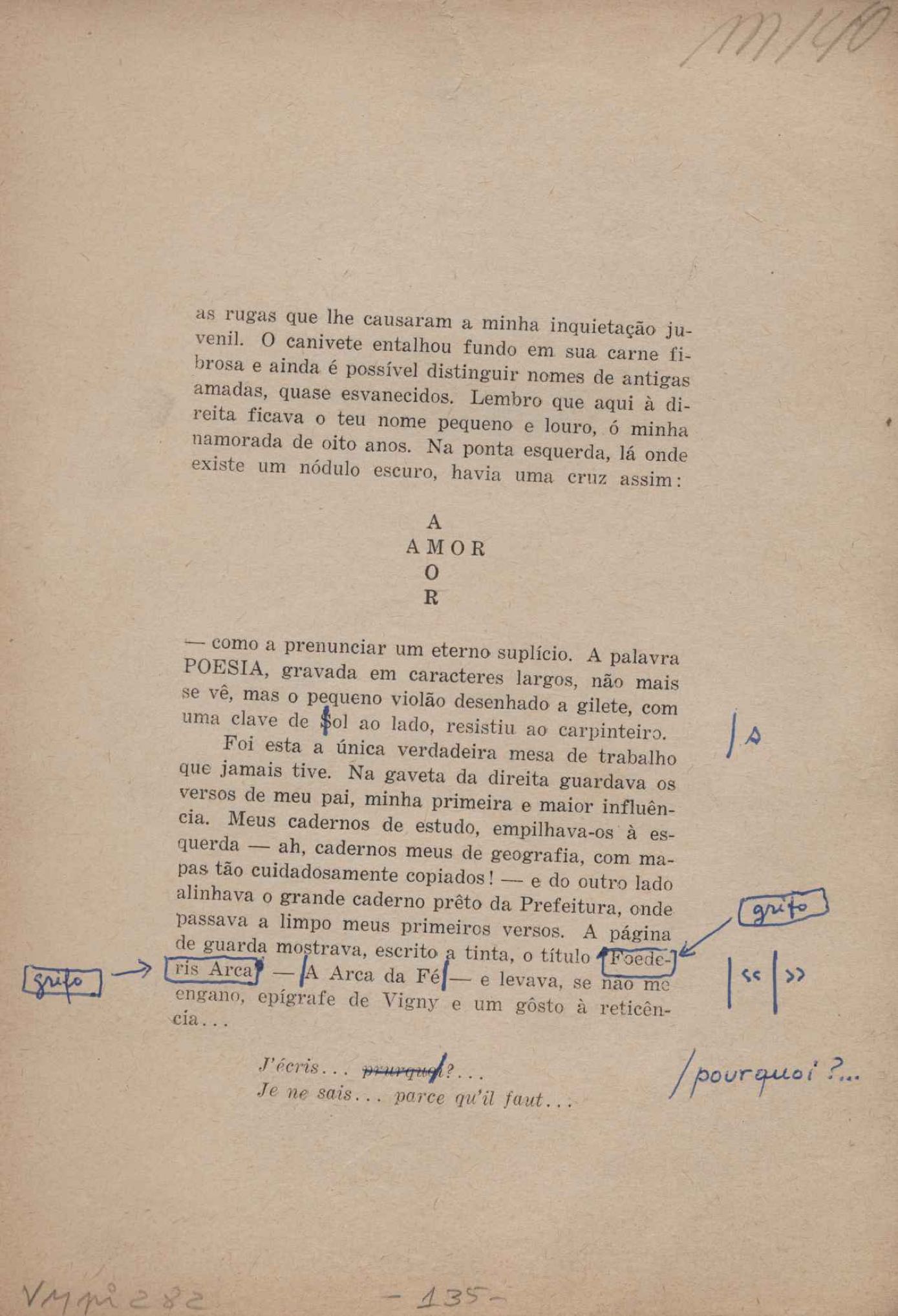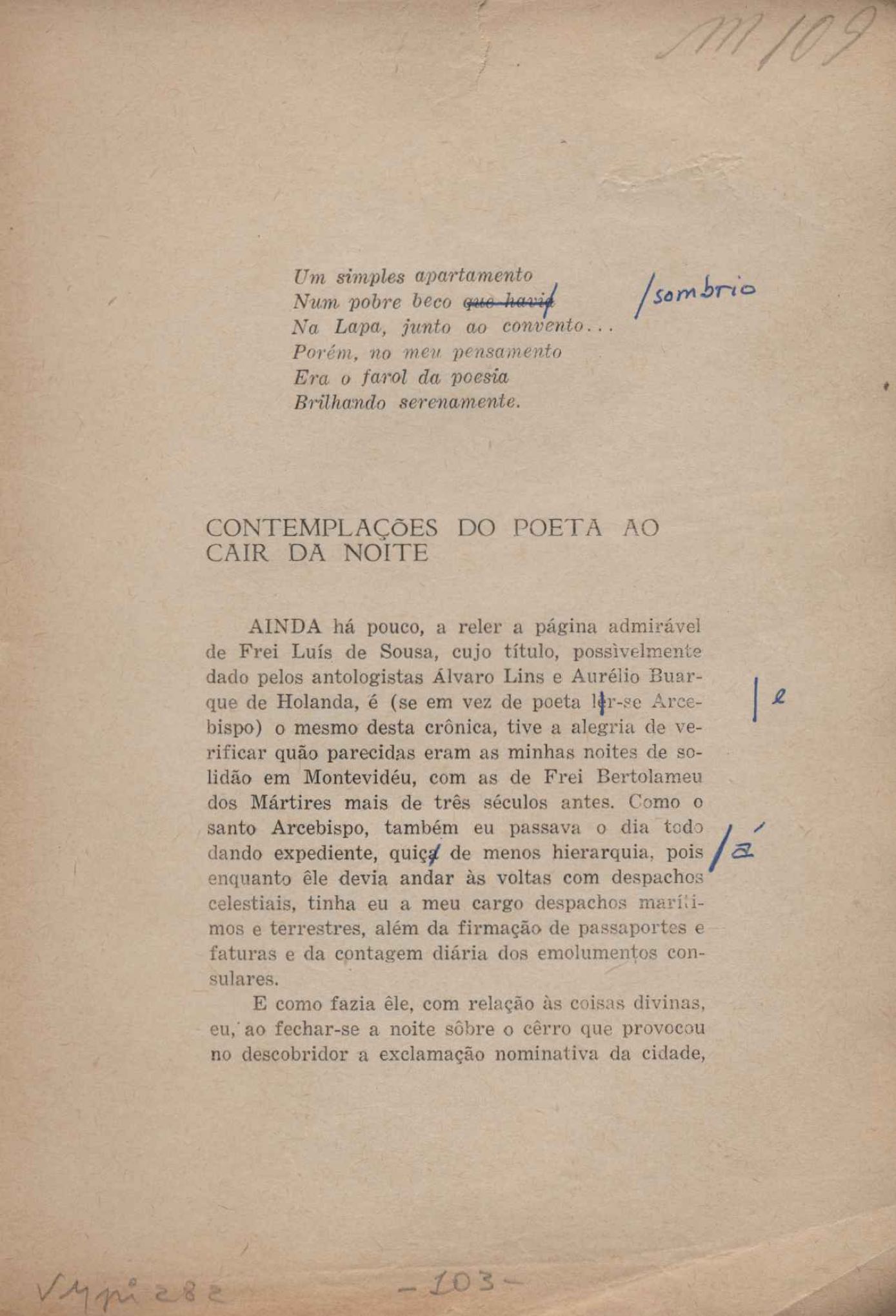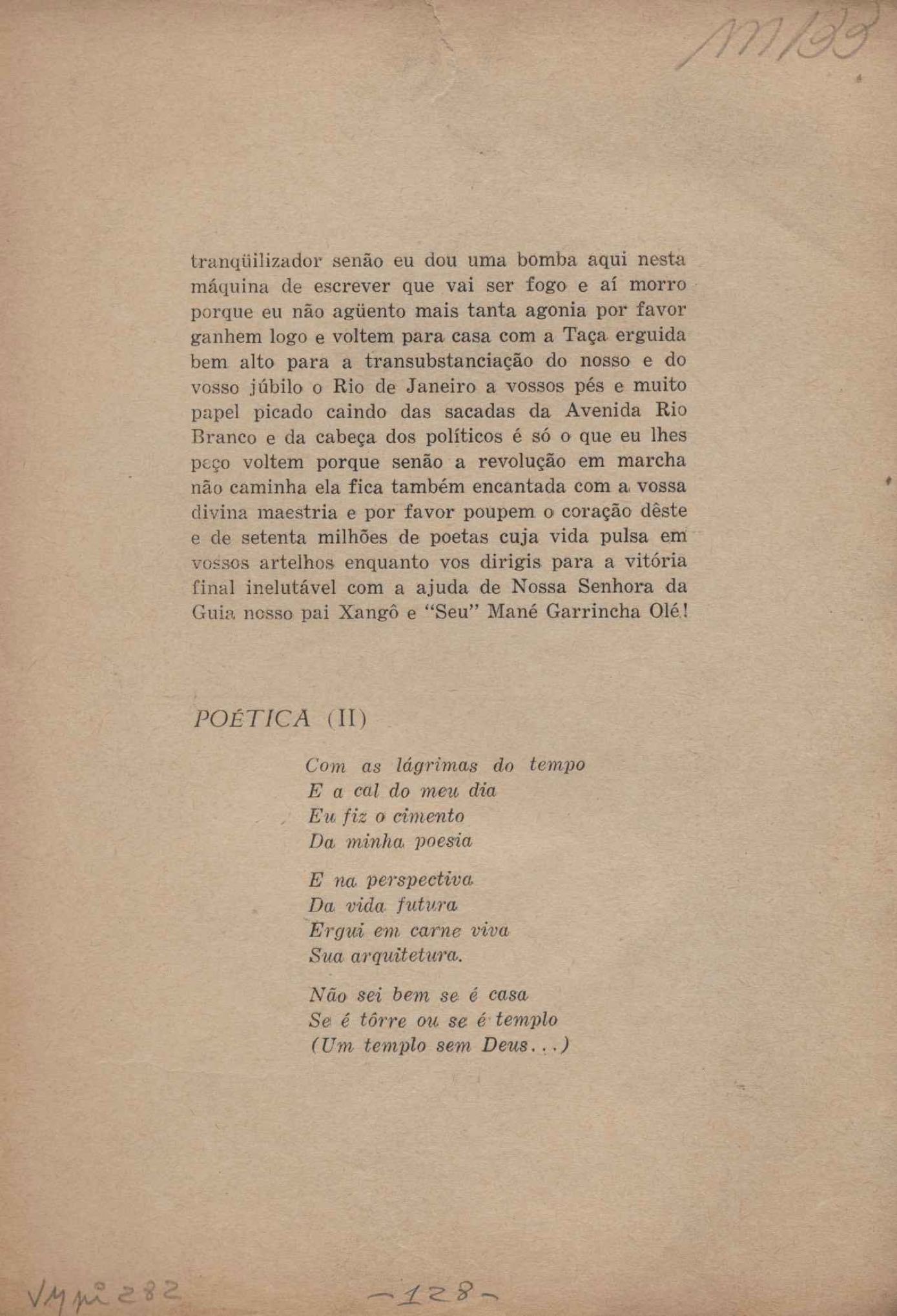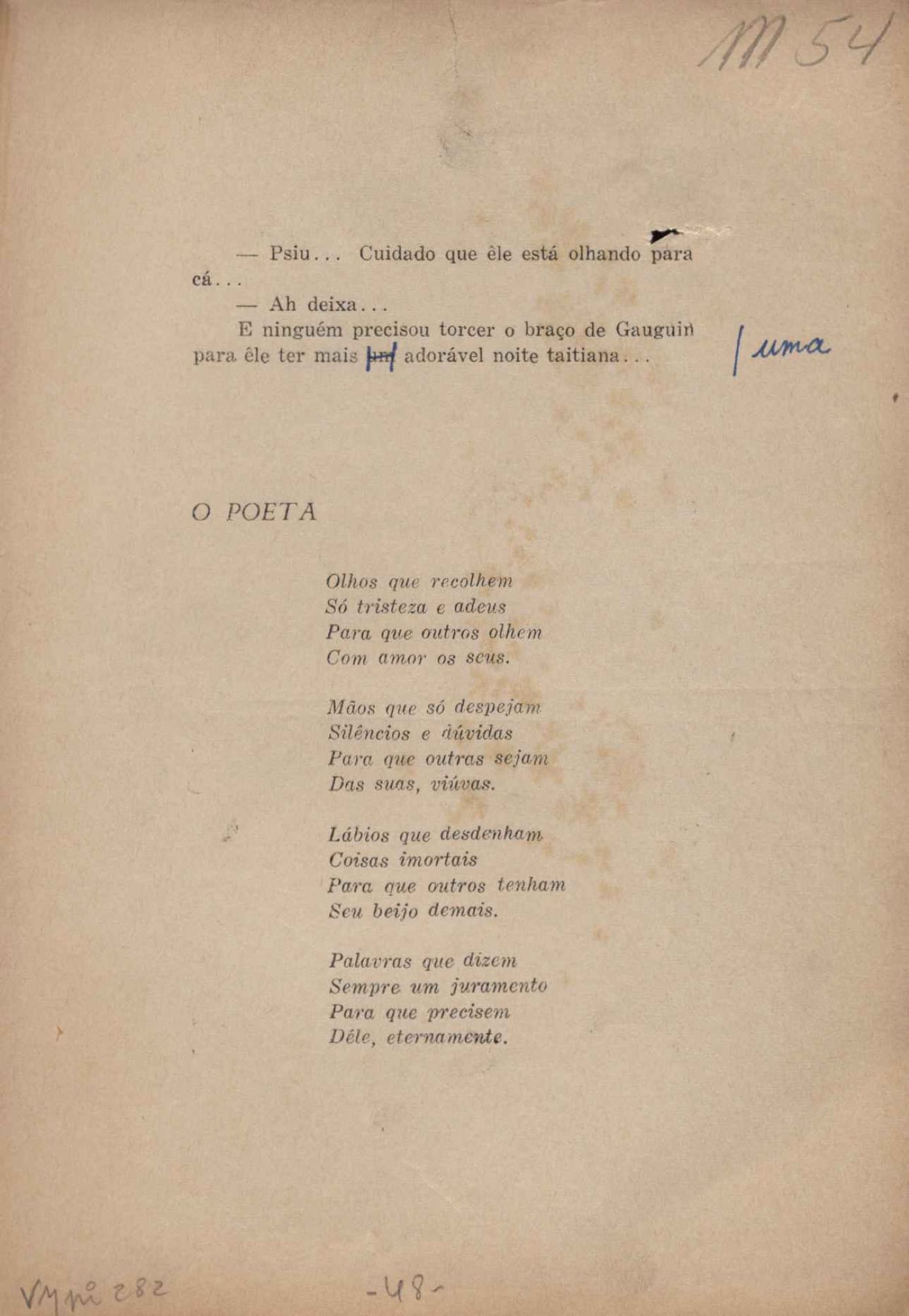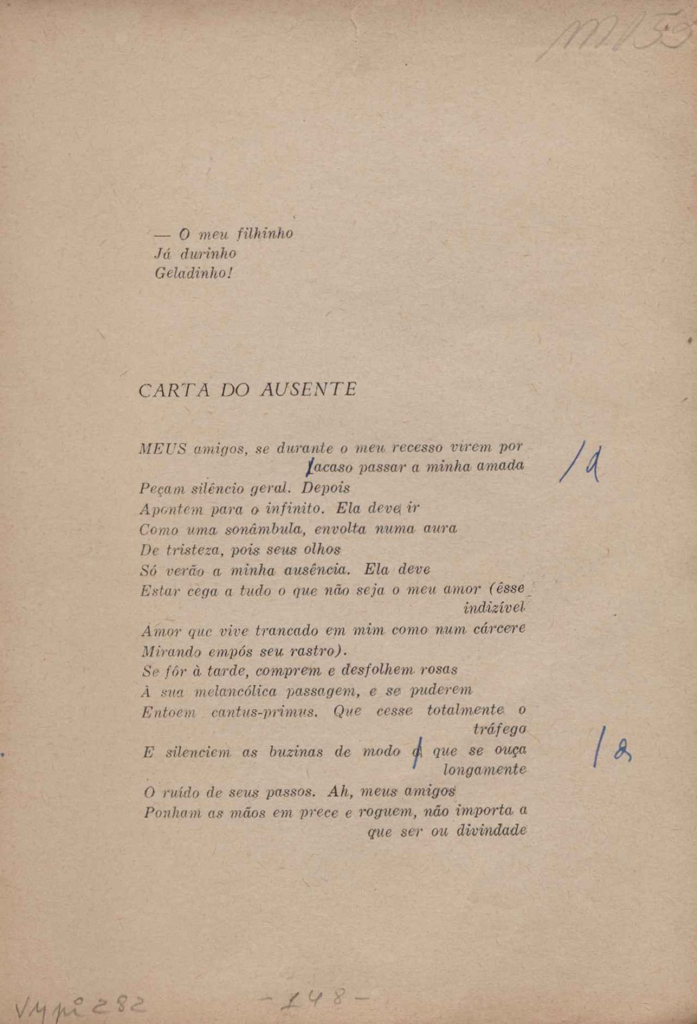 Prova tipográfica da [primeira edição?]. Prosa (1). Anexo: 1. Prova tipográfica incompleta; 2. Outras versões manuscritas e datilografadas, com emendas de: "O amor dos homens", "Antiode à tristeza", "Um beijo", "Blues para Emmett Louis Till", "Canção para a amiga dormindo", "Carta aos puros", "Carta do ausente", "... Deinde Philosophari [publ. "O mosquito"], "Dialética", "Dois poeminhas com Sputnik", "Duas canções de silêncio", "Of gold and God [publ. "Of God and gold"], "Look here, Mr. Buster..." [publ. "Olhe aqui, Mr. Buster..."], "O mais-que-perfeito", "O Margarida's", "As mulheres ocas", "Namorados no mirante", "Natal", "O ônibus Grayhound atravessa o Novo México", "Para viver um grande amor", "Pedro, meu filho", "Poema para Gilberto Amado", "O poeta aprendiz", "O poeta e a rosa", "O poeta", "Quinta rima" [publ. "Lapa de Bandeira"], "Teu nome" e "A última viagem de Jayme Ovalle".