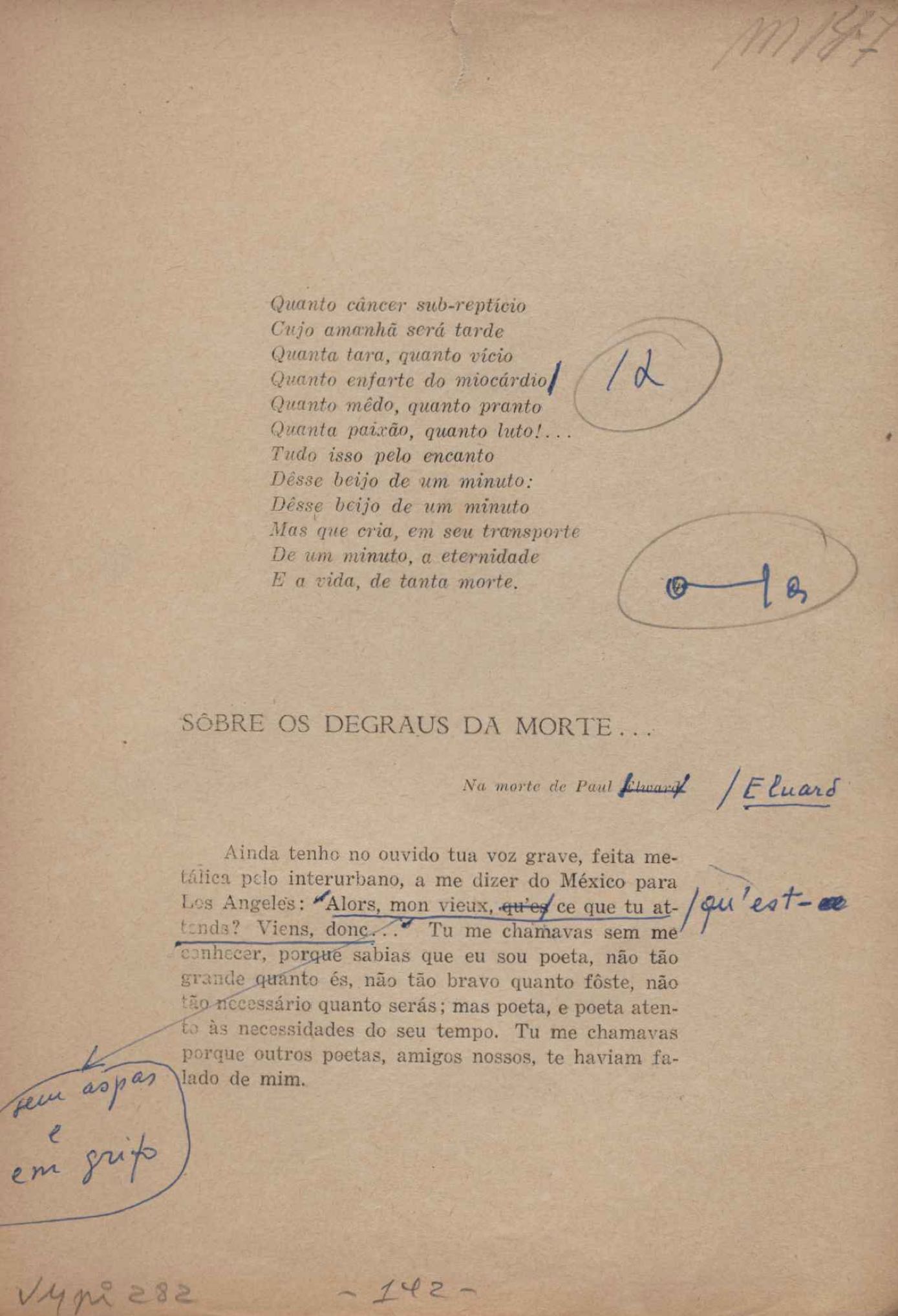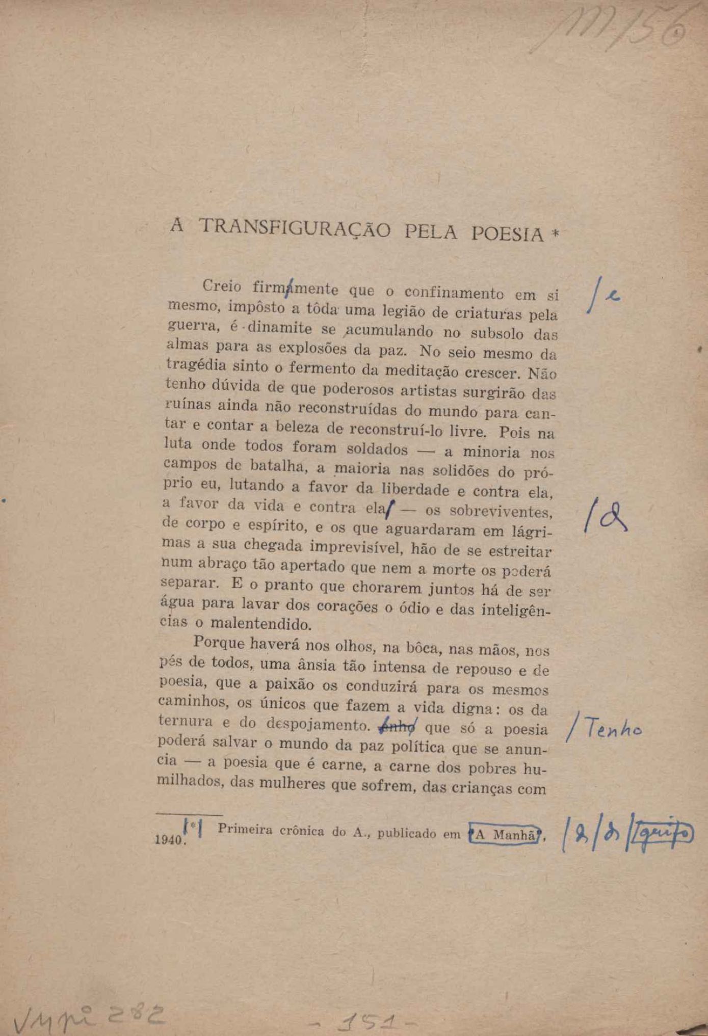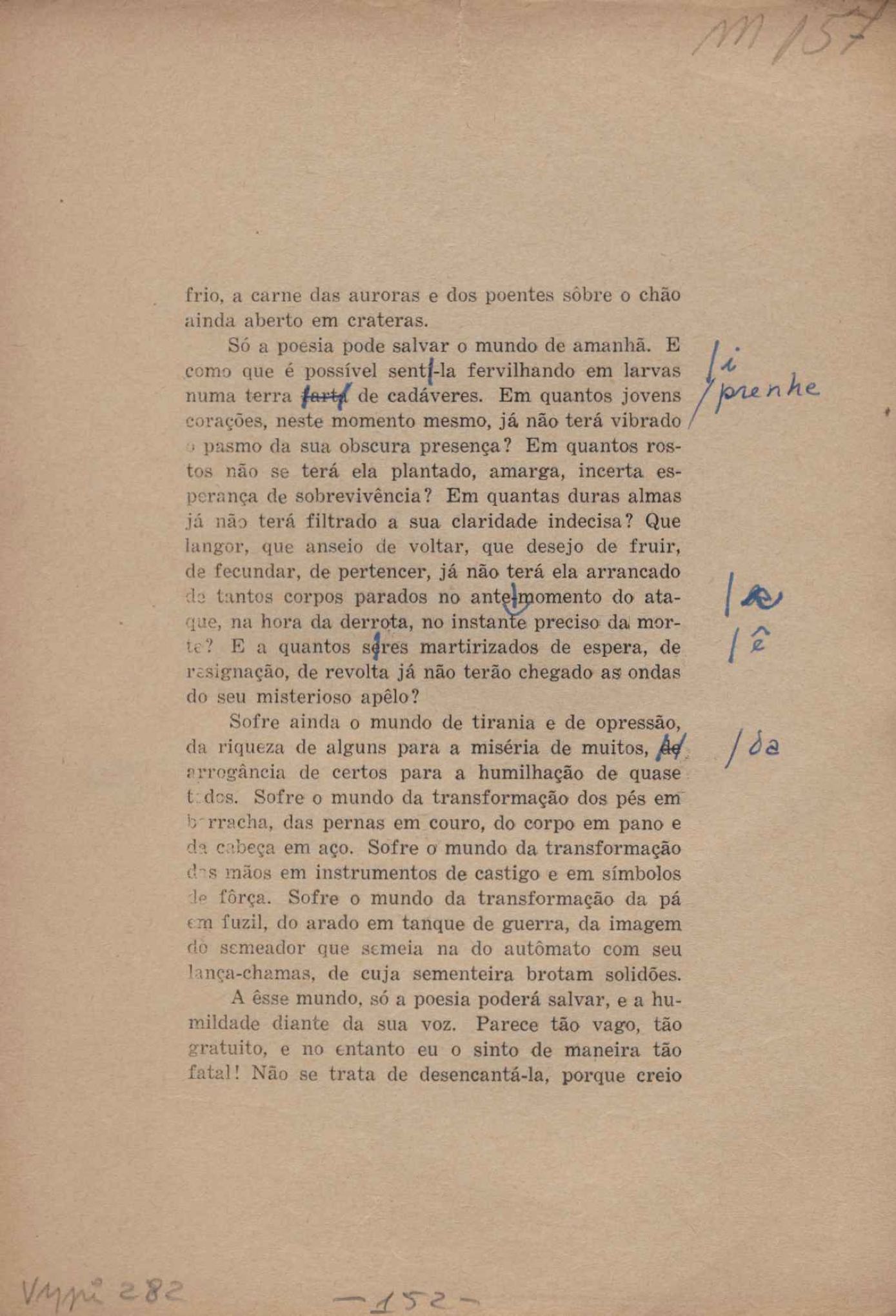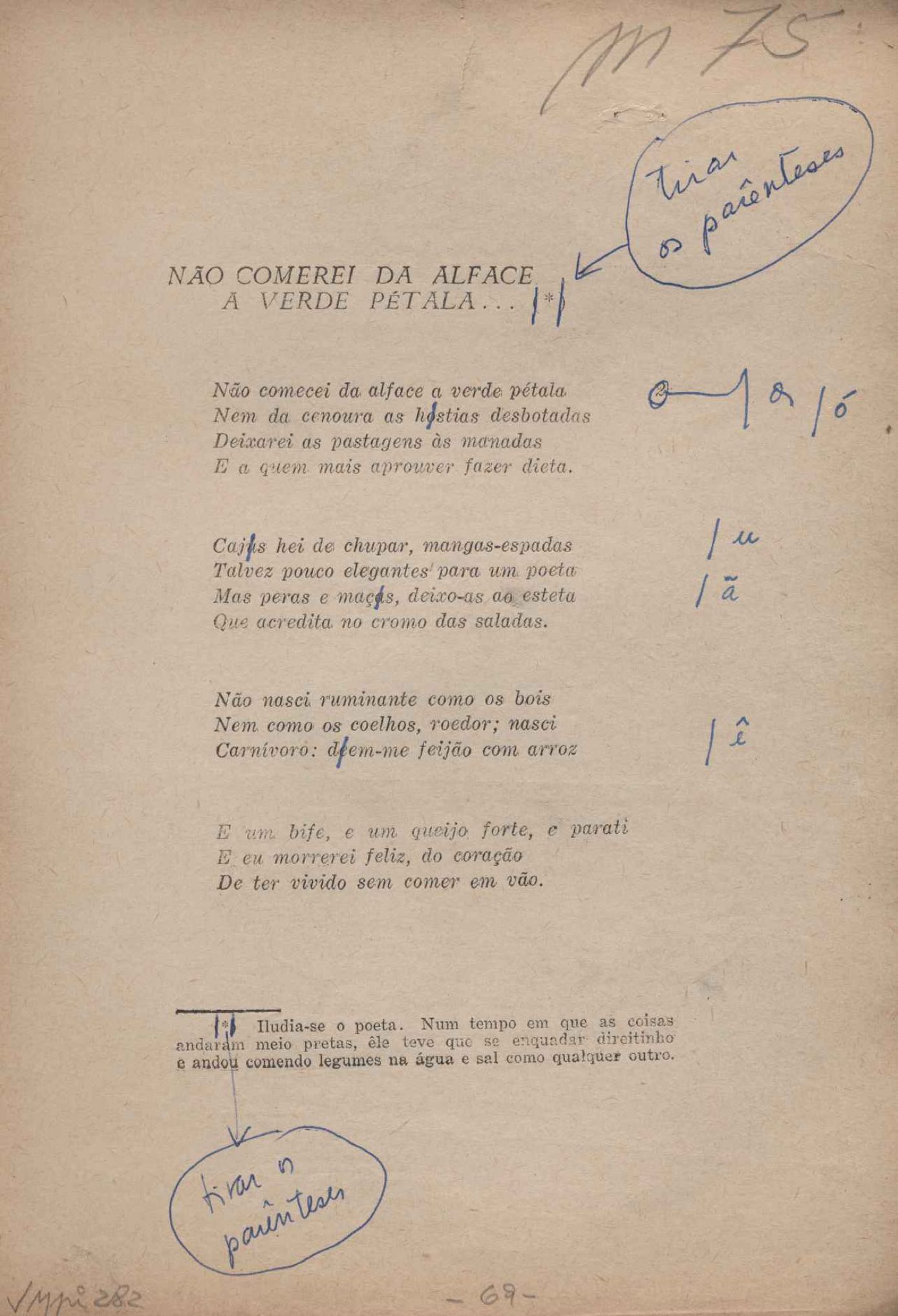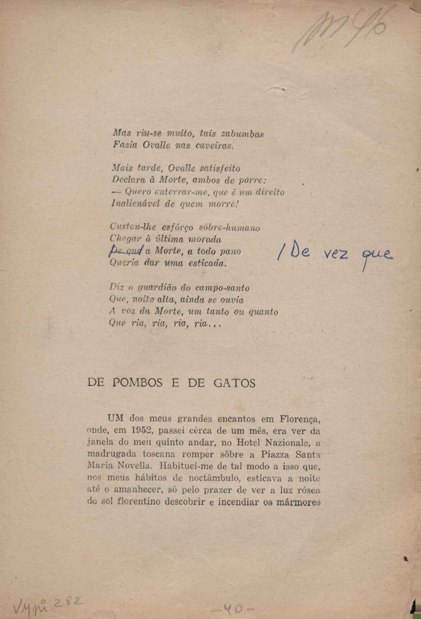 Prova tipográfica da [primeira edição?]. Prosa (1). Anexo: 1. Prova tipográfica incompleta; 2. Outras versões manuscritas e datilografadas, com emendas de: "O amor dos homens", "Antiode à tristeza", "Um beijo", "Blues para Emmett Louis Till", "Canção para a amiga dormindo", "Carta aos puros", "Carta do ausente", "... Deinde Philosophari [publ. "O mosquito"], "Dialética", "Dois poeminhas com Sputnik", "Duas canções de silêncio", "Of gold and God [publ. "Of God and gold"], "Look here, Mr. Buster..." [publ. "Olhe aqui, Mr. Buster..."], "O mais-que-perfeito", "O Margarida's", "As mulheres ocas", "Namorados no mirante", "Natal", "O ônibus Grayhound atravessa o Novo México", "Para viver um grande amor", "Pedro, meu filho", "Poema para Gilberto Amado", "O poeta aprendiz", "O poeta e a rosa", "O poeta", "Quinta rima" [publ. "Lapa de Bandeira"], "Teu nome" e "A última viagem de Jayme Ovalle".