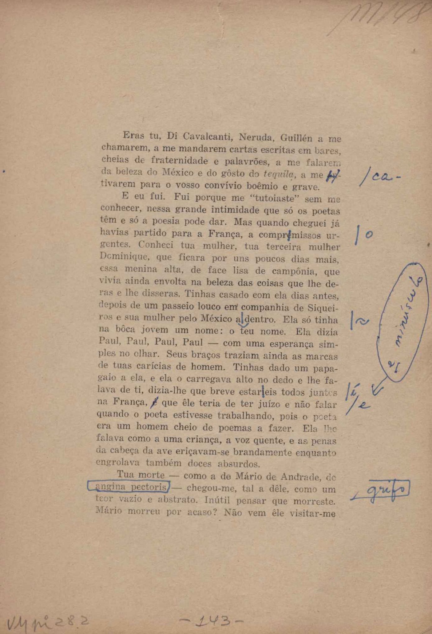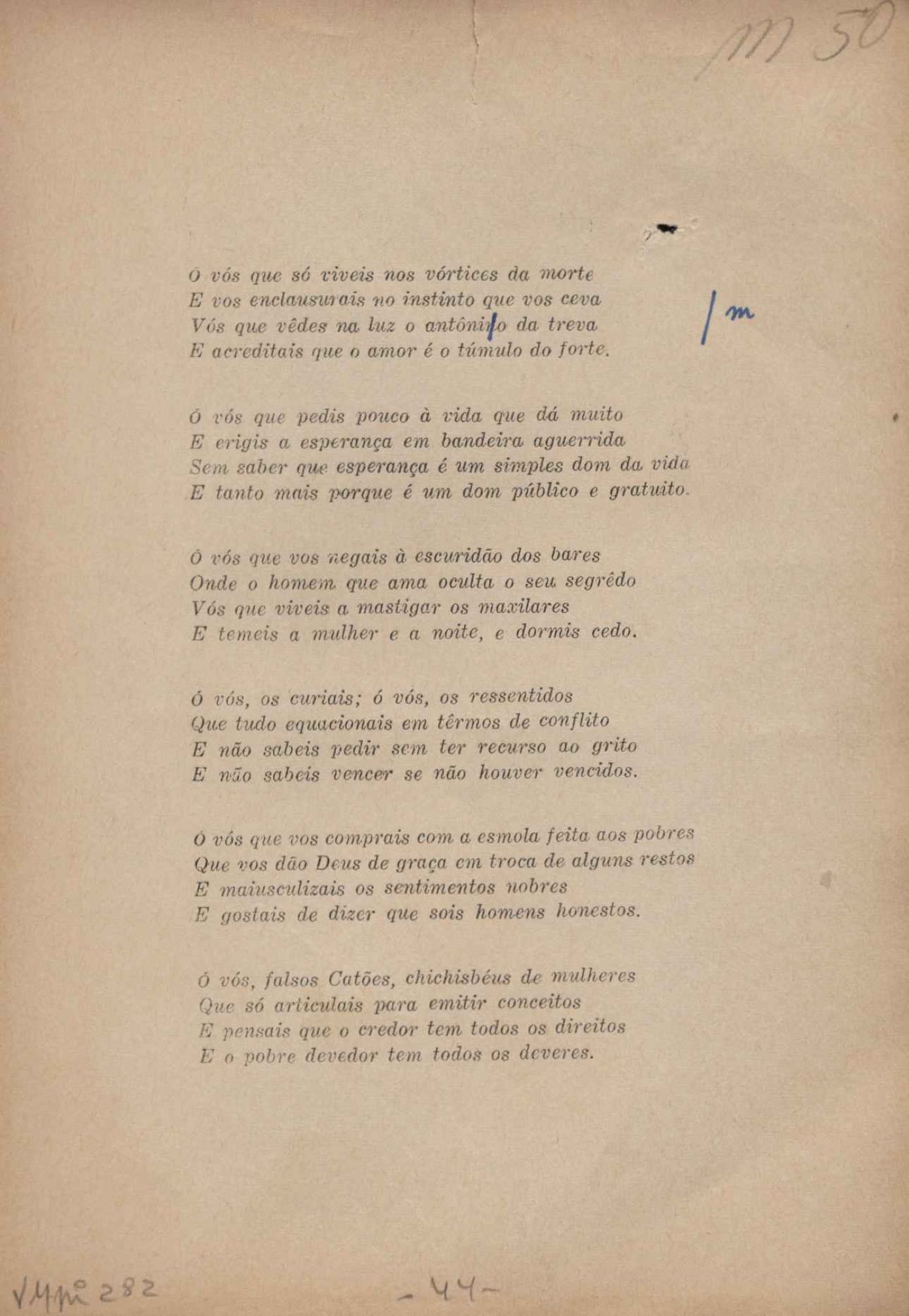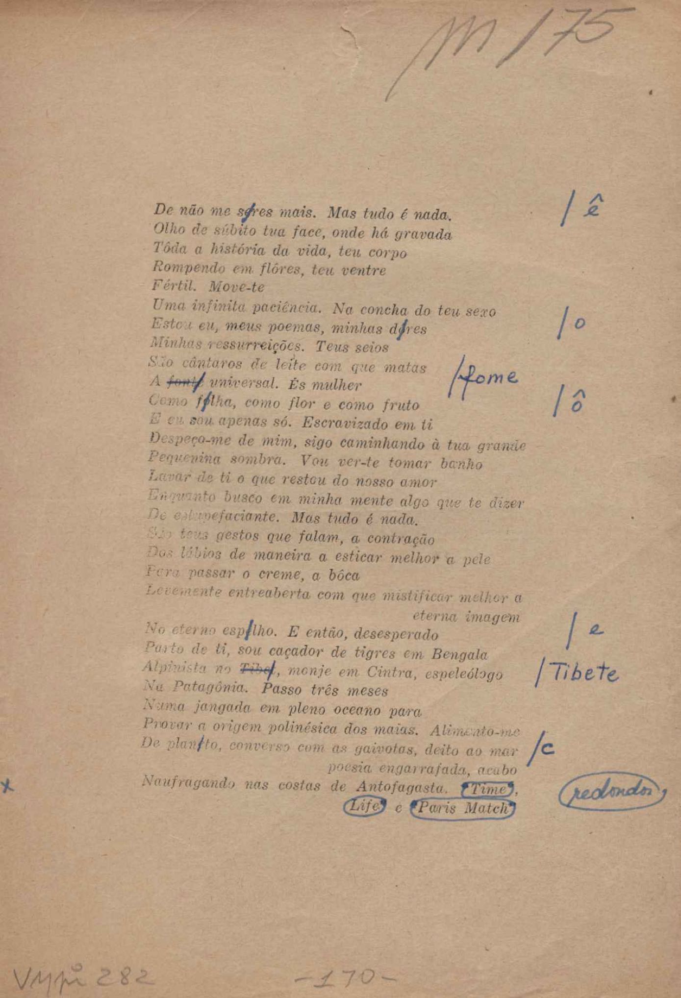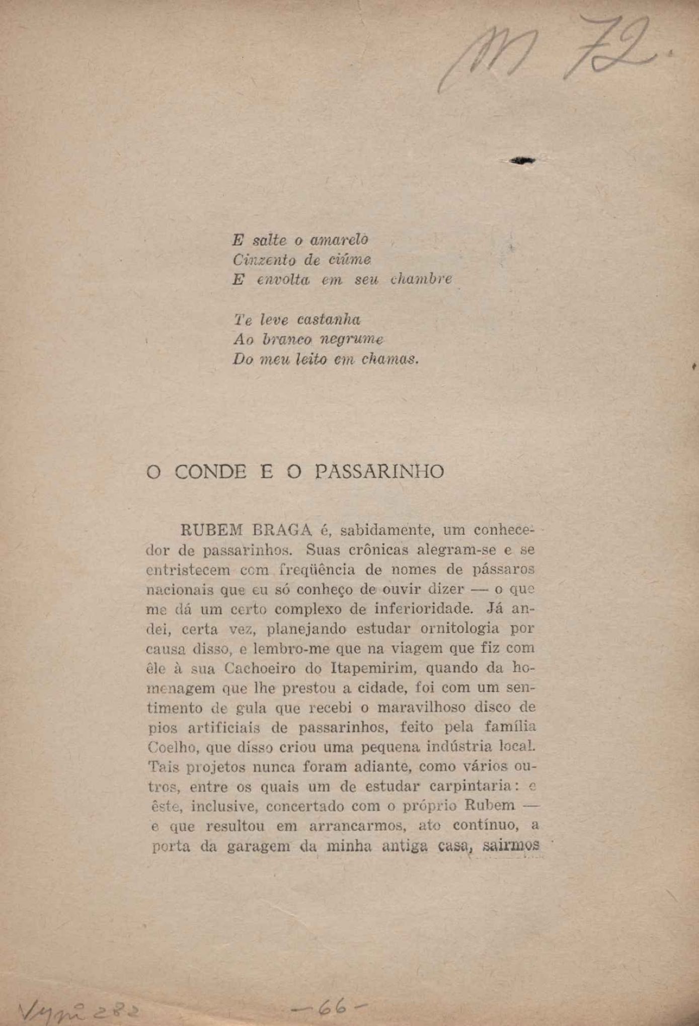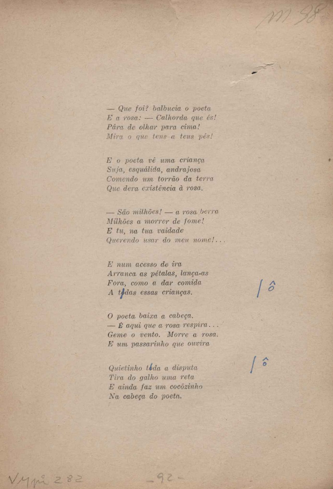 Prova tipográfica da [primeira edição?]. Prosa (1). Anexo: 1. Prova tipográfica incompleta; 2. Outras versões manuscritas e datilografadas, com emendas de: "O amor dos homens", "Antiode à tristeza", "Um beijo", "Blues para Emmett Louis Till", "Canção para a amiga dormindo", "Carta aos puros", "Carta do ausente", "... Deinde Philosophari [publ. "O mosquito"], "Dialética", "Dois poeminhas com Sputnik", "Duas canções de silêncio", "Of gold and God [publ. "Of God and gold"], "Look here, Mr. Buster..." [publ. "Olhe aqui, Mr. Buster..."], "O mais-que-perfeito", "O Margarida's", "As mulheres ocas", "Namorados no mirante", "Natal", "O ônibus Grayhound atravessa o Novo México", "Para viver um grande amor", "Pedro, meu filho", "Poema para Gilberto Amado", "O poeta aprendiz", "O poeta e a rosa", "O poeta", "Quinta rima" [publ. "Lapa de Bandeira"], "Teu nome" e "A última viagem de Jayme Ovalle".