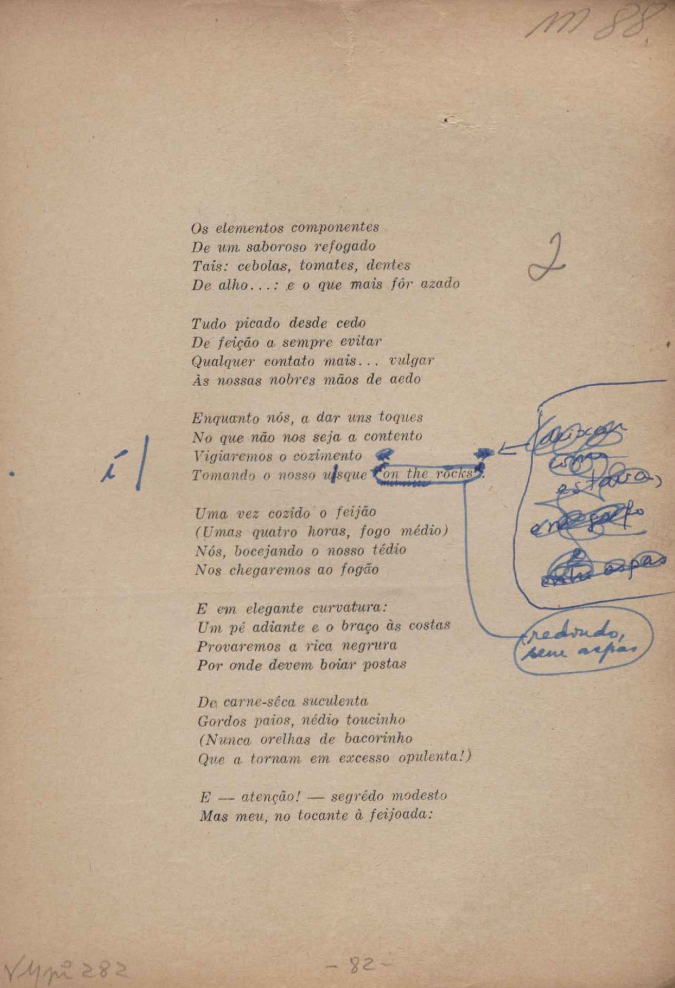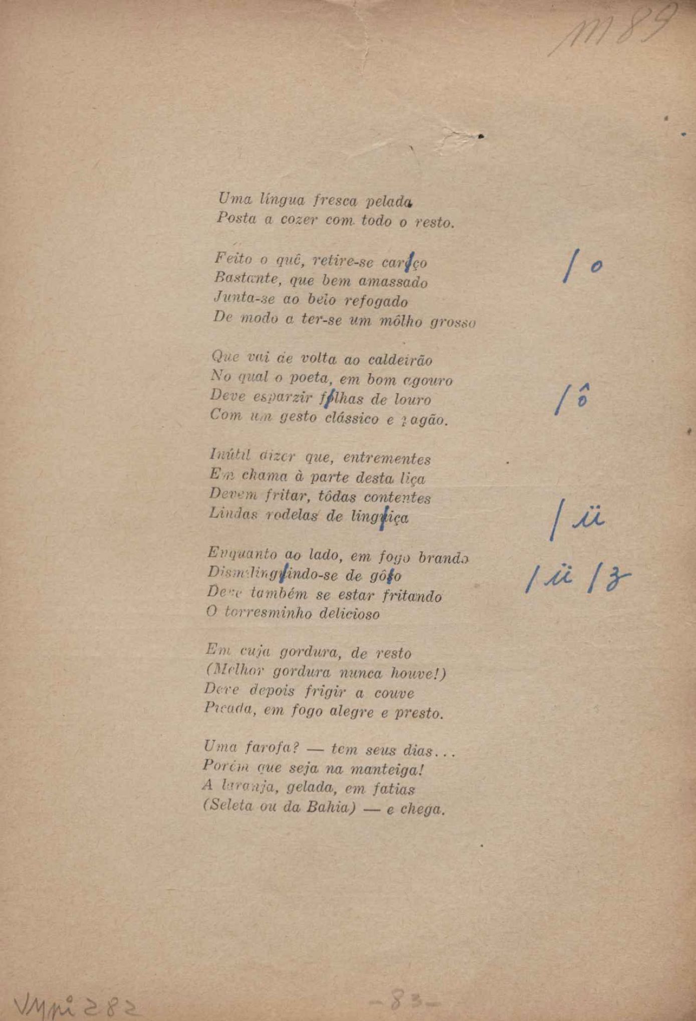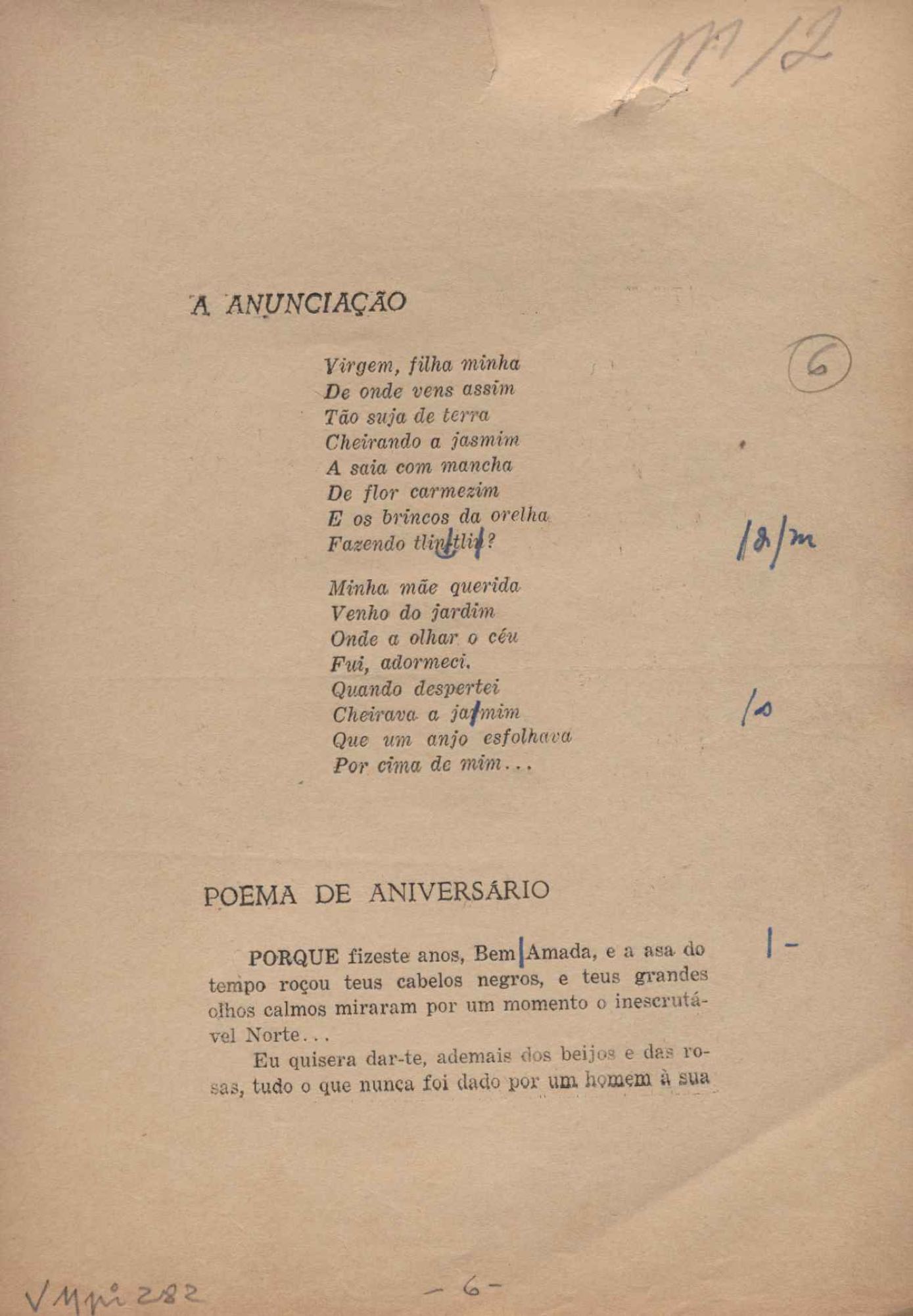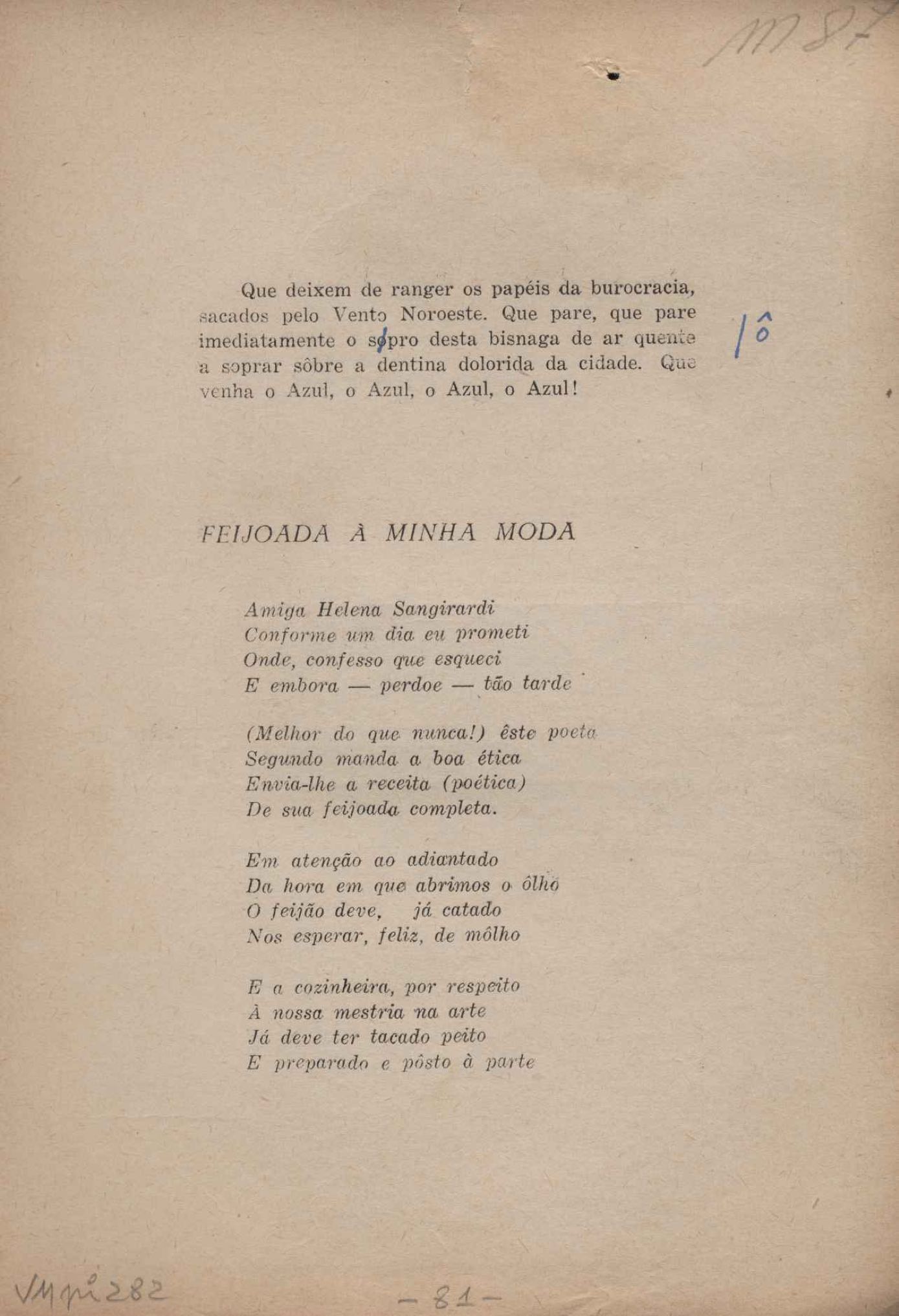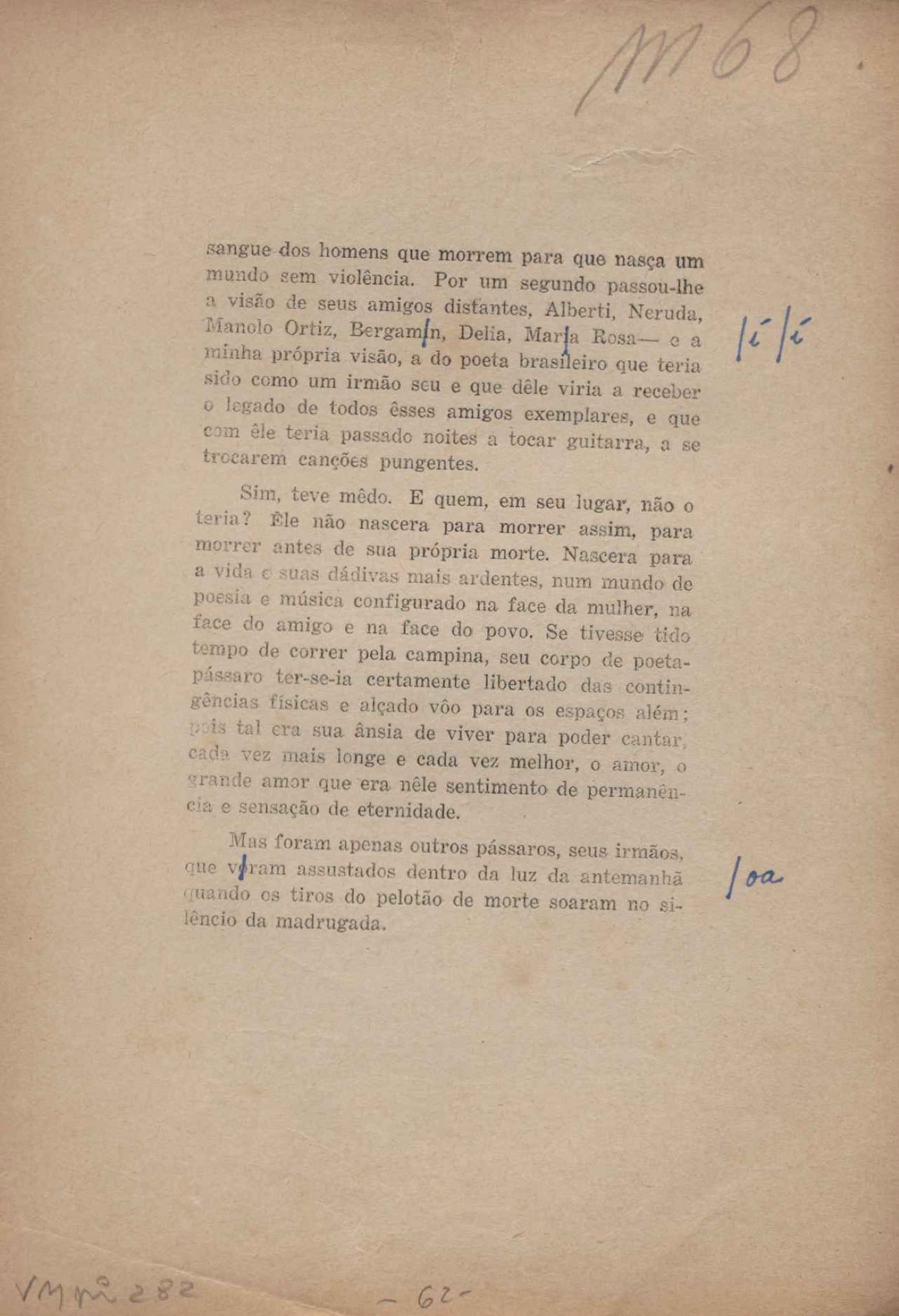 Prova tipográfica da [primeira edição?]. Prosa (1). Anexo: 1. Prova tipográfica incompleta; 2. Outras versões manuscritas e datilografadas, com emendas de: "O amor dos homens", "Antiode à tristeza", "Um beijo", "Blues para Emmett Louis Till", "Canção para a amiga dormindo", "Carta aos puros", "Carta do ausente", "... Deinde Philosophari [publ. "O mosquito"], "Dialética", "Dois poeminhas com Sputnik", "Duas canções de silêncio", "Of gold and God [publ. "Of God and gold"], "Look here, Mr. Buster..." [publ. "Olhe aqui, Mr. Buster..."], "O mais-que-perfeito", "O Margarida's", "As mulheres ocas", "Namorados no mirante", "Natal", "O ônibus Grayhound atravessa o Novo México", "Para viver um grande amor", "Pedro, meu filho", "Poema para Gilberto Amado", "O poeta aprendiz", "O poeta e a rosa", "O poeta", "Quinta rima" [publ. "Lapa de Bandeira"], "Teu nome" e "A última viagem de Jayme Ovalle".