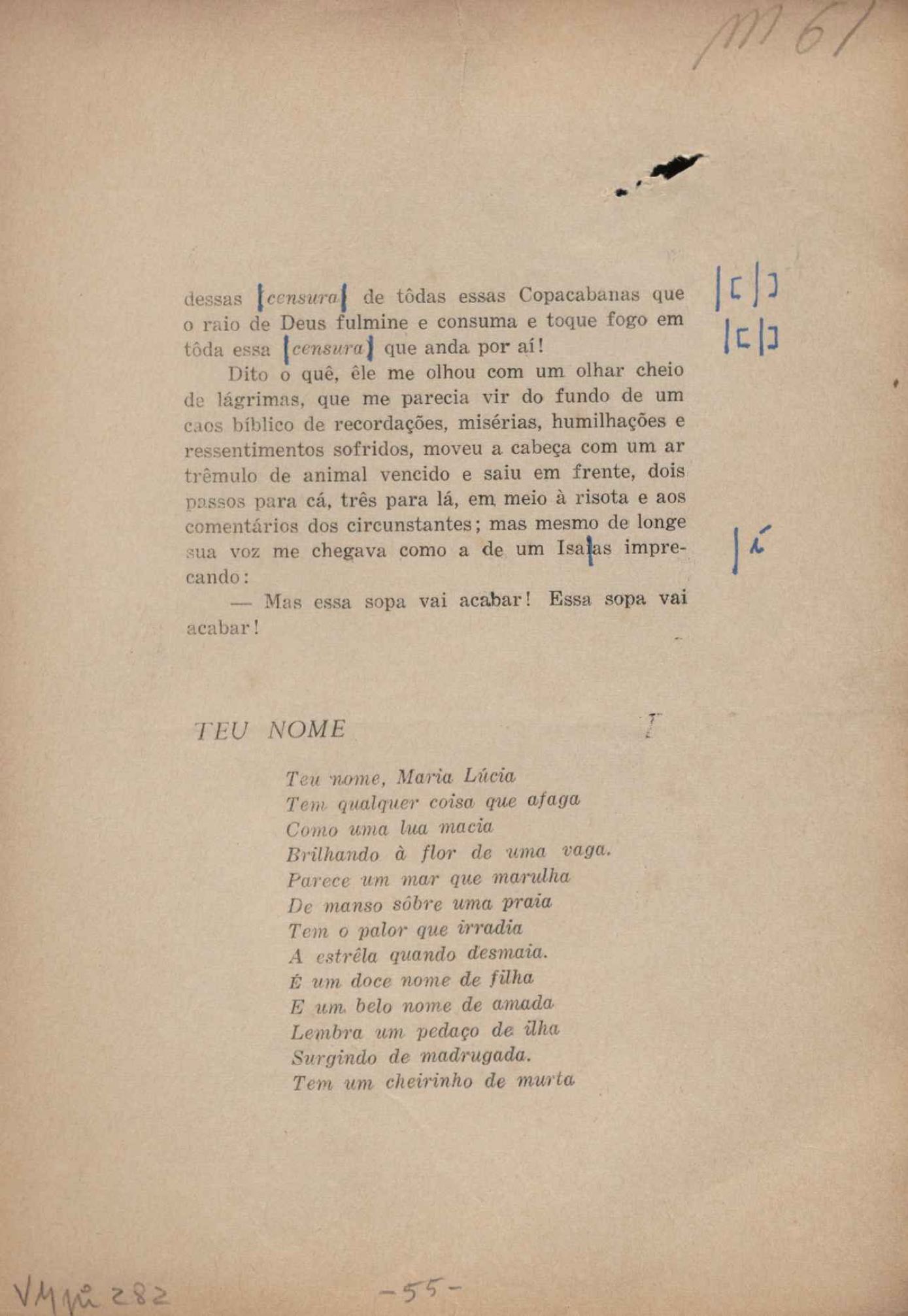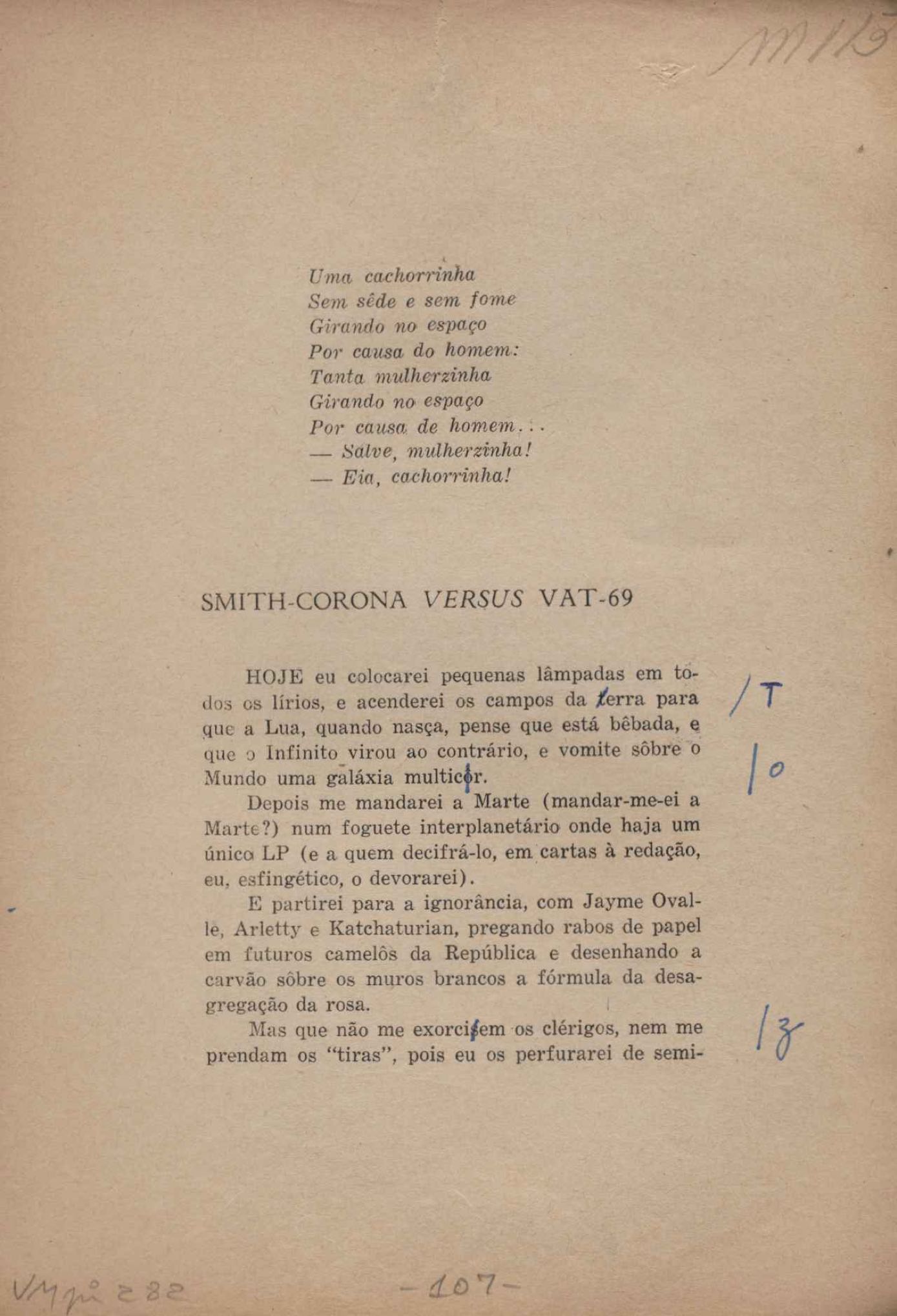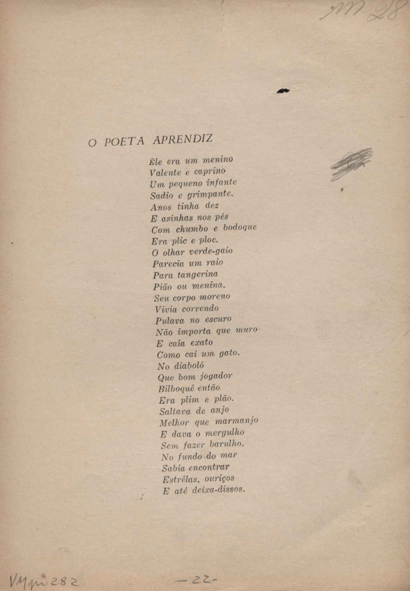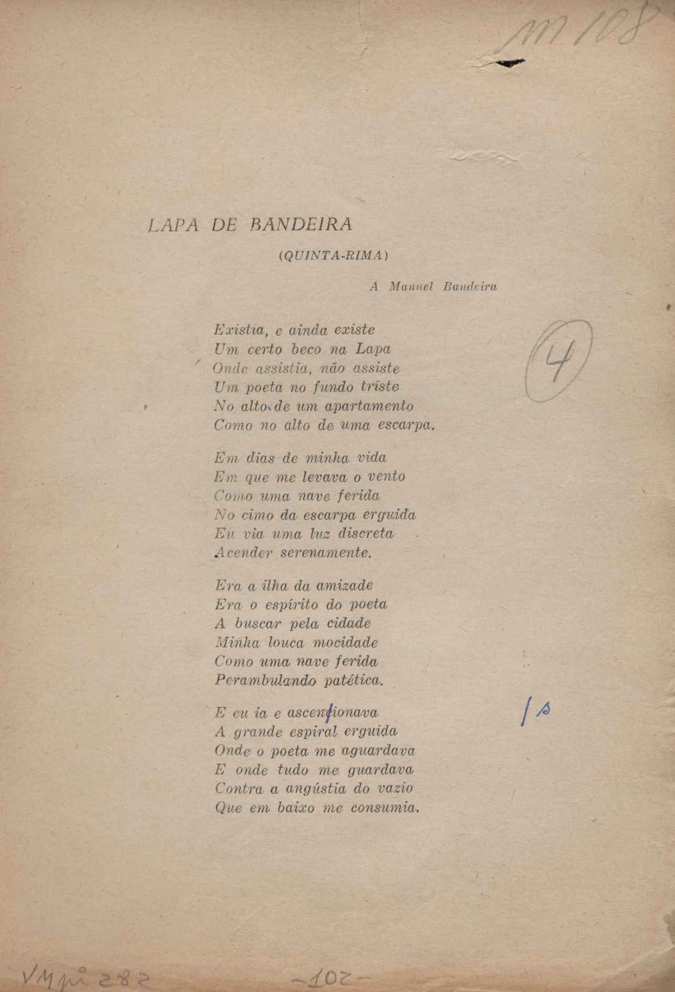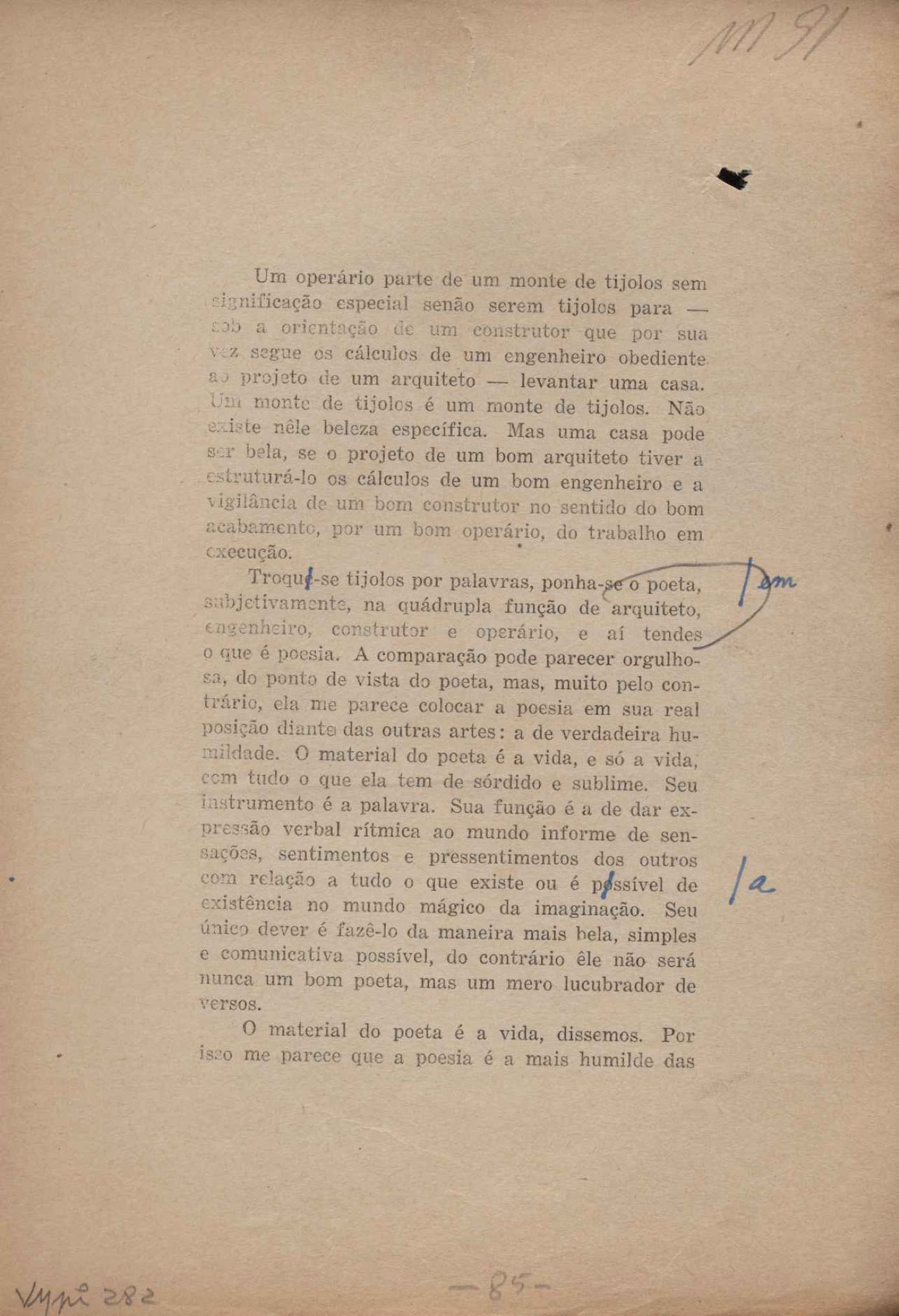 Prova tipográfica da [primeira edição?]. Prosa (1). Anexo: 1. Prova tipográfica incompleta; 2. Outras versões manuscritas e datilografadas, com emendas de: "O amor dos homens", "Antiode à tristeza", "Um beijo", "Blues para Emmett Louis Till", "Canção para a amiga dormindo", "Carta aos puros", "Carta do ausente", "... Deinde Philosophari [publ. "O mosquito"], "Dialética", "Dois poeminhas com Sputnik", "Duas canções de silêncio", "Of gold and God [publ. "Of God and gold"], "Look here, Mr. Buster..." [publ. "Olhe aqui, Mr. Buster..."], "O mais-que-perfeito", "O Margarida's", "As mulheres ocas", "Namorados no mirante", "Natal", "O ônibus Grayhound atravessa o Novo México", "Para viver um grande amor", "Pedro, meu filho", "Poema para Gilberto Amado", "O poeta aprendiz", "O poeta e a rosa", "O poeta", "Quinta rima" [publ. "Lapa de Bandeira"], "Teu nome" e "A última viagem de Jayme Ovalle".