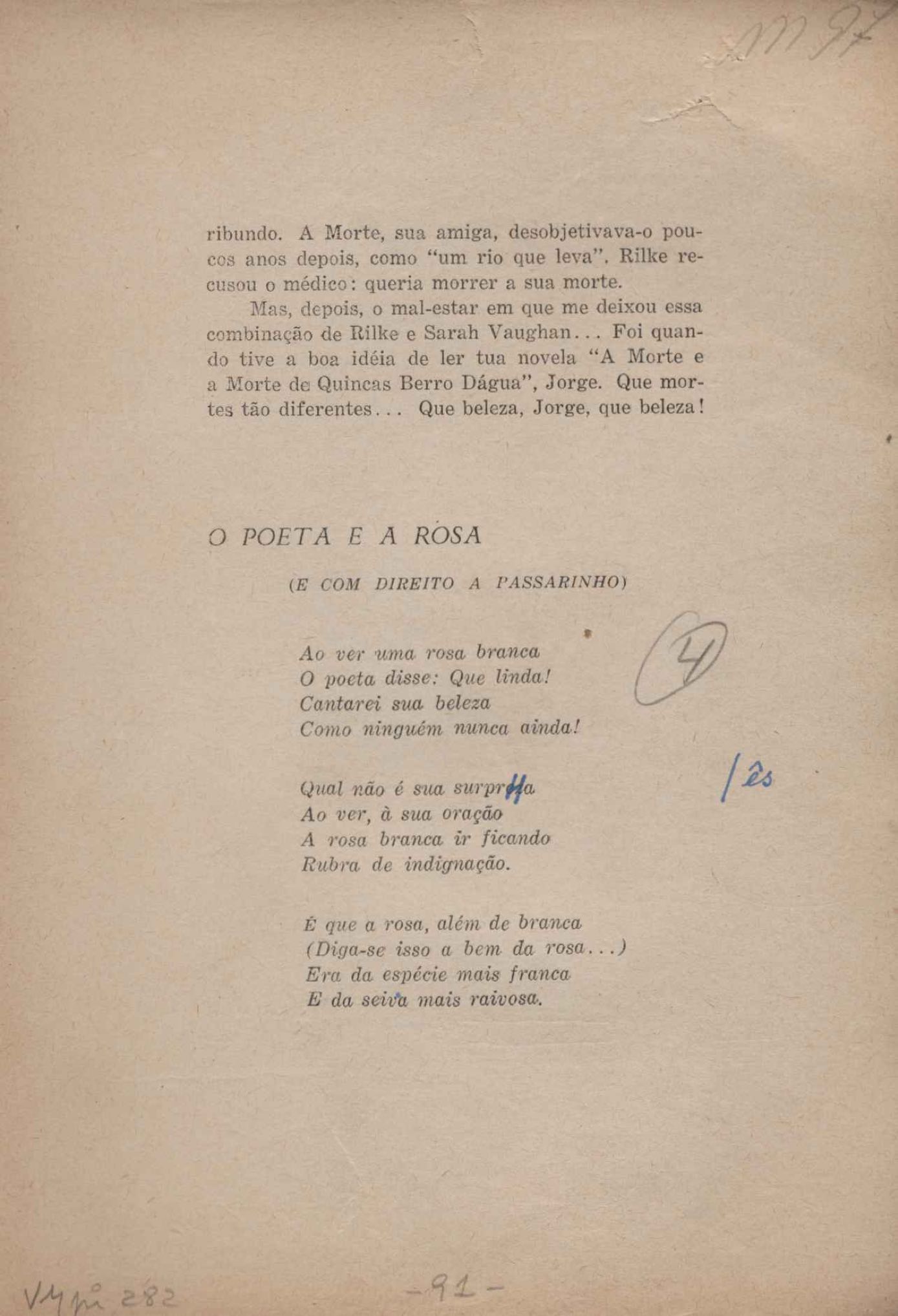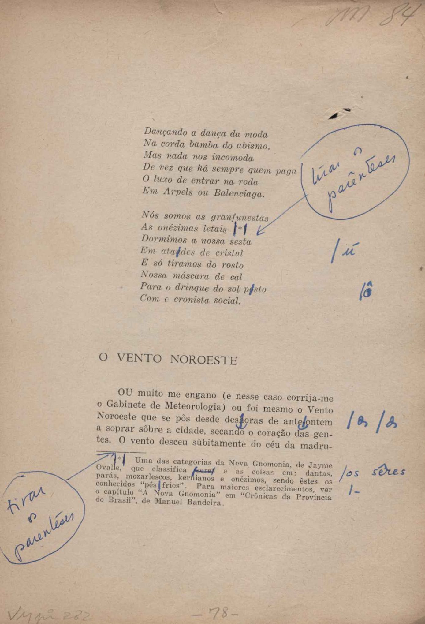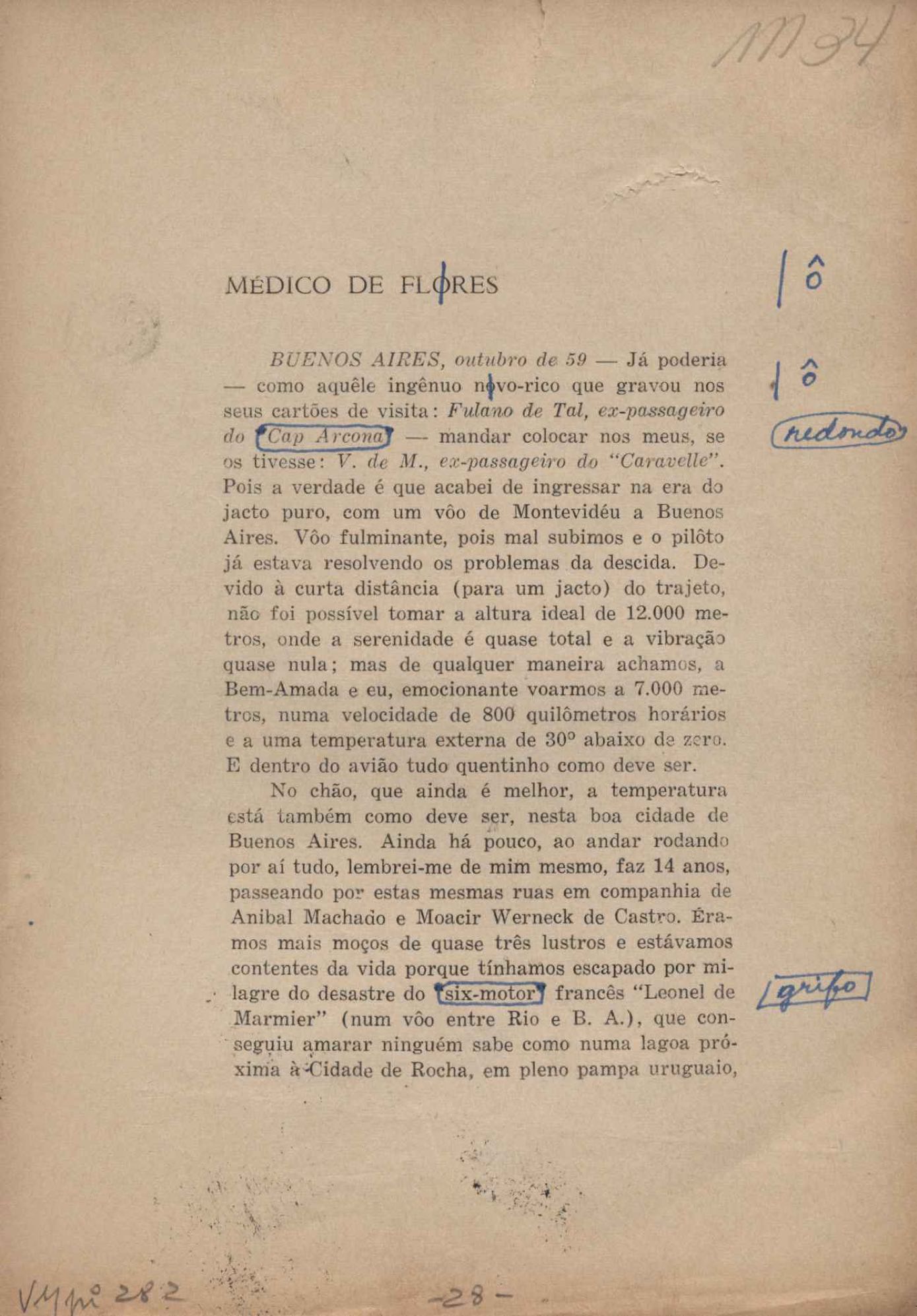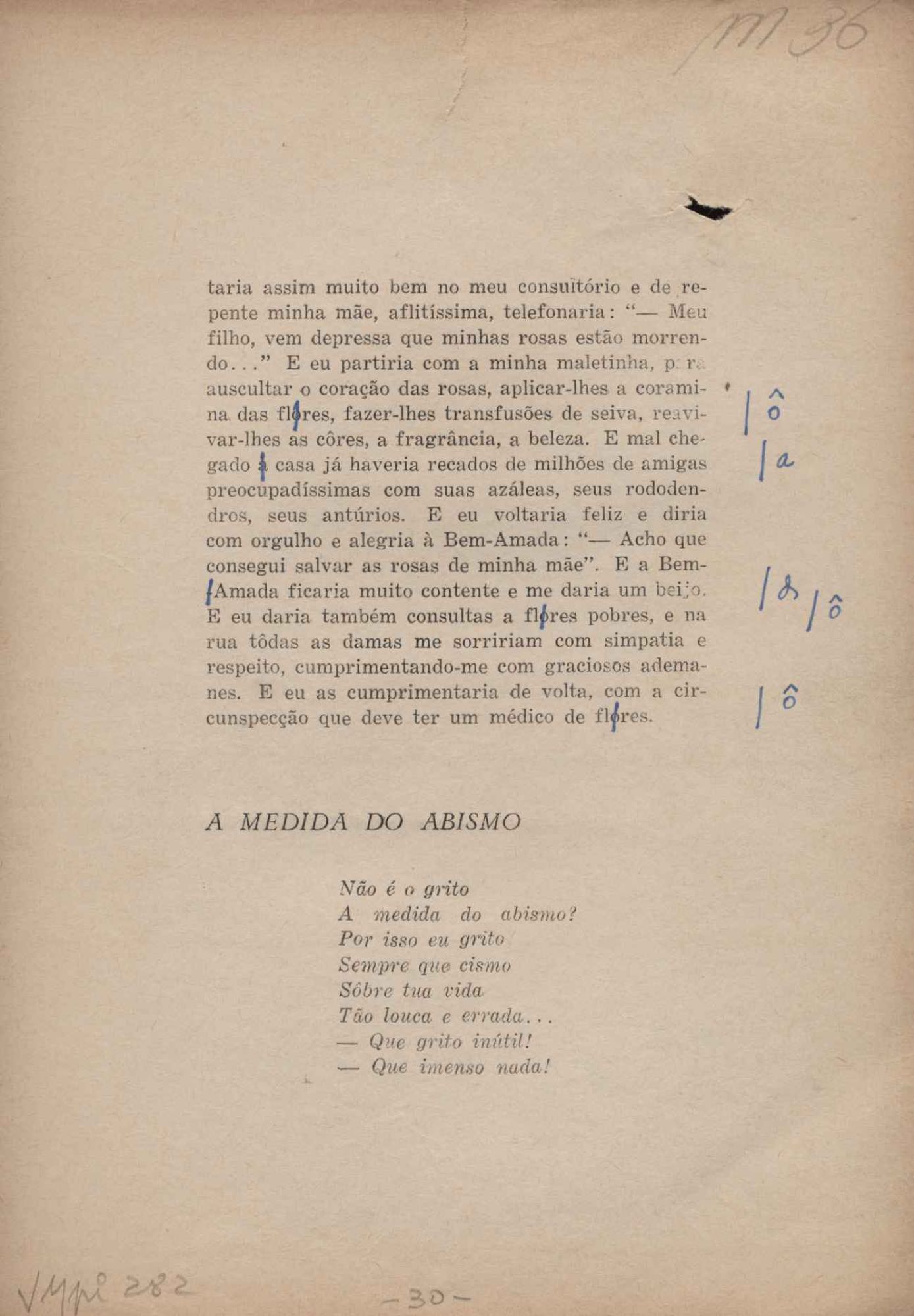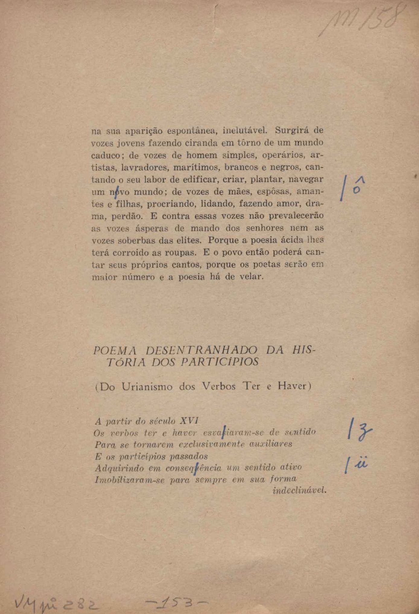 Prova tipográfica da [primeira edição?]. Prosa (1). Anexo: 1. Prova tipográfica incompleta; 2. Outras versões manuscritas e datilografadas, com emendas de: "O amor dos homens", "Antiode à tristeza", "Um beijo", "Blues para Emmett Louis Till", "Canção para a amiga dormindo", "Carta aos puros", "Carta do ausente", "... Deinde Philosophari [publ. "O mosquito"], "Dialética", "Dois poeminhas com Sputnik", "Duas canções de silêncio", "Of gold and God [publ. "Of God and gold"], "Look here, Mr. Buster..." [publ. "Olhe aqui, Mr. Buster..."], "O mais-que-perfeito", "O Margarida's", "As mulheres ocas", "Namorados no mirante", "Natal", "O ônibus Grayhound atravessa o Novo México", "Para viver um grande amor", "Pedro, meu filho", "Poema para Gilberto Amado", "O poeta aprendiz", "O poeta e a rosa", "O poeta", "Quinta rima" [publ. "Lapa de Bandeira"], "Teu nome" e "A última viagem de Jayme Ovalle".