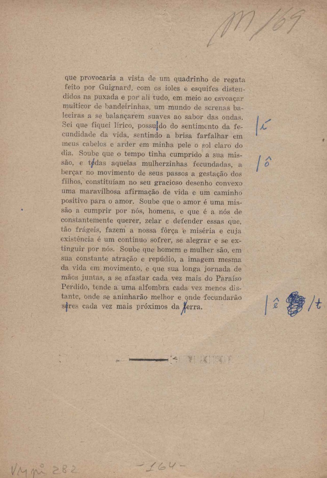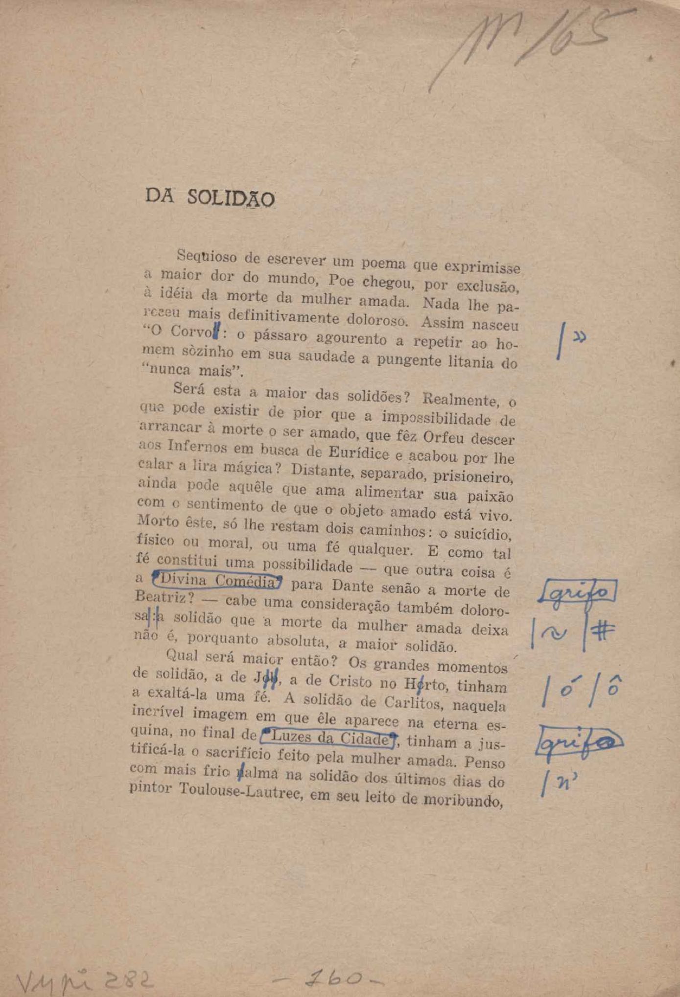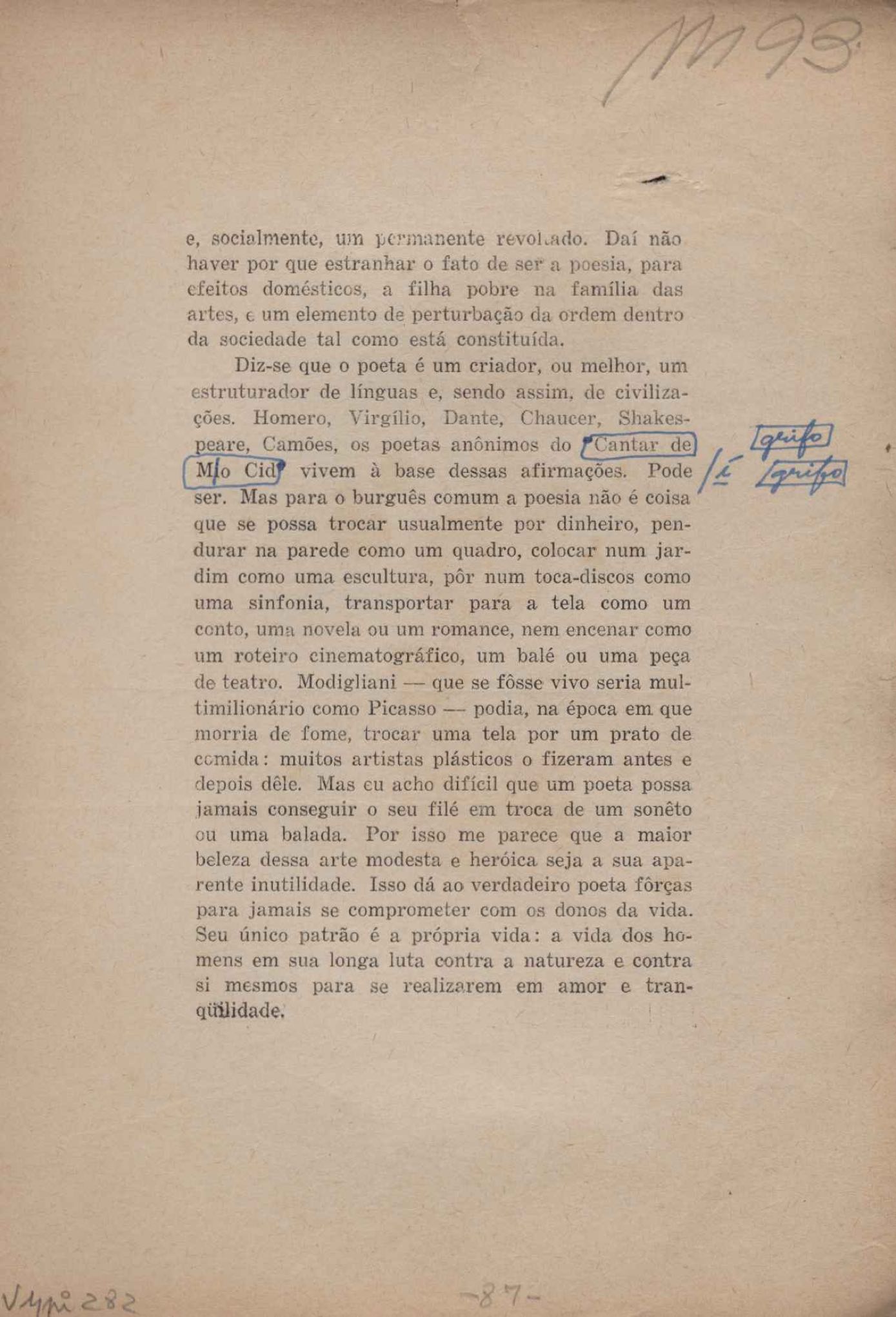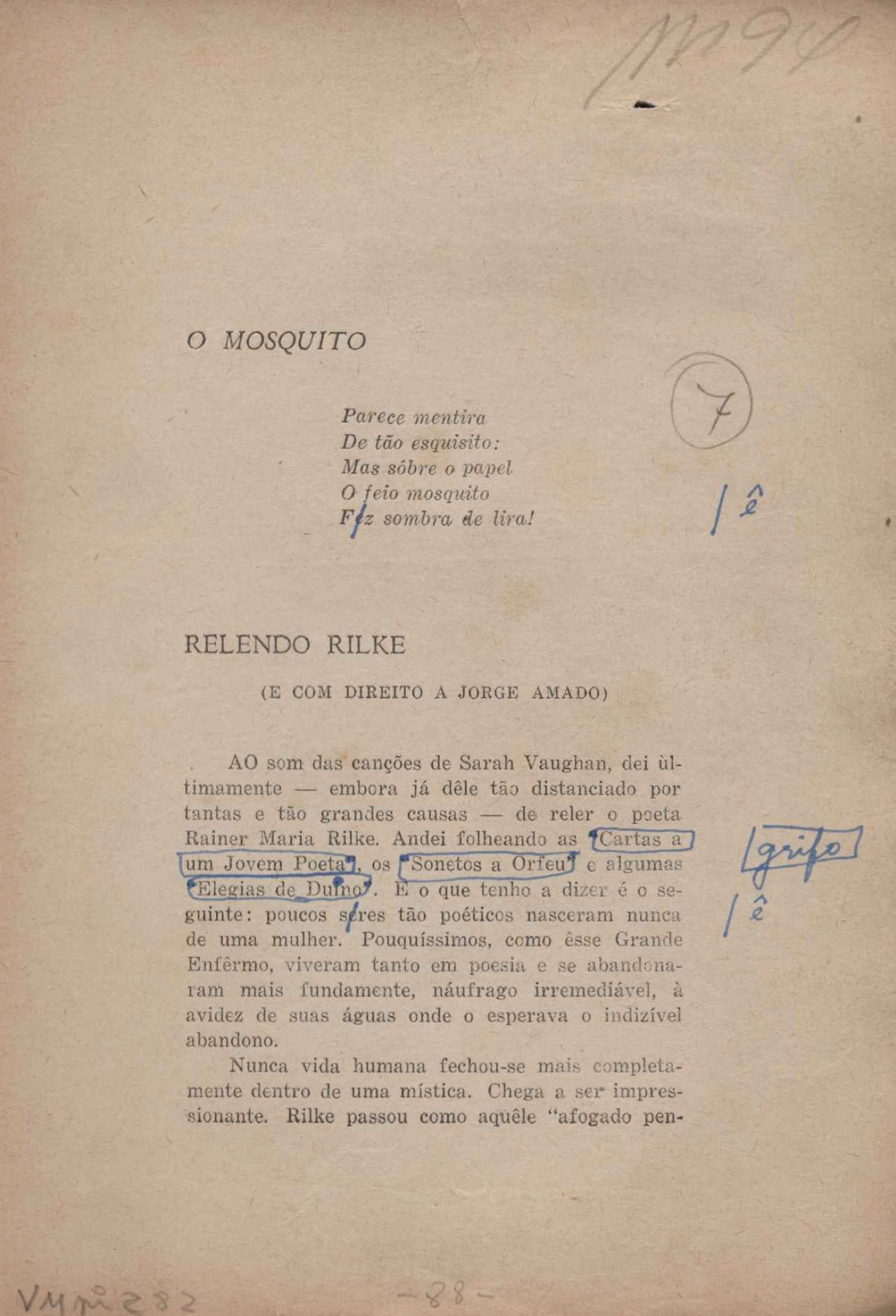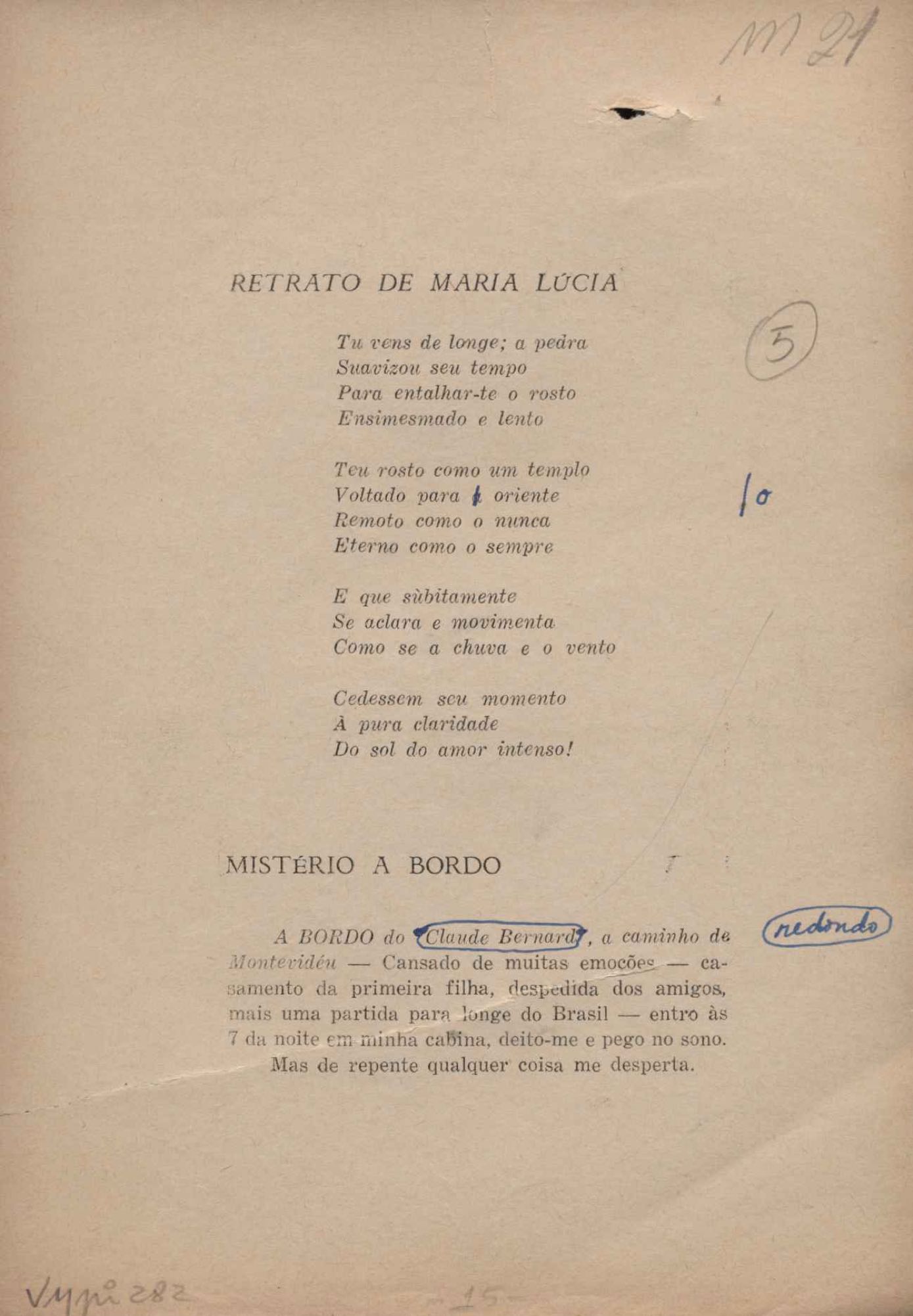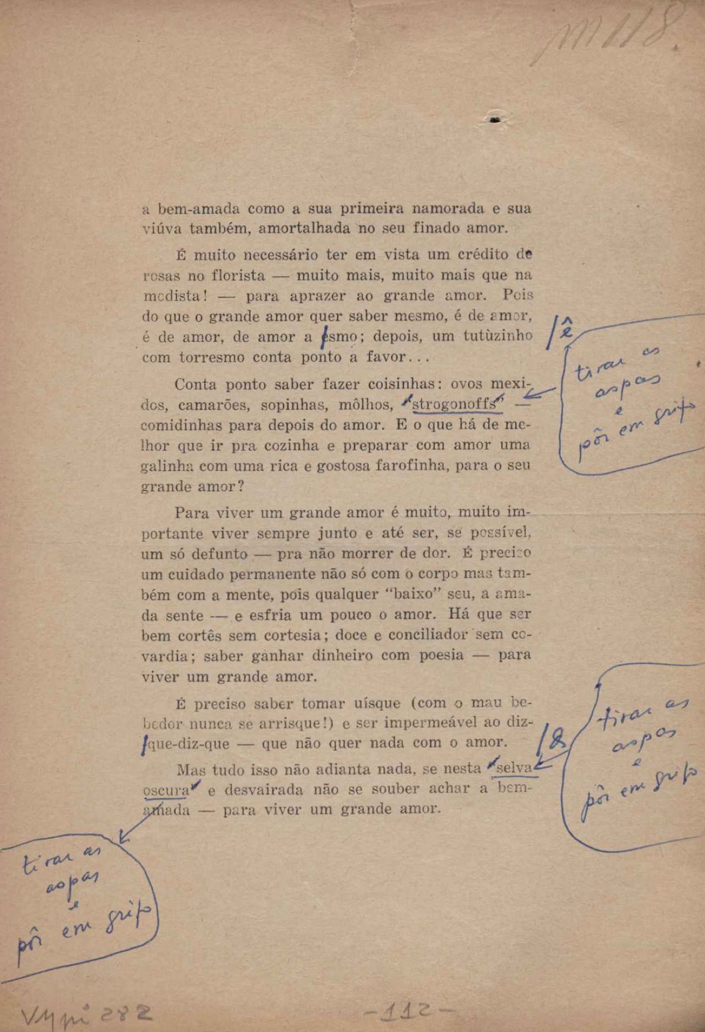 Prova tipográfica da [primeira edição?]. Prosa (1). Anexo: 1. Prova tipográfica incompleta; 2. Outras versões manuscritas e datilografadas, com emendas de: "O amor dos homens", "Antiode à tristeza", "Um beijo", "Blues para Emmett Louis Till", "Canção para a amiga dormindo", "Carta aos puros", "Carta do ausente", "... Deinde Philosophari [publ. "O mosquito"], "Dialética", "Dois poeminhas com Sputnik", "Duas canções de silêncio", "Of gold and God [publ. "Of God and gold"], "Look here, Mr. Buster..." [publ. "Olhe aqui, Mr. Buster..."], "O mais-que-perfeito", "O Margarida's", "As mulheres ocas", "Namorados no mirante", "Natal", "O ônibus Grayhound atravessa o Novo México", "Para viver um grande amor", "Pedro, meu filho", "Poema para Gilberto Amado", "O poeta aprendiz", "O poeta e a rosa", "O poeta", "Quinta rima" [publ. "Lapa de Bandeira"], "Teu nome" e "A última viagem de Jayme Ovalle".