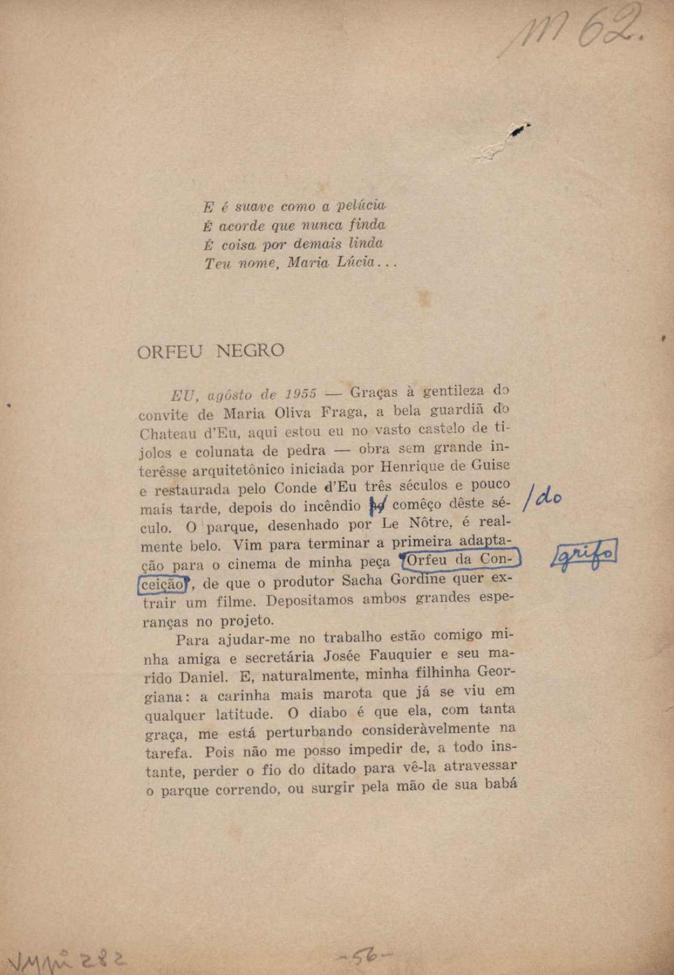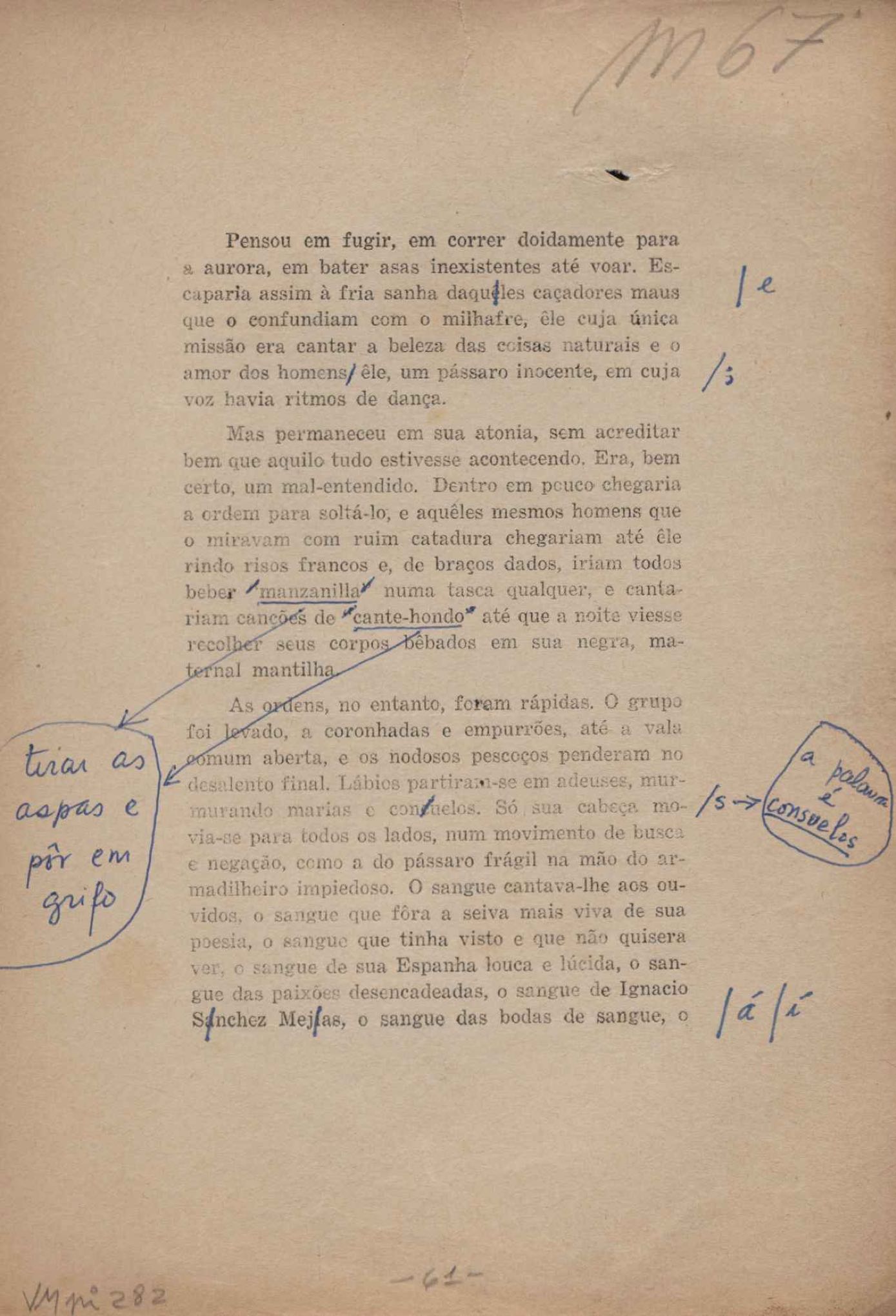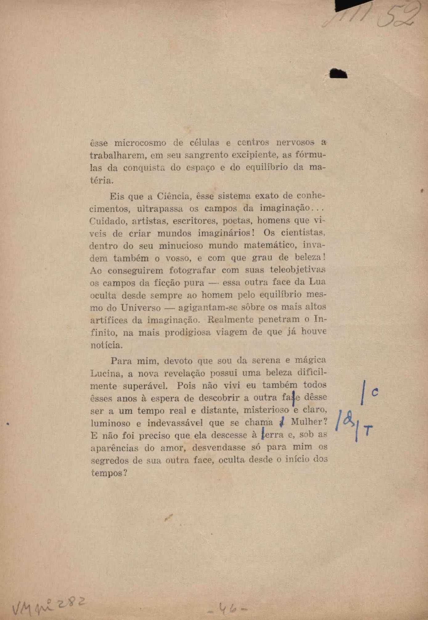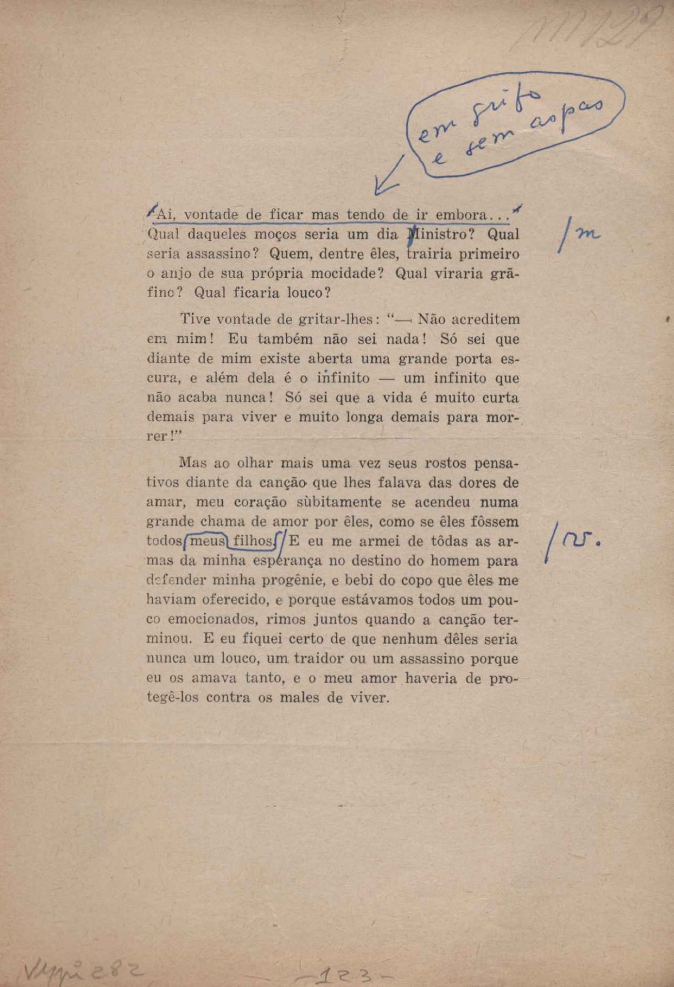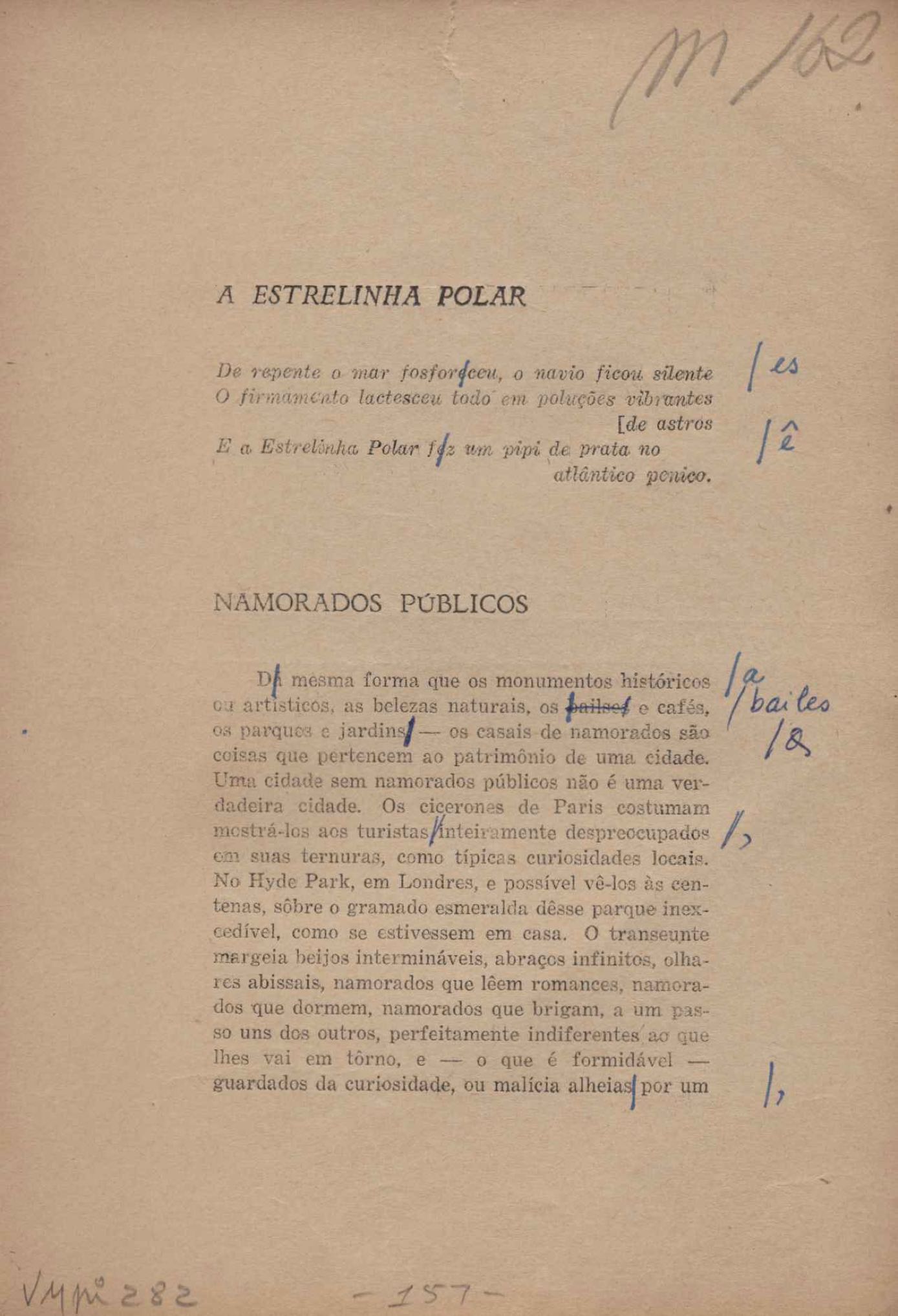 Prova tipográfica da [primeira edição?]. Prosa (1). Anexo: 1. Prova tipográfica incompleta; 2. Outras versões manuscritas e datilografadas, com emendas de: "O amor dos homens", "Antiode à tristeza", "Um beijo", "Blues para Emmett Louis Till", "Canção para a amiga dormindo", "Carta aos puros", "Carta do ausente", "... Deinde Philosophari [publ. "O mosquito"], "Dialética", "Dois poeminhas com Sputnik", "Duas canções de silêncio", "Of gold and God [publ. "Of God and gold"], "Look here, Mr. Buster..." [publ. "Olhe aqui, Mr. Buster..."], "O mais-que-perfeito", "O Margarida's", "As mulheres ocas", "Namorados no mirante", "Natal", "O ônibus Grayhound atravessa o Novo México", "Para viver um grande amor", "Pedro, meu filho", "Poema para Gilberto Amado", "O poeta aprendiz", "O poeta e a rosa", "O poeta", "Quinta rima" [publ. "Lapa de Bandeira"], "Teu nome" e "A última viagem de Jayme Ovalle".
