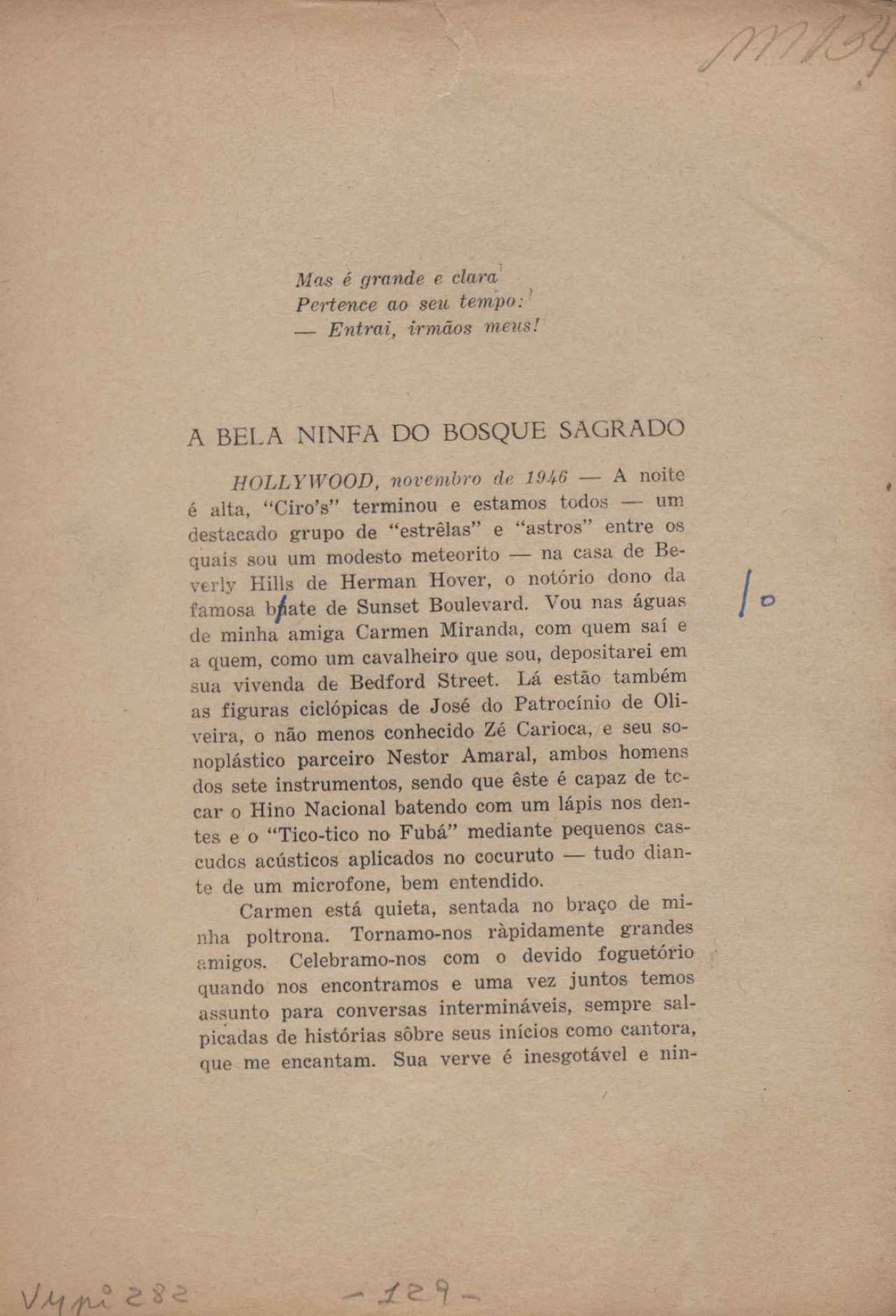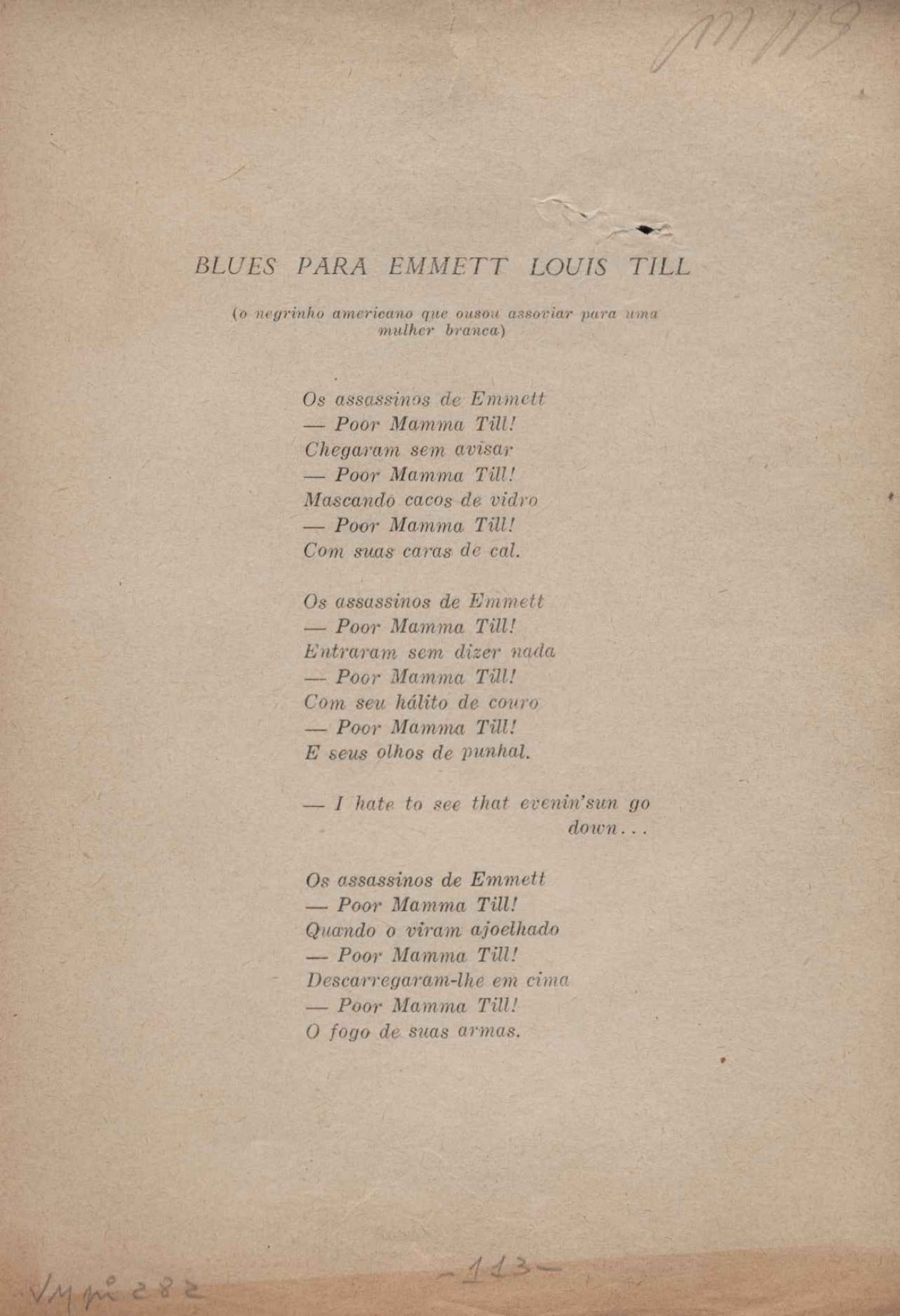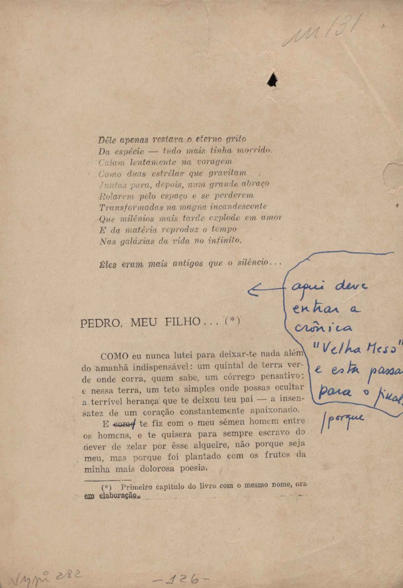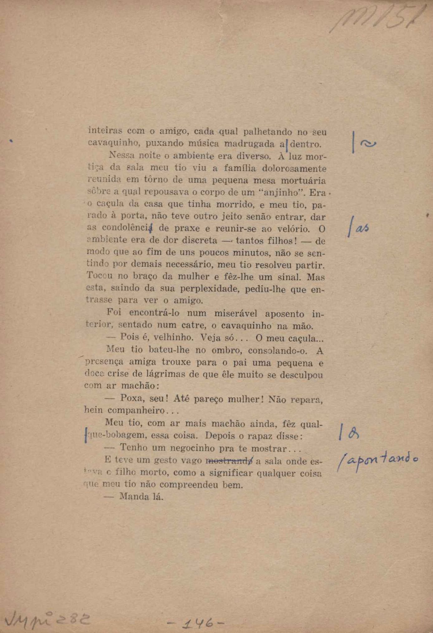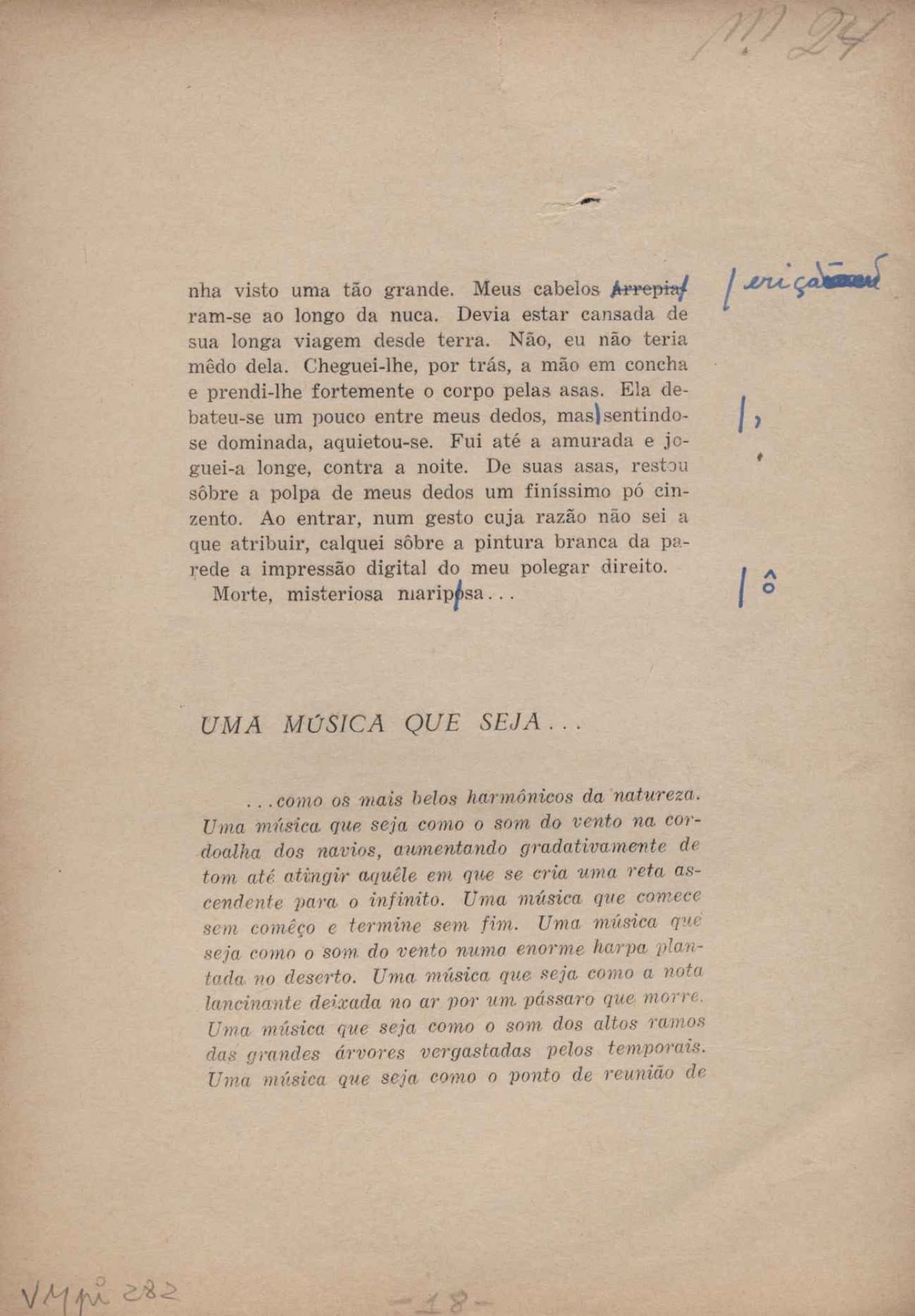 Prova tipográfica da [primeira edição?]. Prosa (1). Anexo: 1. Prova tipográfica incompleta; 2. Outras versões manuscritas e datilografadas, com emendas de: "O amor dos homens", "Antiode à tristeza", "Um beijo", "Blues para Emmett Louis Till", "Canção para a amiga dormindo", "Carta aos puros", "Carta do ausente", "... Deinde Philosophari [publ. "O mosquito"], "Dialética", "Dois poeminhas com Sputnik", "Duas canções de silêncio", "Of gold and God [publ. "Of God and gold"], "Look here, Mr. Buster..." [publ. "Olhe aqui, Mr. Buster..."], "O mais-que-perfeito", "O Margarida's", "As mulheres ocas", "Namorados no mirante", "Natal", "O ônibus Grayhound atravessa o Novo México", "Para viver um grande amor", "Pedro, meu filho", "Poema para Gilberto Amado", "O poeta aprendiz", "O poeta e a rosa", "O poeta", "Quinta rima" [publ. "Lapa de Bandeira"], "Teu nome" e "A última viagem de Jayme Ovalle".