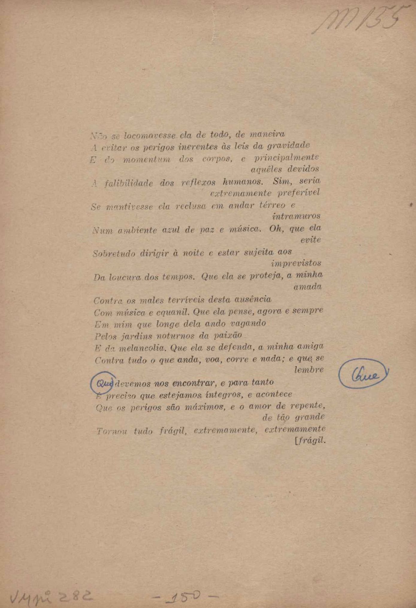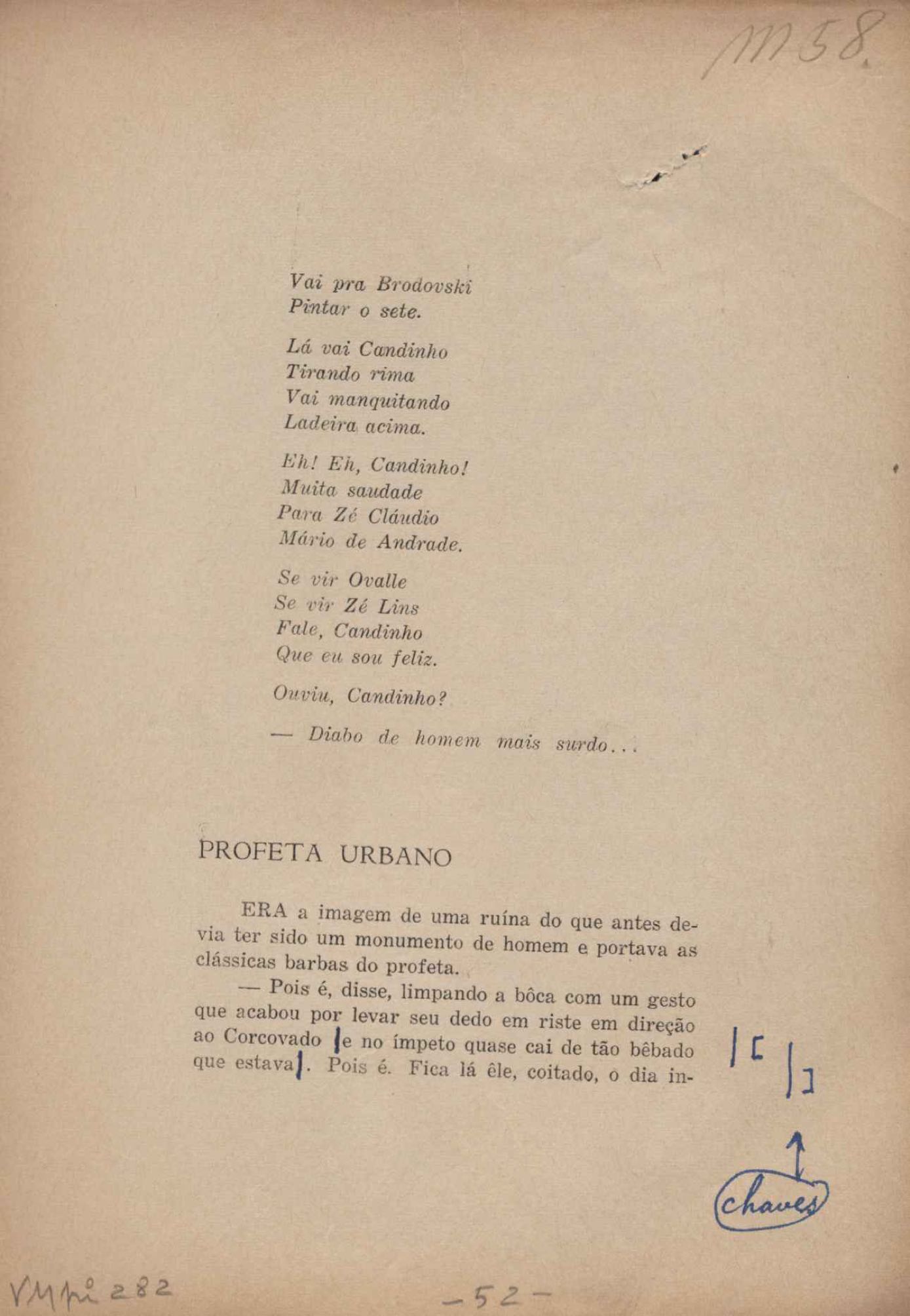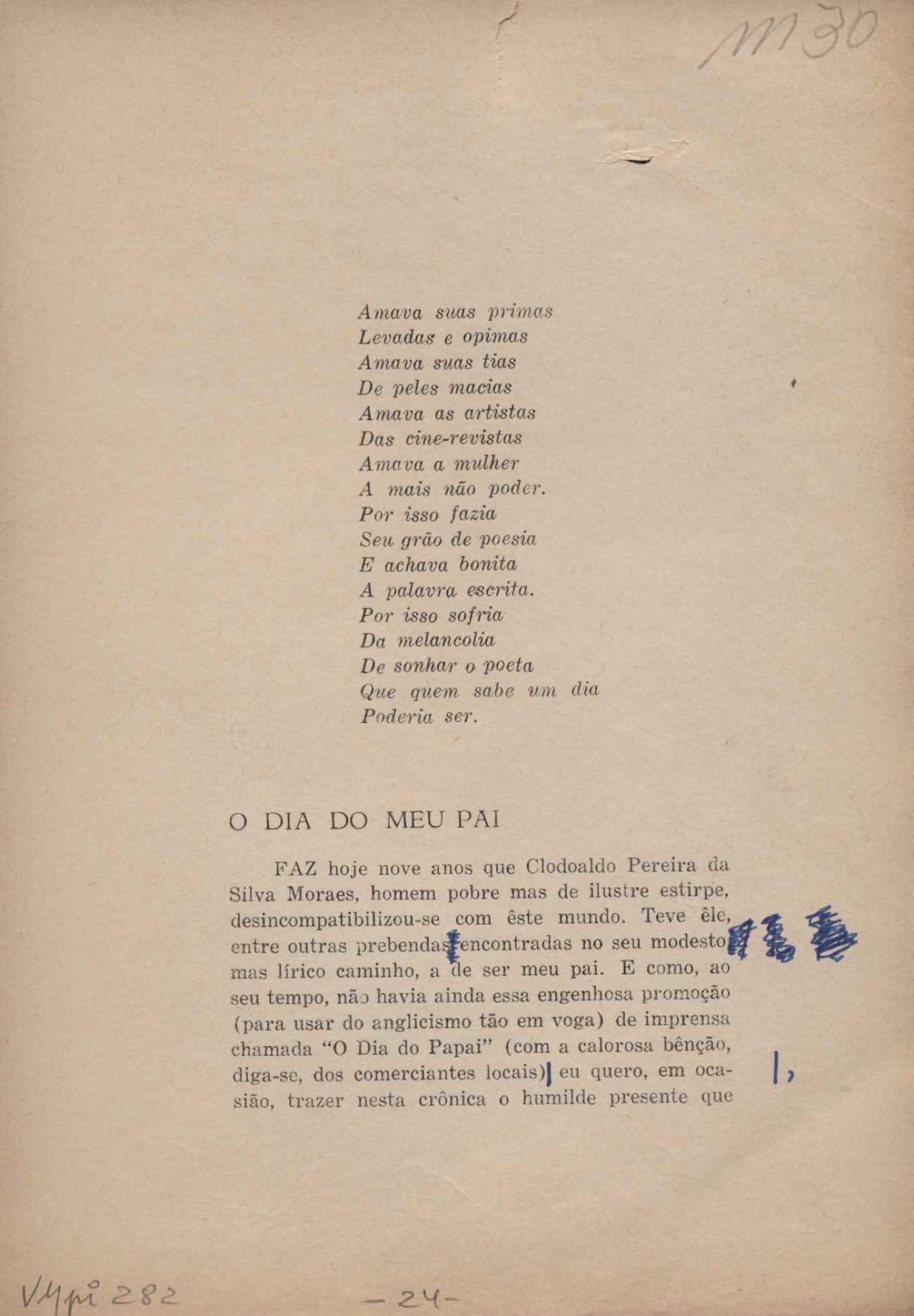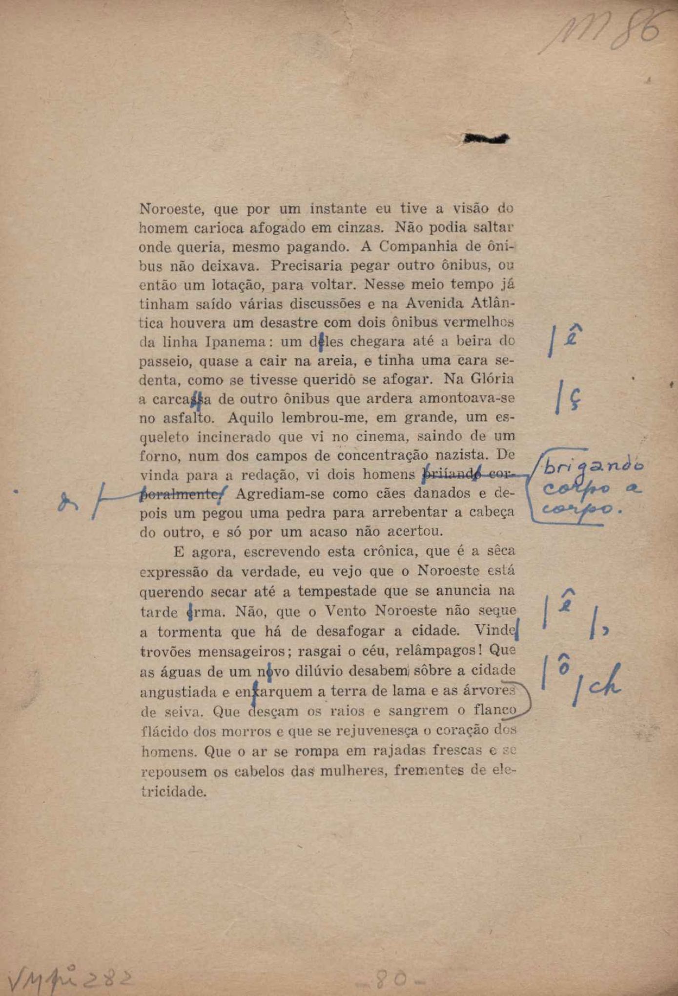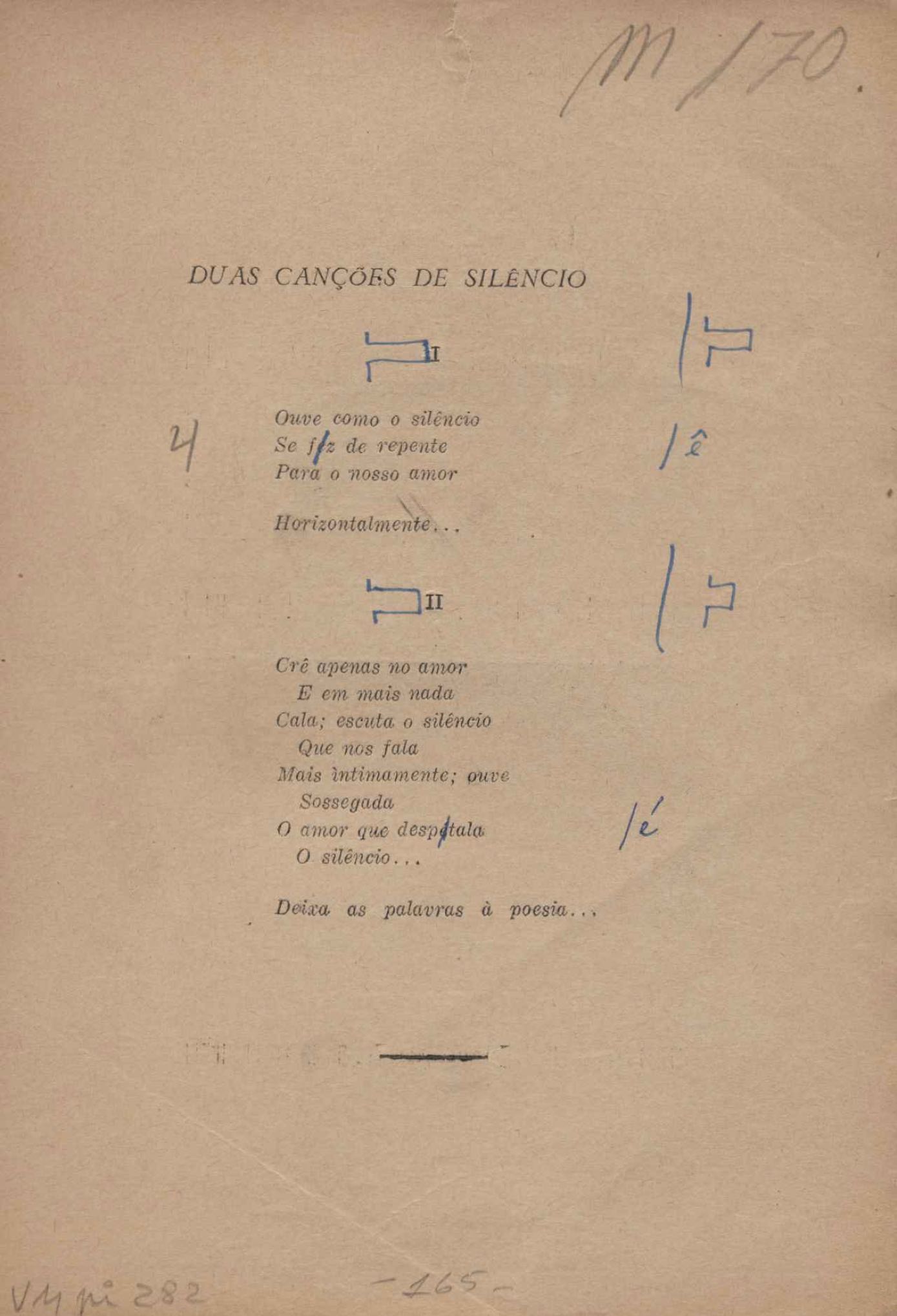Prova tipográfica da [primeira edição?]. Prosa (1). Anexo: 1. Prova tipográfica incompleta; 2. Outras versões manuscritas e datilografadas, com emendas de: "O amor dos homens", "Antiode à tristeza", "Um beijo", "Blues para Emmett Louis Till", "Canção para a amiga dormindo", "Carta aos puros", "Carta do ausente", "... Deinde Philosophari [publ. "O mosquito"], "Dialética", "Dois poeminhas com Sputnik", "Duas canções de silêncio", "Of gold and God [publ. "Of God and gold"], "Look here, Mr. Buster..." [publ. "Olhe aqui, Mr. Buster..."], "O mais-que-perfeito", "O Margarida's", "As mulheres ocas", "Namorados no mirante", "Natal", "O ônibus Grayhound atravessa o Novo México", "Para viver um grande amor", "Pedro, meu filho", "Poema para Gilberto Amado", "O poeta aprendiz", "O poeta e a rosa", "O poeta", "Quinta rima" [publ. "Lapa de Bandeira"], "Teu nome" e "A última viagem de Jayme Ovalle".