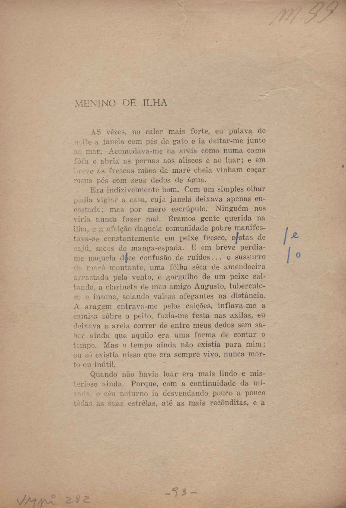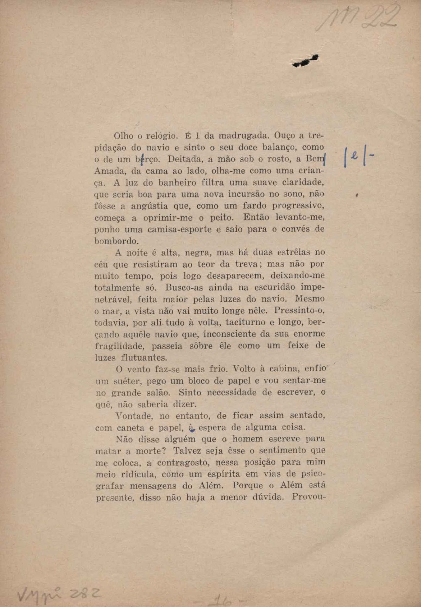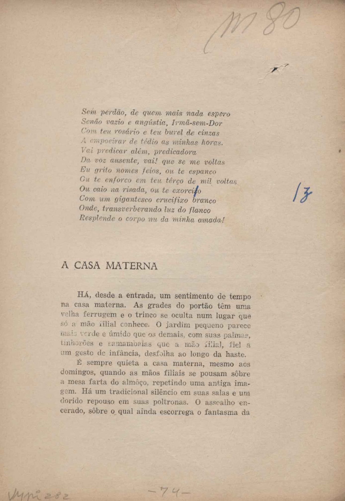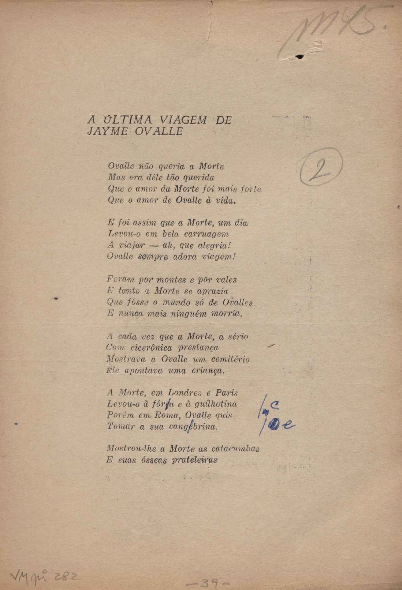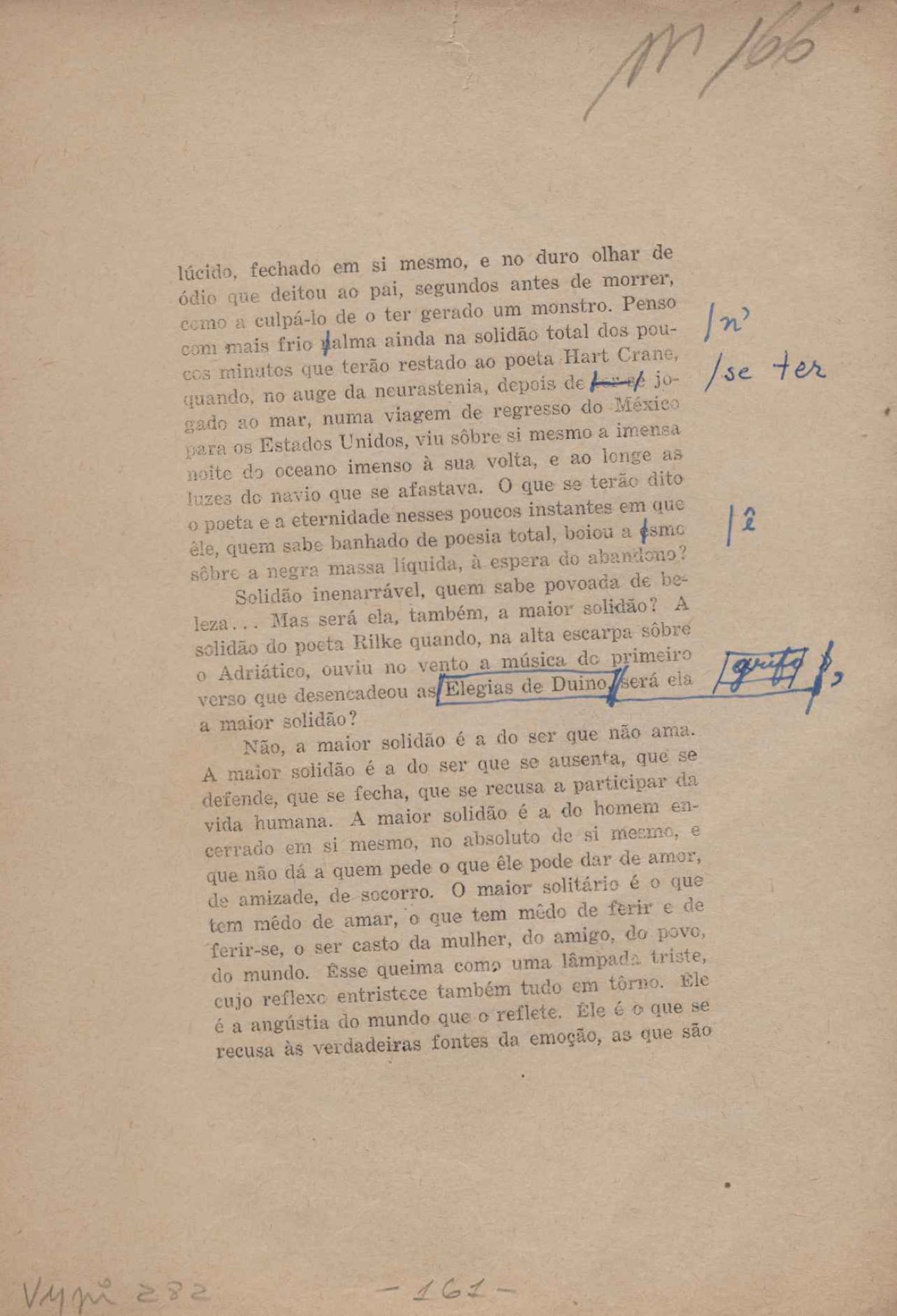 Prova tipográfica da [primeira edição?]. Prosa (1). Anexo: 1. Prova tipográfica incompleta; 2. Outras versões manuscritas e datilografadas, com emendas de: "O amor dos homens", "Antiode à tristeza", "Um beijo", "Blues para Emmett Louis Till", "Canção para a amiga dormindo", "Carta aos puros", "Carta do ausente", "... Deinde Philosophari [publ. "O mosquito"], "Dialética", "Dois poeminhas com Sputnik", "Duas canções de silêncio", "Of gold and God [publ. "Of God and gold"], "Look here, Mr. Buster..." [publ. "Olhe aqui, Mr. Buster..."], "O mais-que-perfeito", "O Margarida's", "As mulheres ocas", "Namorados no mirante", "Natal", "O ônibus Grayhound atravessa o Novo México", "Para viver um grande amor", "Pedro, meu filho", "Poema para Gilberto Amado", "O poeta aprendiz", "O poeta e a rosa", "O poeta", "Quinta rima" [publ. "Lapa de Bandeira"], "Teu nome" e "A última viagem de Jayme Ovalle".