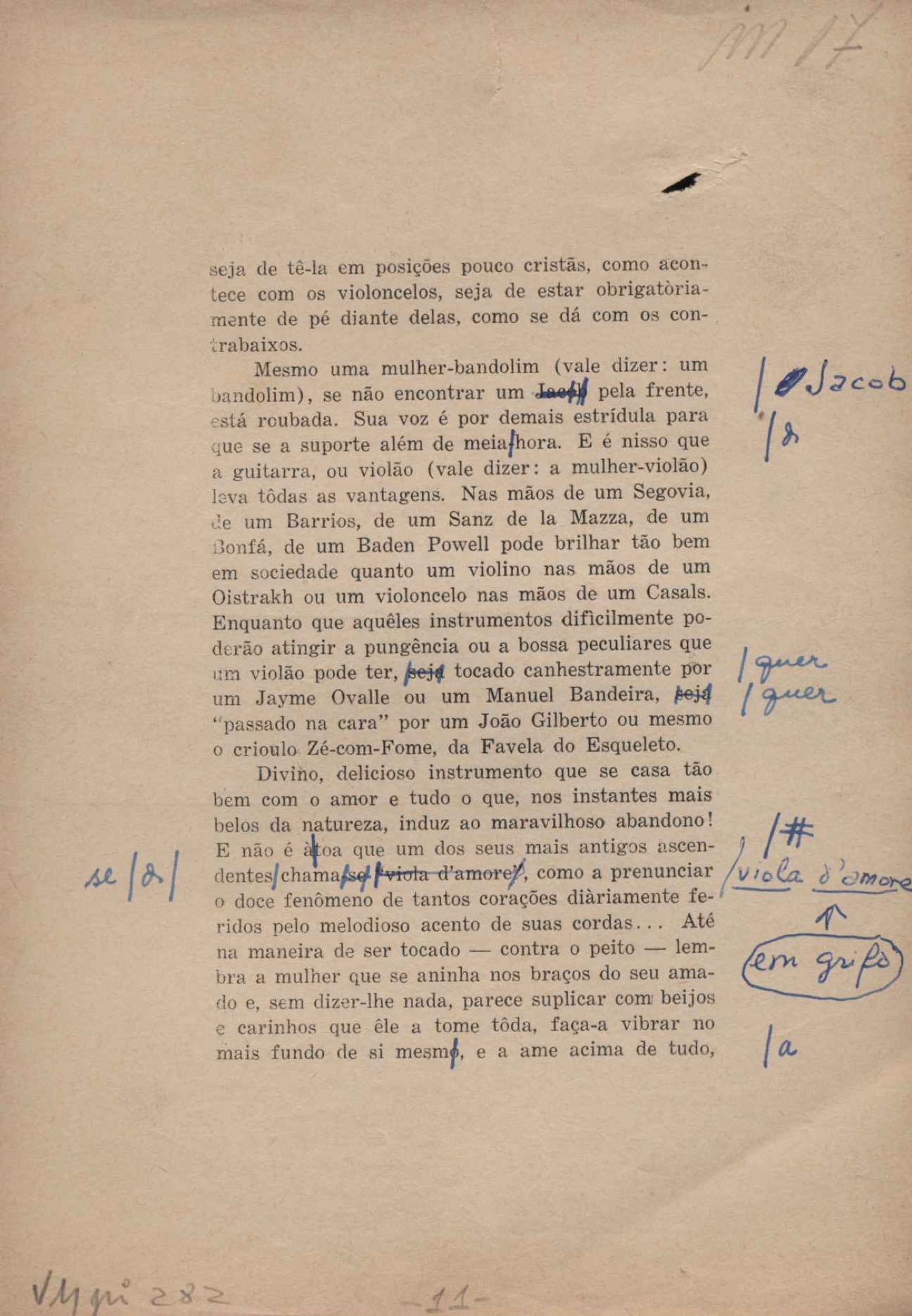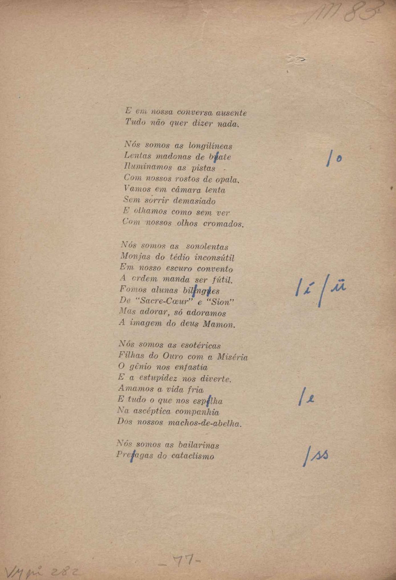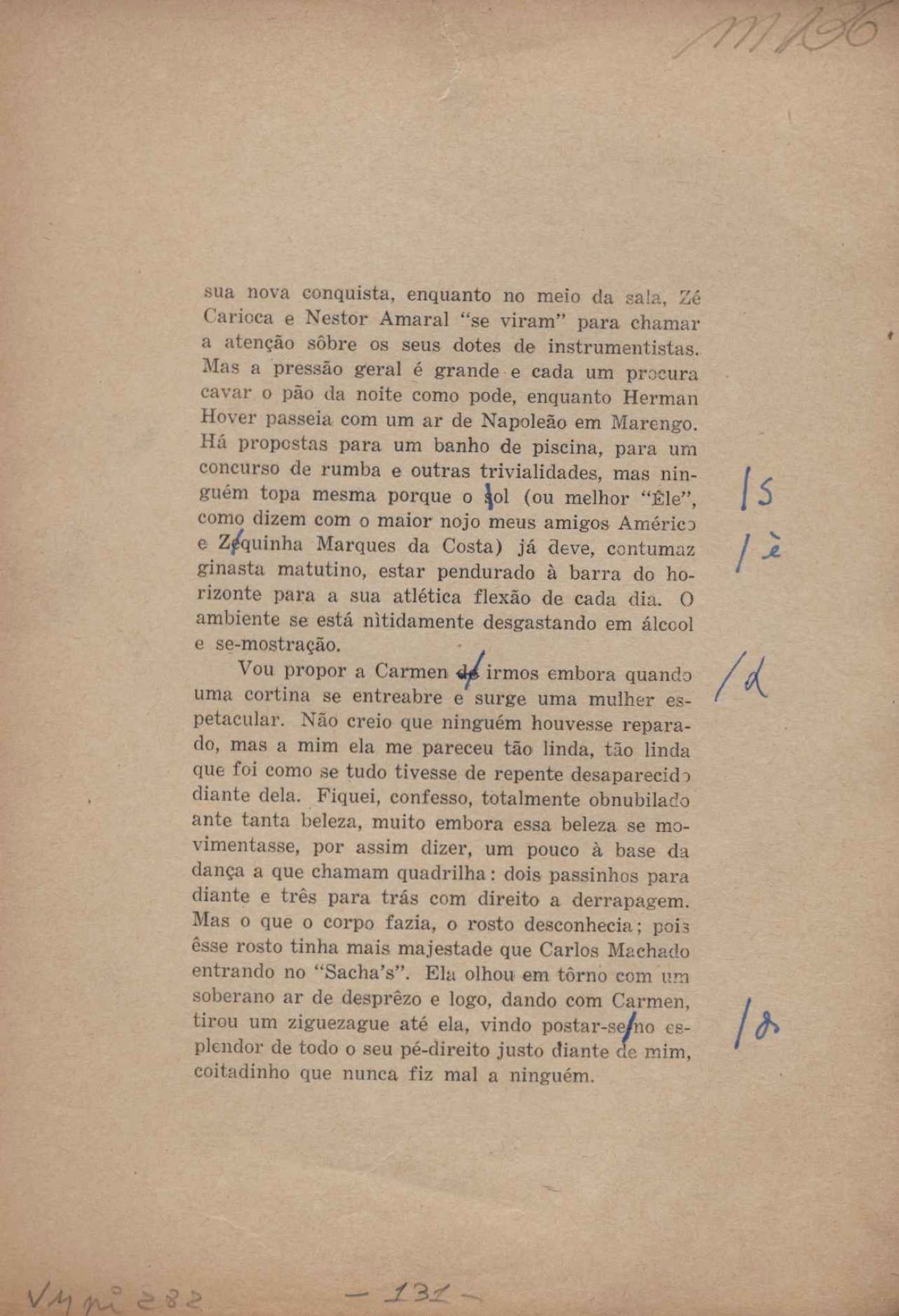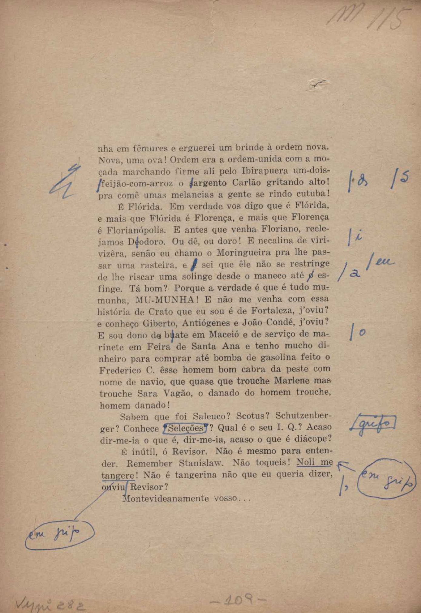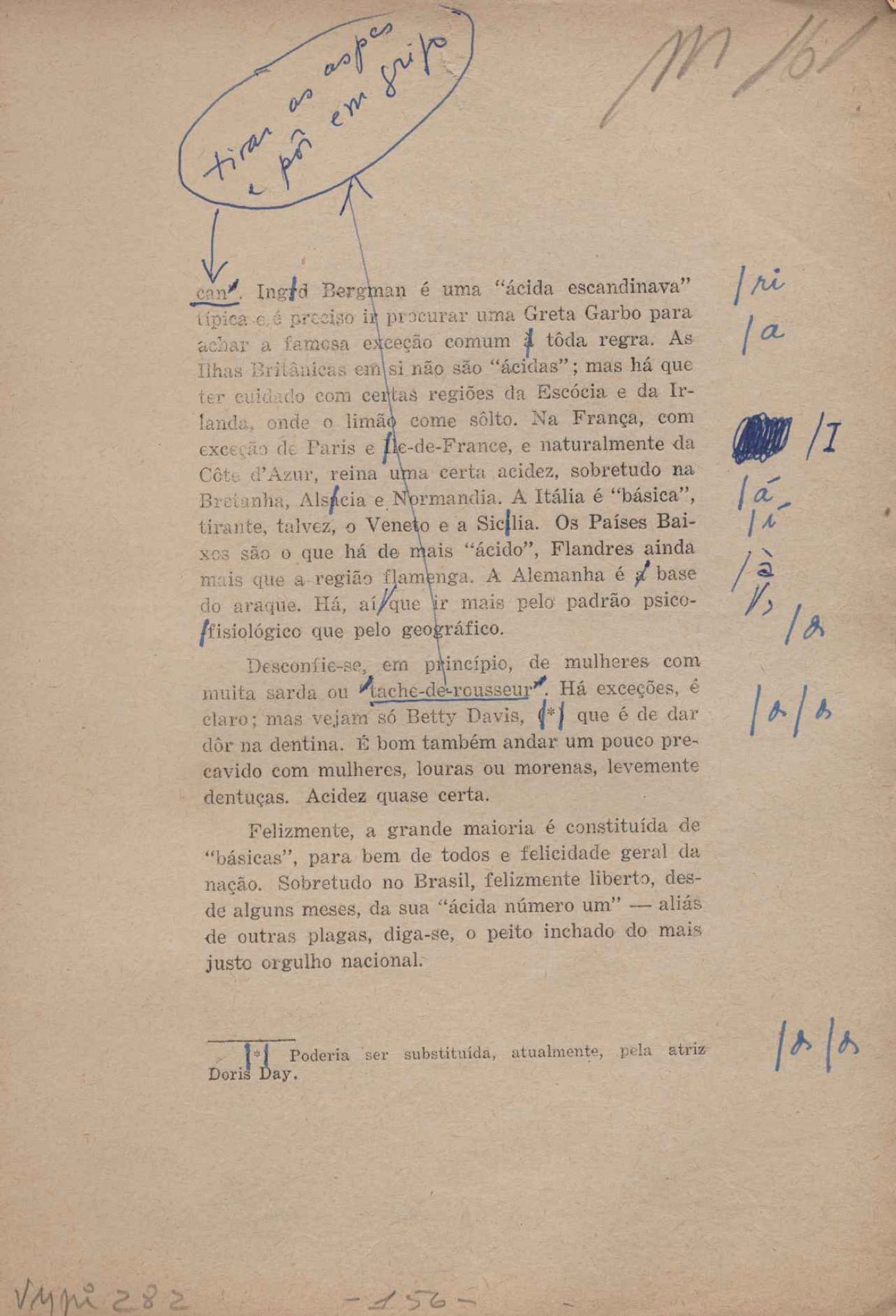 Prova tipográfica da [primeira edição?]. Prosa (1). Anexo: 1. Prova tipográfica incompleta; 2. Outras versões manuscritas e datilografadas, com emendas de: "O amor dos homens", "Antiode à tristeza", "Um beijo", "Blues para Emmett Louis Till", "Canção para a amiga dormindo", "Carta aos puros", "Carta do ausente", "... Deinde Philosophari [publ. "O mosquito"], "Dialética", "Dois poeminhas com Sputnik", "Duas canções de silêncio", "Of gold and God [publ. "Of God and gold"], "Look here, Mr. Buster..." [publ. "Olhe aqui, Mr. Buster..."], "O mais-que-perfeito", "O Margarida's", "As mulheres ocas", "Namorados no mirante", "Natal", "O ônibus Grayhound atravessa o Novo México", "Para viver um grande amor", "Pedro, meu filho", "Poema para Gilberto Amado", "O poeta aprendiz", "O poeta e a rosa", "O poeta", "Quinta rima" [publ. "Lapa de Bandeira"], "Teu nome" e "A última viagem de Jayme Ovalle".