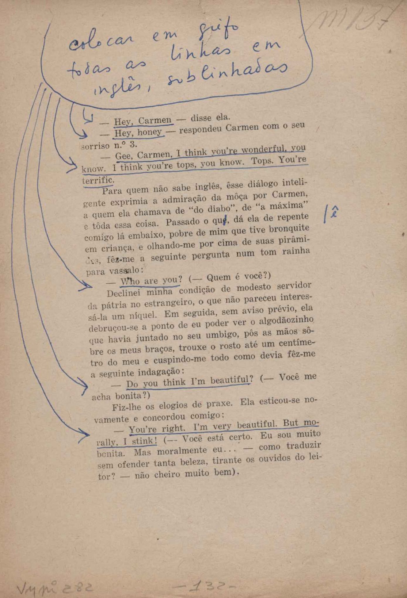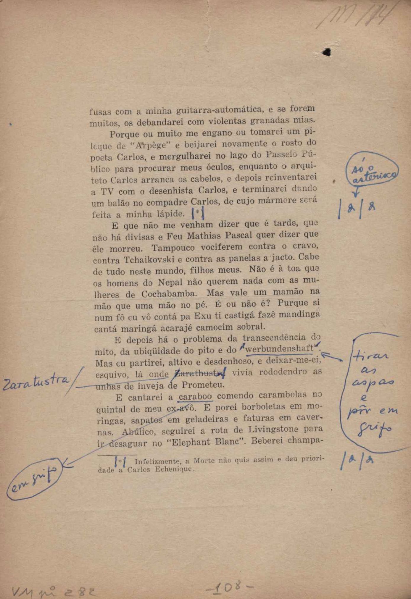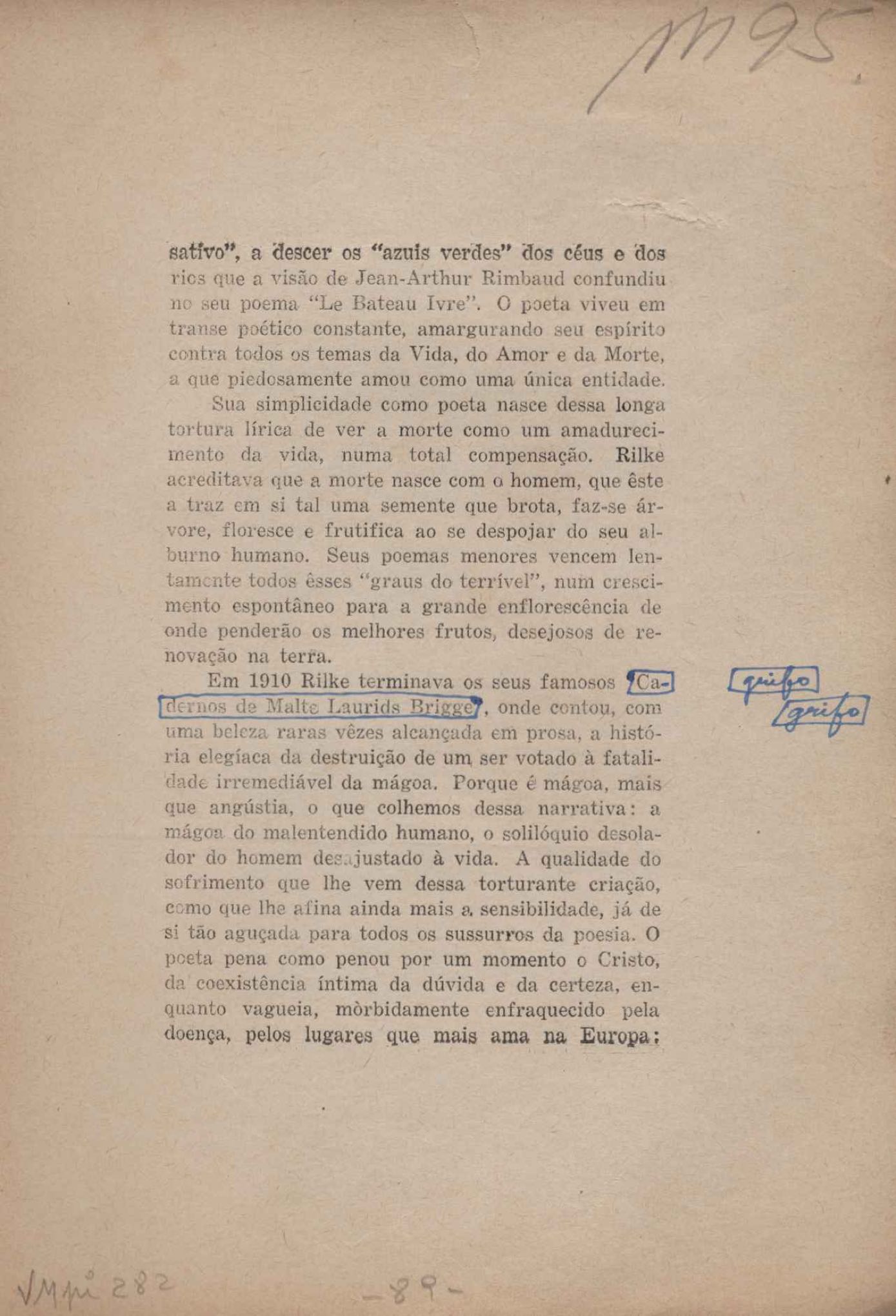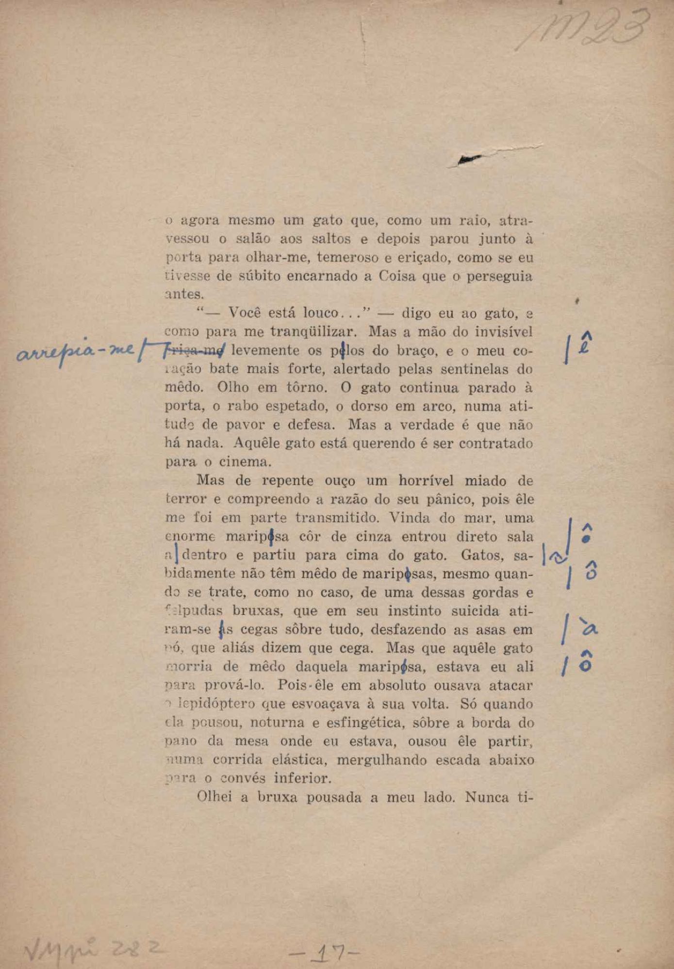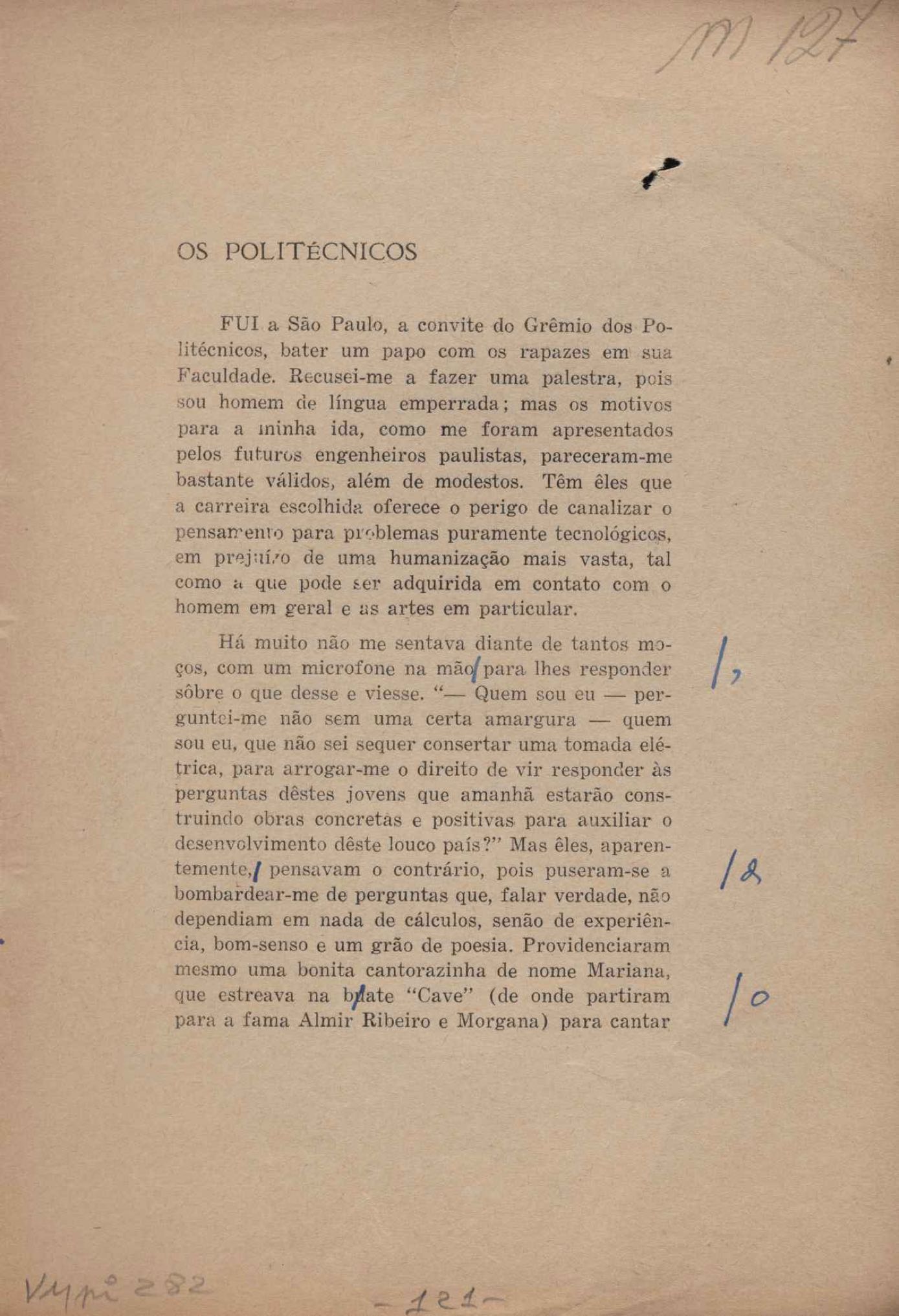 Prova tipográfica da [primeira edição?]. Prosa (1). Anexo: 1. Prova tipográfica incompleta; 2. Outras versões manuscritas e datilografadas, com emendas de: "O amor dos homens", "Antiode à tristeza", "Um beijo", "Blues para Emmett Louis Till", "Canção para a amiga dormindo", "Carta aos puros", "Carta do ausente", "... Deinde Philosophari [publ. "O mosquito"], "Dialética", "Dois poeminhas com Sputnik", "Duas canções de silêncio", "Of gold and God [publ. "Of God and gold"], "Look here, Mr. Buster..." [publ. "Olhe aqui, Mr. Buster..."], "O mais-que-perfeito", "O Margarida's", "As mulheres ocas", "Namorados no mirante", "Natal", "O ônibus Grayhound atravessa o Novo México", "Para viver um grande amor", "Pedro, meu filho", "Poema para Gilberto Amado", "O poeta aprendiz", "O poeta e a rosa", "O poeta", "Quinta rima" [publ. "Lapa de Bandeira"], "Teu nome" e "A última viagem de Jayme Ovalle".