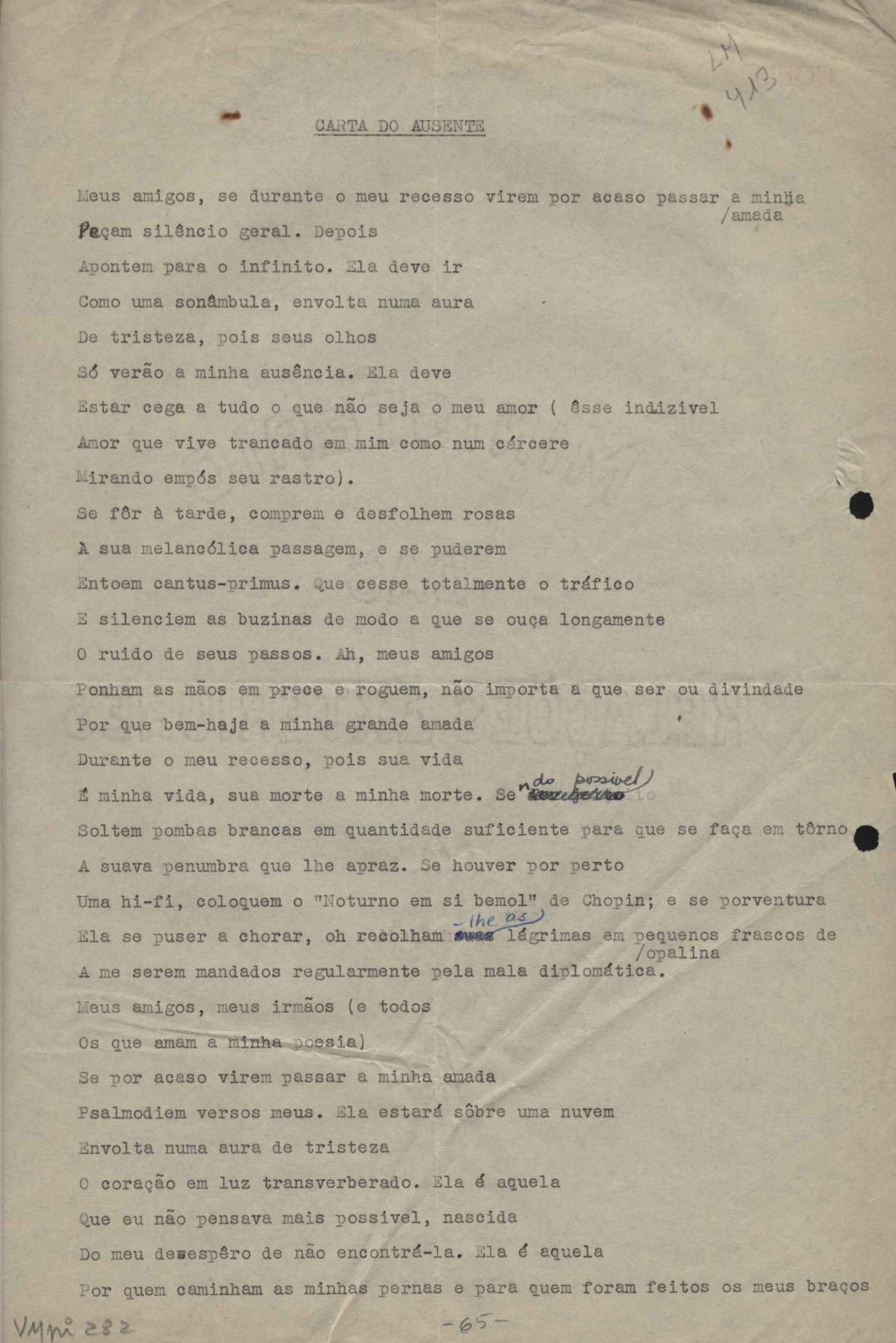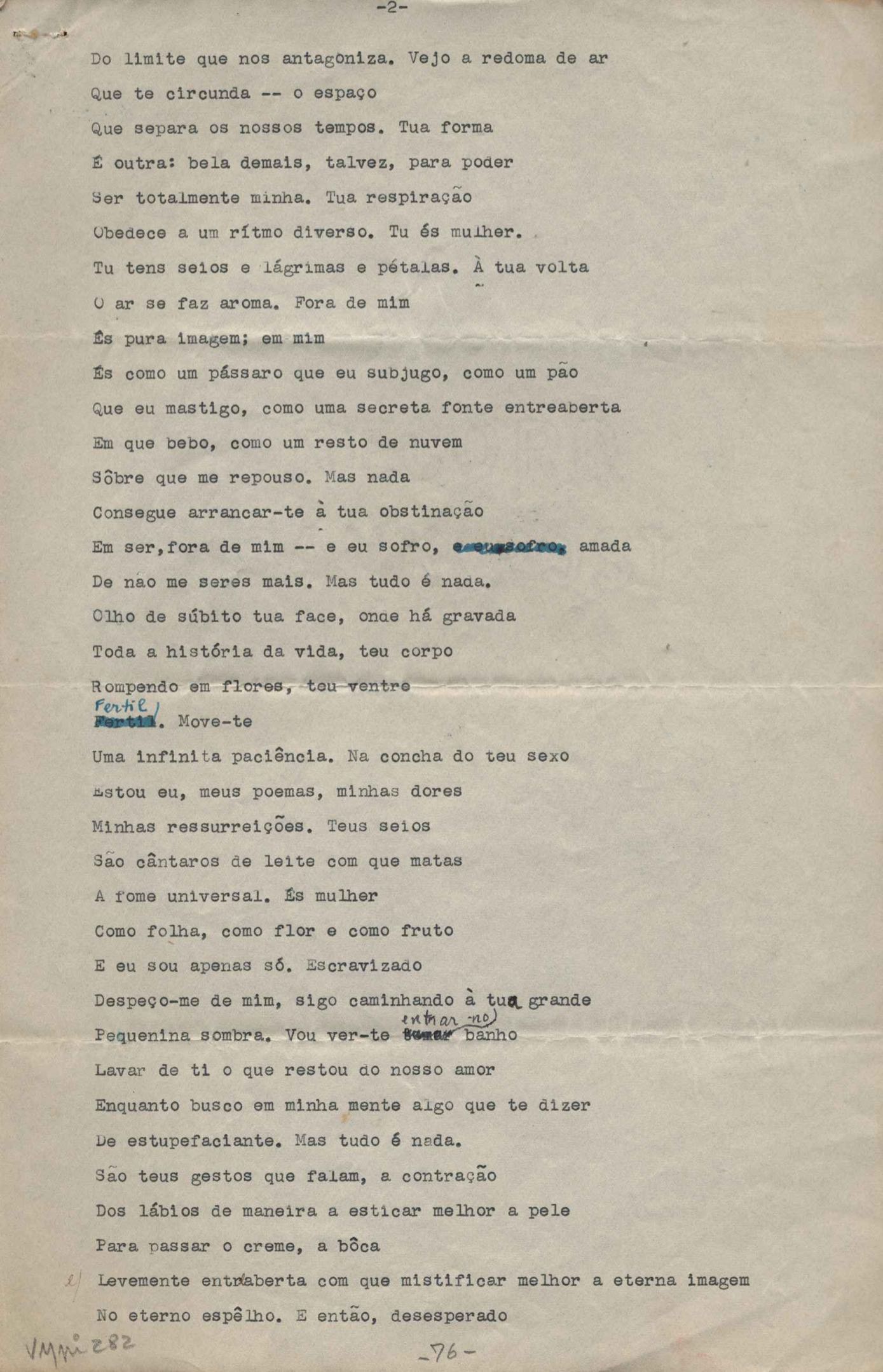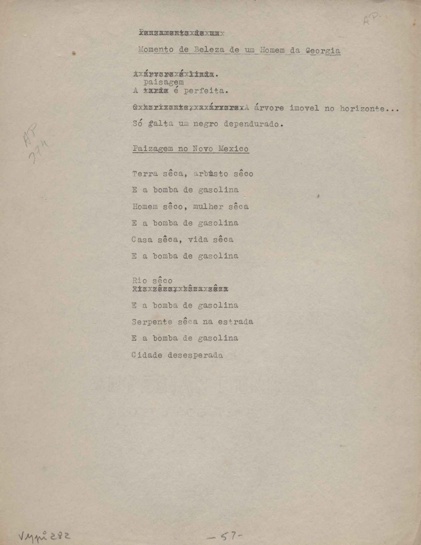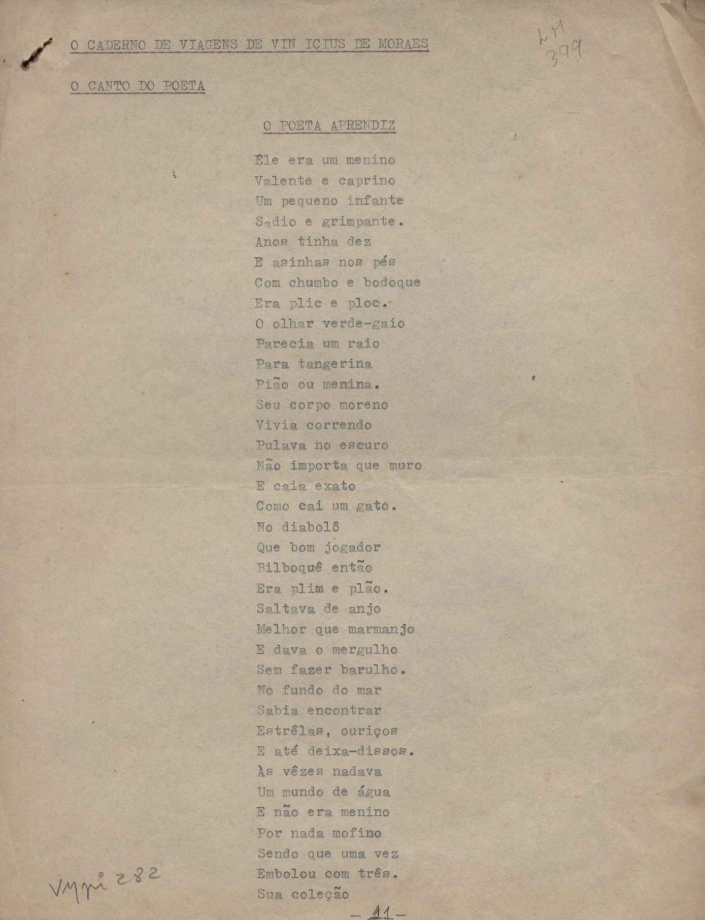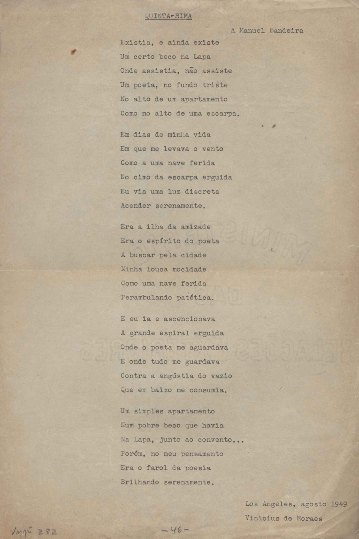 Prova tipográfica da [primeira edição?]. Prosa (1). Anexo: 1. Prova tipográfica incompleta; 2. Outras versões manuscritas e datilografadas, com emendas de: "O amor dos homens", "Antiode à tristeza", "Um beijo", "Blues para Emmett Louis Till", "Canção para a amiga dormindo", "Carta aos puros", "Carta do ausente", "... Deinde Philosophari [publ. "O mosquito"], "Dialética", "Dois poeminhas com Sputnik", "Duas canções de silêncio", "Of gold and God [publ. "Of God and gold"], "Look here, mr. Buster..." [publ. "Olhe aqui, mr. Buster..."], "O mais-que-perfeito", "O Margarida's", "As mulheres ocas", "Namorados no mirante", "Natal", "O ônibus Greyhound atravessa o Novo México", "Para viver um grande amor", "Pedro, meu filho", "Poema para Gilberto Amado", "O poeta aprendiz", "O poeta e a rosa", "O poeta", "Quinta rima" [publ. "Lapa de Bandeira"], "Teu nome" e "A última viagem de Jayme Ovalle".