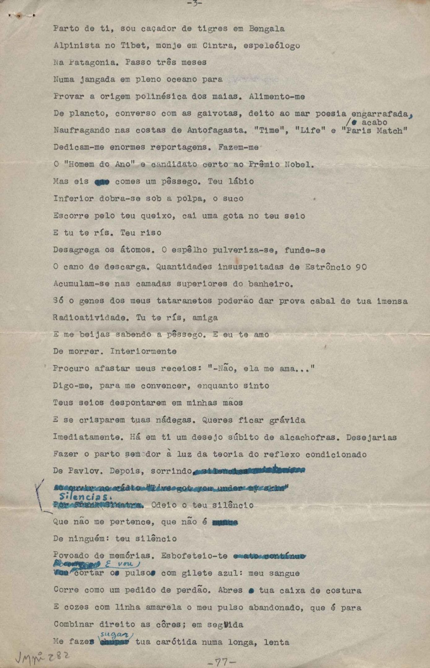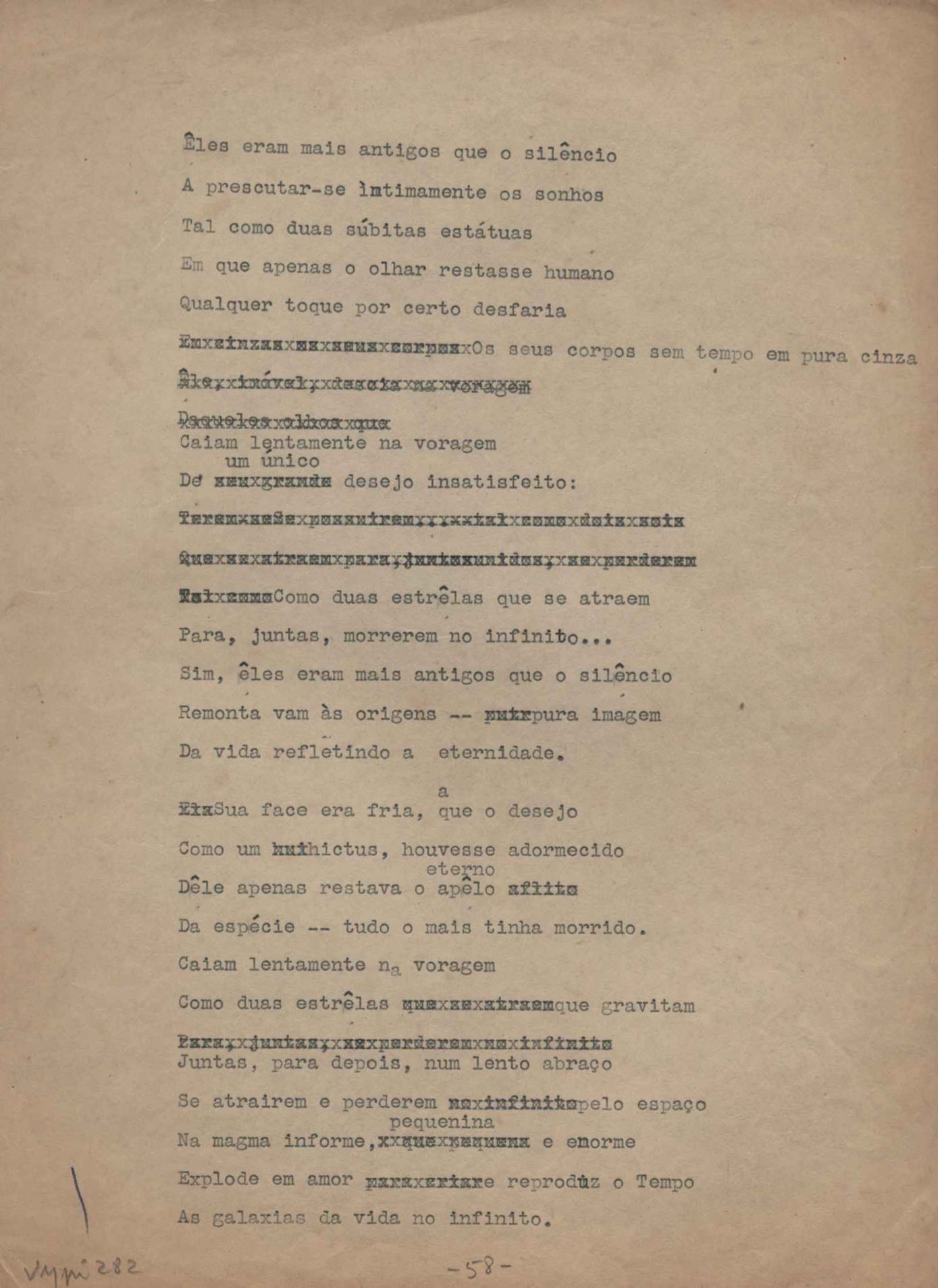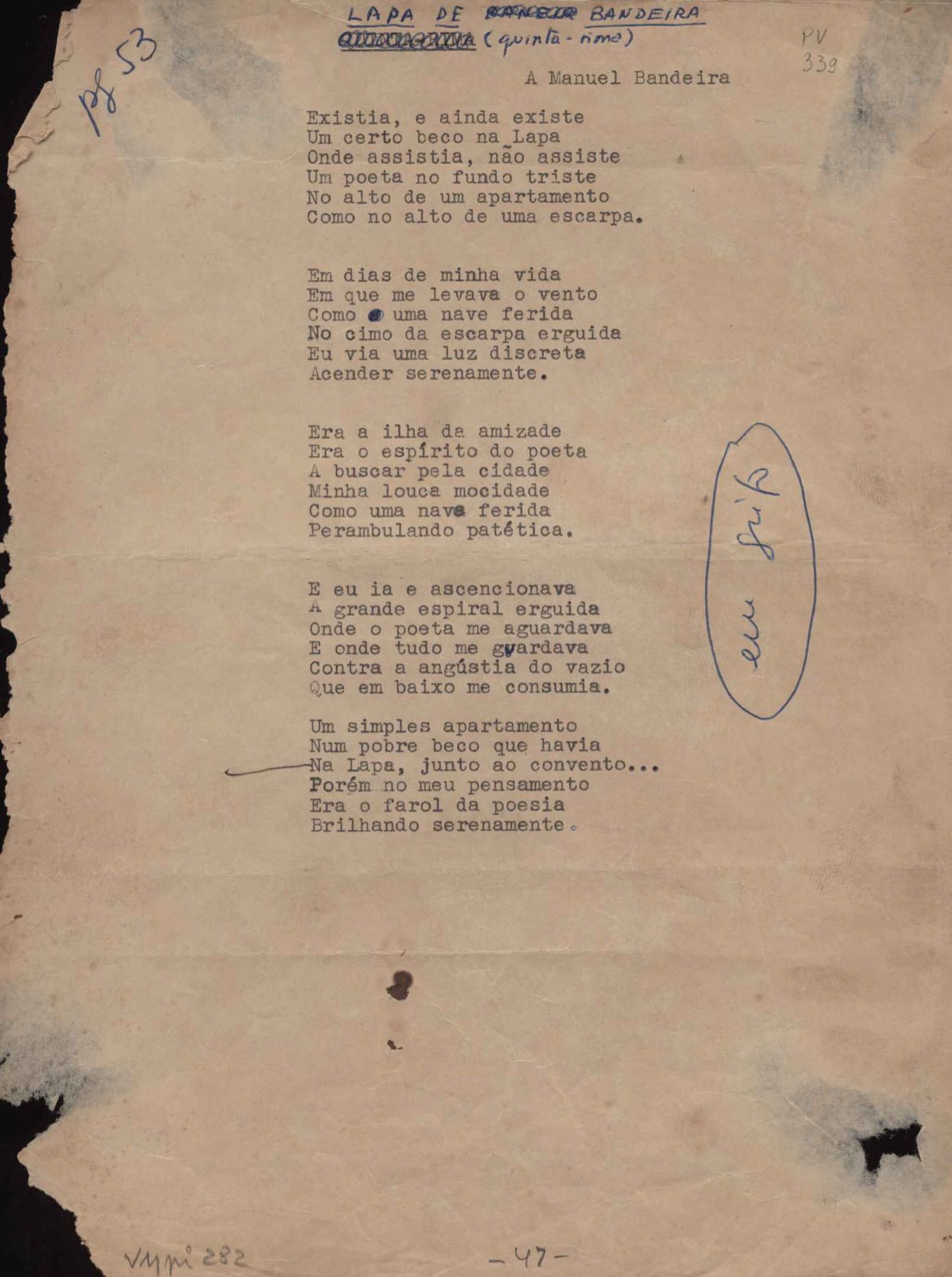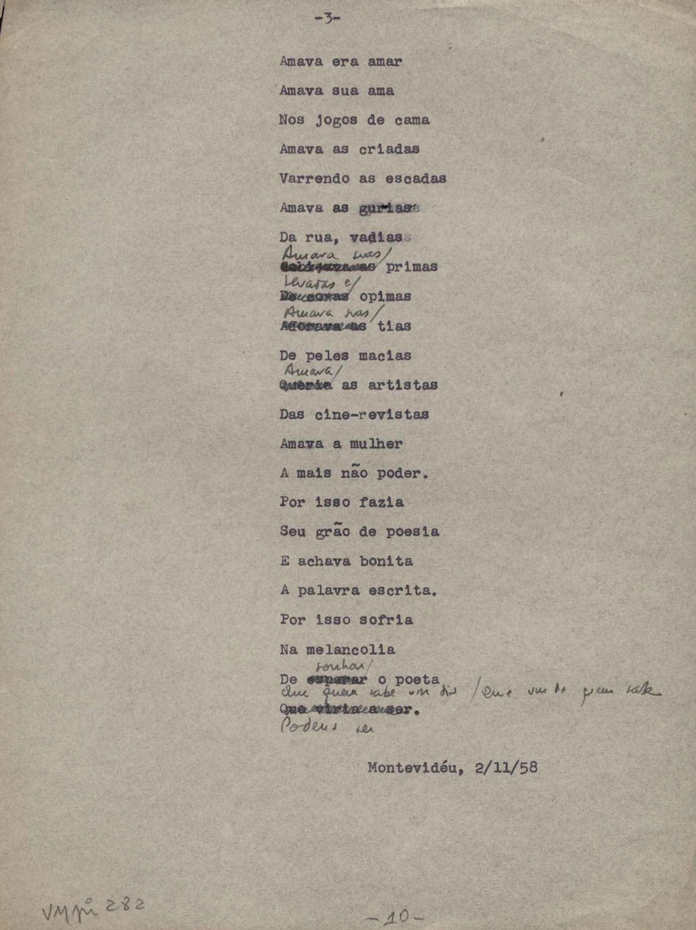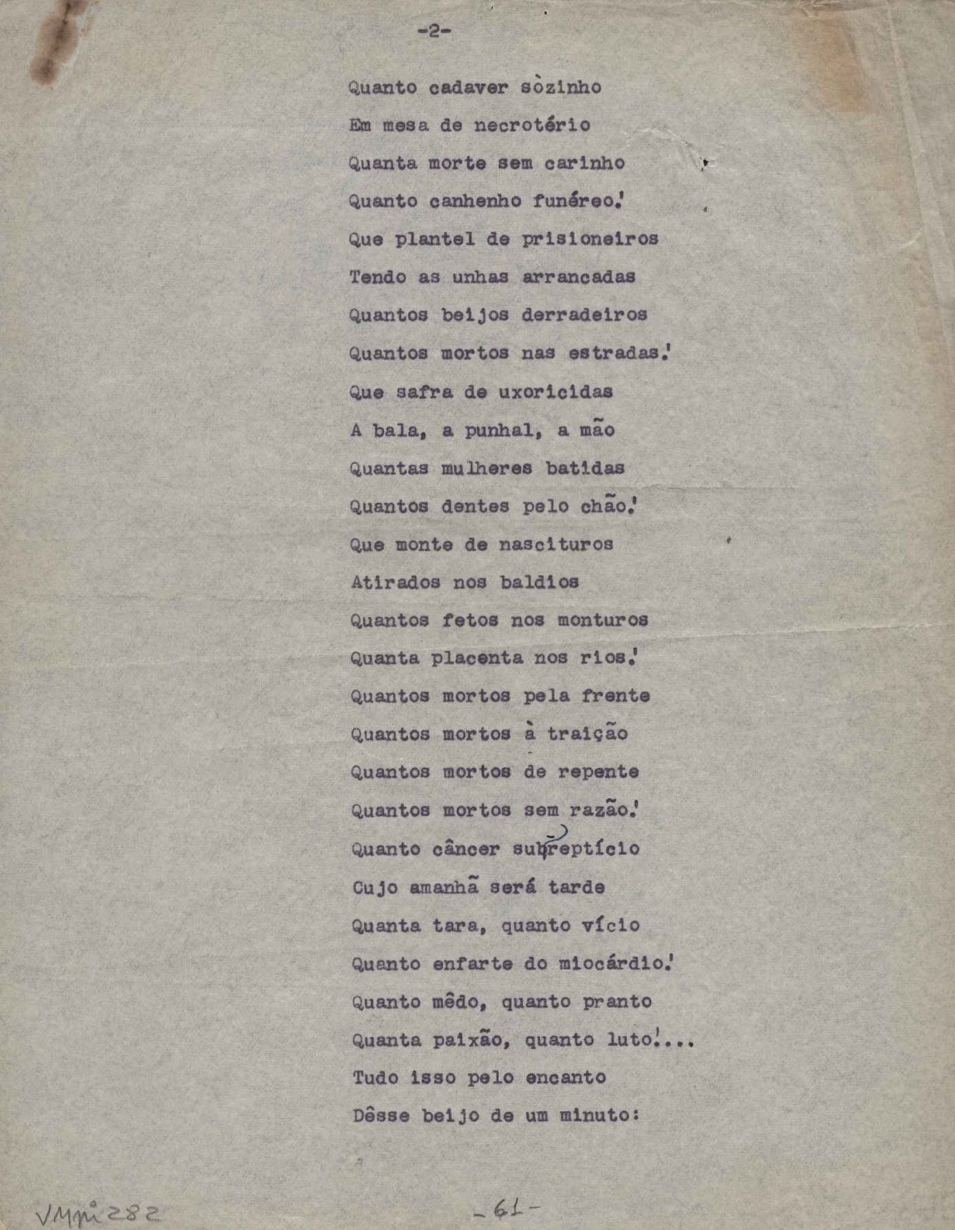 Prova tipográfica da [primeira edição?]. Prosa (1). Anexo: 1. Prova tipográfica incompleta; 2. Outras versões manuscritas e datilografadas, com emendas de: "O amor dos homens", "Antiode à tristeza", "Um beijo", "Blues para Emmett Louis Till", "Canção para a amiga dormindo", "Carta aos puros", "Carta do ausente", "... Deinde Philosophari [publ. "O mosquito"], "Dialética", "Dois poeminhas com Sputnik", "Duas canções de silêncio", "Of gold and God [publ. "Of God and gold"], "Look here, mr. Buster..." [publ. "Olhe aqui, mr. Buster..."], "O mais-que-perfeito", "O Margarida's", "As mulheres ocas", "Namorados no mirante", "Natal", "O ônibus Greyhound atravessa o Novo México", "Para viver um grande amor", "Pedro, meu filho", "Poema para Gilberto Amado", "O poeta aprendiz", "O poeta e a rosa", "O poeta", "Quinta rima" [publ. "Lapa de Bandeira"], "Teu nome" e "A última viagem de Jayme Ovalle".