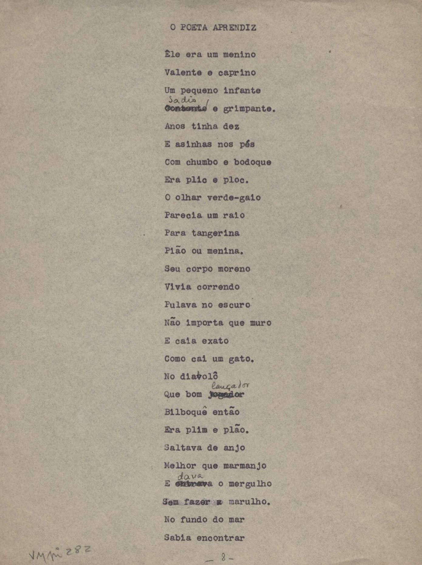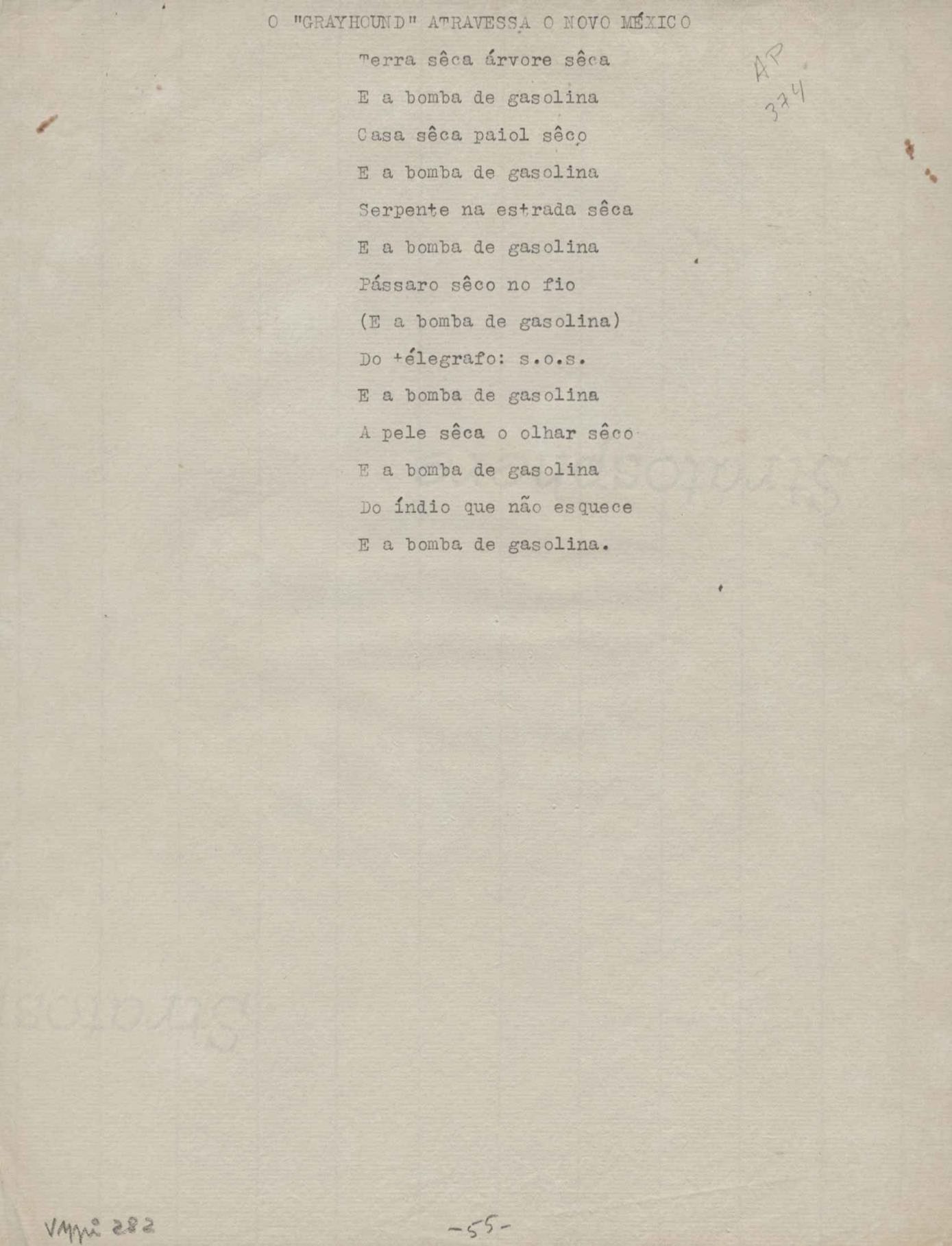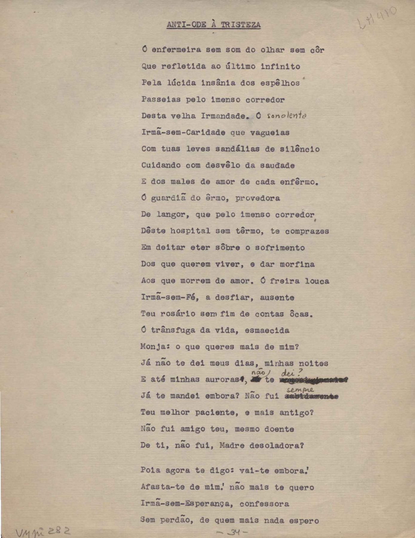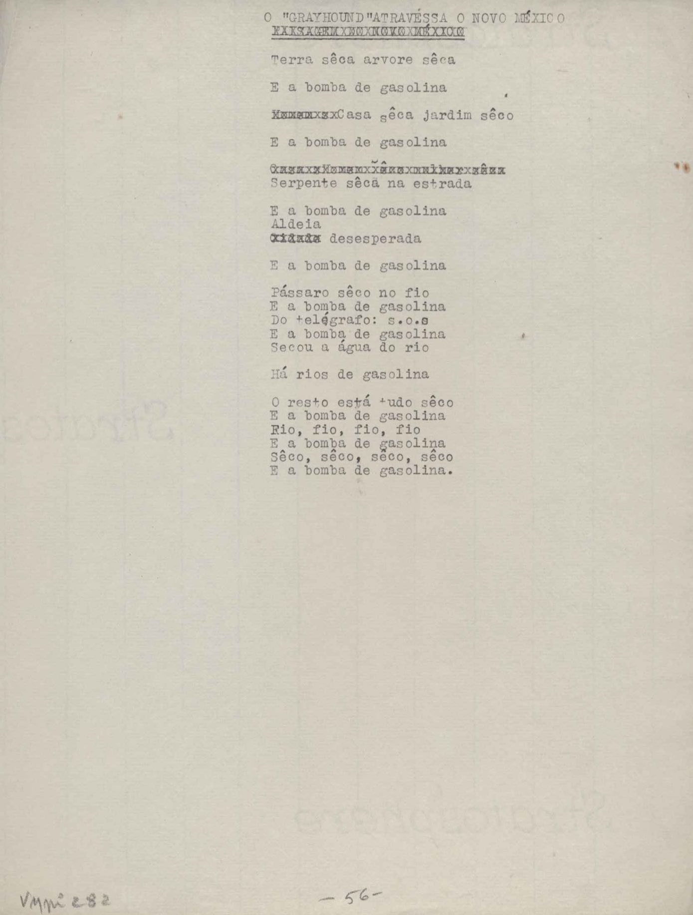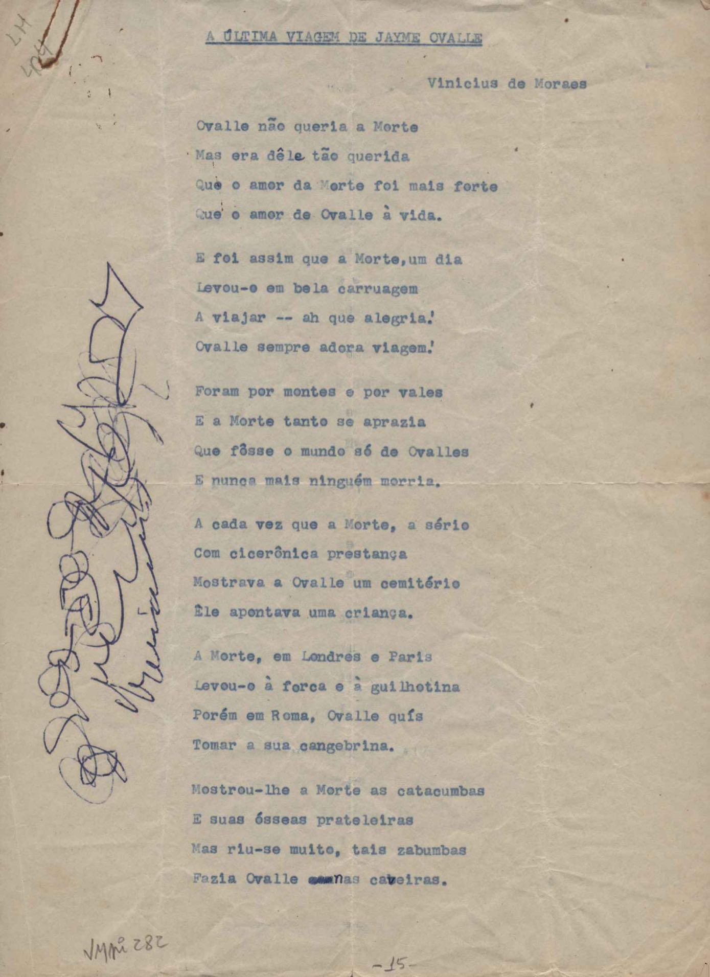 Prova tipográfica da [primeira edição?]. Prosa (1). Anexo: 1. Prova tipográfica incompleta; 2. Outras versões manuscritas e datilografadas, com emendas de: "O amor dos homens", "Antiode à tristeza", "Um beijo", "Blues para Emmett Louis Till", "Canção para a amiga dormindo", "Carta aos puros", "Carta do ausente", "... Deinde Philosophari [publ. "O mosquito"], "Dialética", "Dois poeminhas com Sputnik", "Duas canções de silêncio", "Of gold and God [publ. "Of God and gold"], "Look here, mr. Buster..." [publ. "Olhe aqui, mr. Buster..."], "O mais-que-perfeito", "O Margarida's", "As mulheres ocas", "Namorados no mirante", "Natal", "O ônibus Greyhound atravessa o Novo México", "Para viver um grande amor", "Pedro, meu filho", "Poema para Gilberto Amado", "O poeta aprendiz", "O poeta e a rosa", "O poeta", "Quinta rima" [publ. "Lapa de Bandeira"], "Teu nome" e "A última viagem de Jayme Ovalle".