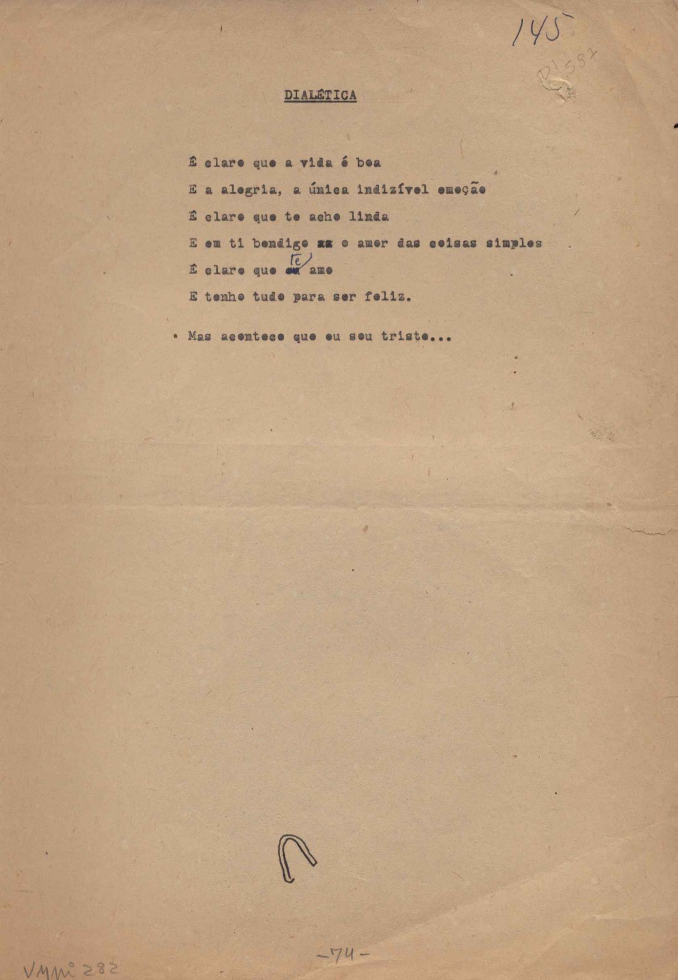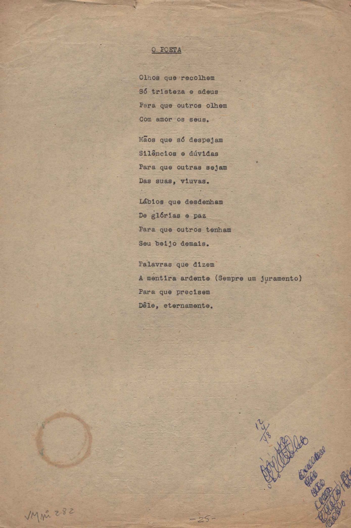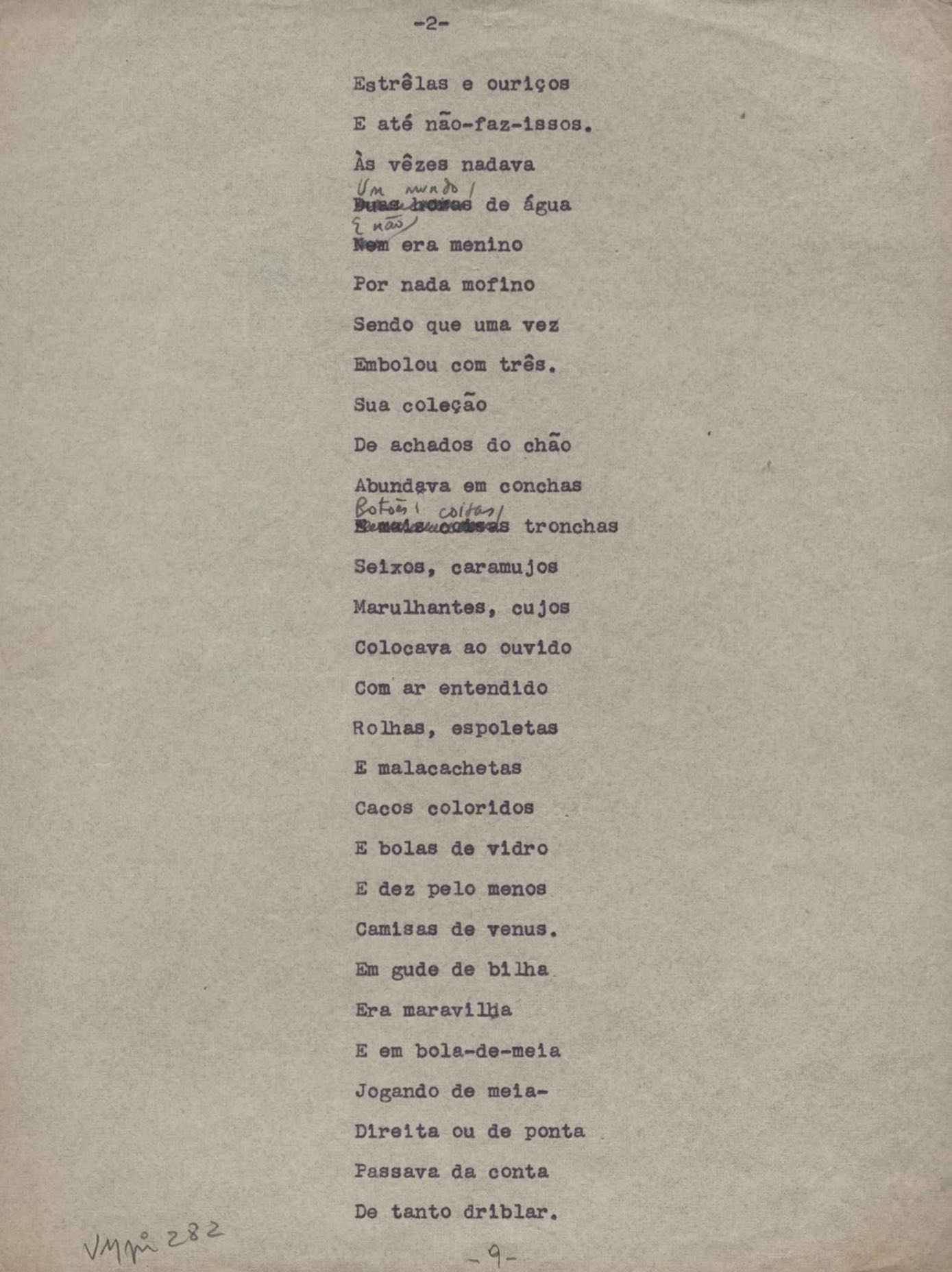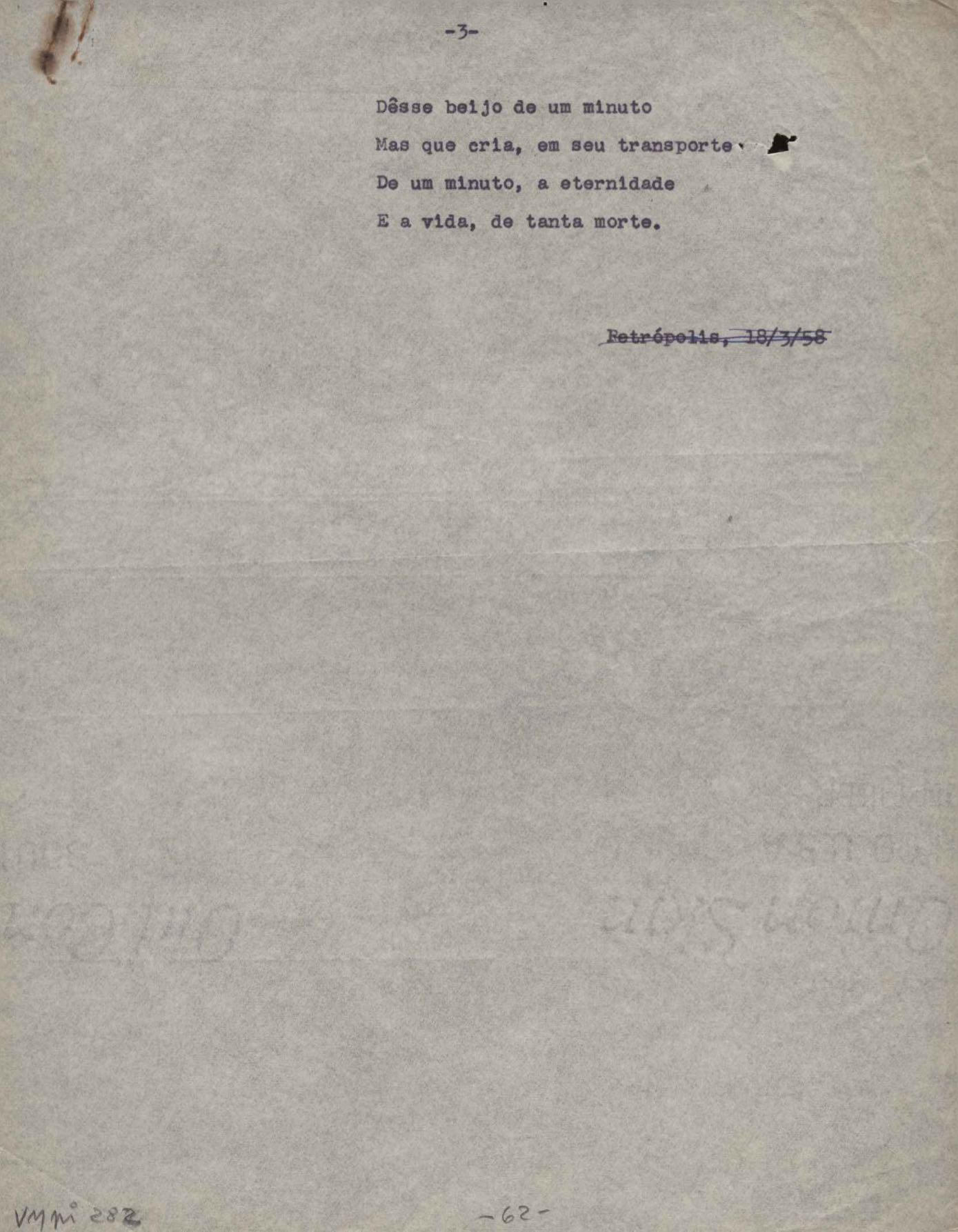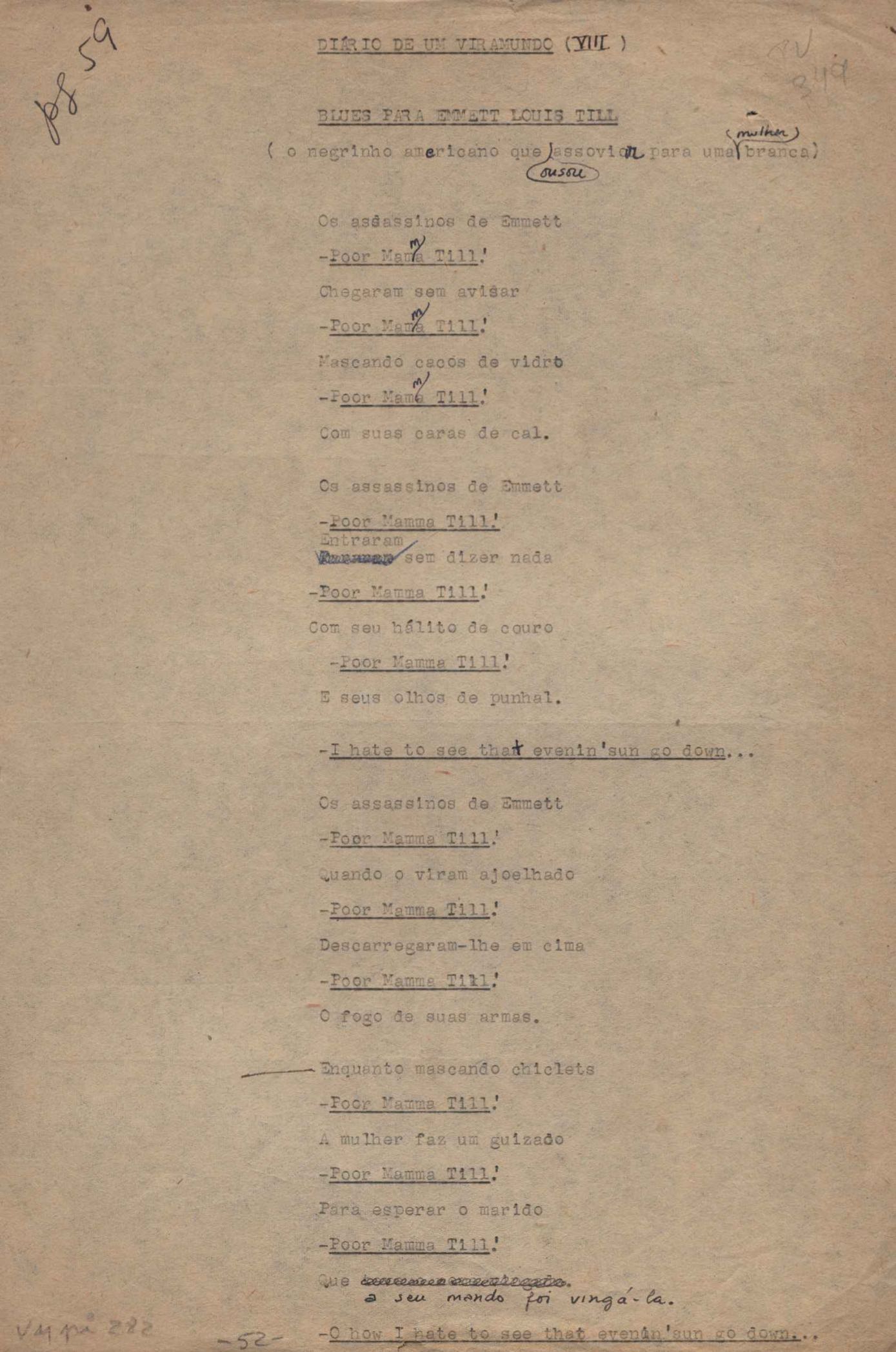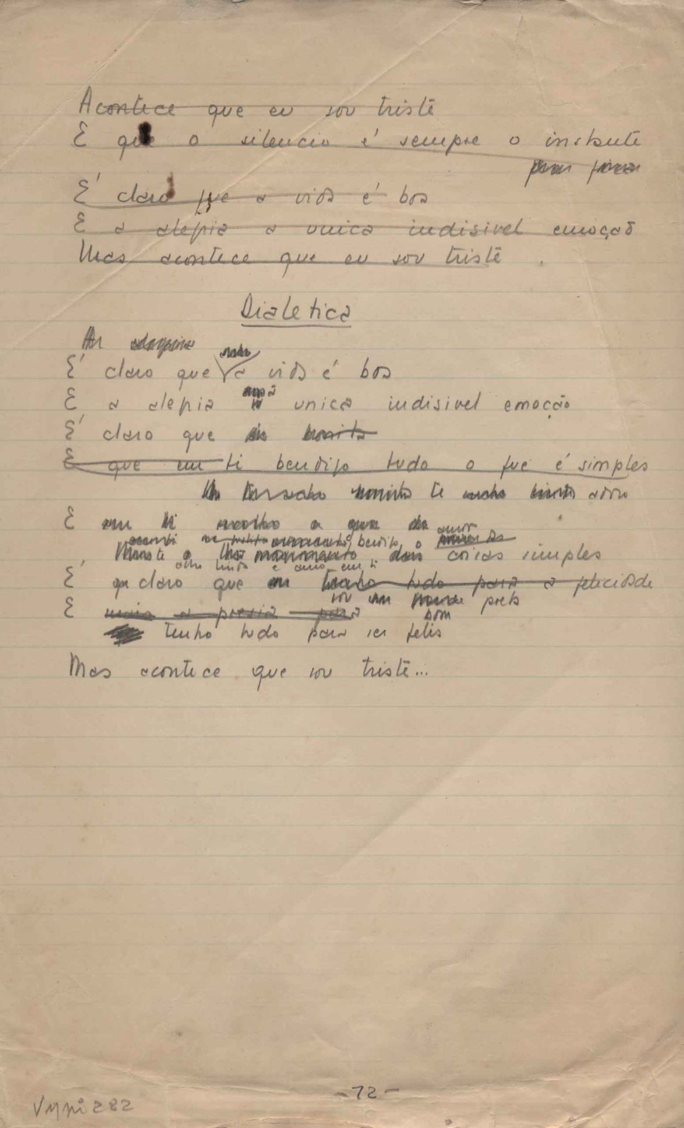 Prova tipográfica da [primeira edição?]. Prosa (1). Anexo: 1. Prova tipográfica incompleta; 2. Outras versões manuscritas e datilografadas, com emendas de: "O amor dos homens", "Antiode à tristeza", "Um beijo", "Blues para Emmett Louis Till", "Canção para a amiga dormindo", "Carta aos puros", "Carta do ausente", "... Deinde Philosophari [publ. "O mosquito"], "Dialética", "Dois poeminhas com Sputnik", "Duas canções de silêncio", "Of gold and God [publ. "Of God and gold"], "Look here, mr. Buster..." [publ. "Olhe aqui, mr. Buster..."], "O mais-que-perfeito", "O Margarida's", "As mulheres ocas", "Namorados no mirante", "Natal", "O ônibus Greyhound atravessa o Novo México", "Para viver um grande amor", "Pedro, meu filho", "Poema para Gilberto Amado", "O poeta aprendiz", "O poeta e a rosa", "O poeta", "Quinta rima" [publ. "Lapa de Bandeira"], "Teu nome" e "A última viagem de Jayme Ovalle".