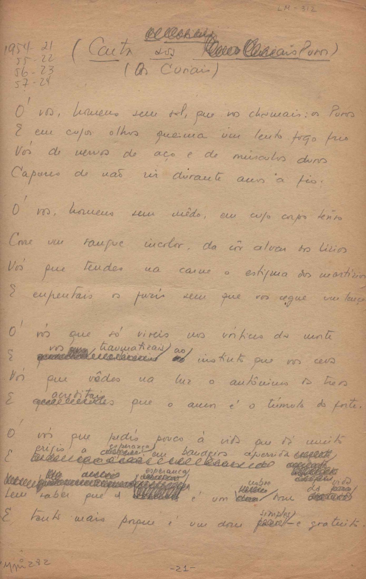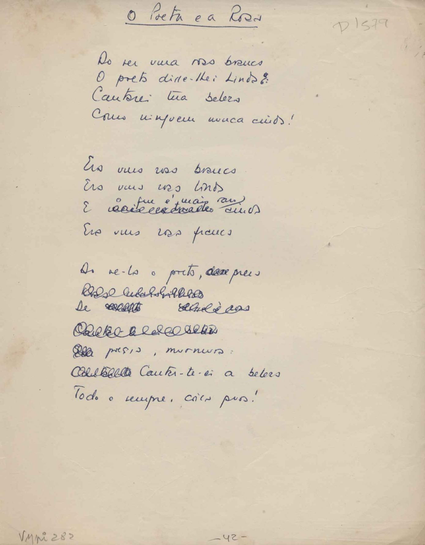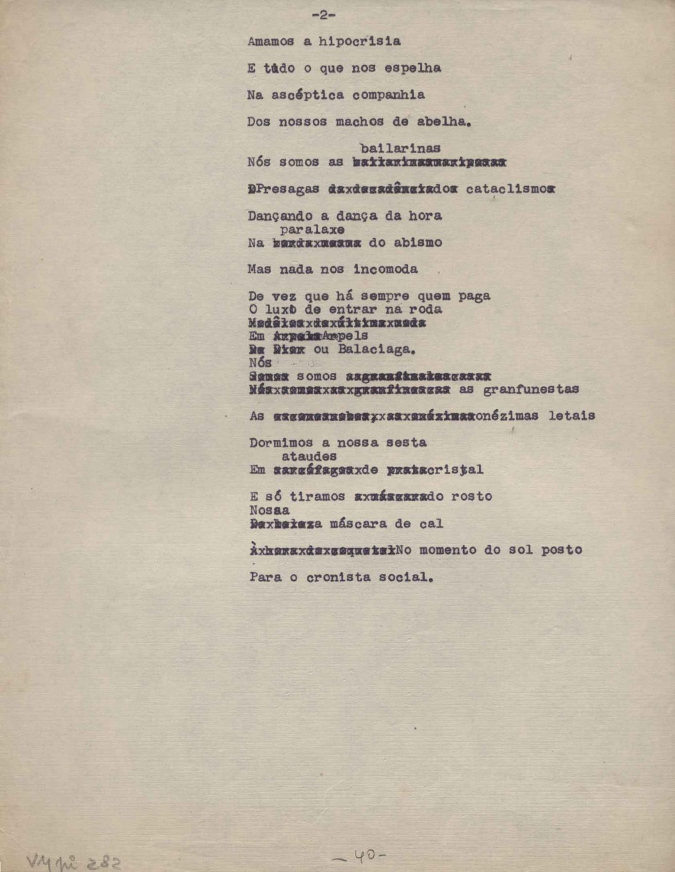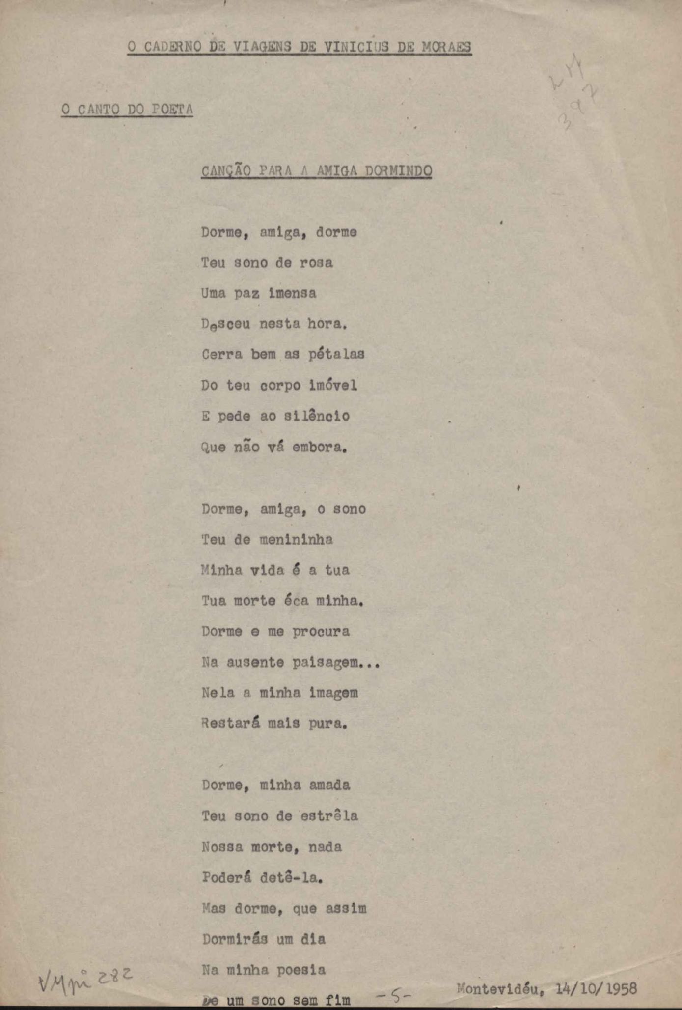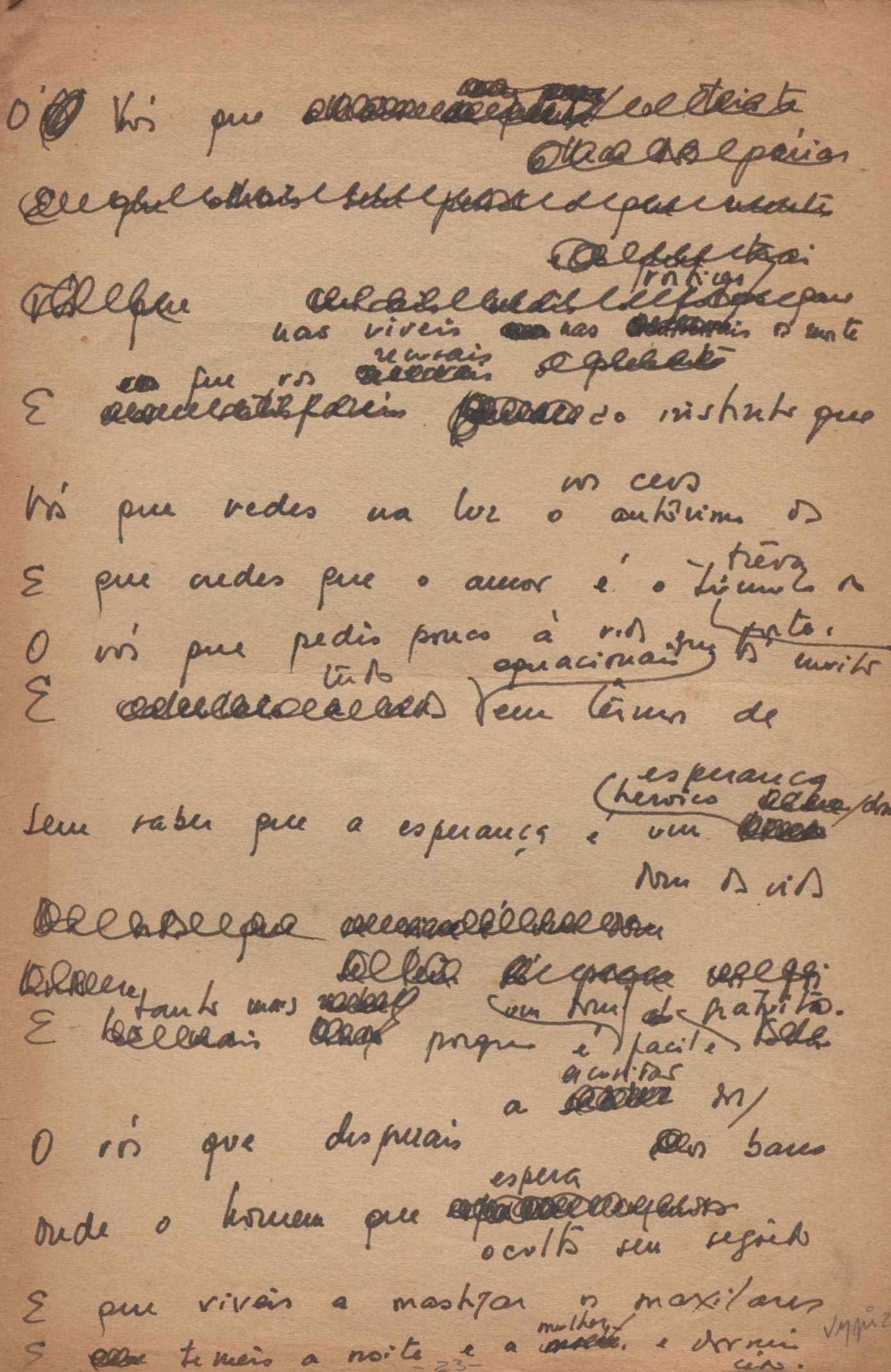 Prova tipográfica da [primeira edição?]. Prosa (1). Anexo: 1. Prova tipográfica incompleta; 2. Outras versões manuscritas e datilografadas, com emendas de: "O amor dos homens", "Antiode à tristeza", "Um beijo", "Blues para Emmett Louis Till", "Canção para a amiga dormindo", "Carta aos puros", "Carta do ausente", "... Deinde Philosophari [publ. "O mosquito"], "Dialética", "Dois poeminhas com Sputnik", "Duas canções de silêncio", "Of gold and God [publ. "Of God and gold"], "Look here, mr. Buster..." [publ. "Olhe aqui, mr. Buster..."], "O mais-que-perfeito", "O Margarida's", "As mulheres ocas", "Namorados no mirante", "Natal", "O ônibus Greyhound atravessa o Novo México", "Para viver um grande amor", "Pedro, meu filho", "Poema para Gilberto Amado", "O poeta aprendiz", "O poeta e a rosa", "O poeta", "Quinta rima" [publ. "Lapa de Bandeira"], "Teu nome" e "A última viagem de Jayme Ovalle".