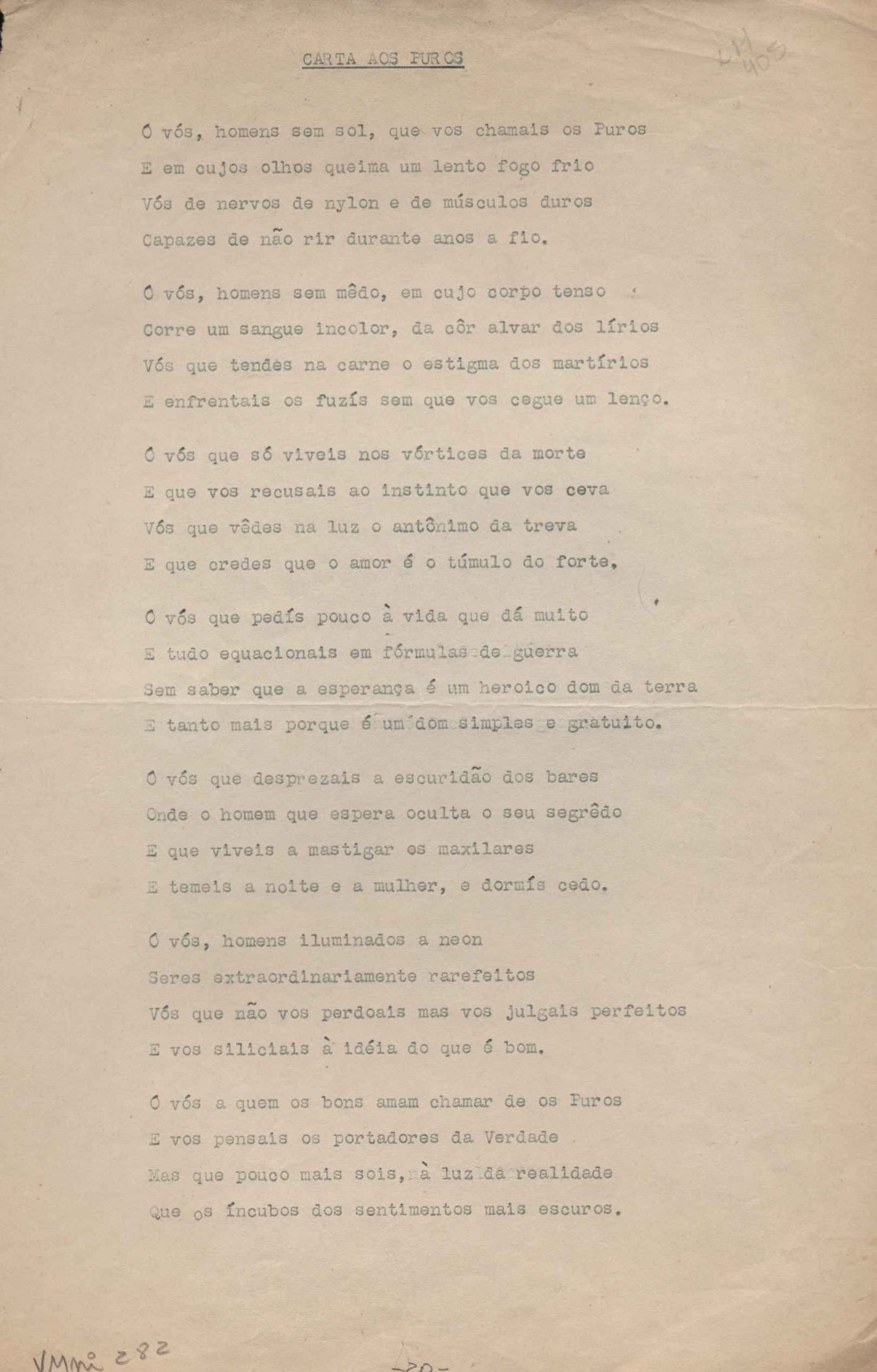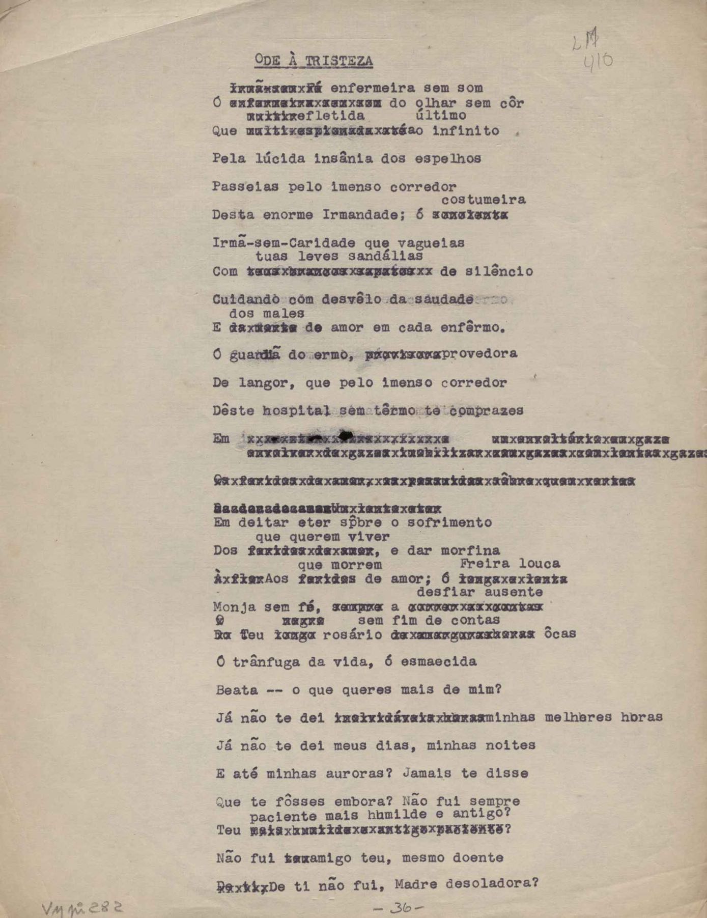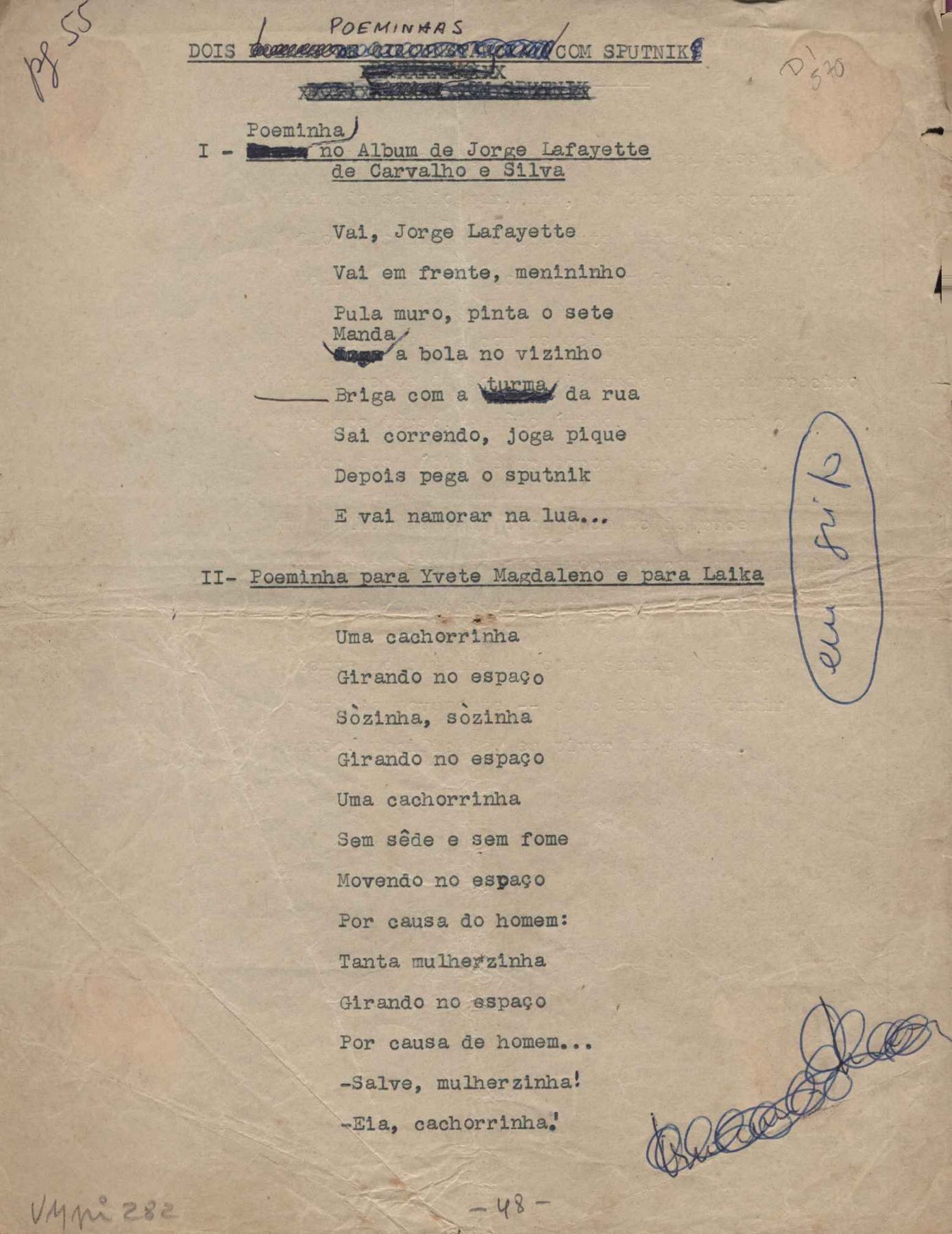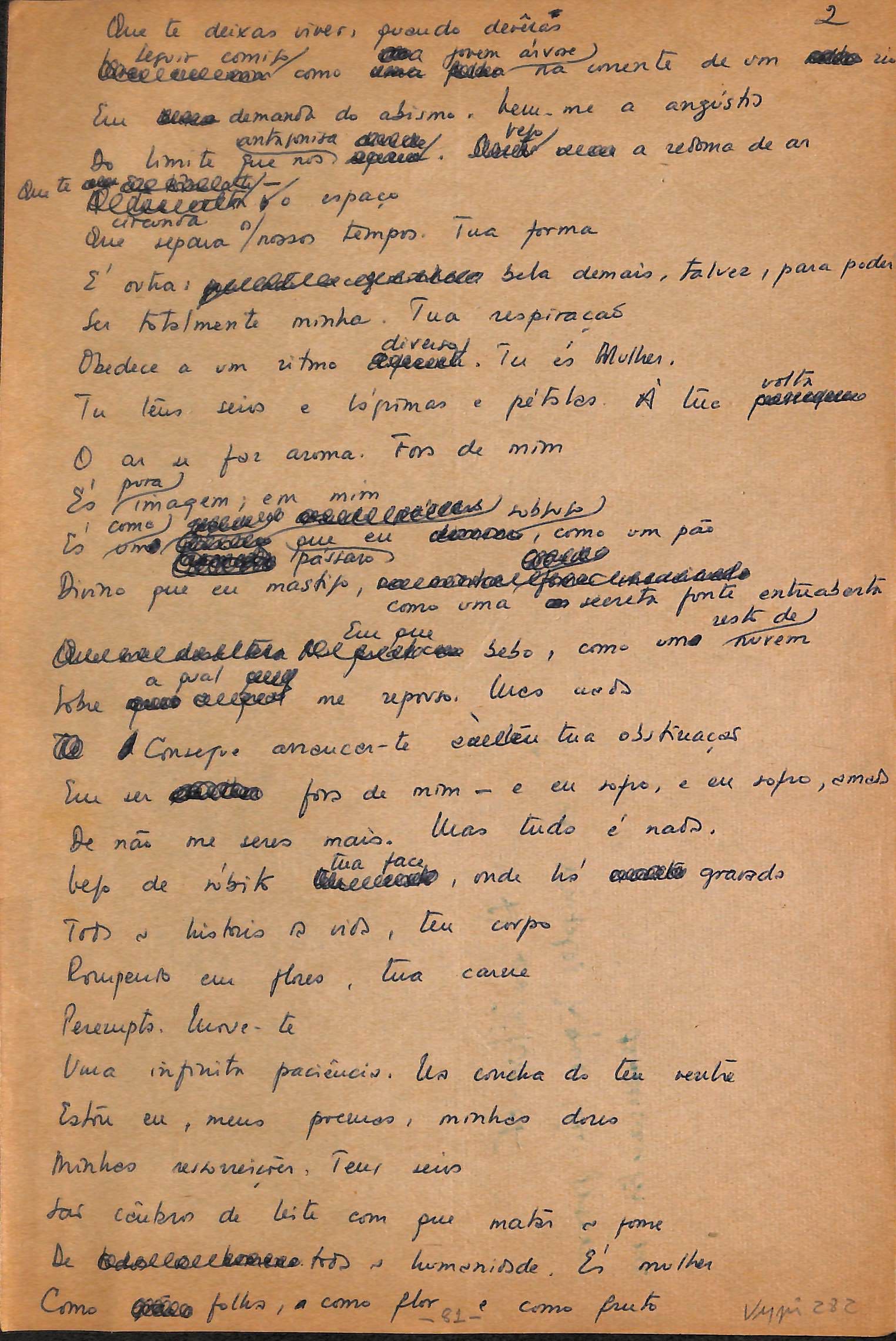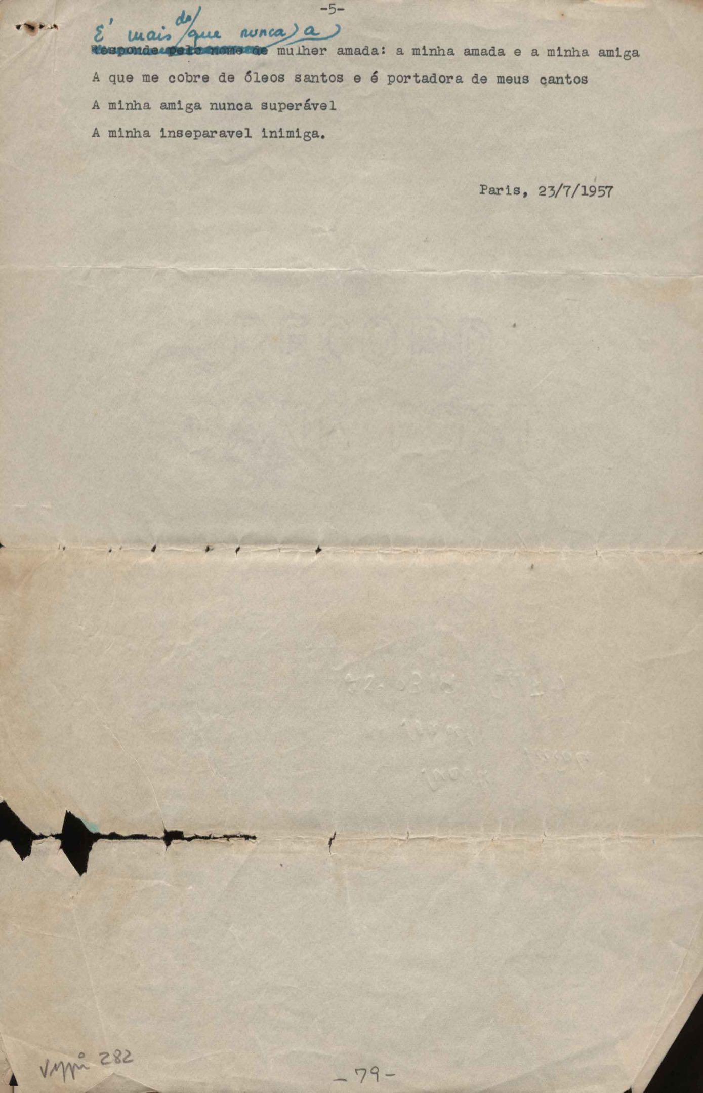 Prova tipográfica da [primeira edição?]. Prosa (1). Anexo: 1. Prova tipográfica incompleta; 2. Outras versões manuscritas e datilografadas, com emendas de: "O amor dos homens", "Antiode à tristeza", "Um beijo", "Blues para Emmett Louis Till", "Canção para a amiga dormindo", "Carta aos puros", "Carta do ausente", "... Deinde Philosophari [publ. "O mosquito"], "Dialética", "Dois poeminhas com Sputnik", "Duas canções de silêncio", "Of gold and God [publ. "Of God and gold"], "Look here, mr. Buster..." [publ. "Olhe aqui, mr. Buster..."], "O mais-que-perfeito", "O Margarida's", "As mulheres ocas", "Namorados no mirante", "Natal", "O ônibus Greyhound atravessa o Novo México", "Para viver um grande amor", "Pedro, meu filho", "Poema para Gilberto Amado", "O poeta aprendiz", "O poeta e a rosa", "O poeta", "Quinta rima" [publ. "Lapa de Bandeira"], "Teu nome" e "A última viagem de Jayme Ovalle".
