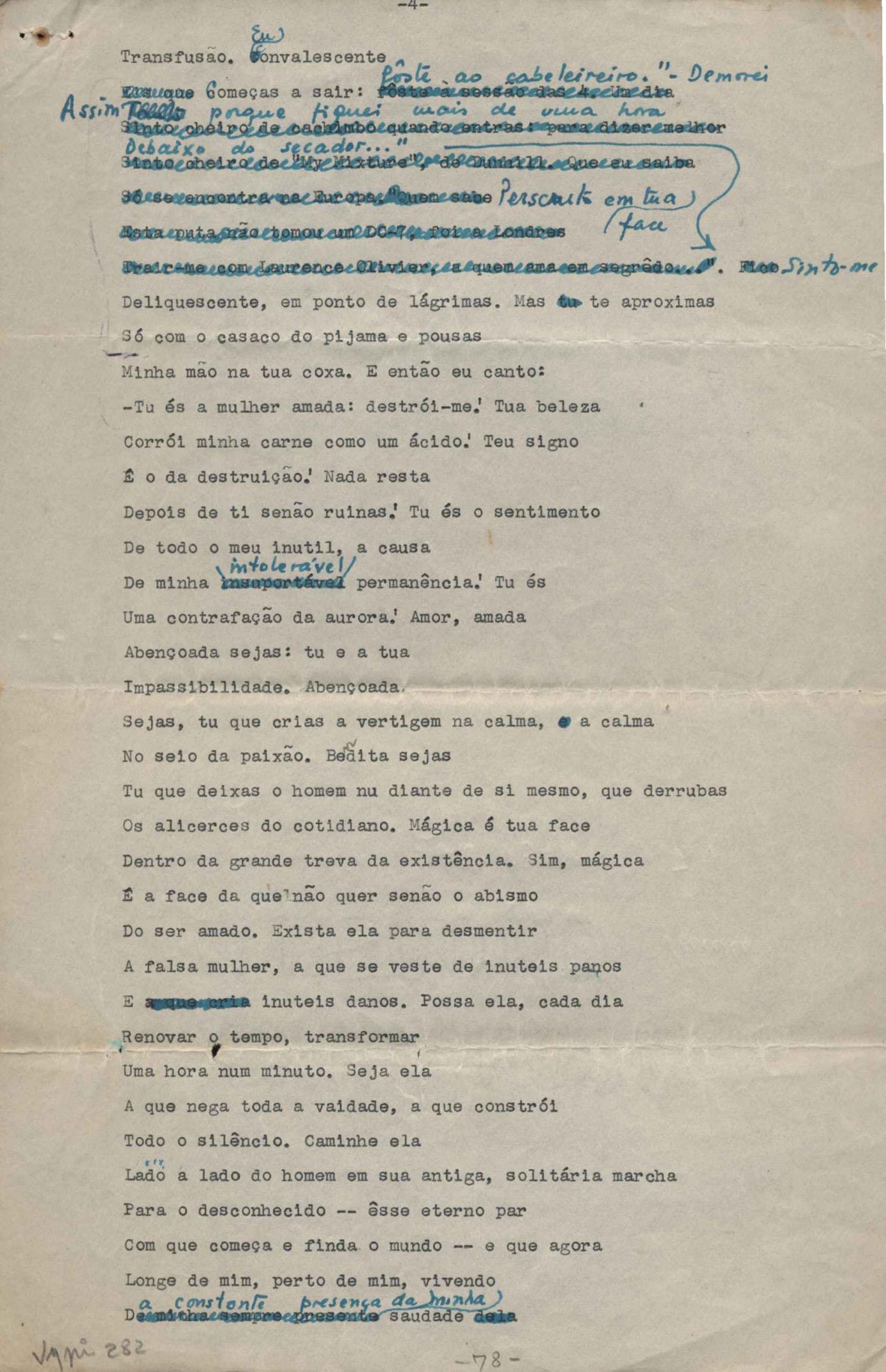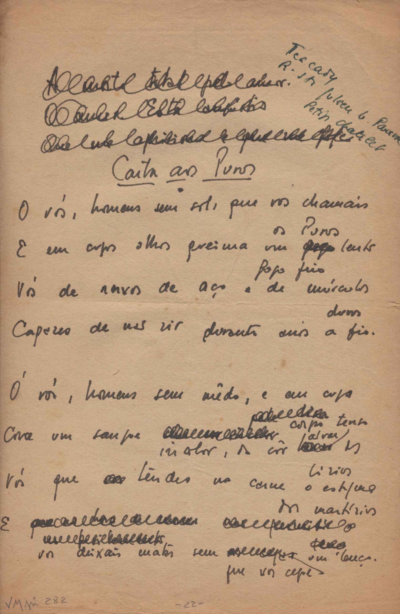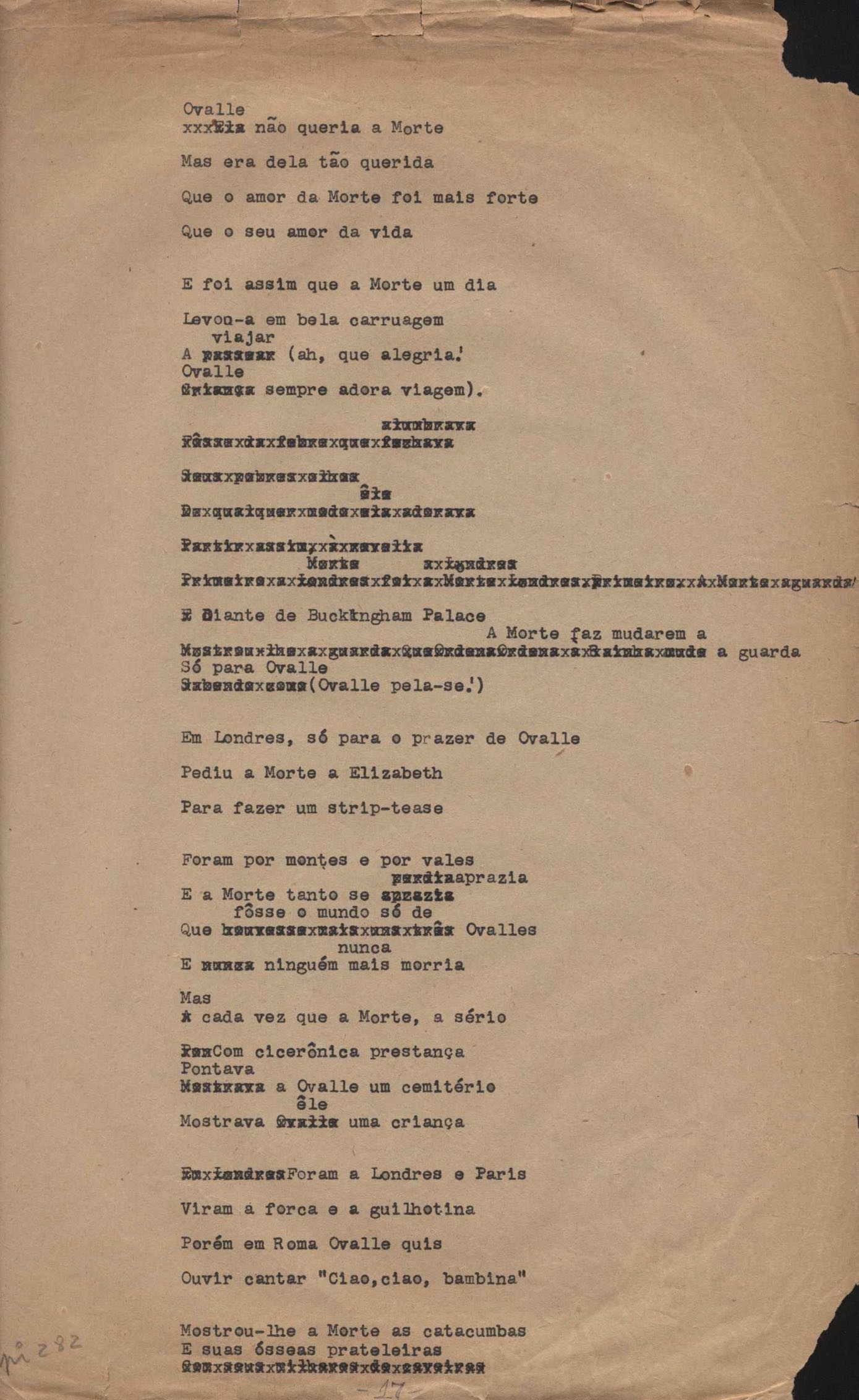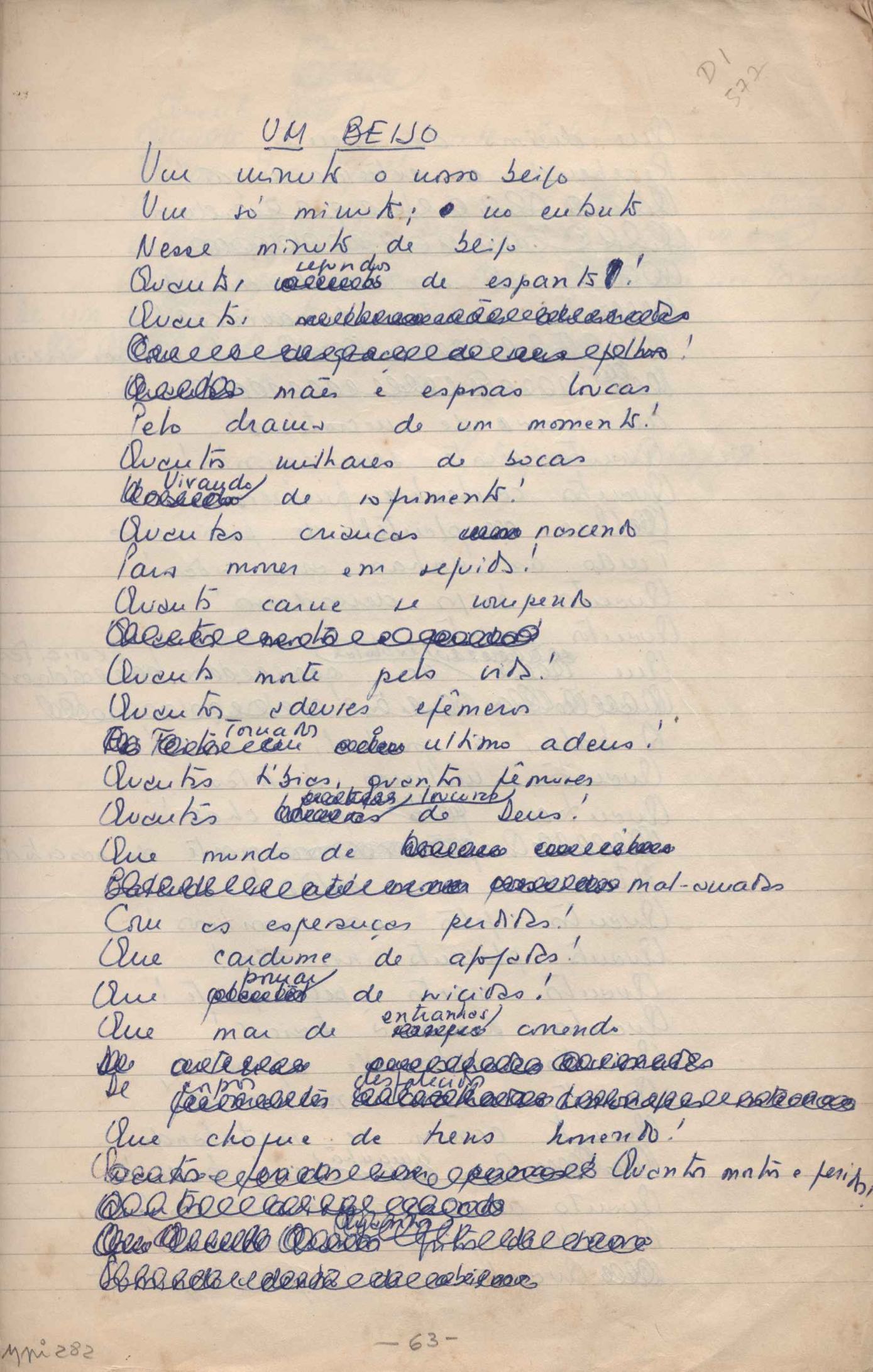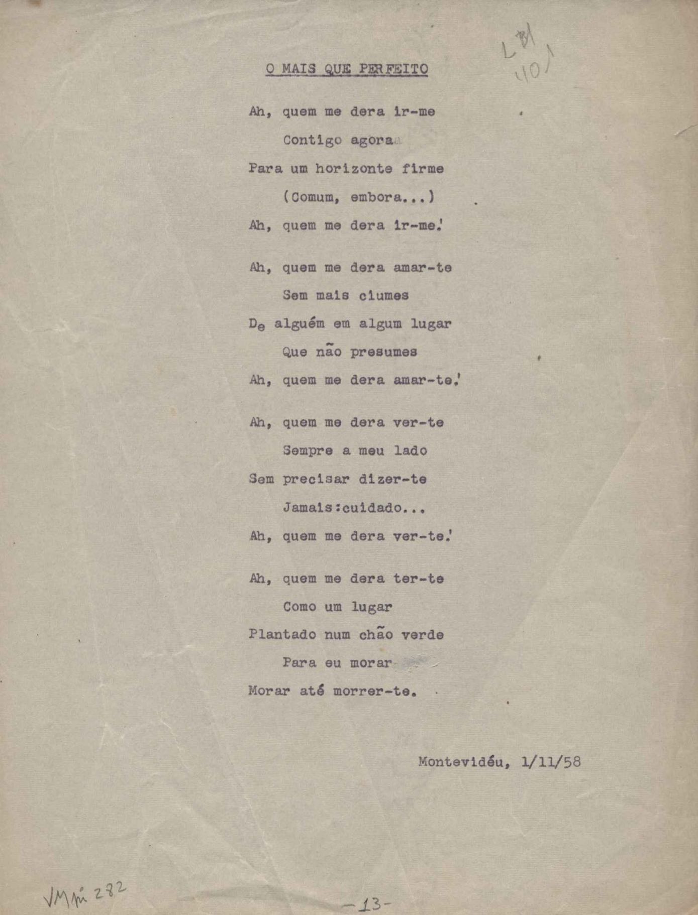 Prova tipográfica da [primeira edição?]. Prosa (1). Anexo: 1. Prova tipográfica incompleta; 2. Outras versões manuscritas e datilografadas, com emendas de: "O amor dos homens", "Antiode à tristeza", "Um beijo", "Blues para Emmett Louis Till", "Canção para a amiga dormindo", "Carta aos puros", "Carta do ausente", "... Deinde Philosophari [publ. "O mosquito"], "Dialética", "Dois poeminhas com Sputnik", "Duas canções de silêncio", "Of gold and God [publ. "Of God and gold"], "Look here, mr. Buster..." [publ. "Olhe aqui, mr. Buster..."], "O mais-que-perfeito", "O Margarida's", "As mulheres ocas", "Namorados no mirante", "Natal", "O ônibus Greyhound atravessa o Novo México", "Para viver um grande amor", "Pedro, meu filho", "Poema para Gilberto Amado", "O poeta aprendiz", "O poeta e a rosa", "O poeta", "Quinta rima" [publ. "Lapa de Bandeira"], "Teu nome" e "A última viagem de Jayme Ovalle".