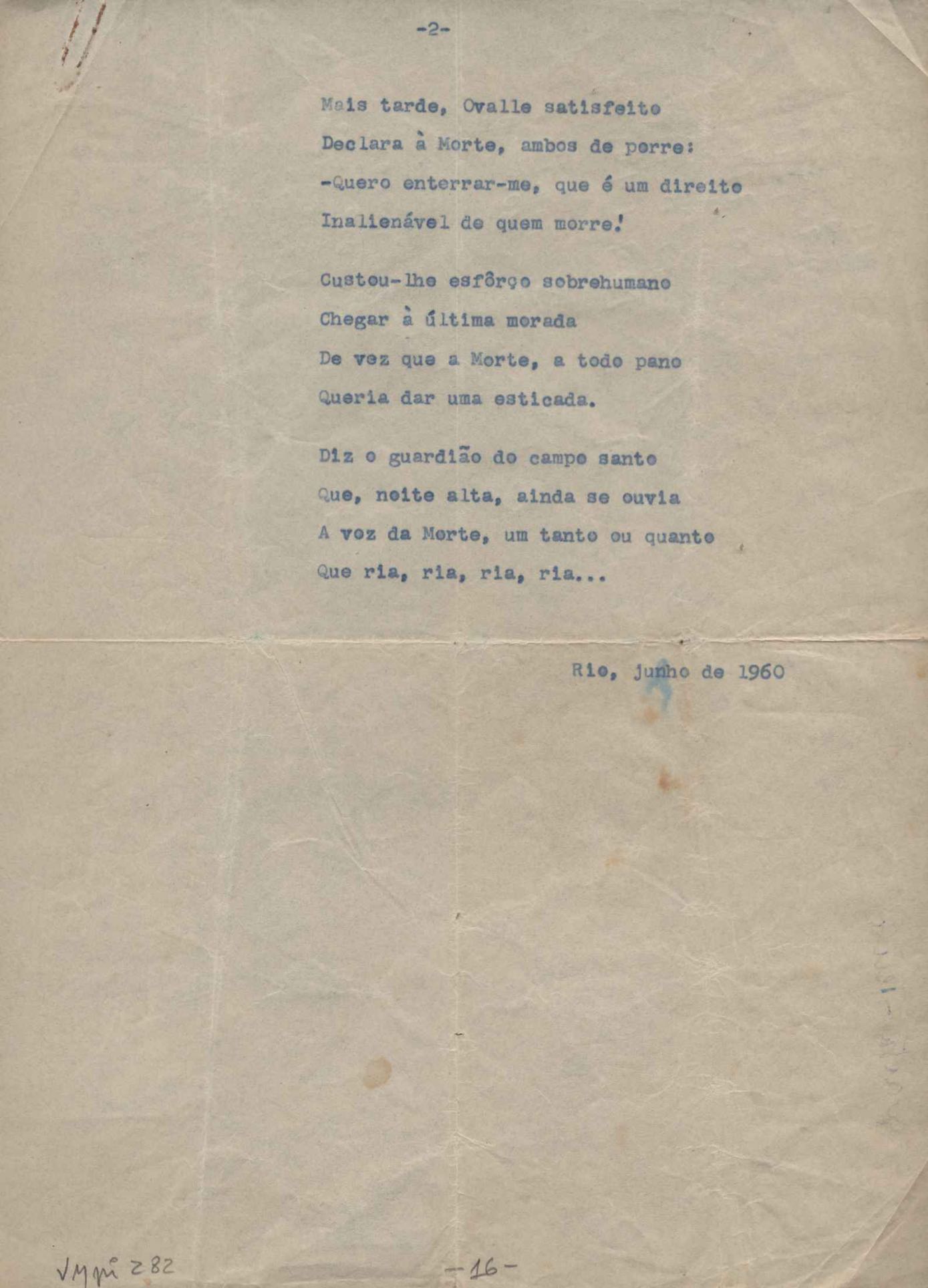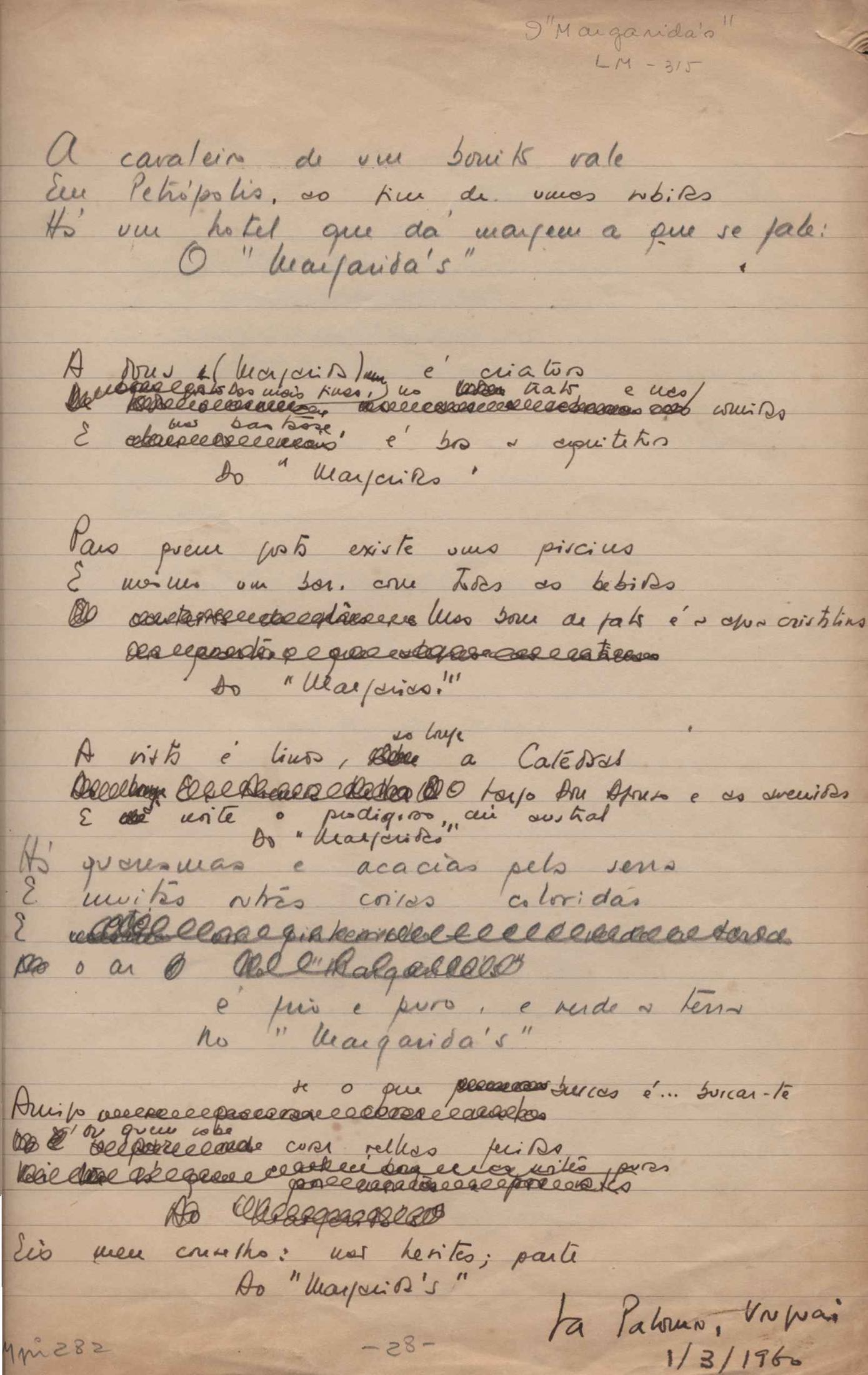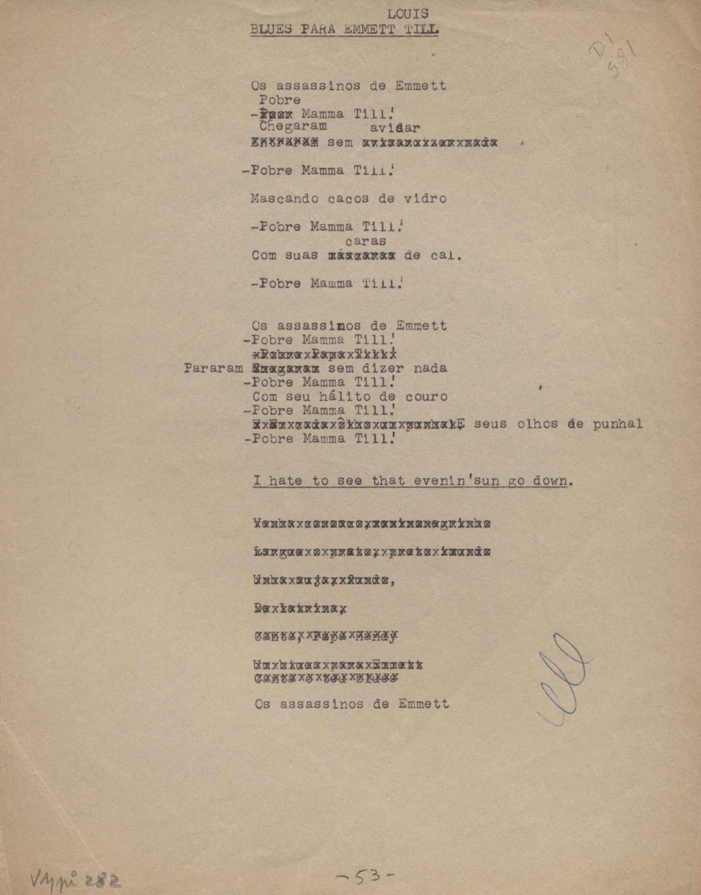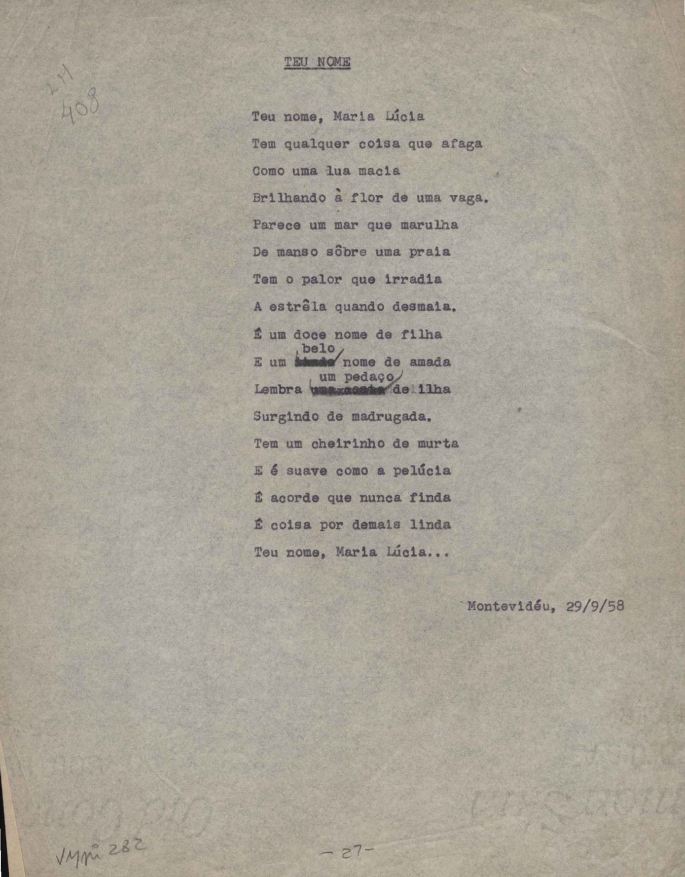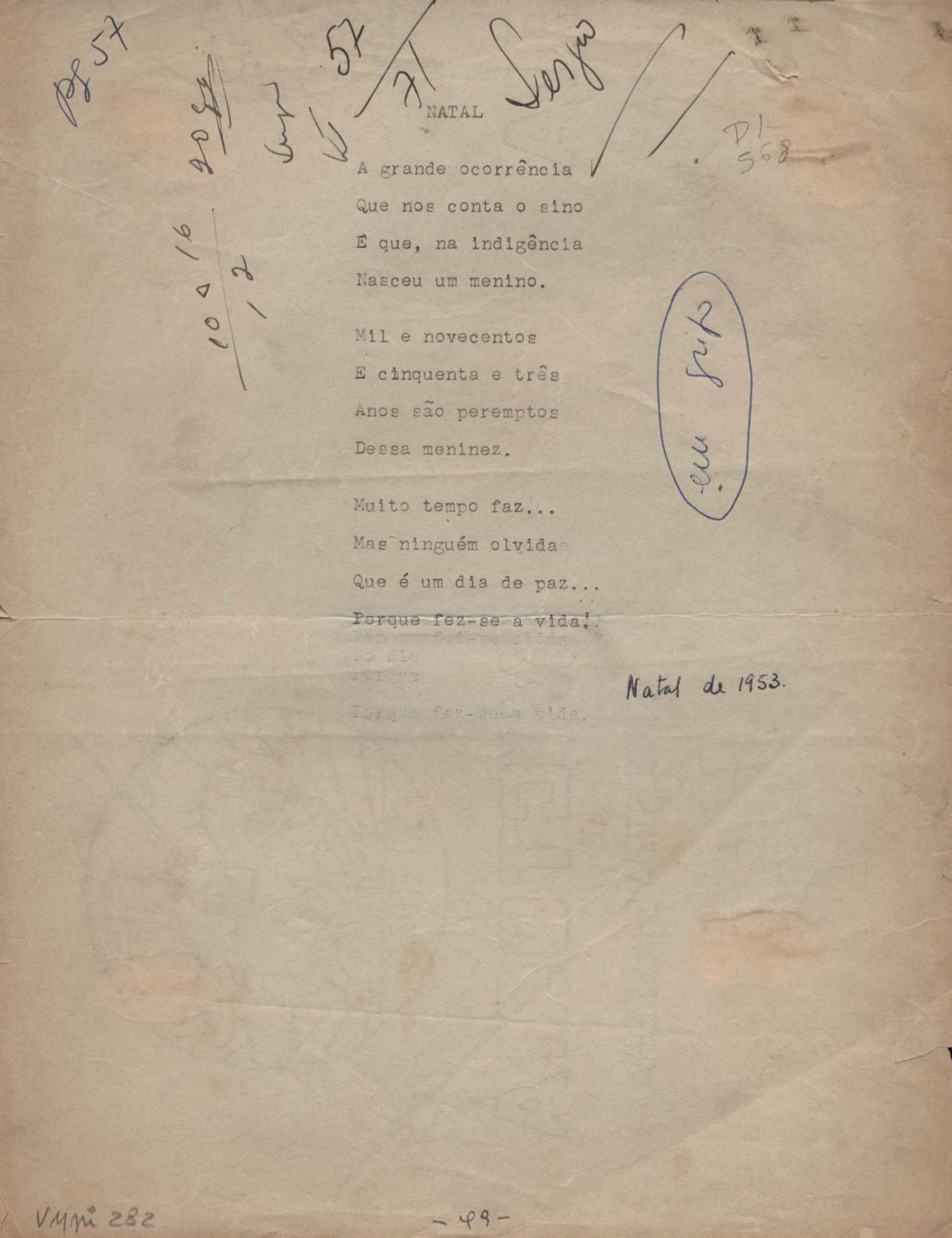 Prova tipográfica da [primeira edição?]. Prosa (1). Anexo: 1. Prova tipográfica incompleta; 2. Outras versões manuscritas e datilografadas, com emendas de: "O amor dos homens", "Antiode à tristeza", "Um beijo", "Blues para Emmett Louis Till", "Canção para a amiga dormindo", "Carta aos puros", "Carta do ausente", "... Deinde Philosophari [publ. "O mosquito"], "Dialética", "Dois poeminhas com Sputnik", "Duas canções de silêncio", "Of gold and God [publ. "Of God and gold"], "Look here, mr. Buster..." [publ. "Olhe aqui, mr. Buster..."], "O mais-que-perfeito", "O Margarida's", "As mulheres ocas", "Namorados no mirante", "Natal", "O ônibus Greyhound atravessa o Novo México", "Para viver um grande amor", "Pedro, meu filho", "Poema para Gilberto Amado", "O poeta aprendiz", "O poeta e a rosa", "O poeta", "Quinta rima" [publ. "Lapa de Bandeira"], "Teu nome" e "A última viagem de Jayme Ovalle".