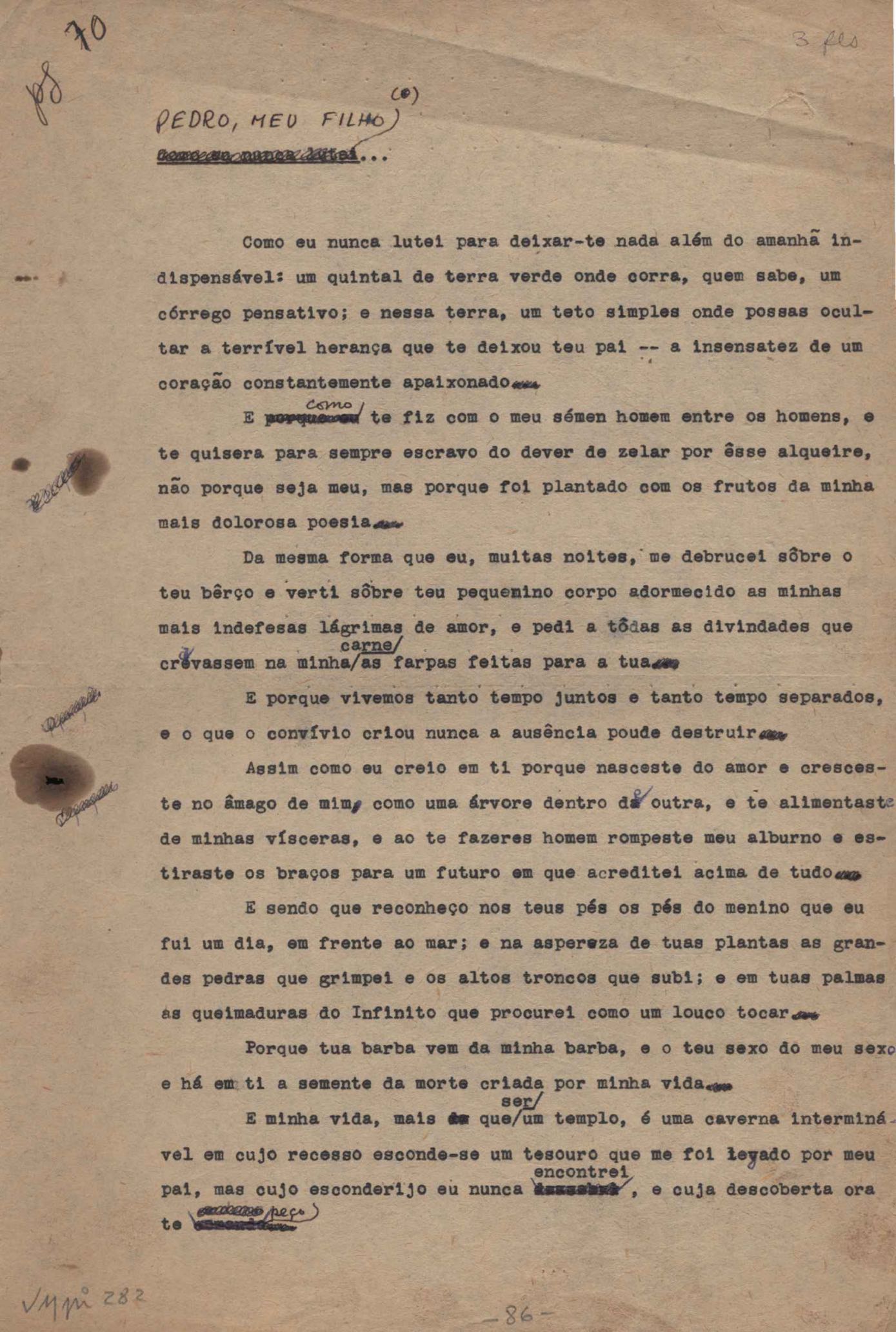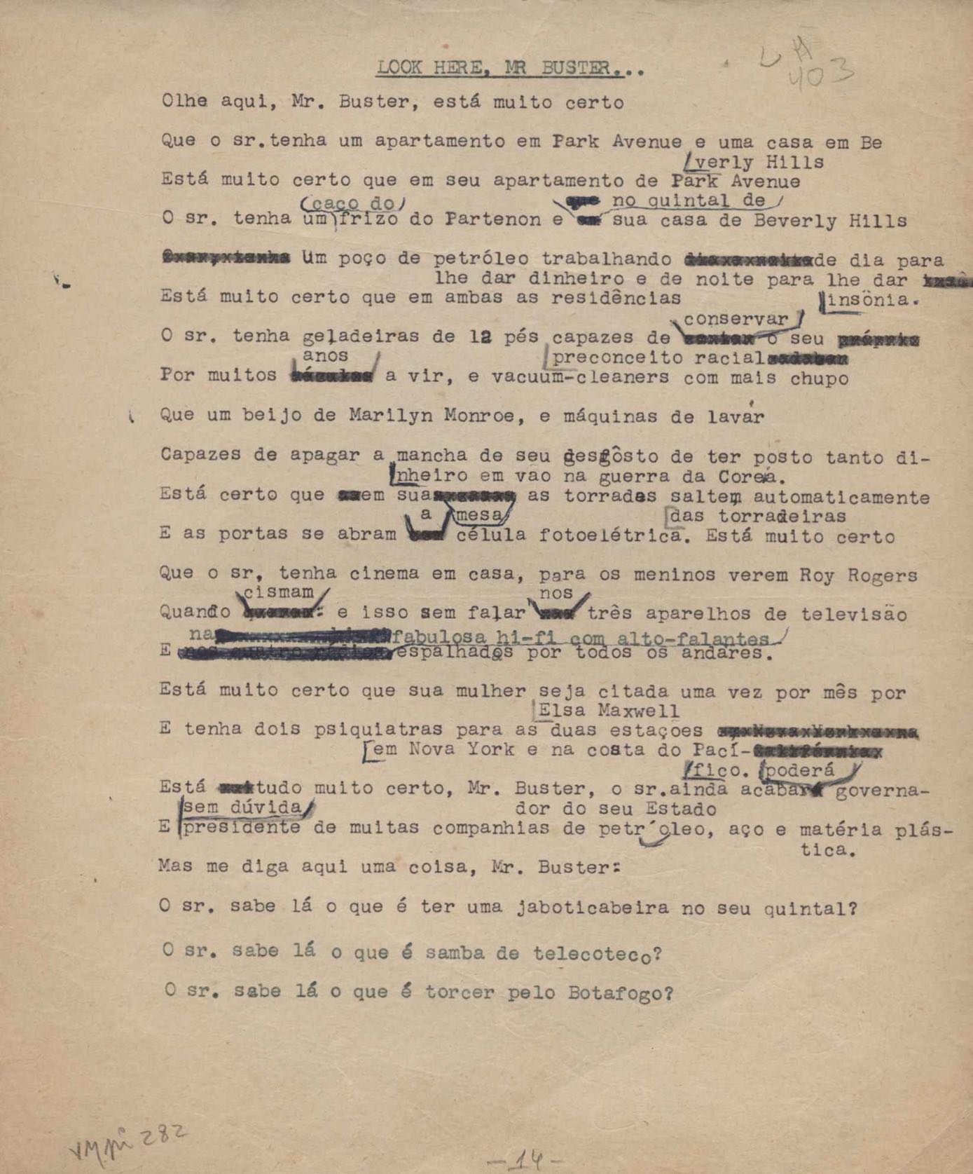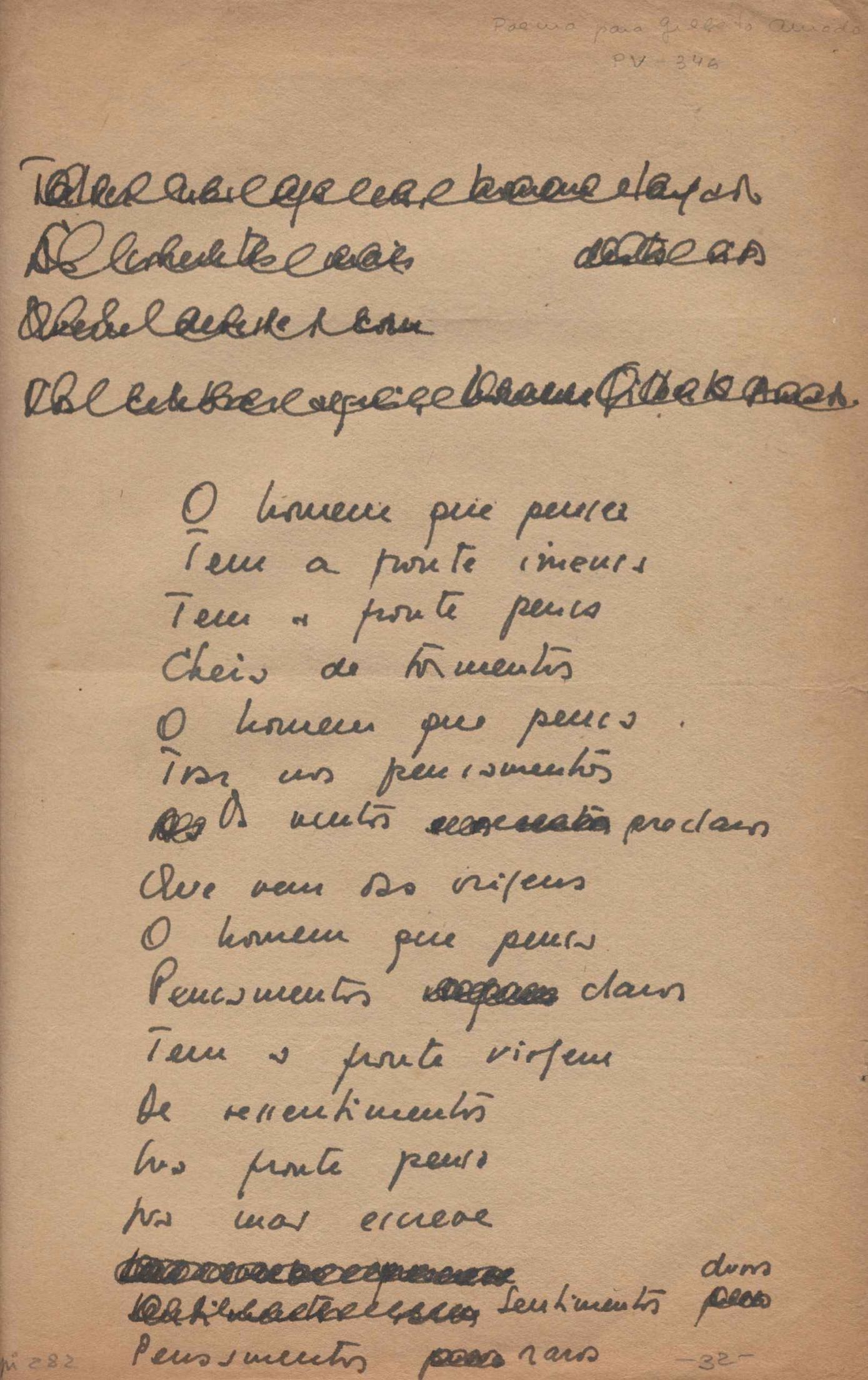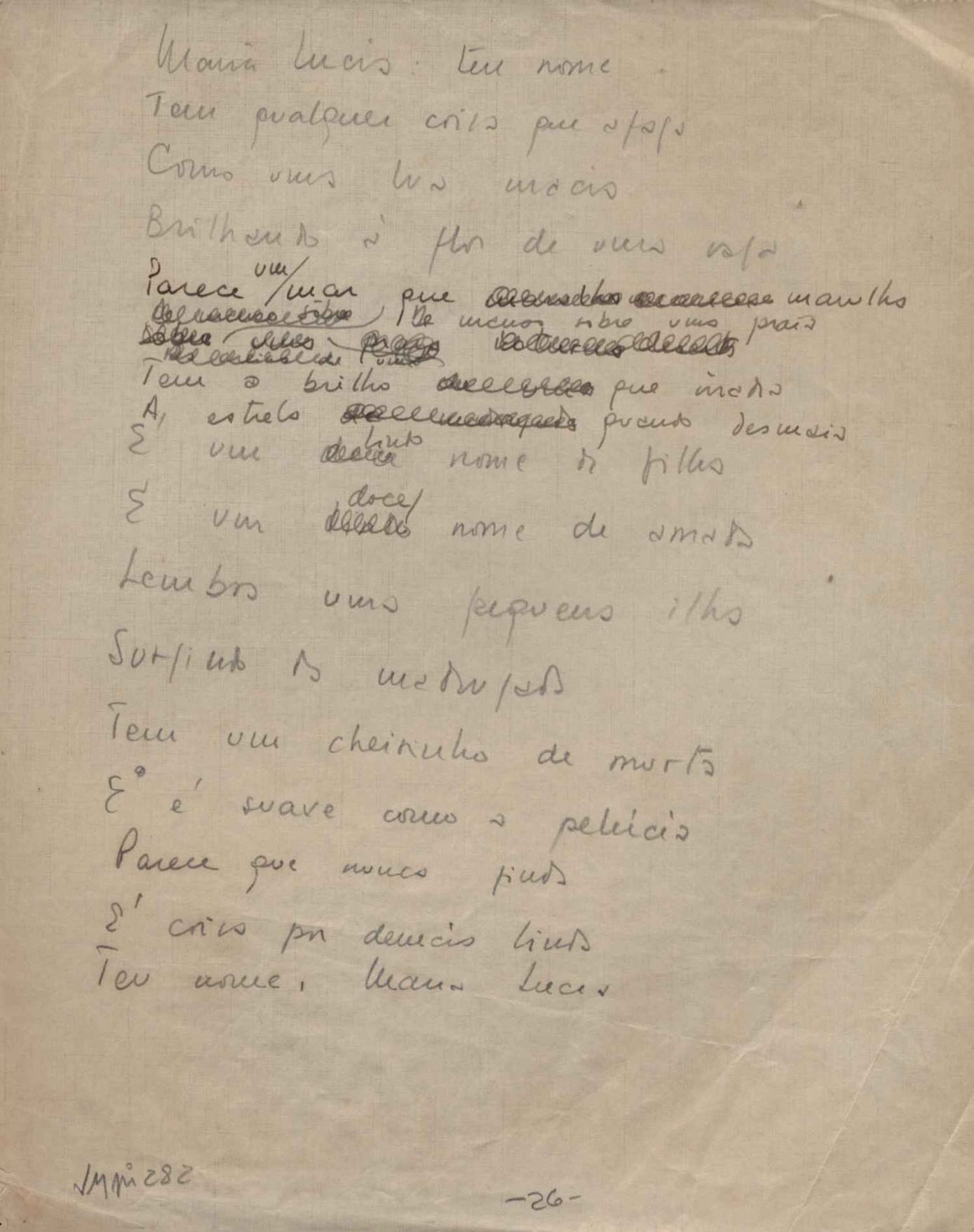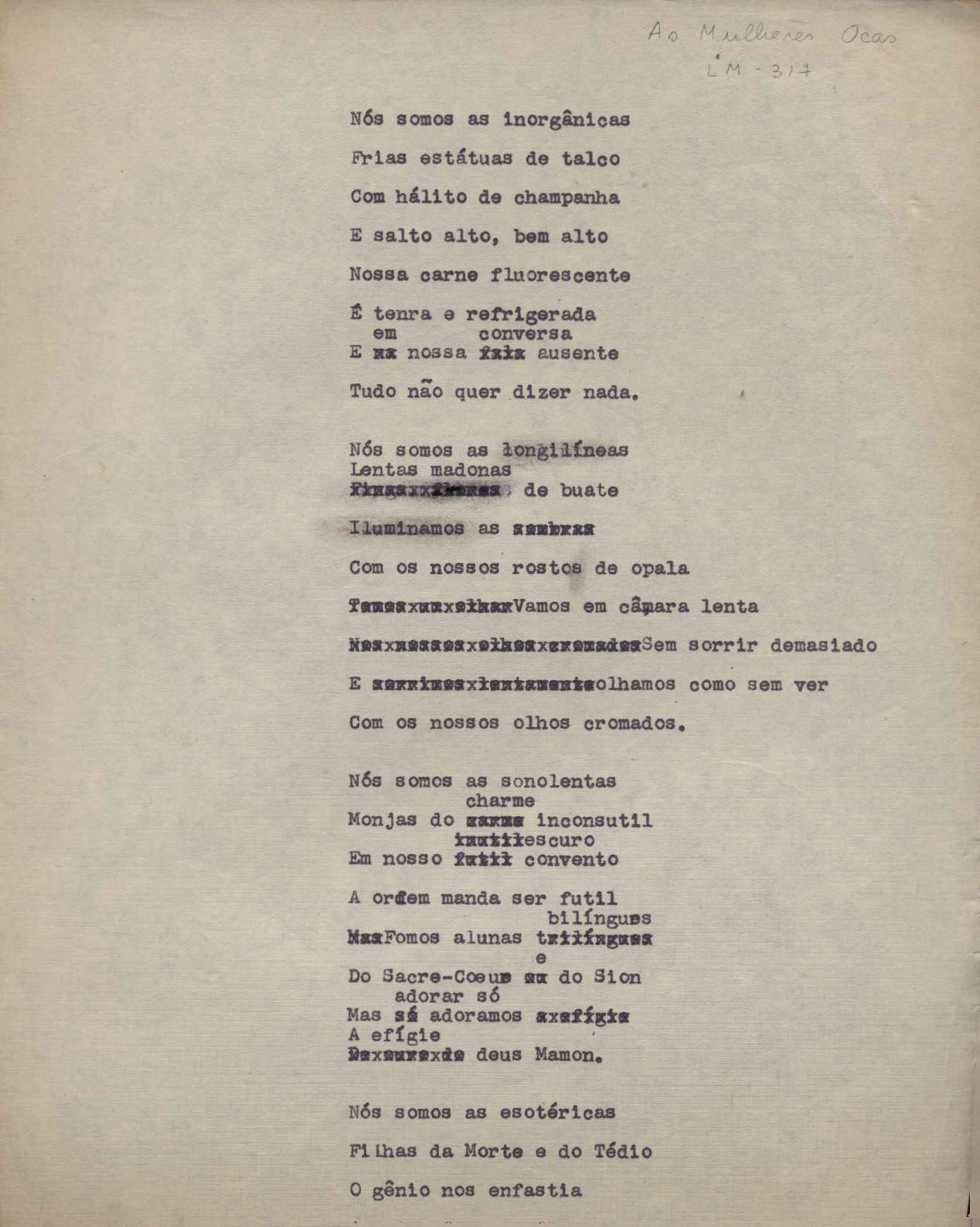 Prova tipográfica da [primeira edição?]. Prosa (1). Anexo: 1. Prova tipográfica incompleta; 2. Outras versões manuscritas e datilografadas, com emendas de: "O amor dos homens", "Antiode à tristeza", "Um beijo", "Blues para Emmett Louis Till", "Canção para a amiga dormindo", "Carta aos puros", "Carta do ausente", "... Deinde Philosophari [publ. "O mosquito"], "Dialética", "Dois poeminhas com Sputnik", "Duas canções de silêncio", "Of gold and God [publ. "Of God and gold"], "Look here, mr. Buster..." [publ. "Olhe aqui, mr. Buster..."], "O mais-que-perfeito", "O Margarida's", "As mulheres ocas", "Namorados no mirante", "Natal", "O ônibus Greyhound atravessa o Novo México", "Para viver um grande amor", "Pedro, meu filho", "Poema para Gilberto Amado", "O poeta aprendiz", "O poeta e a rosa", "O poeta", "Quinta rima" [publ. "Lapa de Bandeira"], "Teu nome" e "A última viagem de Jayme Ovalle".