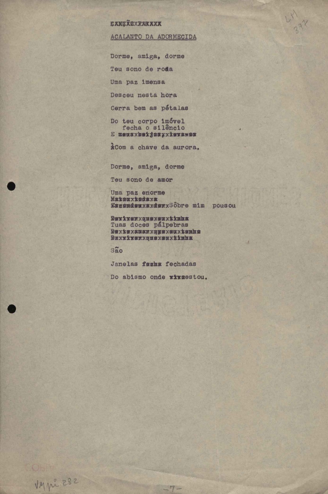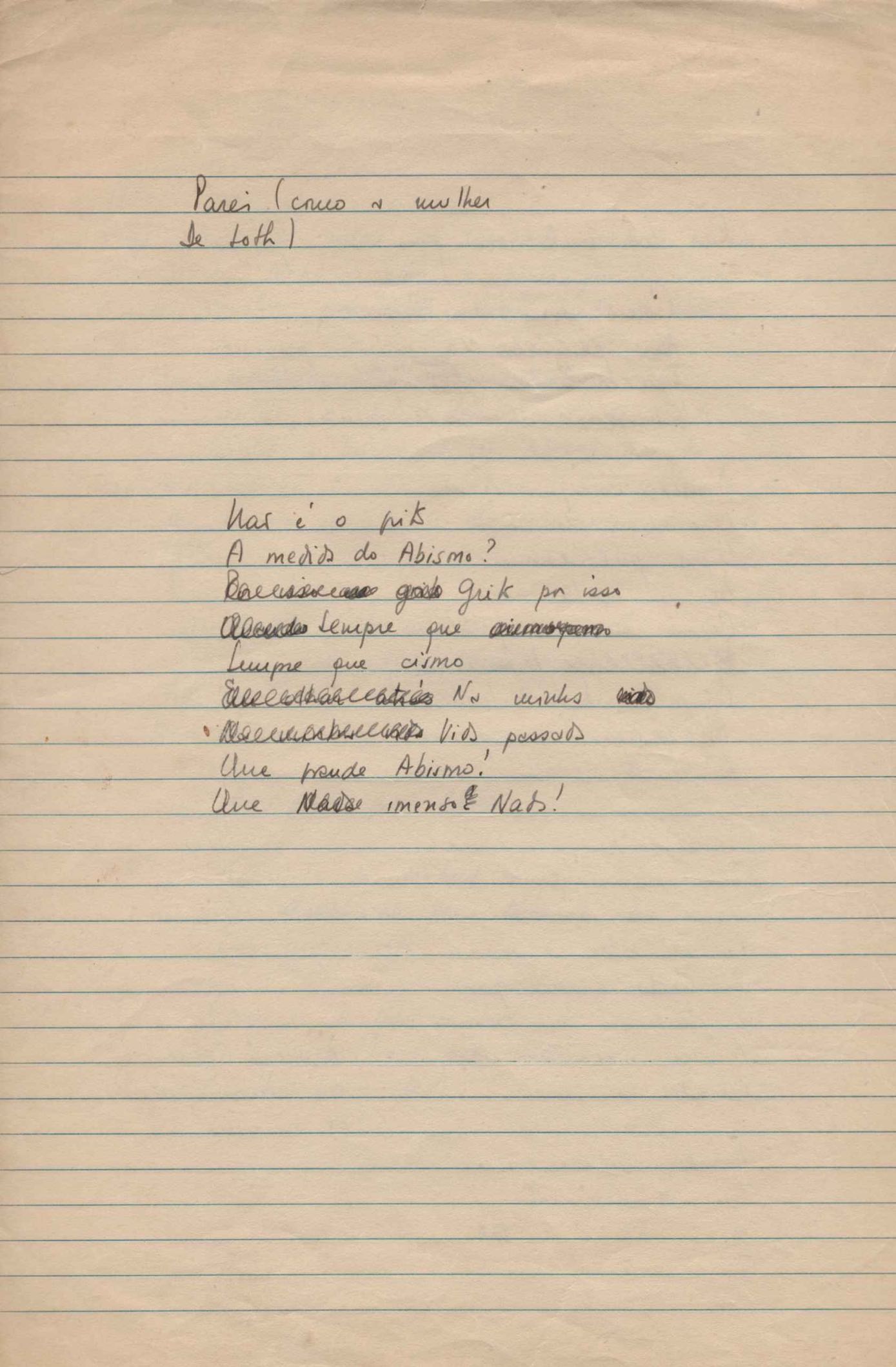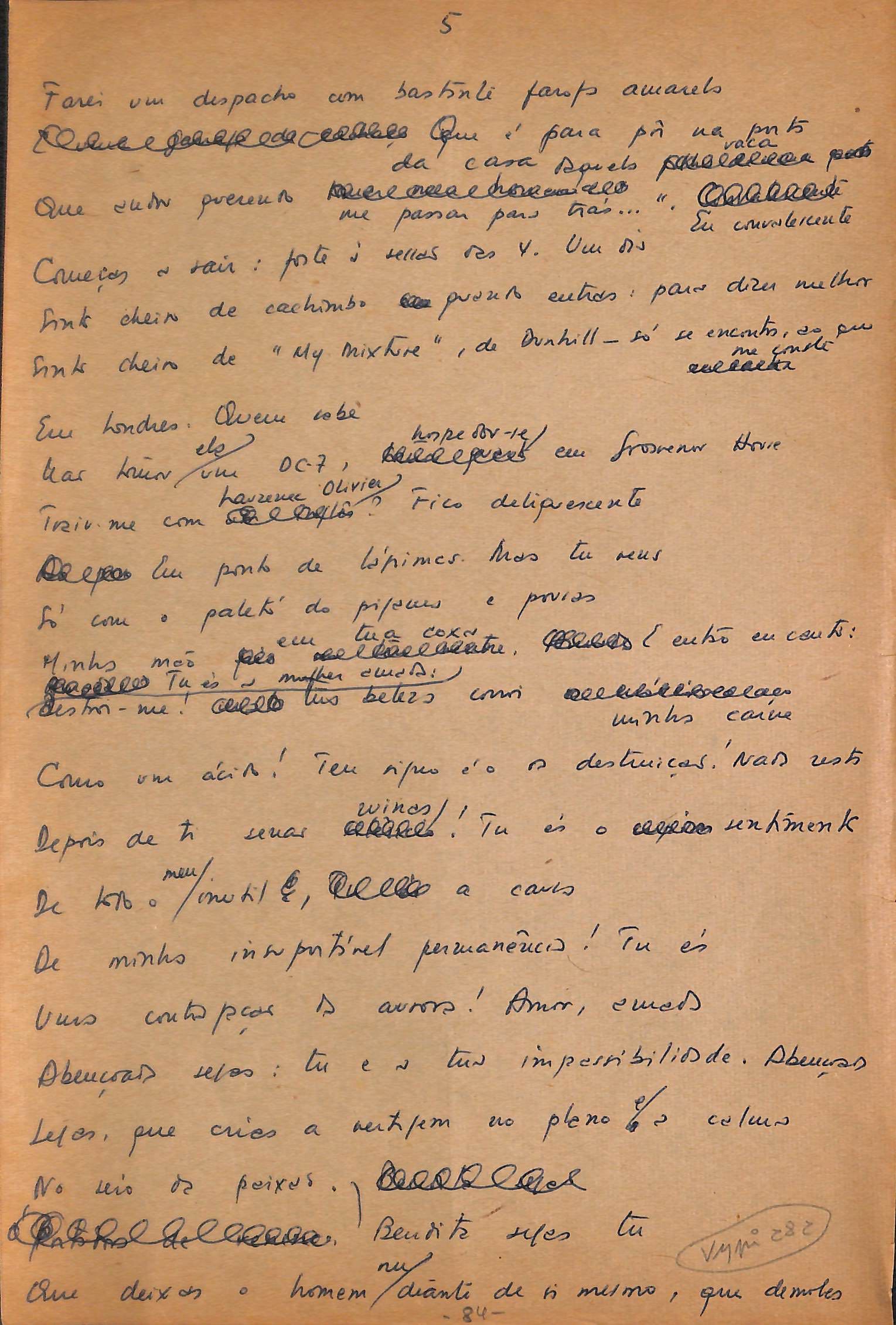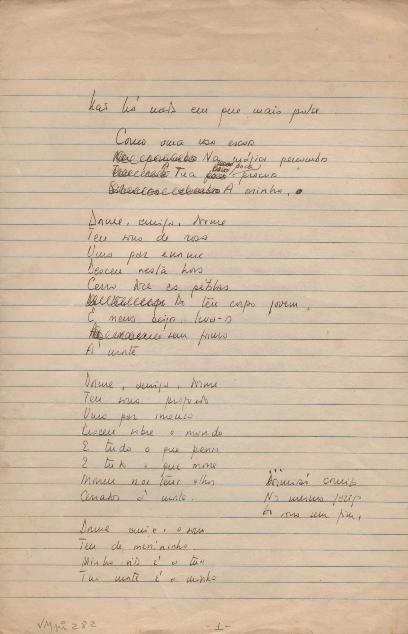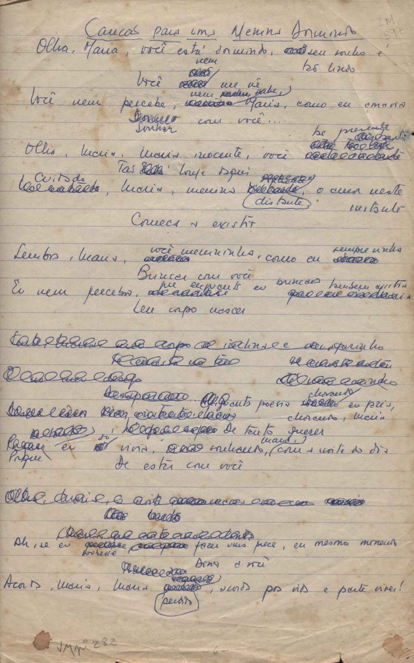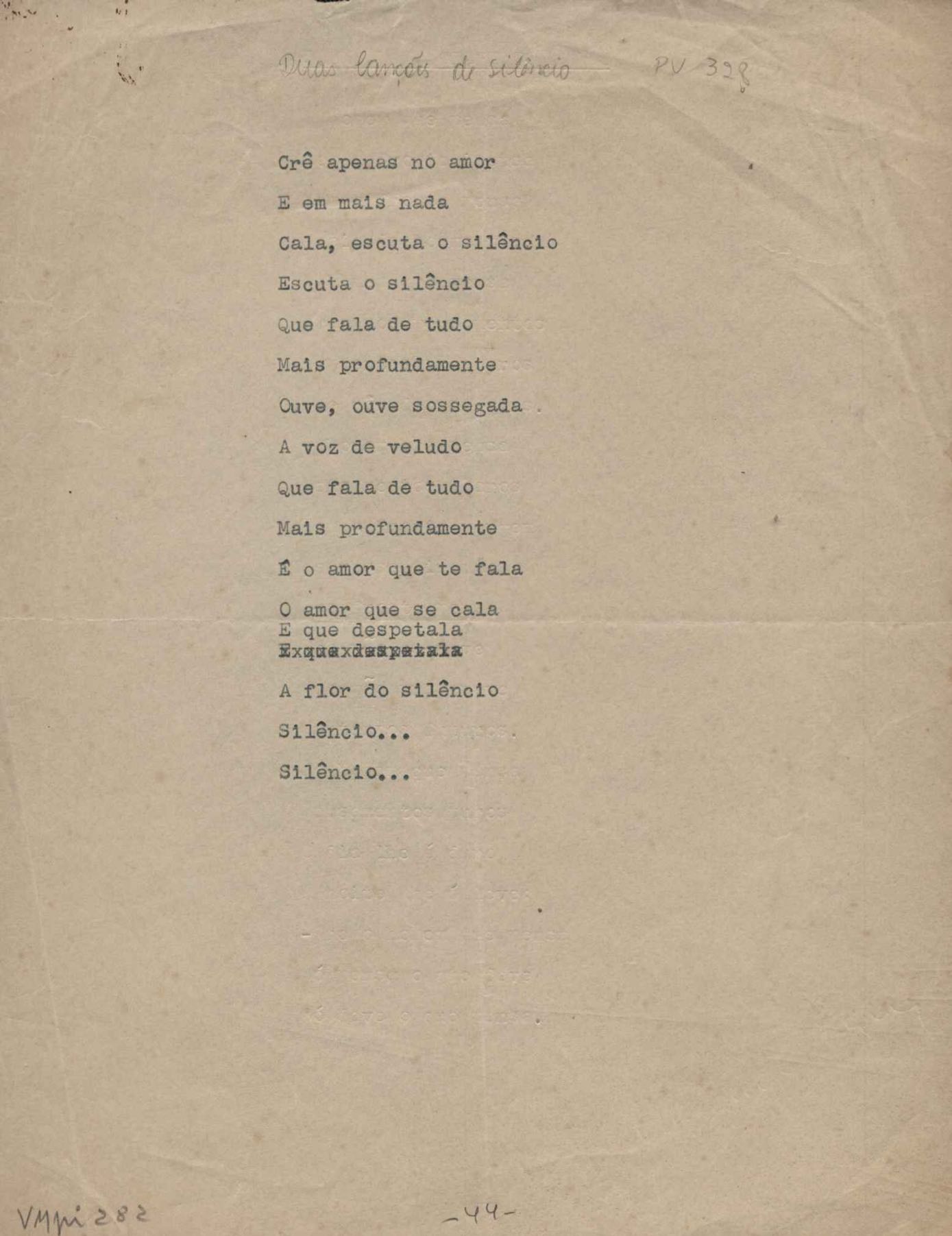 Prova tipográfica da [primeira edição?]. Prosa (1). Anexo: 1. Prova tipográfica incompleta; 2. Outras versões manuscritas e datilografadas, com emendas de: "O amor dos homens", "Antiode à tristeza", "Um beijo", "Blues para Emmett Louis Till", "Canção para a amiga dormindo", "Carta aos puros", "Carta do ausente", "... Deinde Philosophari [publ. "O mosquito"], "Dialética", "Dois poeminhas com Sputnik", "Duas canções de silêncio", "Of gold and God [publ. "Of God and gold"], "Look here, mr. Buster..." [publ. "Olhe aqui, mr. Buster..."], "O mais-que-perfeito", "O Margarida's", "As mulheres ocas", "Namorados no mirante", "Natal", "O ônibus Greyhound atravessa o Novo México", "Para viver um grande amor", "Pedro, meu filho", "Poema para Gilberto Amado", "O poeta aprendiz", "O poeta e a rosa", "O poeta", "Quinta rima" [publ. "Lapa de Bandeira"], "Teu nome" e "A última viagem de Jayme Ovalle".