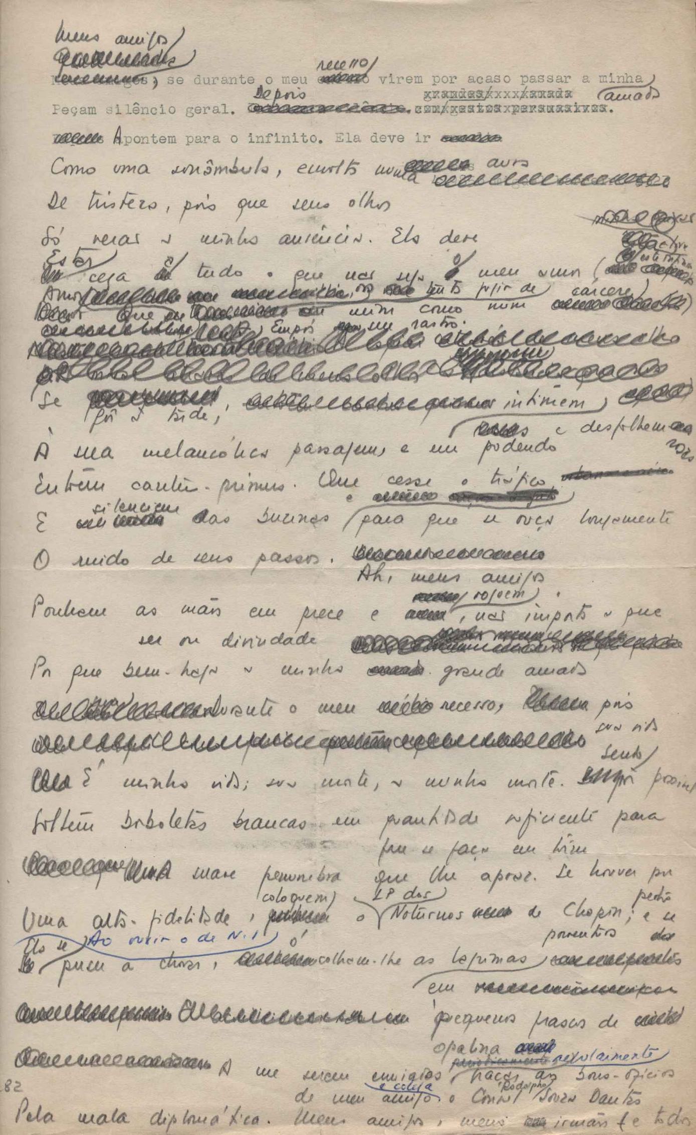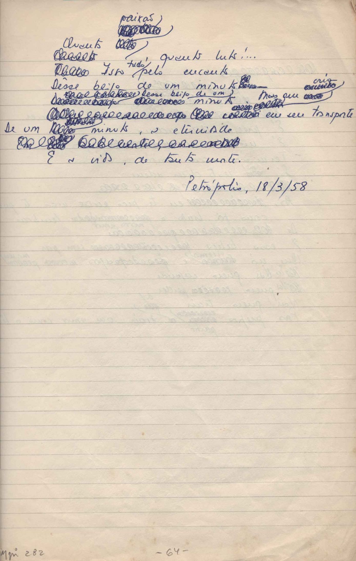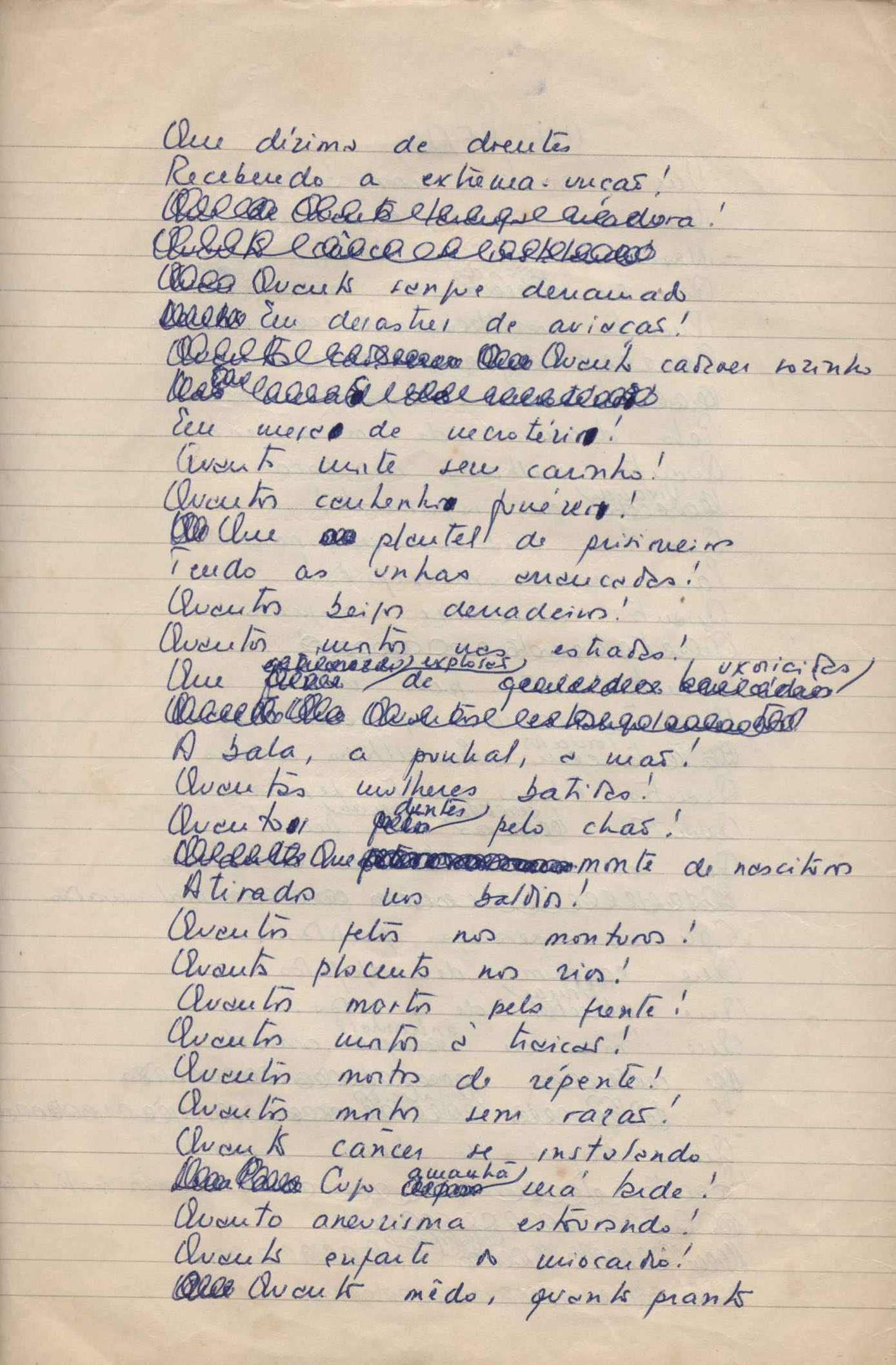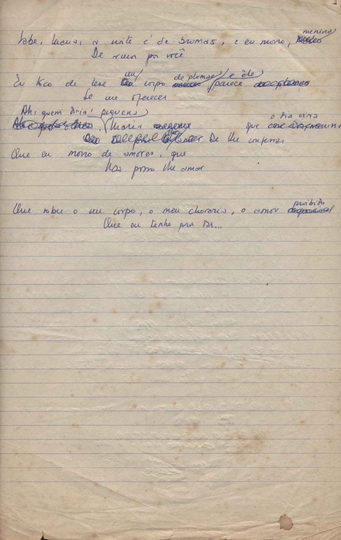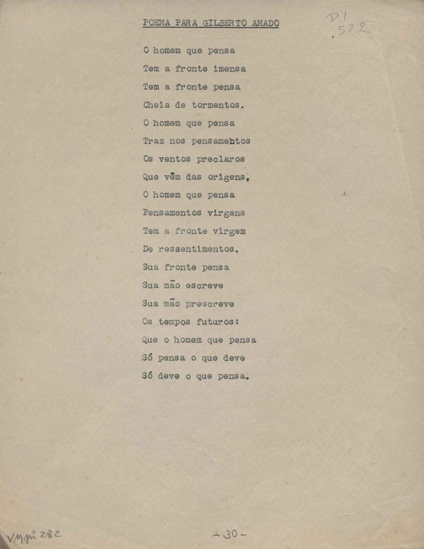 Prova tipográfica da [primeira edição?]. Prosa (1). Anexo: 1. Prova tipográfica incompleta; 2. Outras versões manuscritas e datilografadas, com emendas de: "O amor dos homens", "Antiode à tristeza", "Um beijo", "Blues para Emmett Louis Till", "Canção para a amiga dormindo", "Carta aos puros", "Carta do ausente", "... Deinde Philosophari [publ. "O mosquito"], "Dialética", "Dois poeminhas com Sputnik", "Duas canções de silêncio", "Of gold and God [publ. "Of God and gold"], "Look here, mr. Buster..." [publ. "Olhe aqui, mr. Buster..."], "O mais-que-perfeito", "O Margarida's", "As mulheres ocas", "Namorados no mirante", "Natal", "O ônibus Greyhound atravessa o Novo México", "Para viver um grande amor", "Pedro, meu filho", "Poema para Gilberto Amado", "O poeta aprendiz", "O poeta e a rosa", "O poeta", "Quinta rima" [publ. "Lapa de Bandeira"], "Teu nome" e "A última viagem de Jayme Ovalle".