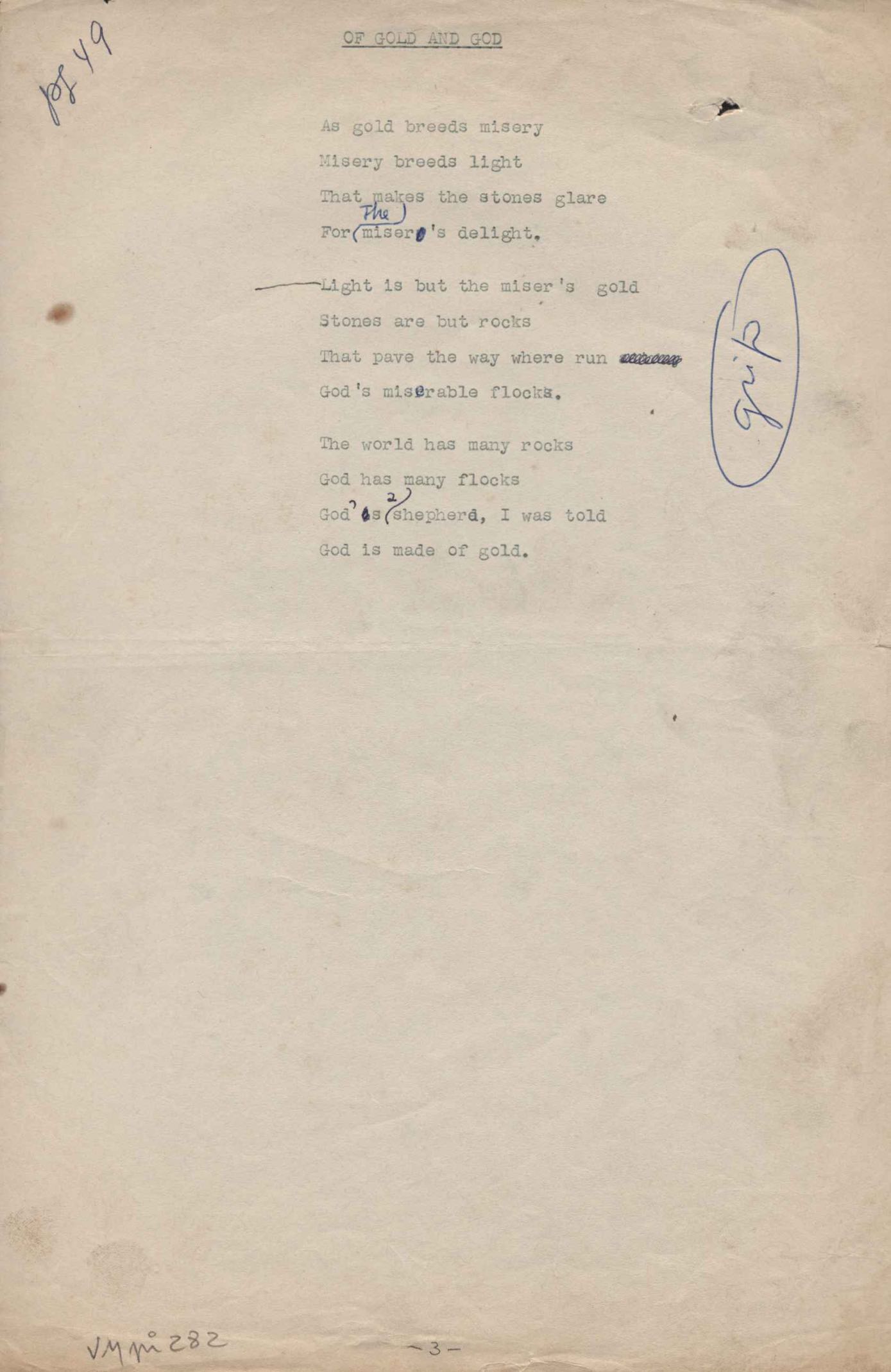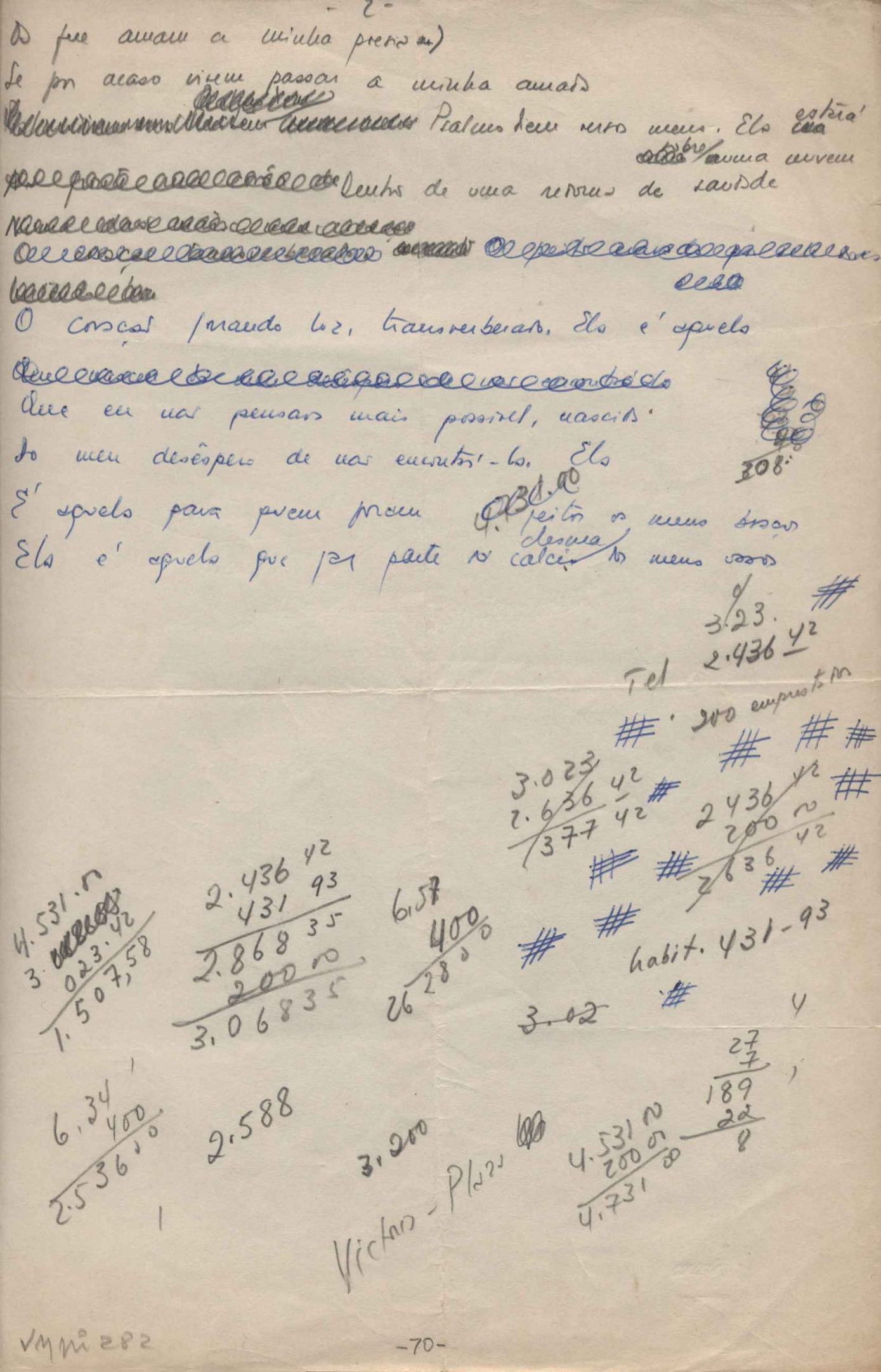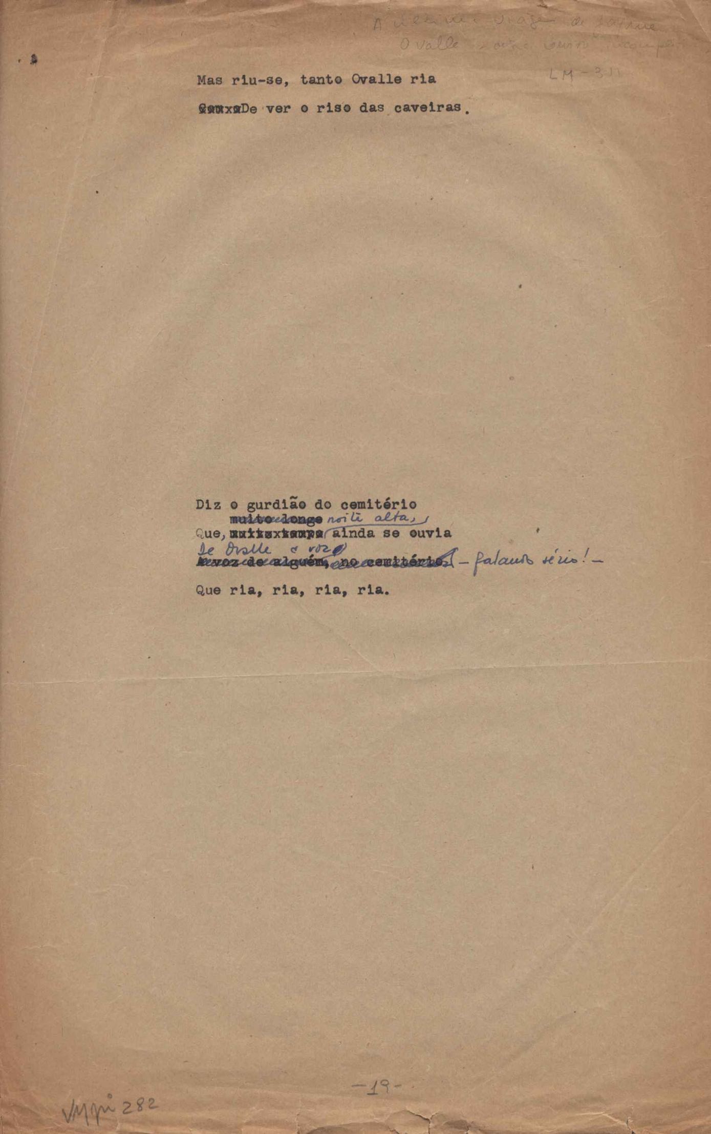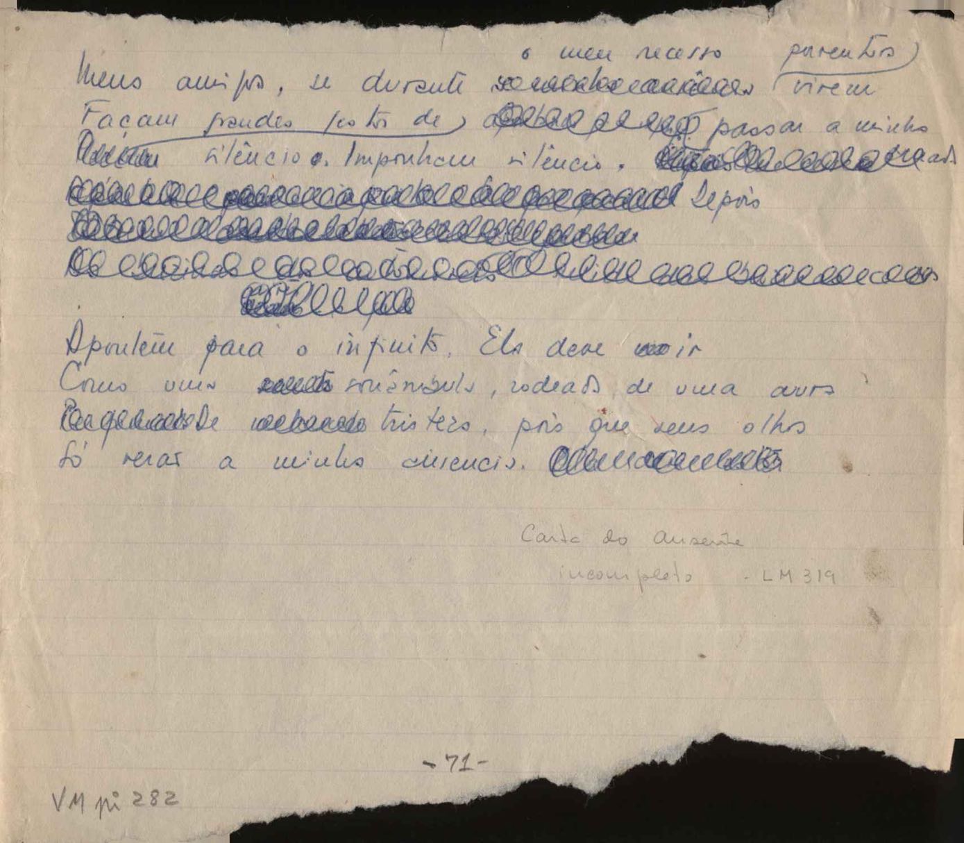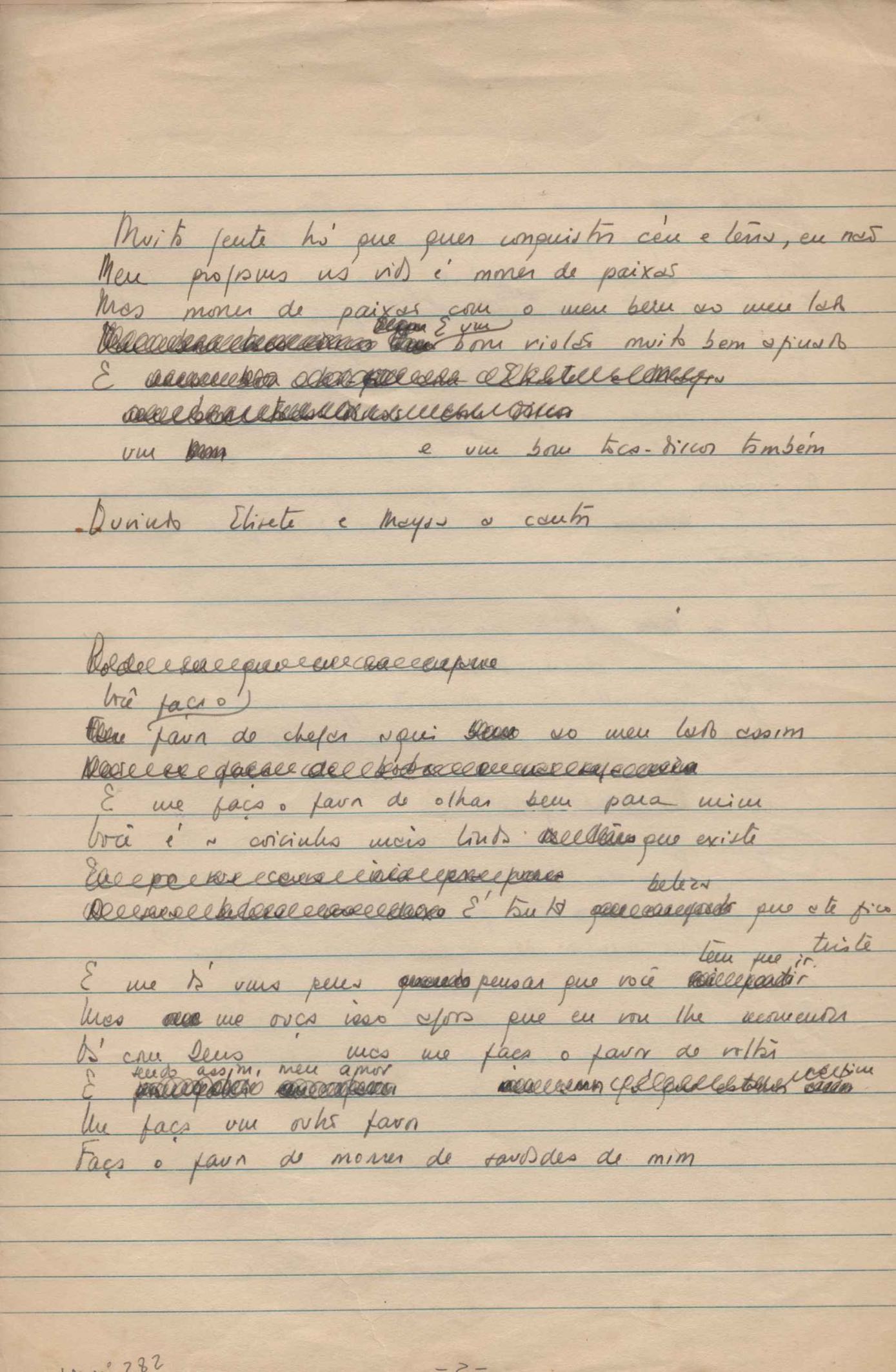 Prova tipográfica da [primeira edição?]. Prosa (1). Anexo: 1. Prova tipográfica incompleta; 2. Outras versões manuscritas e datilografadas, com emendas de: "O amor dos homens", "Antiode à tristeza", "Um beijo", "Blues para Emmett Louis Till", "Canção para a amiga dormindo", "Carta aos puros", "Carta do ausente", "... Deinde Philosophari [publ. "O mosquito"], "Dialética", "Dois poeminhas com Sputnik", "Duas canções de silêncio", "Of gold and God [publ. "Of God and gold"], "Look here, mr. Buster..." [publ. "Olhe aqui, mr. Buster..."], "O mais-que-perfeito", "O Margarida's", "As mulheres ocas", "Namorados no mirante", "Natal", "O ônibus Greyhound atravessa o Novo México", "Para viver um grande amor", "Pedro, meu filho", "Poema para Gilberto Amado", "O poeta aprendiz", "O poeta e a rosa", "O poeta", "Quinta rima" [publ. "Lapa de Bandeira"], "Teu nome" e "A última viagem de Jayme Ovalle".