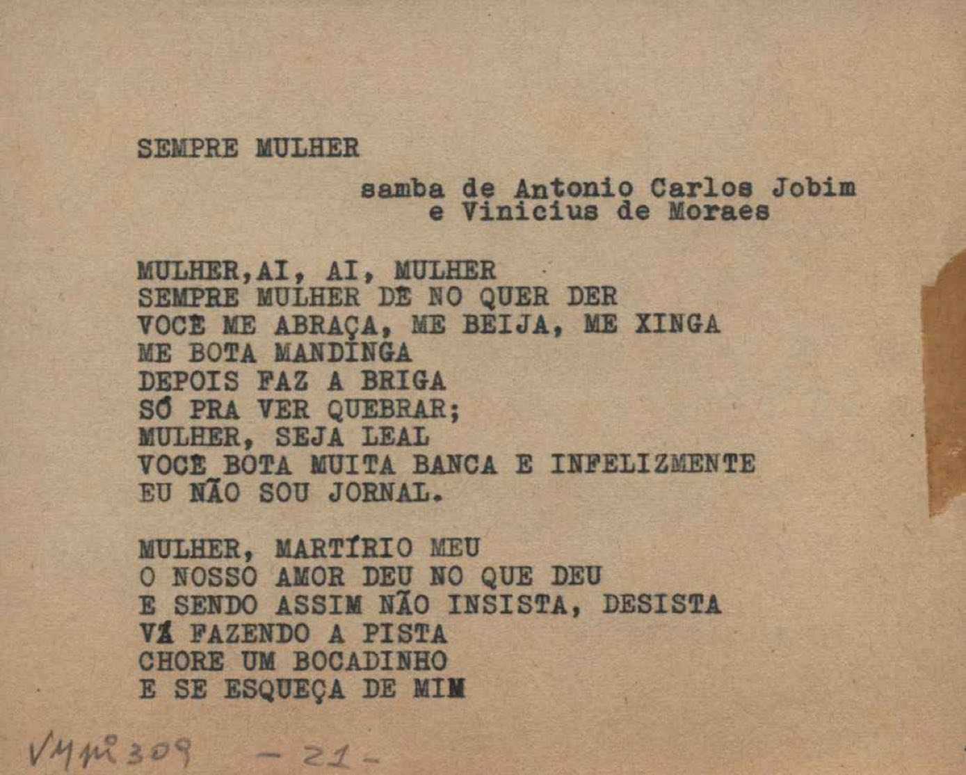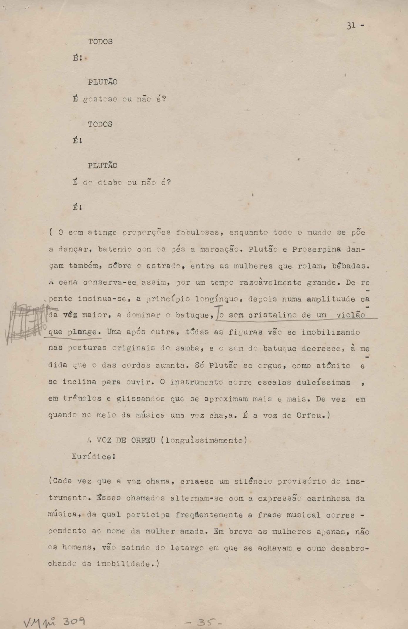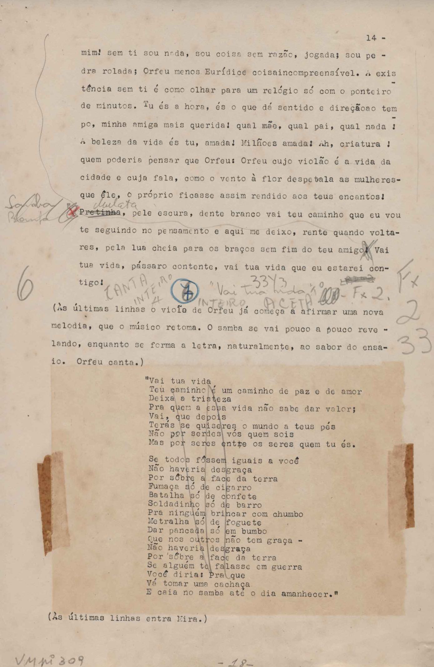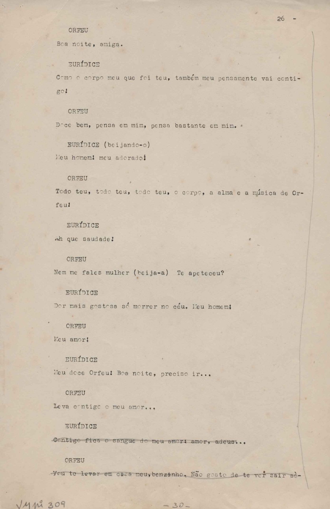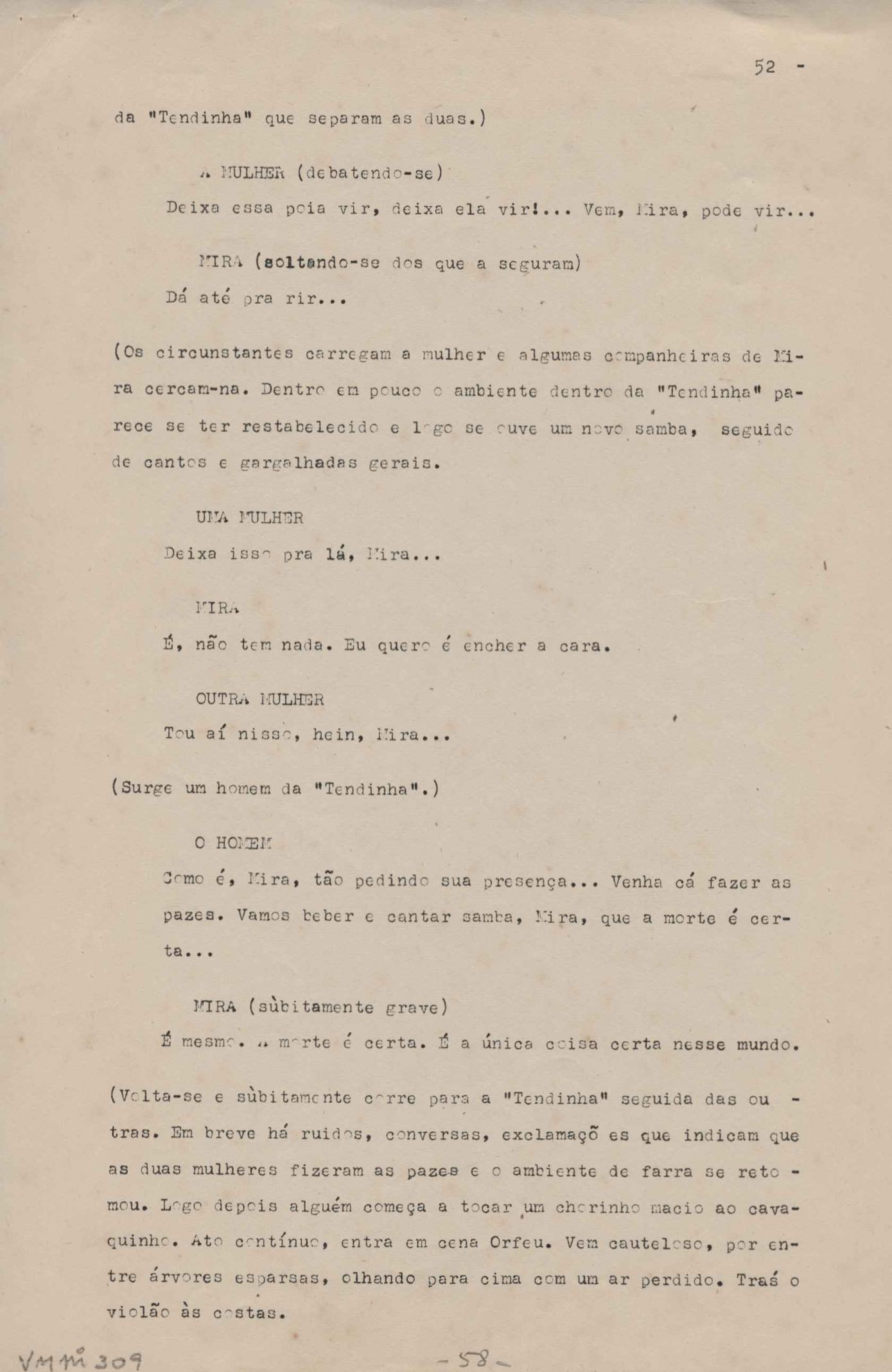 Peça teatral (1). Anexo: 1. Prova tipográfica; 2. Outras versões manuscritas e datilografadas; 3. Ingresso da pré-estreia; 4. Roteiro de luz; 5. Comunicado de VM aos artistas; 6. Observações à montagem da peça; 7. Relação de despesas com a encenação da peça; 8. Texto publicado na revista Anhembi (incompleto); 9. Tradução em inglês (sem indicação de tradutor); 10. Tradução em espanhol (sem indicação de tradutor); 11. Tradução em francês (sem indicação do tradutor); 12. Textos esparsos; 13. Convite para a leitura da peça.