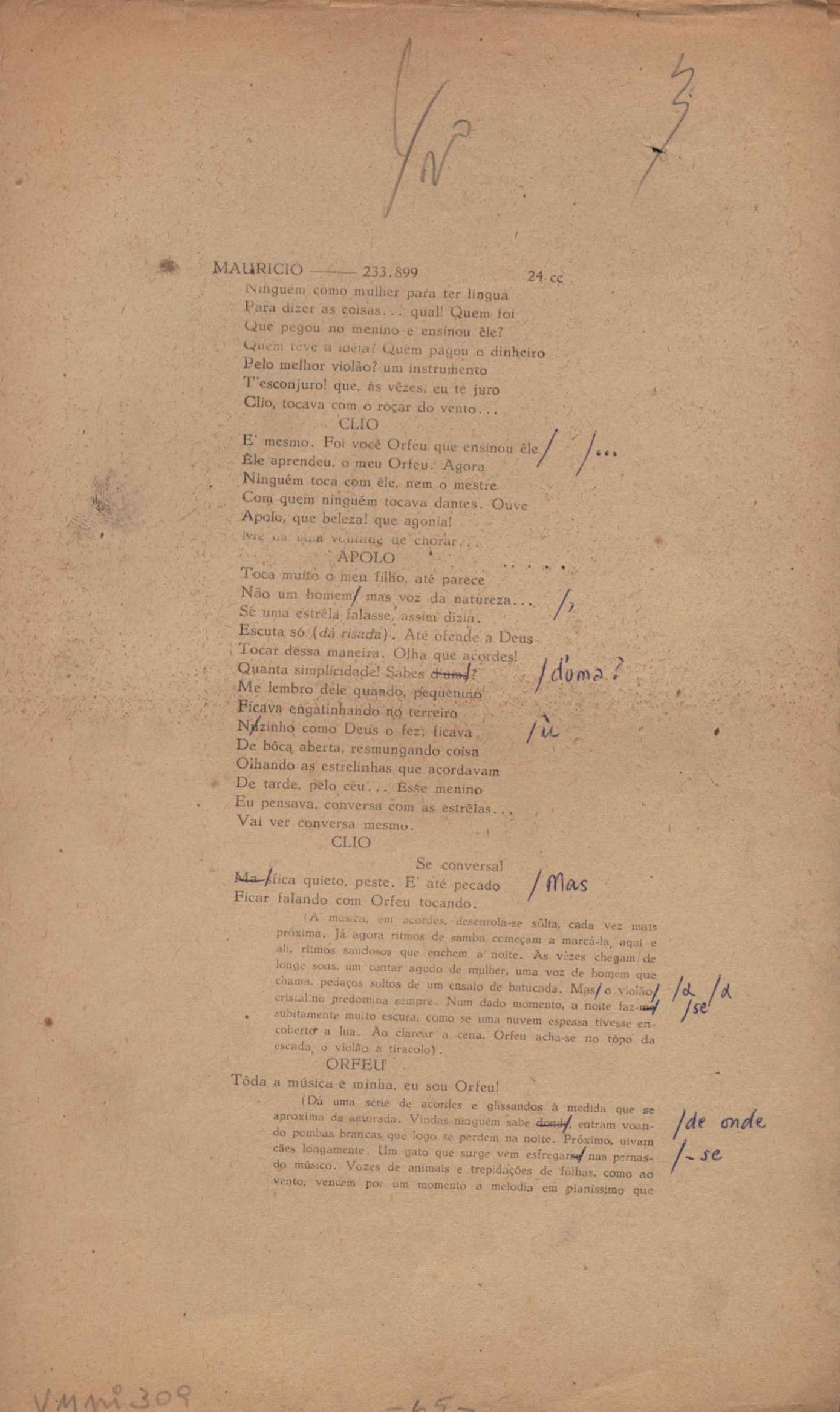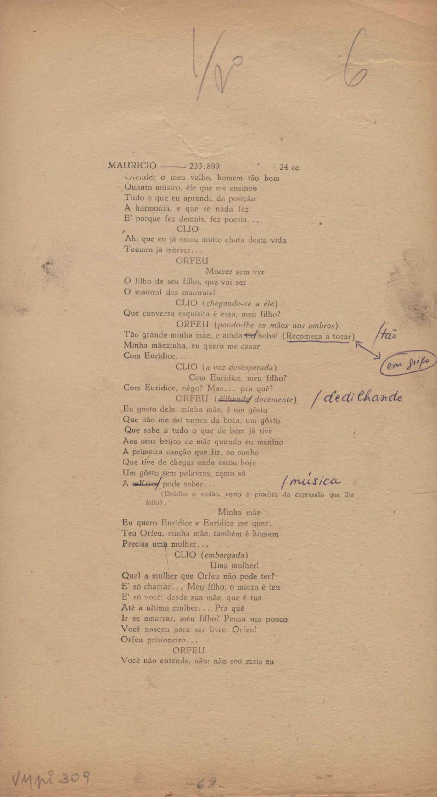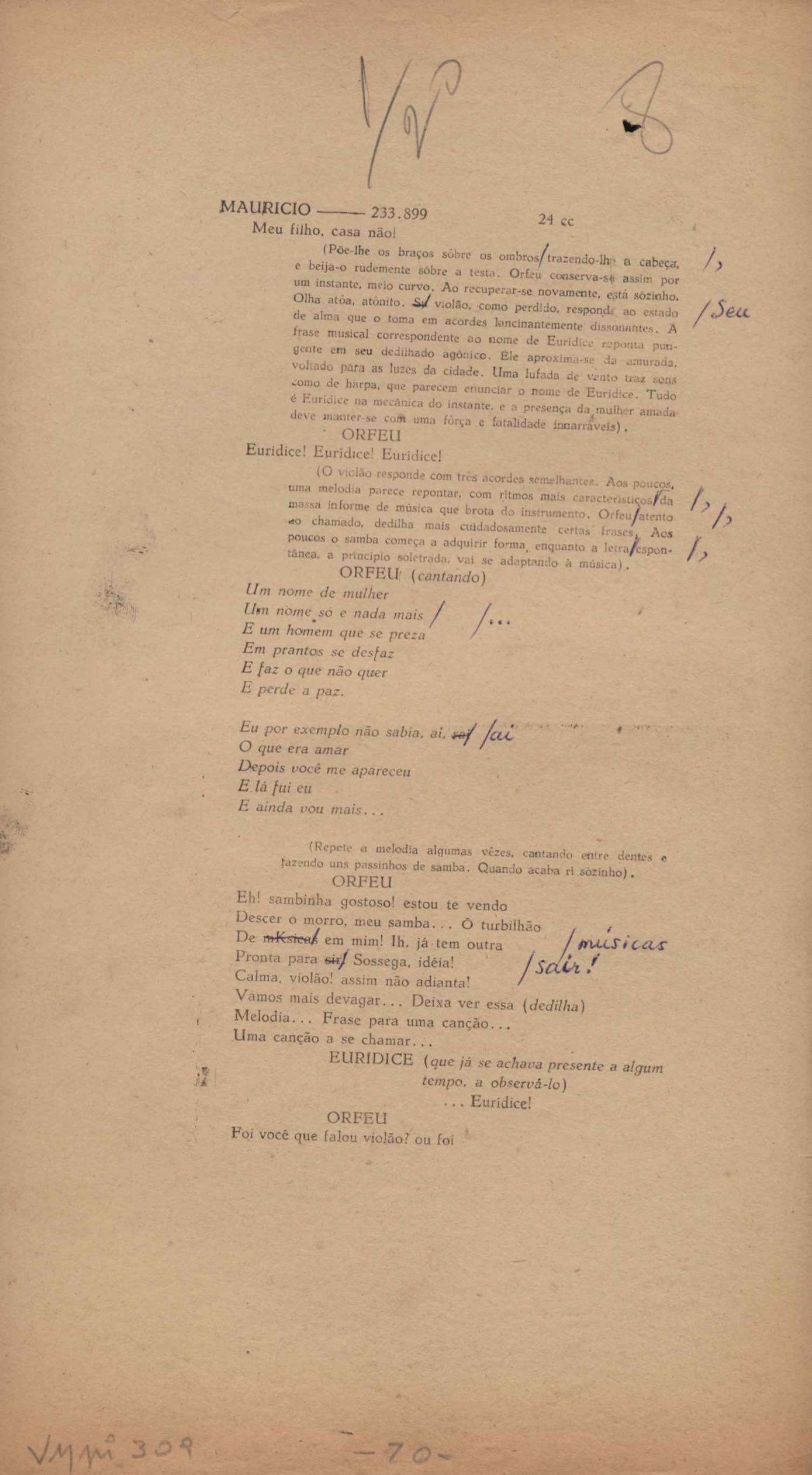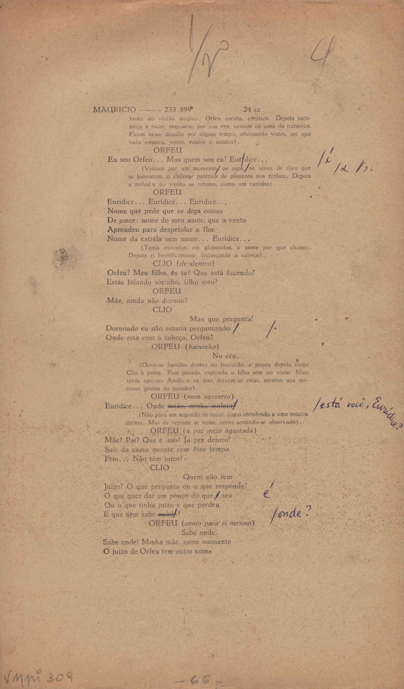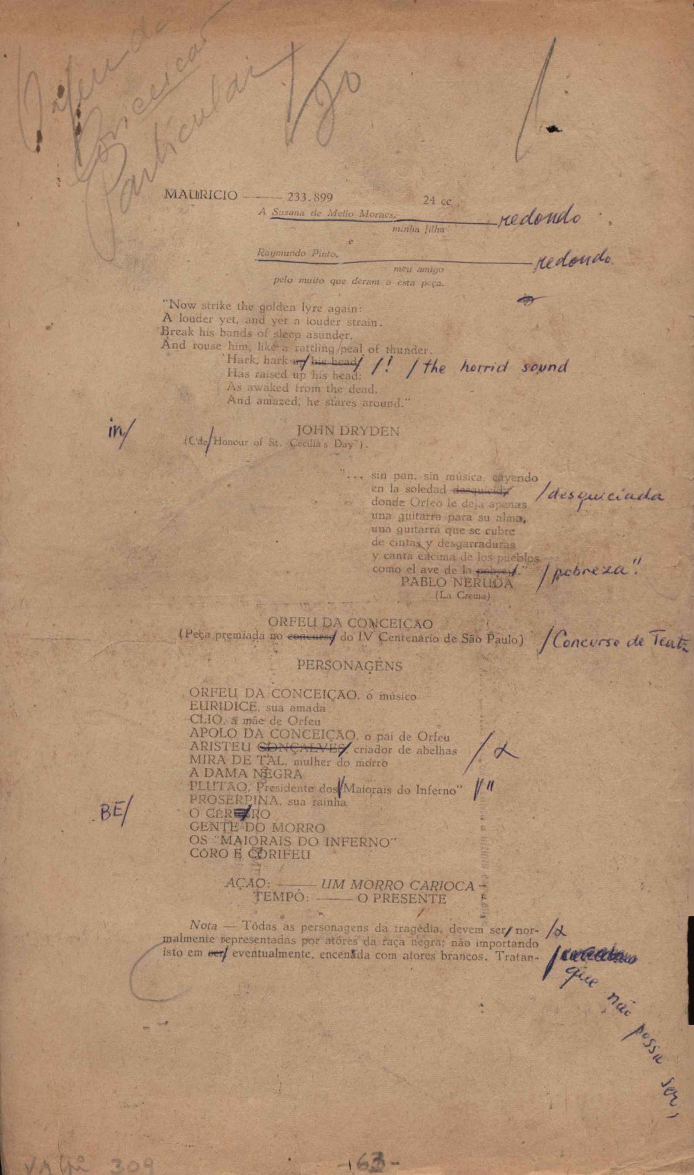 Peça teatral (1). Anexo: 1. Prova tipográfica; 2. Outras versões manuscritas e datilografadas; 3. Ingresso da pré-estreia; 4. Roteiro de luz; 5. Comunicado de VM aos artistas; 6. Observações à montagem da peça; 7. Relação de despesas com a encenação da peça; 8. Texto publicado na revista Anhembi (incompleto); 9. Tradução em inglês (sem indicação de tradutor); 10. Tradução em espanhol (sem indicação de tradutor); 11. Tradução em francês (sem indicação do tradutor); 12. Textos esparsos; 13. Convite para a leitura da peça.