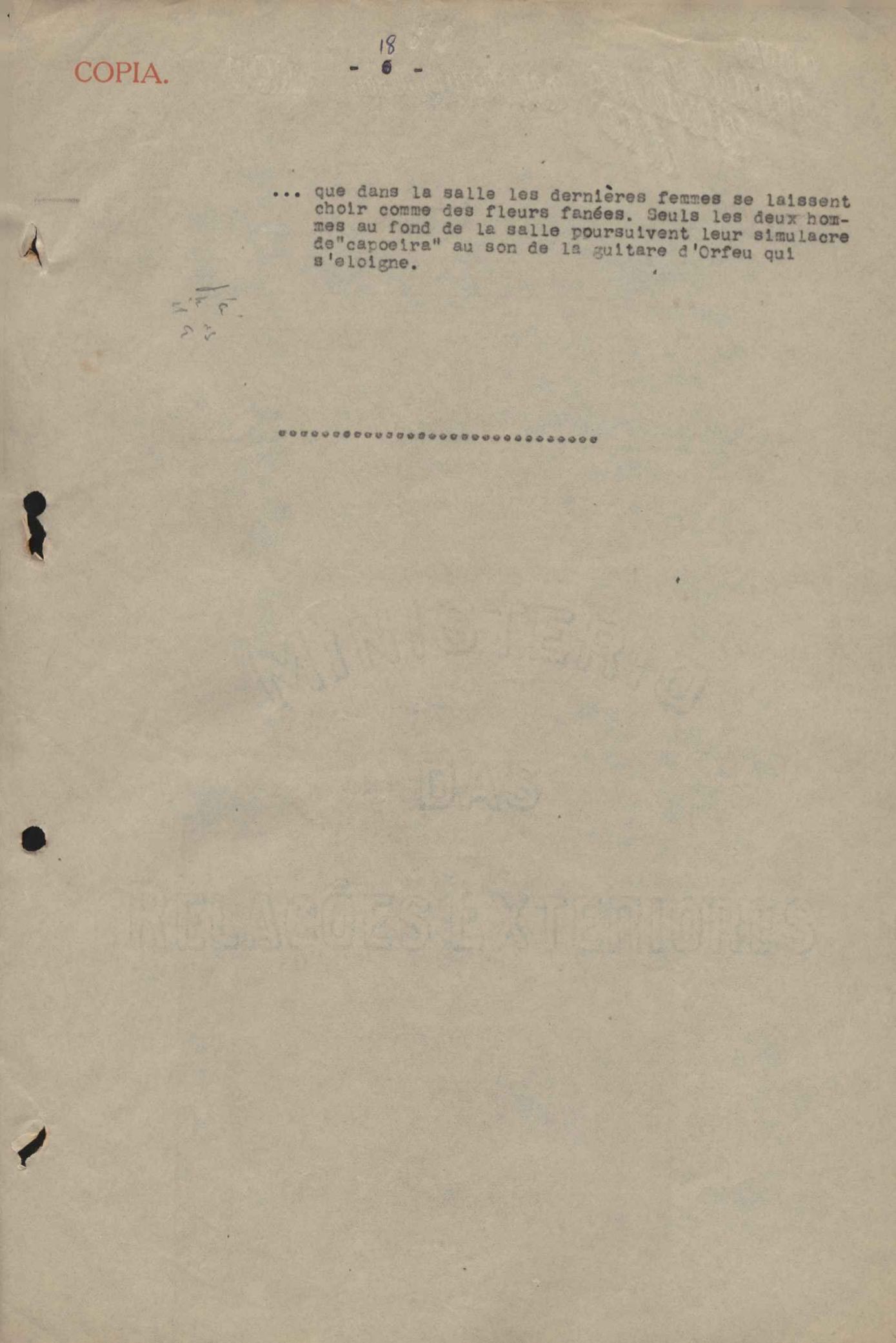 Peça teatral (1). Anexo: 1. Prova tipográfica; 2. Outras versões manuscritas e datilografadas; 3. Ingresso da pré-estreia; 4. Roteiro de luz; 5. Comunicado de VM aos artistas; 6. Observações à montagem da peça; 7. Relação de despesas com a encenação da peça; 8. Texto publicado na revista Anhembi (incompleto); 9. Tradução em inglês (sem indicação de tradutor); 10. Tradução em espanhol (sem indicação de tradutor); 11. Tradução em francês (sem indicação do tradutor); 12. Textos esparsos; 13. Convite para a leitura da peça.