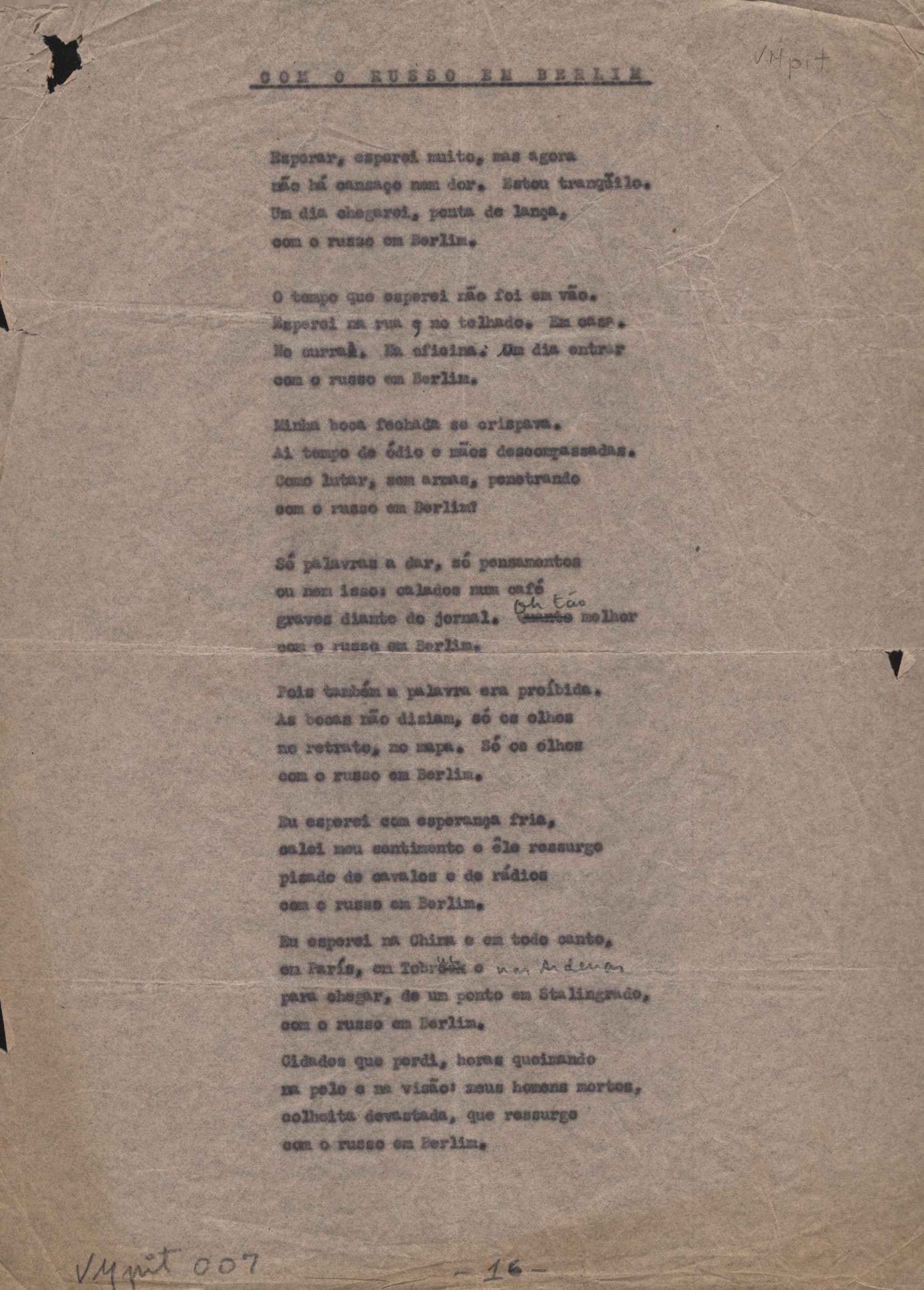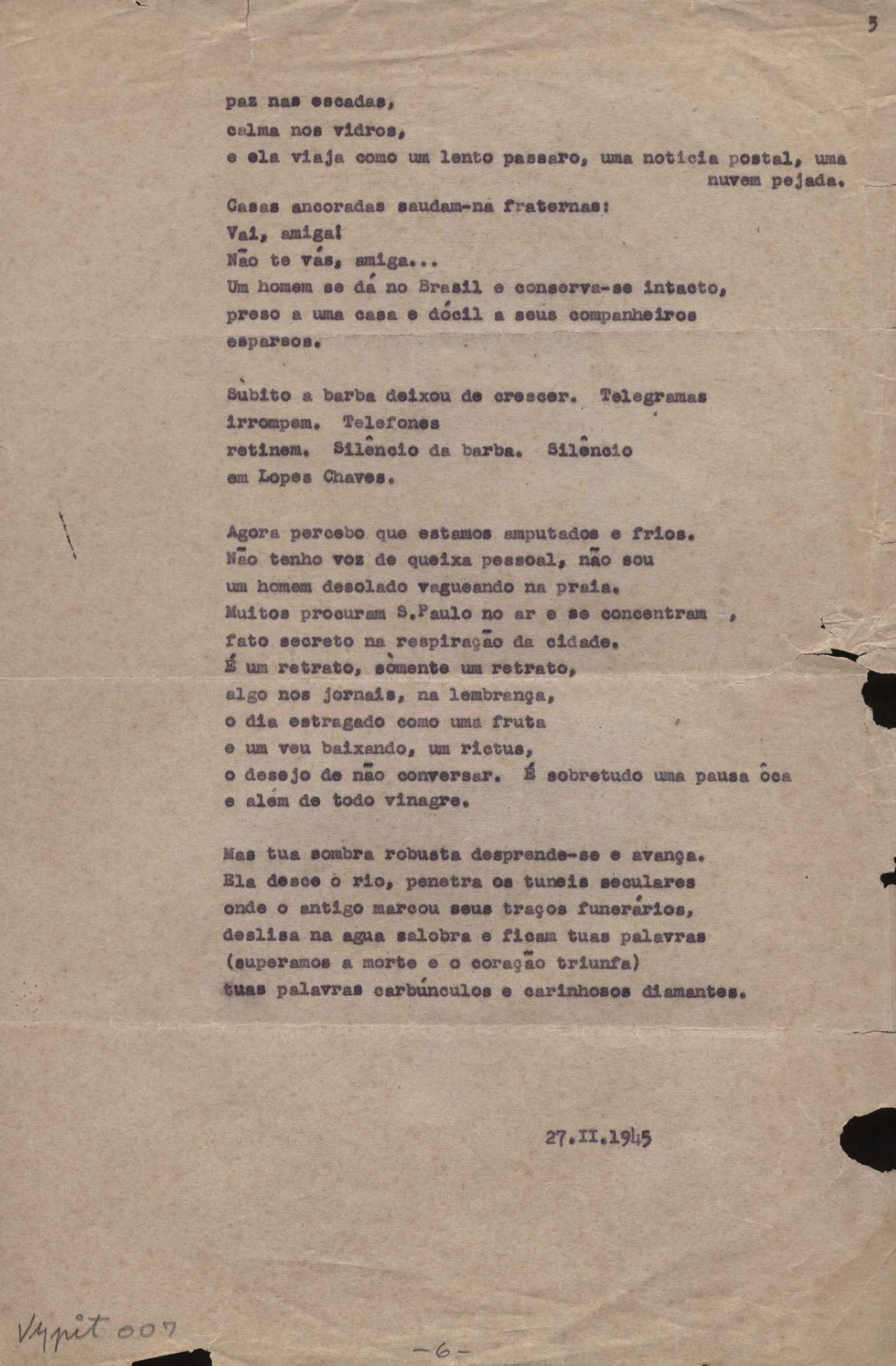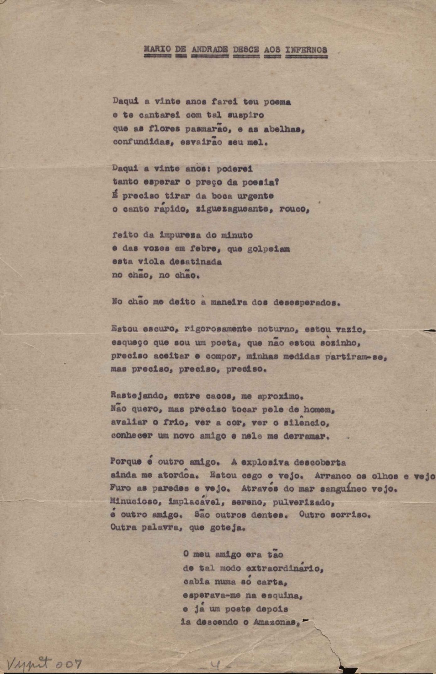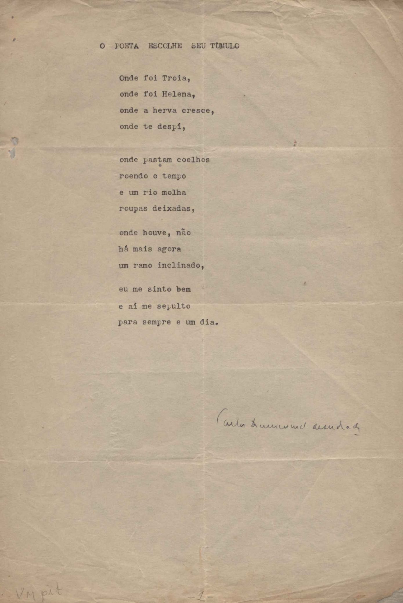 "Canto ao homem do povo Charlie Chaplin", "Com o russo em Berlim", "Consideração do poema", "Mário de Andrade desce aos infernos", "O poeta escolhe seu túmulo", "Quer nos azulejos", "A rósea nave triunfal", "Sobre o tempo, sobre a taipa" e "A vida menor". Versos dos poemas "Estampas de Vila Rica I - Carmo", "Estampas de Vila Rica II - São Francisco" e "Morte das casas de Ouro Preto"
