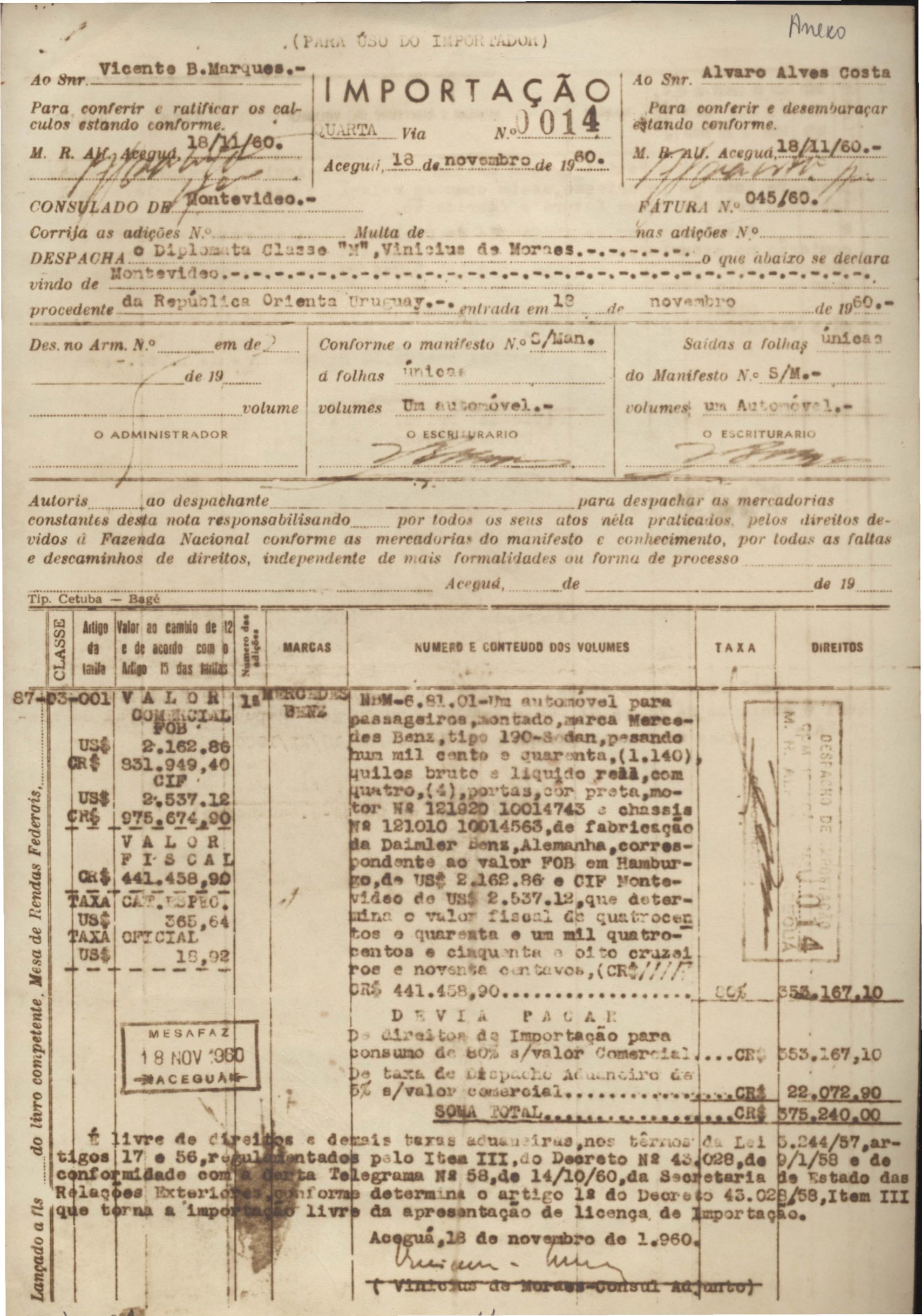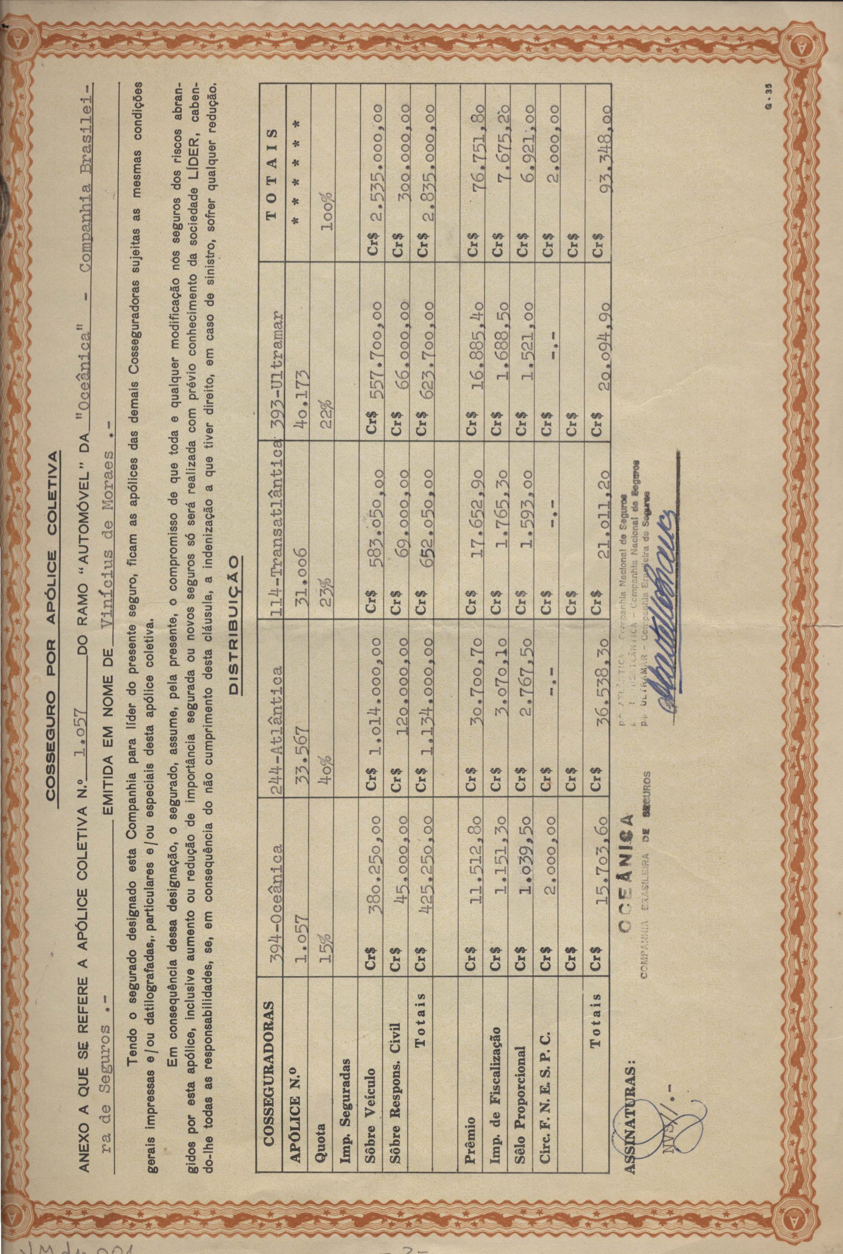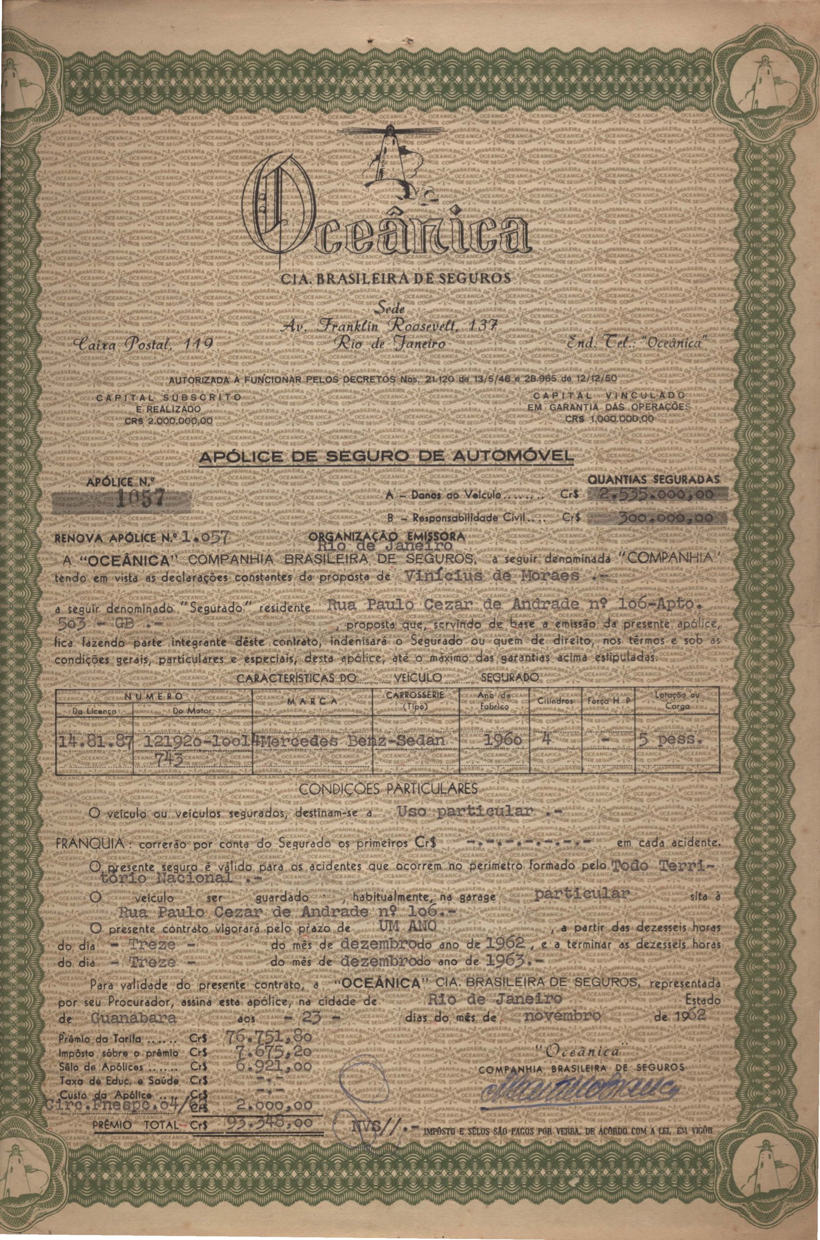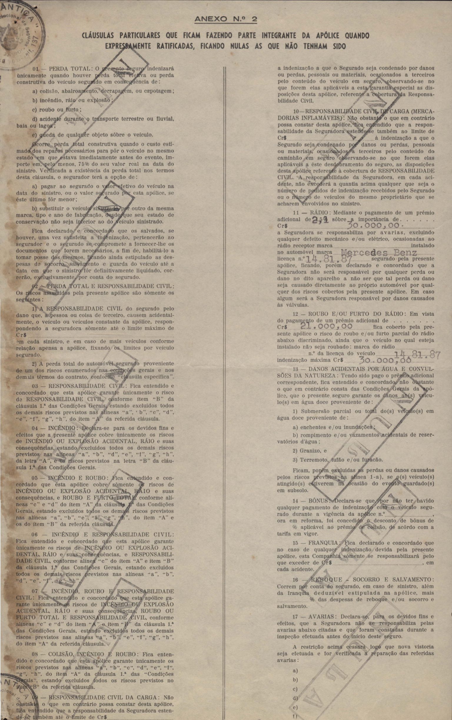 Apólice de seguro do automóvel Mercedes Benz de VM