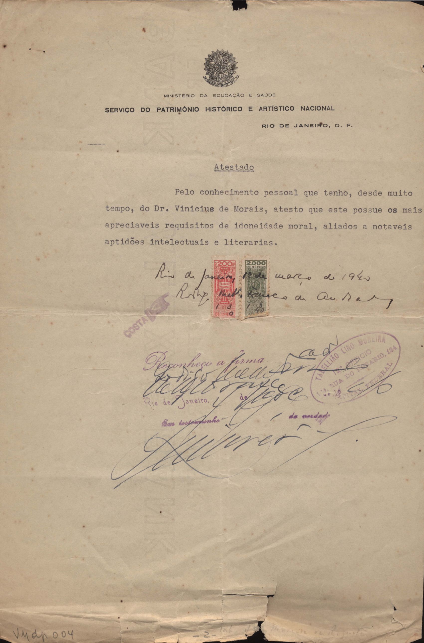 Atestados (2) de idoneidade moral, assinados por Prudente de Morais Neto e Rodrigo Melo Franco de Andrade