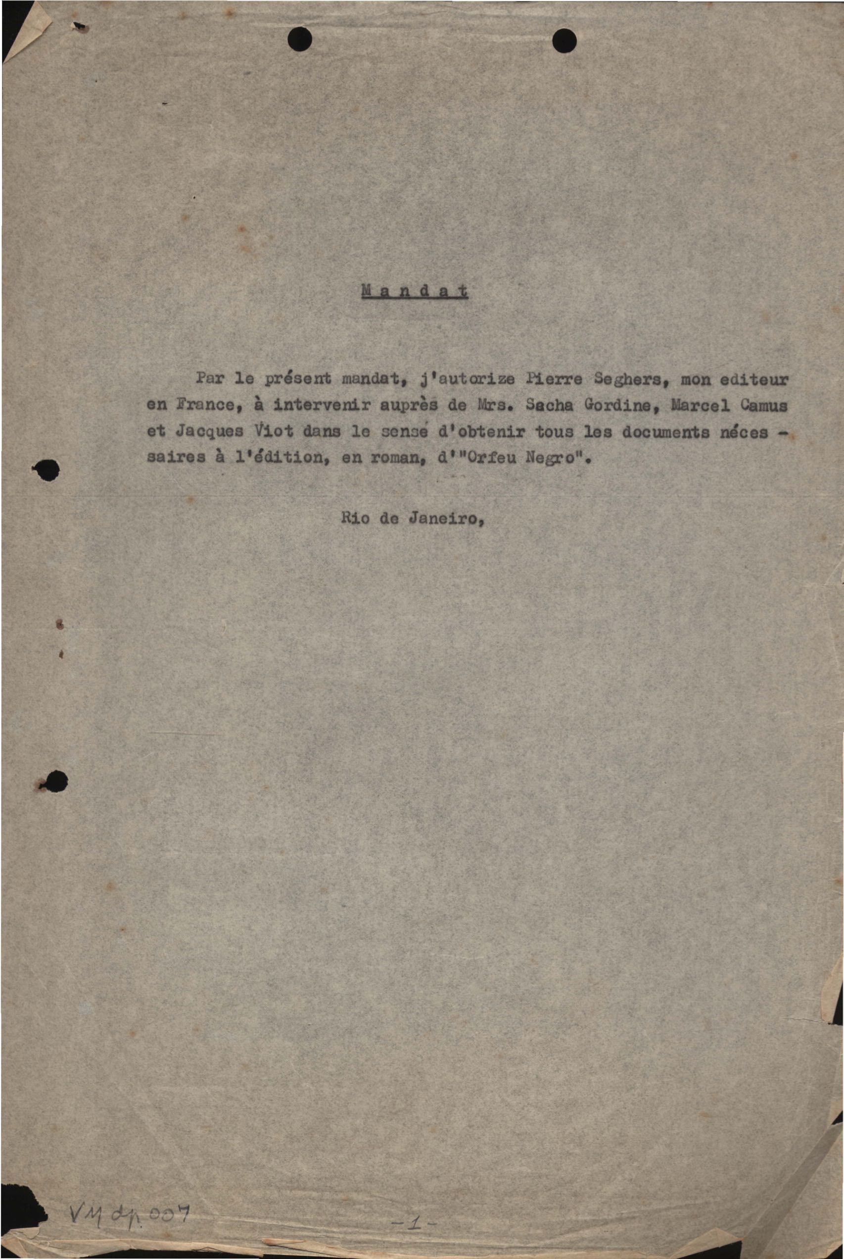 Autorização de VM a Pierre Seghers para editar Orfeu negro