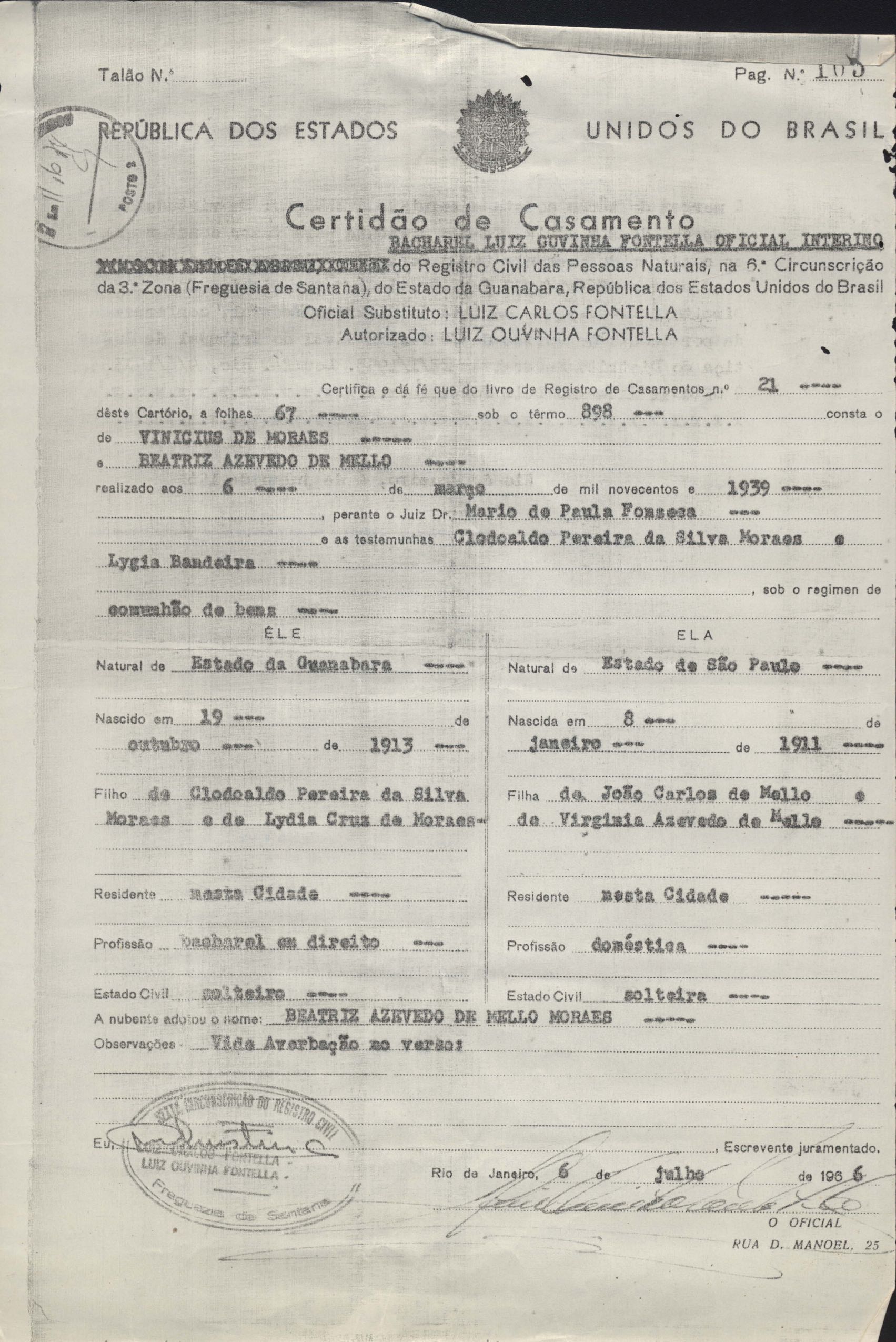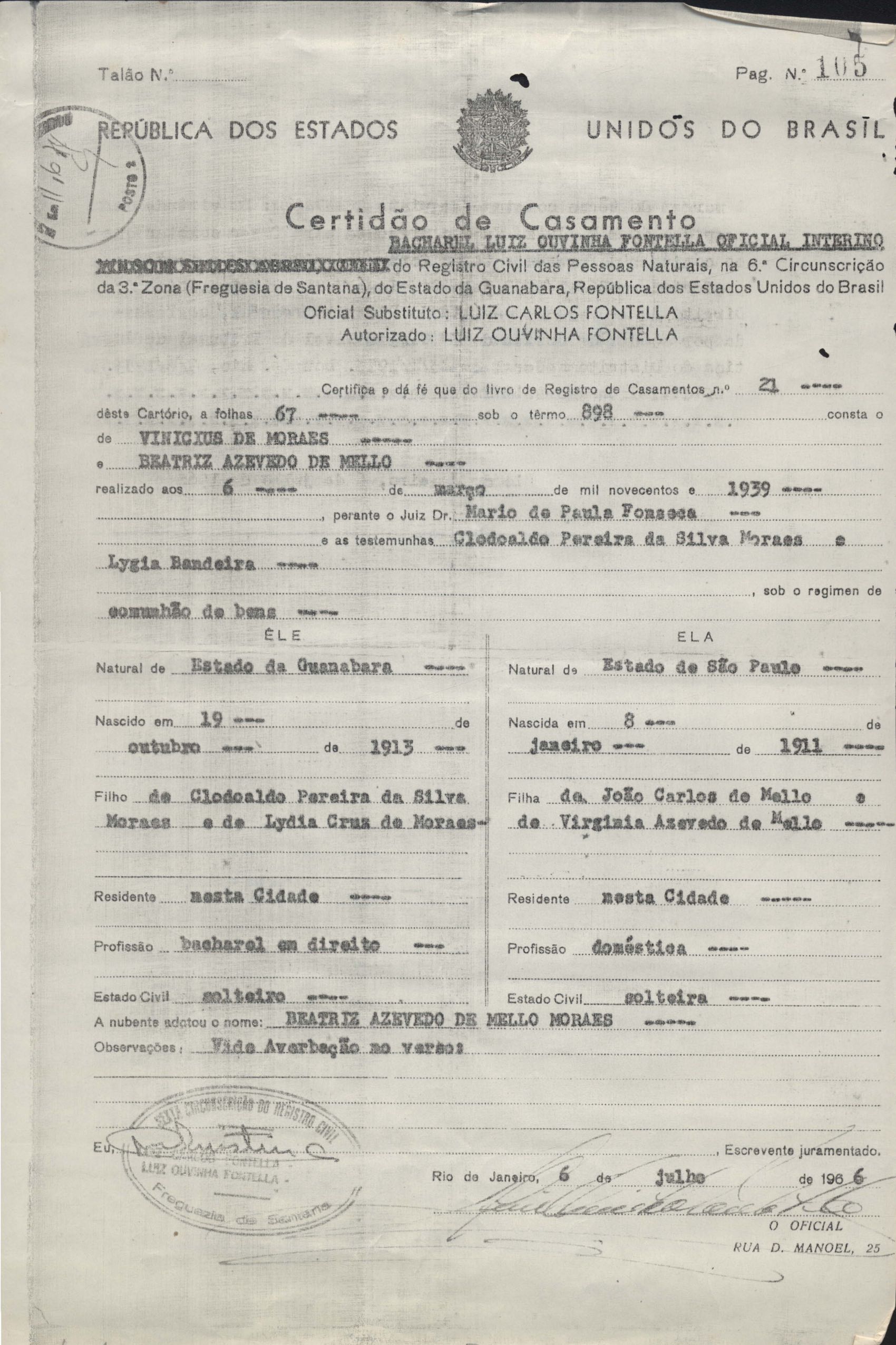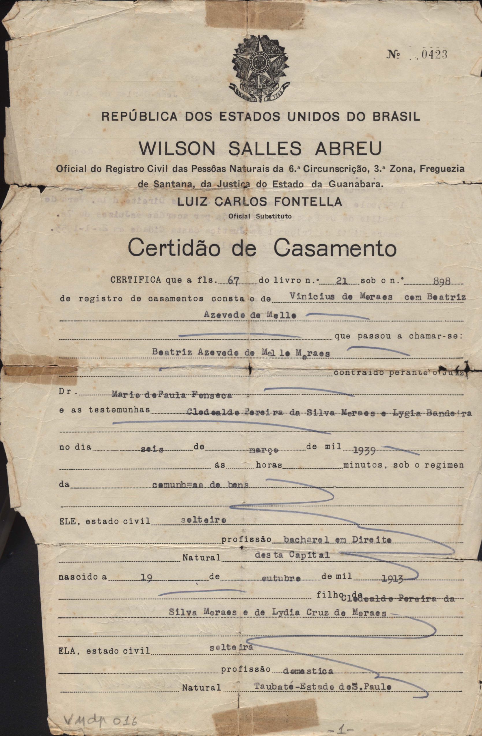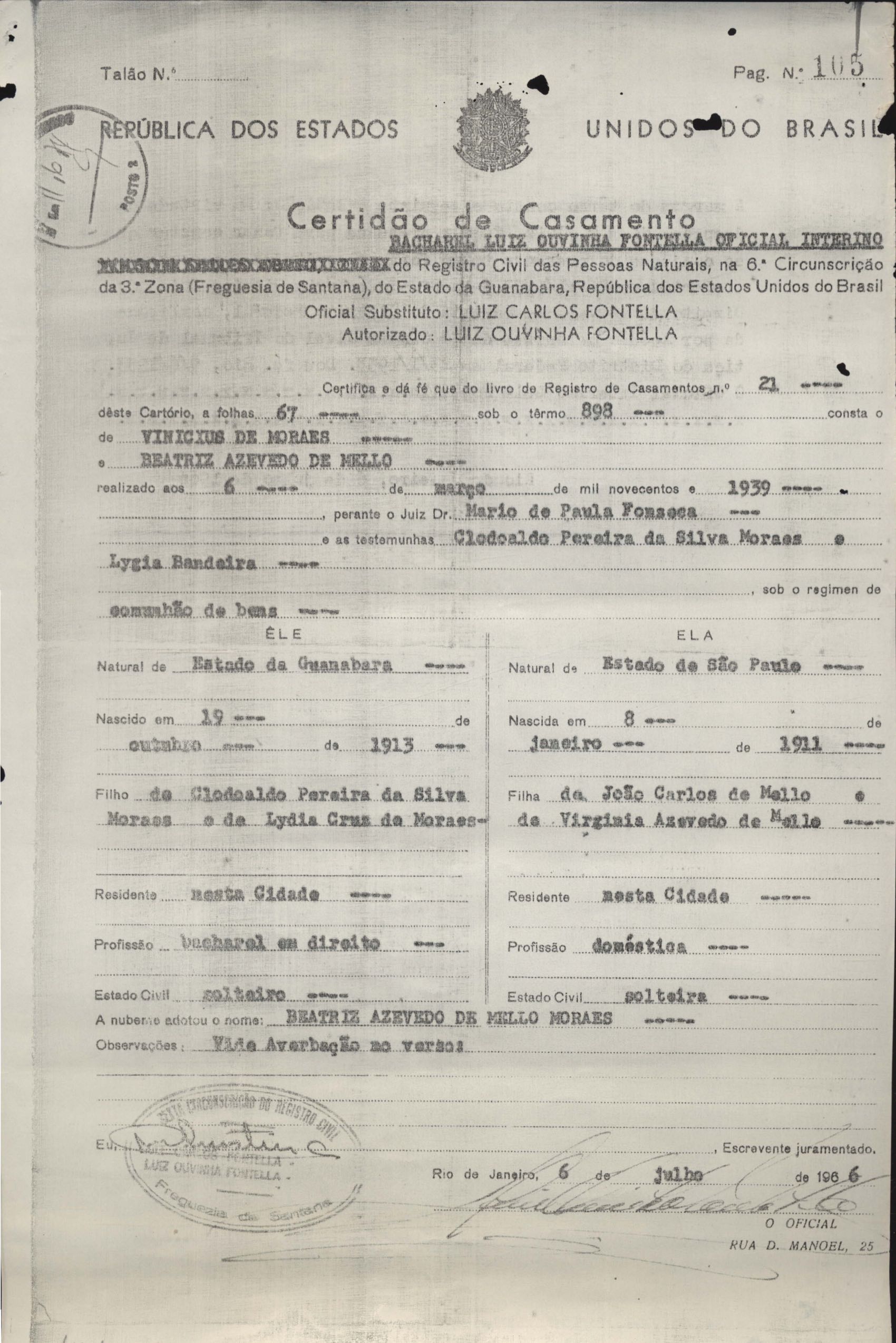 Certidão de casamento de VM com Beatriz Azevedo de Mello Moraes [Tati de Moraes]