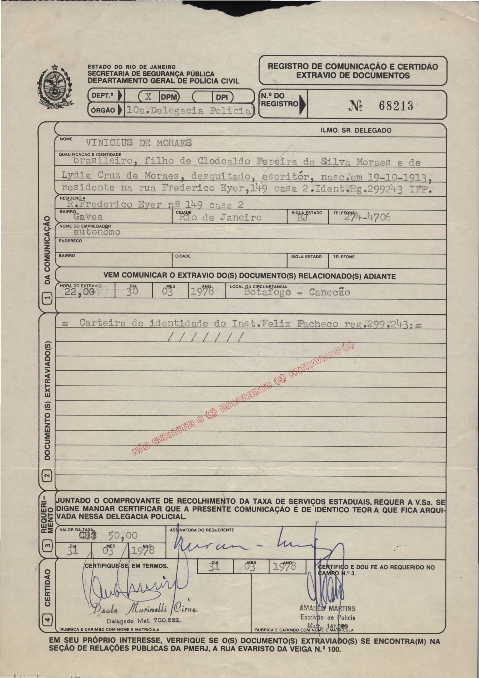 Certidão de extravio de documentos