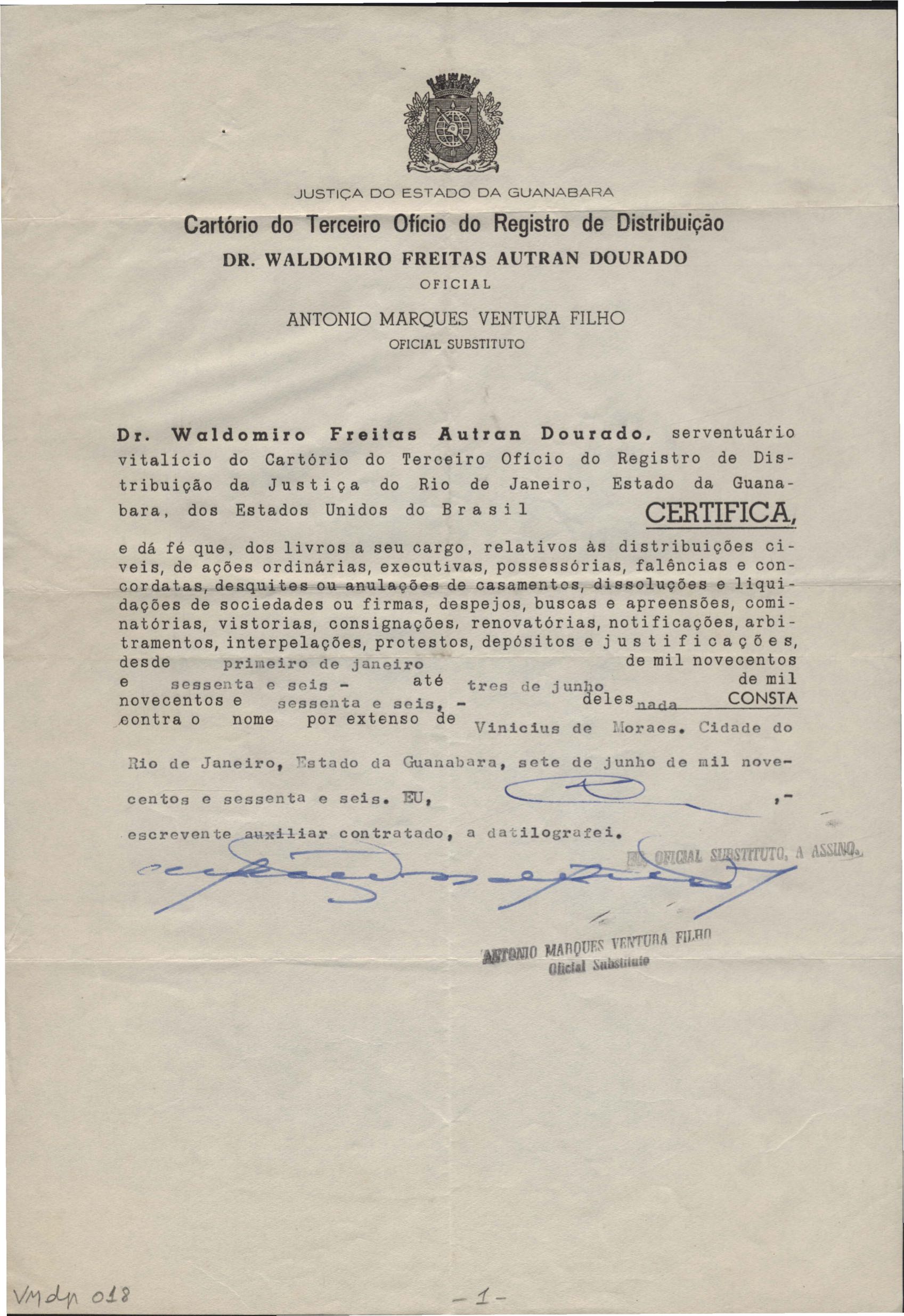 Certidão de nada consta em nome de VM nos registros do Cartório do 3º Ofício do Registro de Distribuição