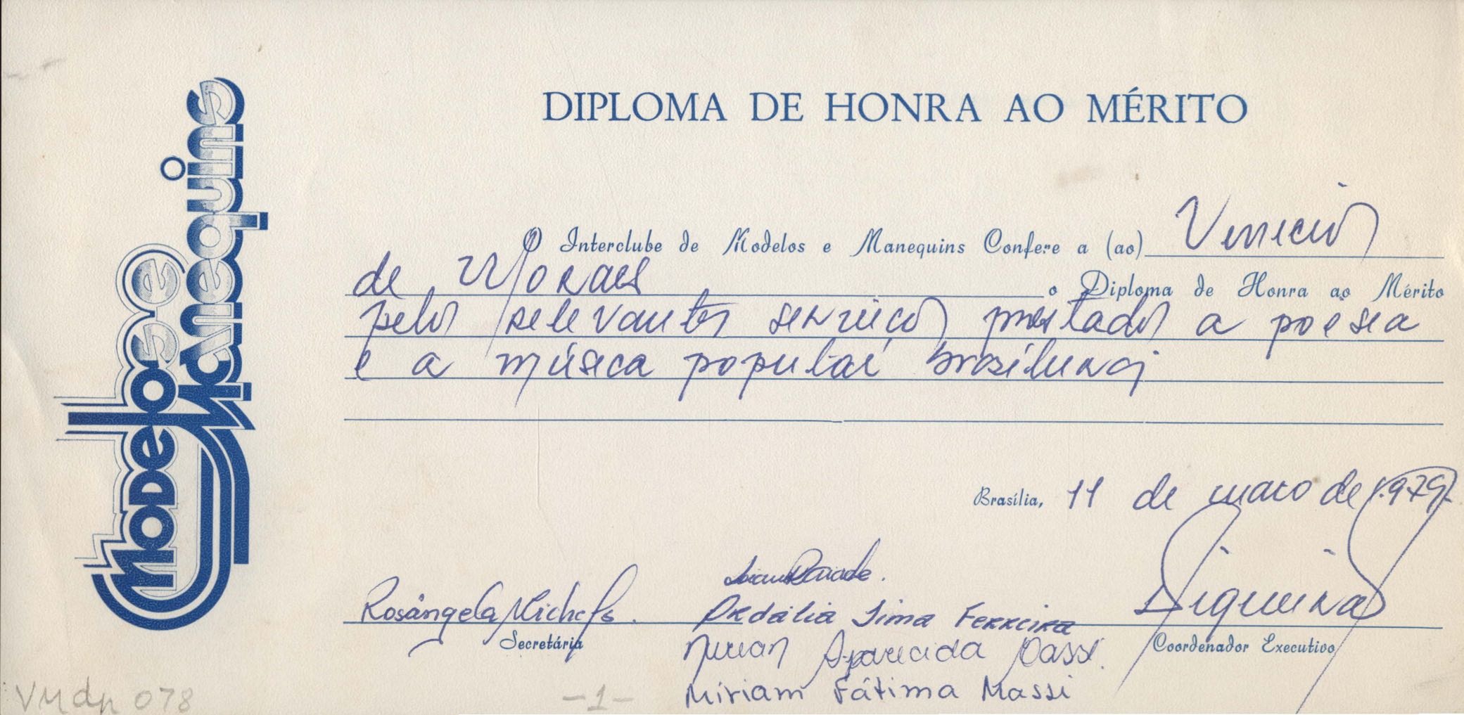 Diploma de honra ao mérito dado a VM pelo Interclube de Modelos e Manequins