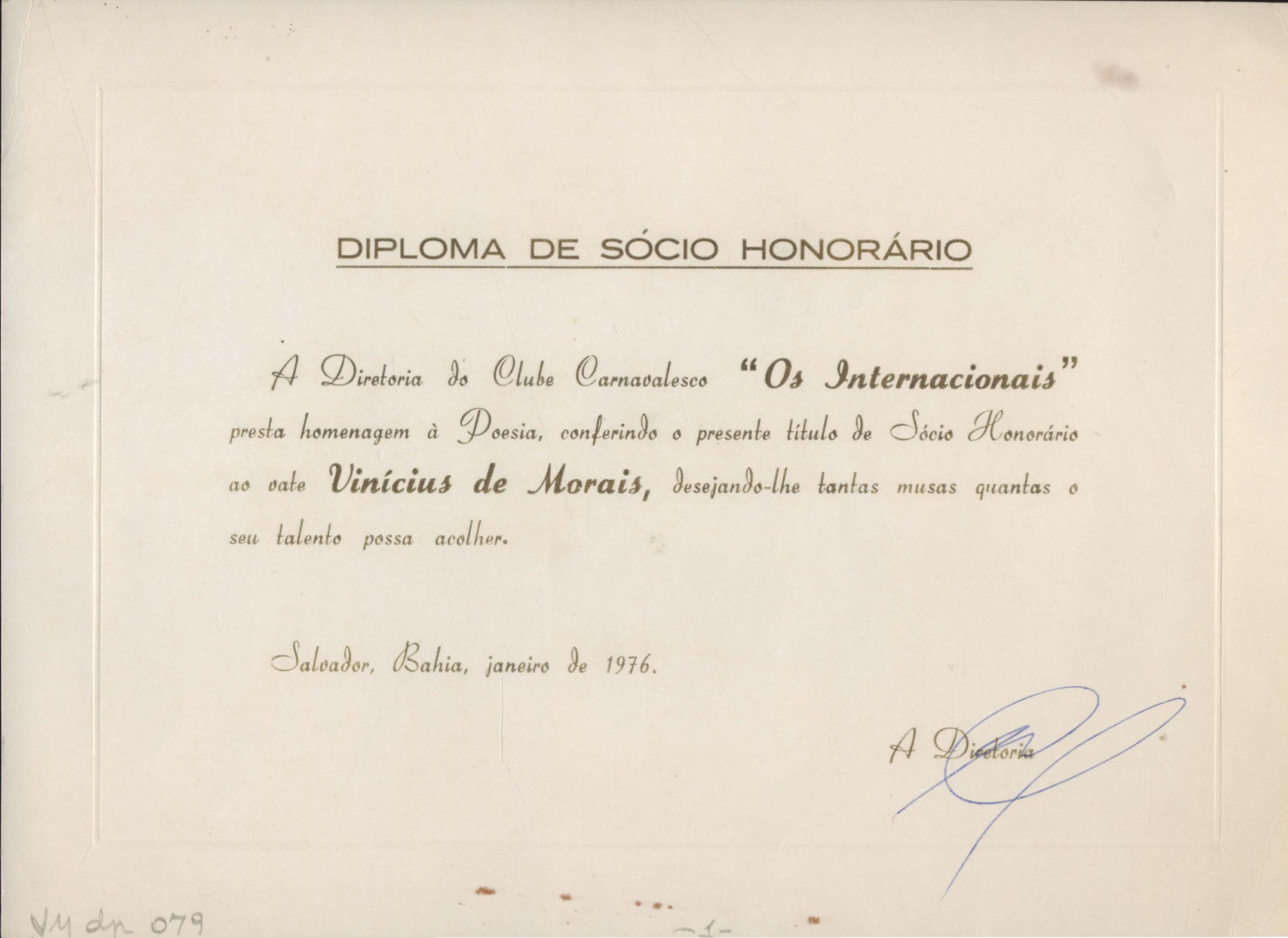 Diploma de sócio honorário do Clube Carnavalesco "Os Internacionais"