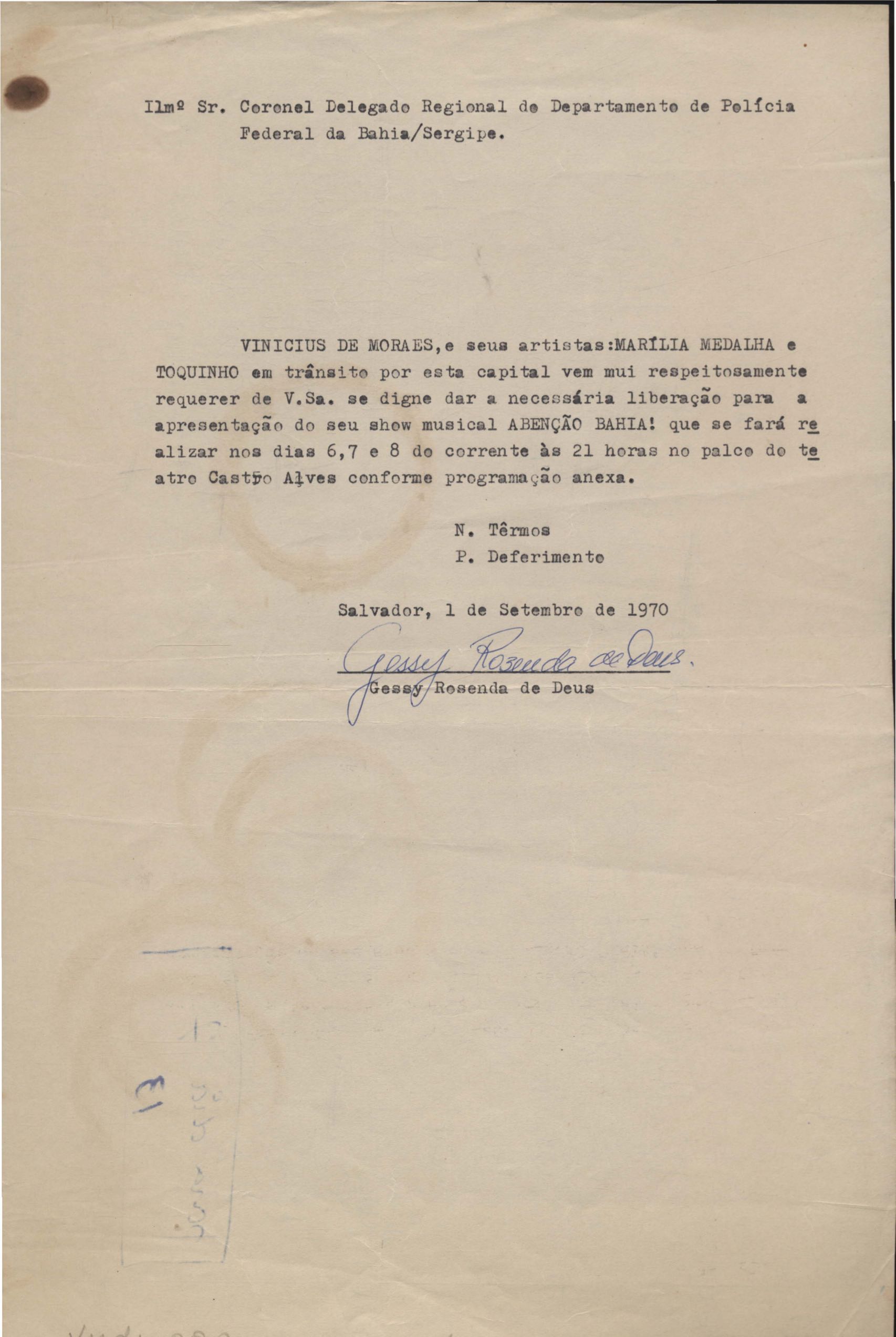 Requerimento ao Departamento de Polícia da Bahia para realização do show A bênção, Bahia