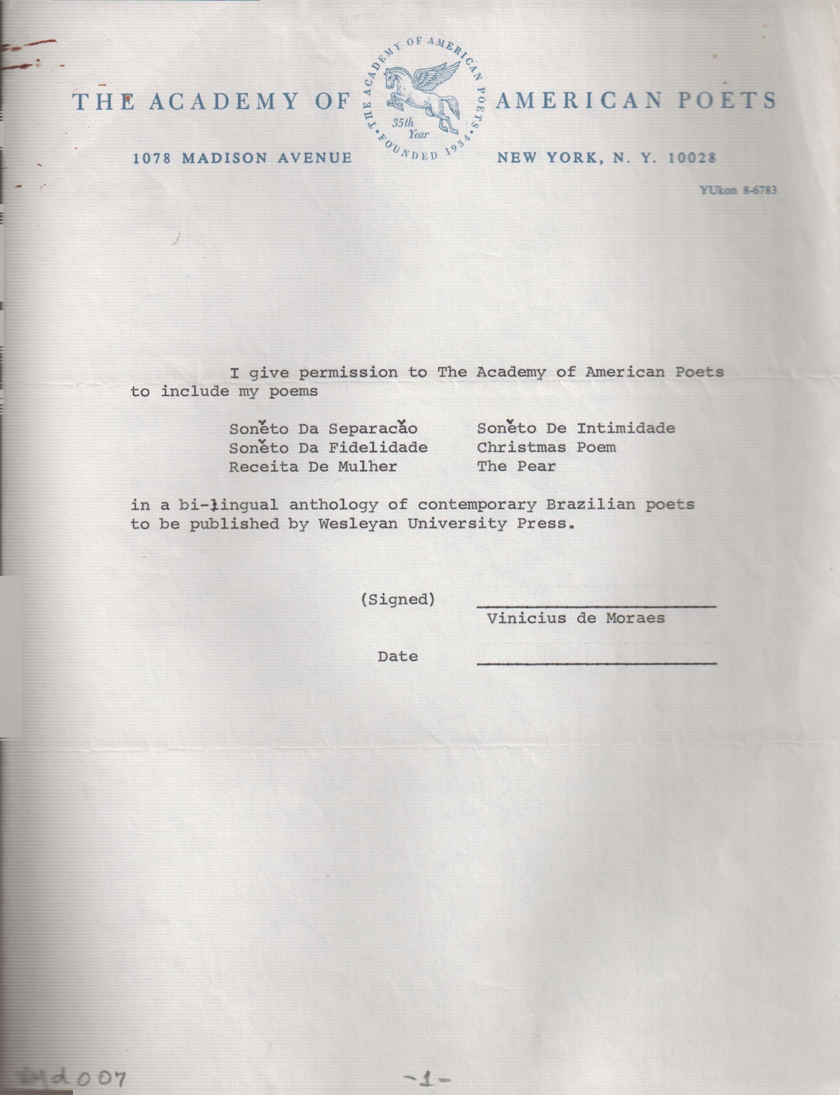 Autorização de VM a The Academy of American Poets para publicação de poemas