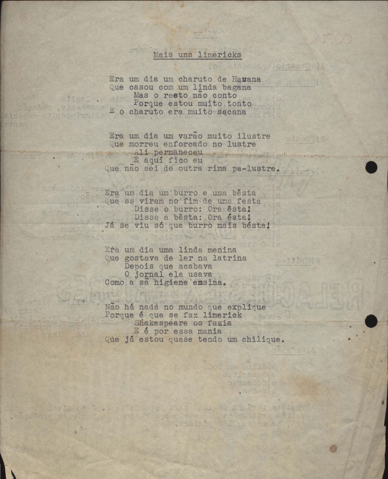 O poema "Mais uns limeriques" está no verso de uma das folhas.