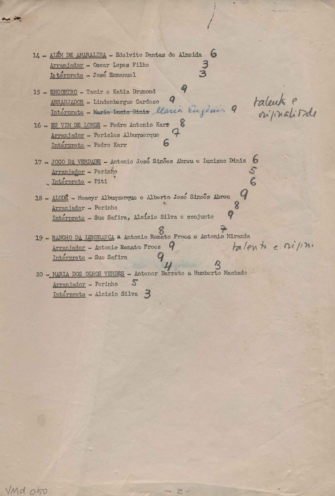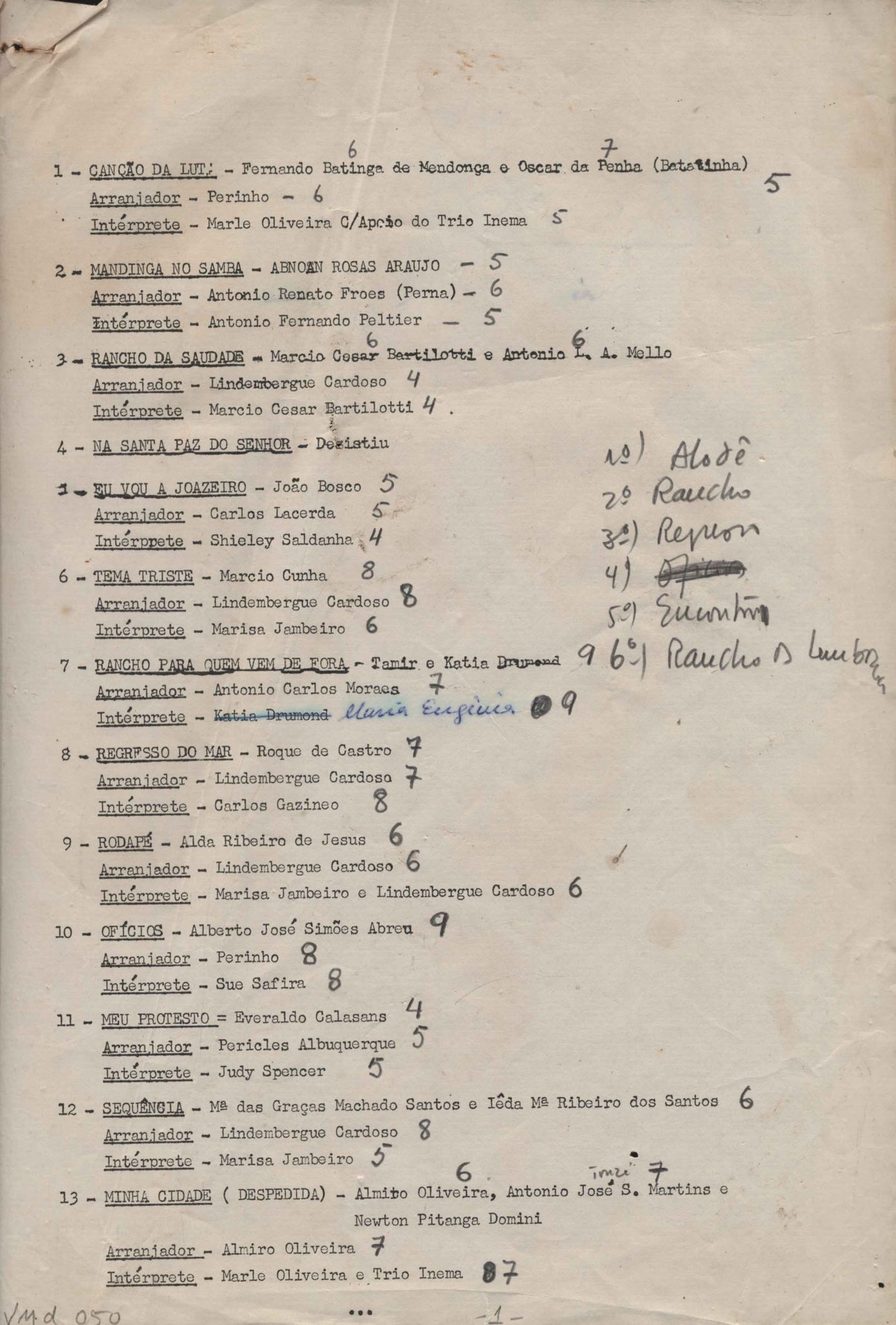 TÍTULO: Lista de músicas com nome do arranjador e intérprete