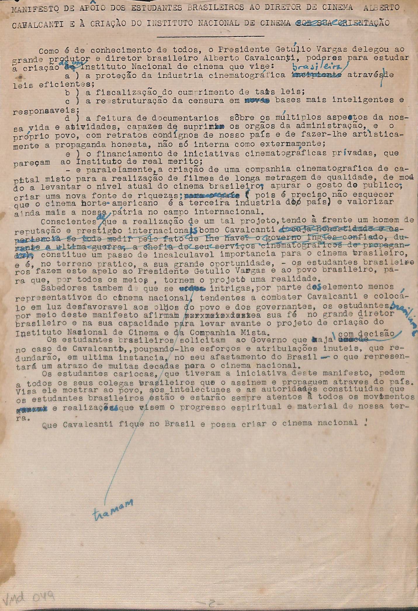 Manifesto de apoio dos estudantes brasileiros ao diretor de cinema Alberto Cavalcanti e à criação do Instituto Nacional de Cinema
