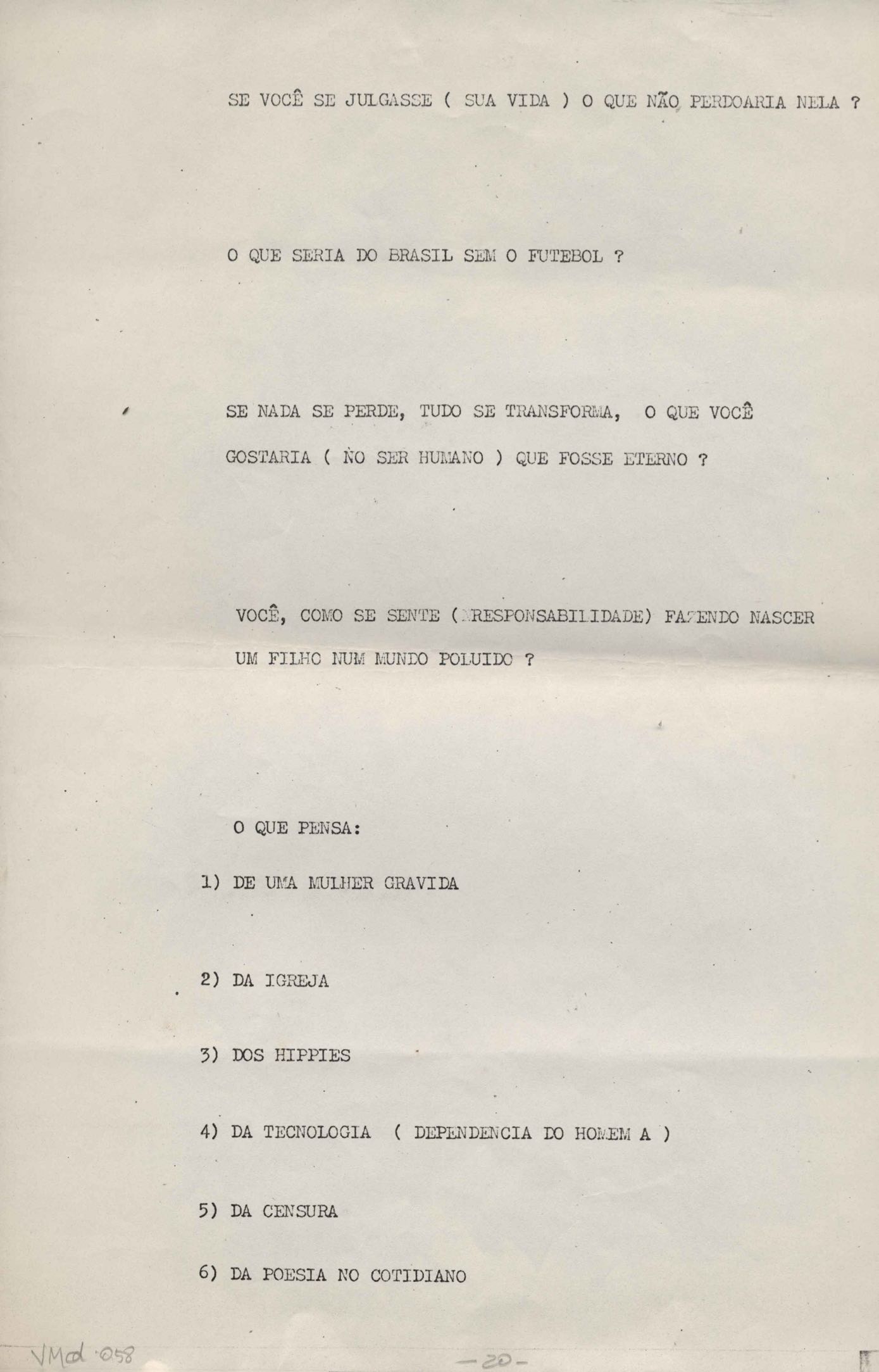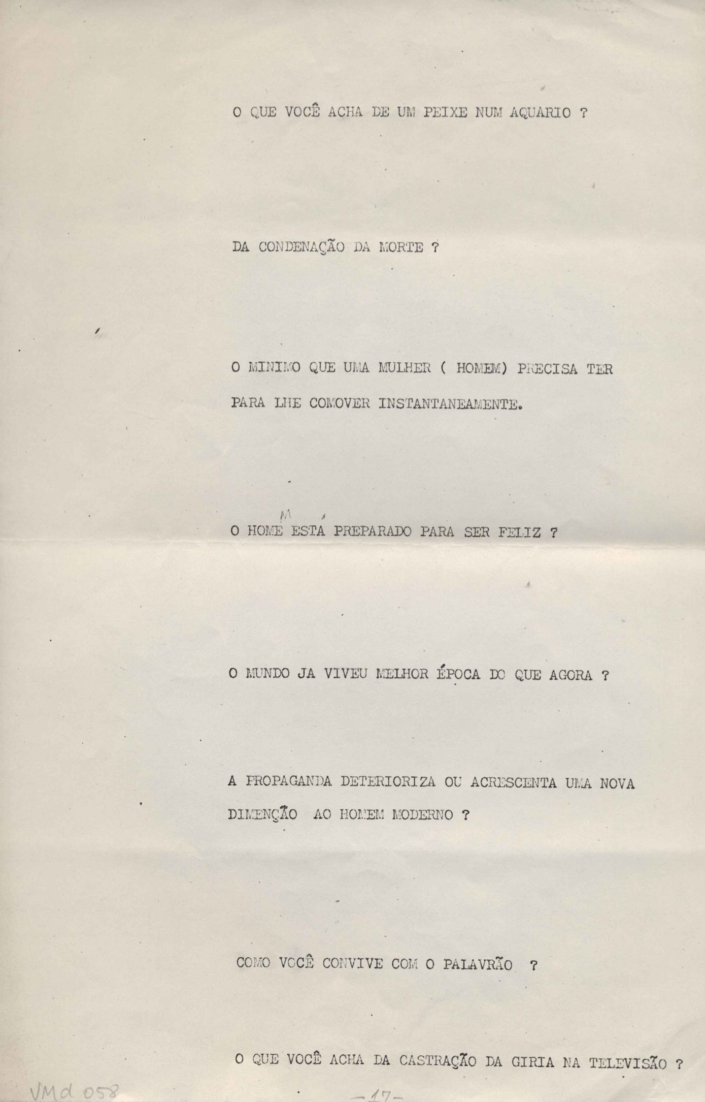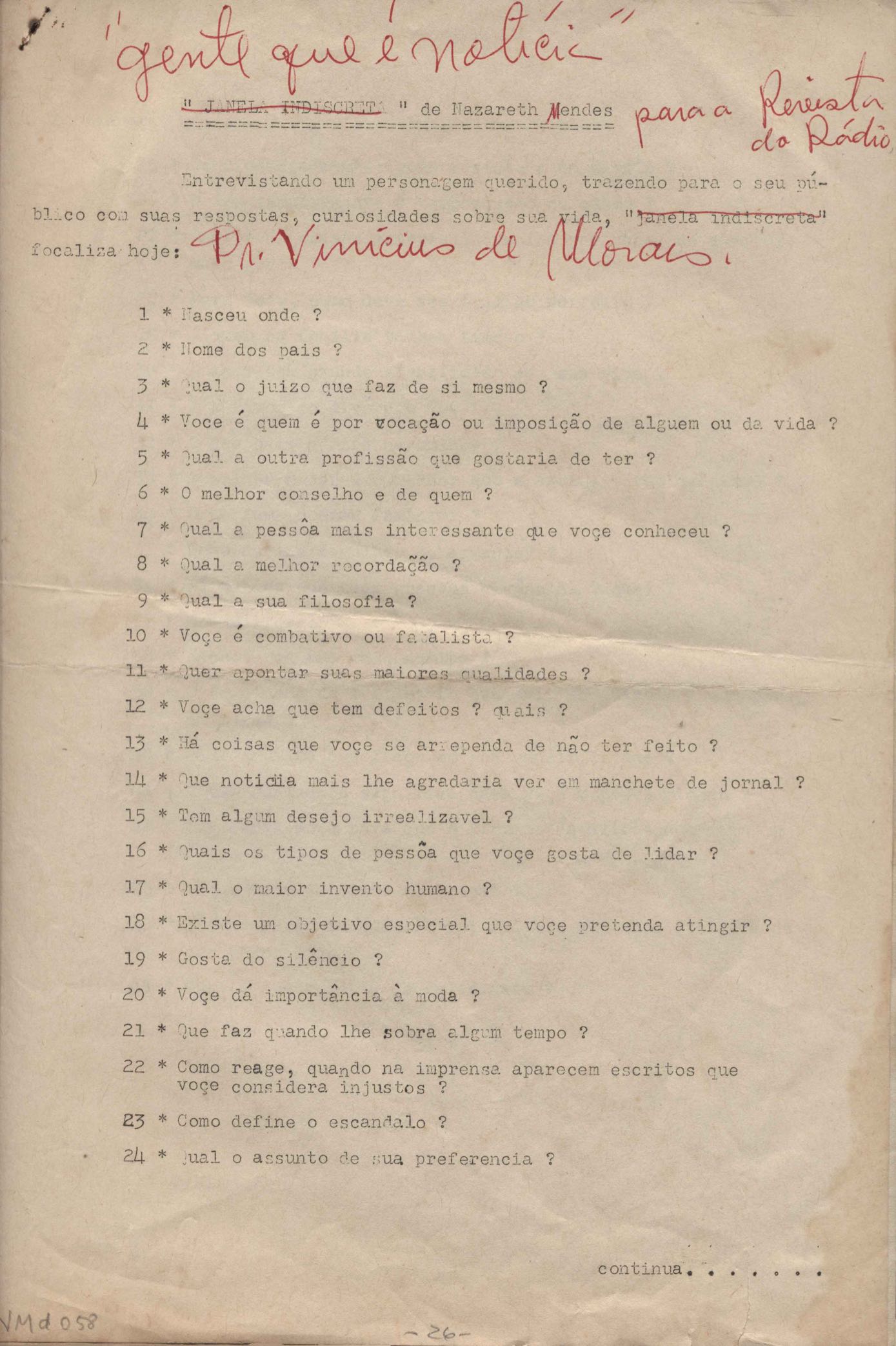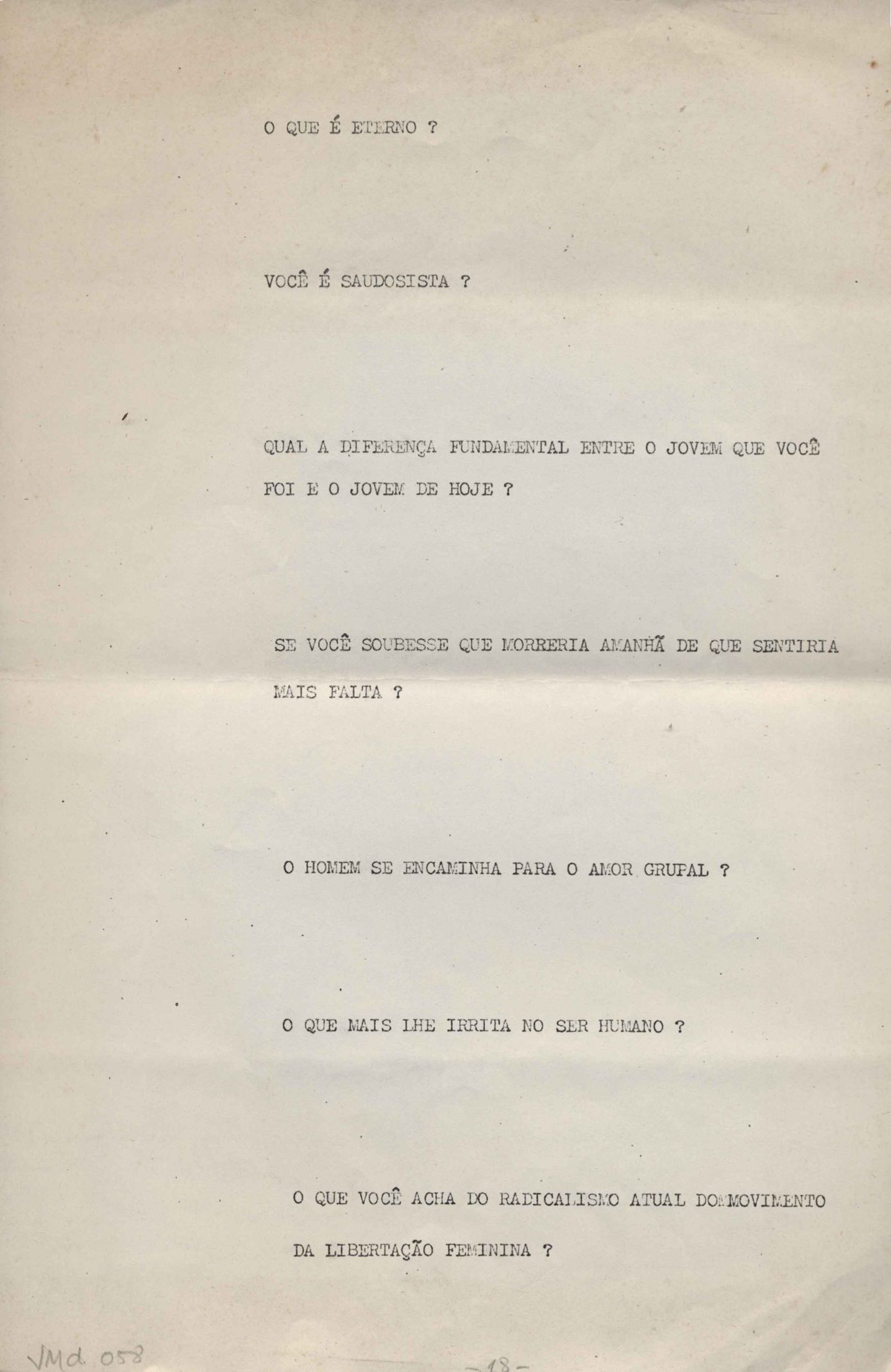 TÍTULO: Perguntas para entrevista com VM