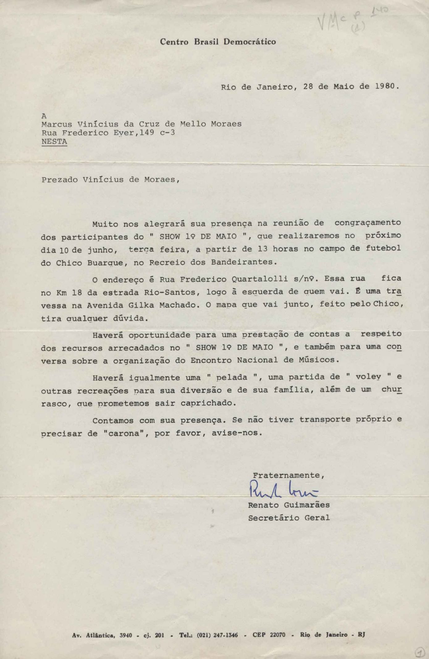 Convite para VM participar de reunião de congraçamento dos participantes do Show 1º de Maio.