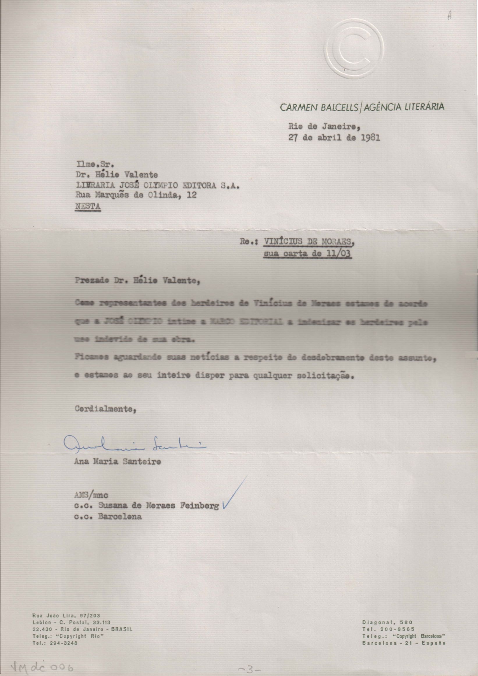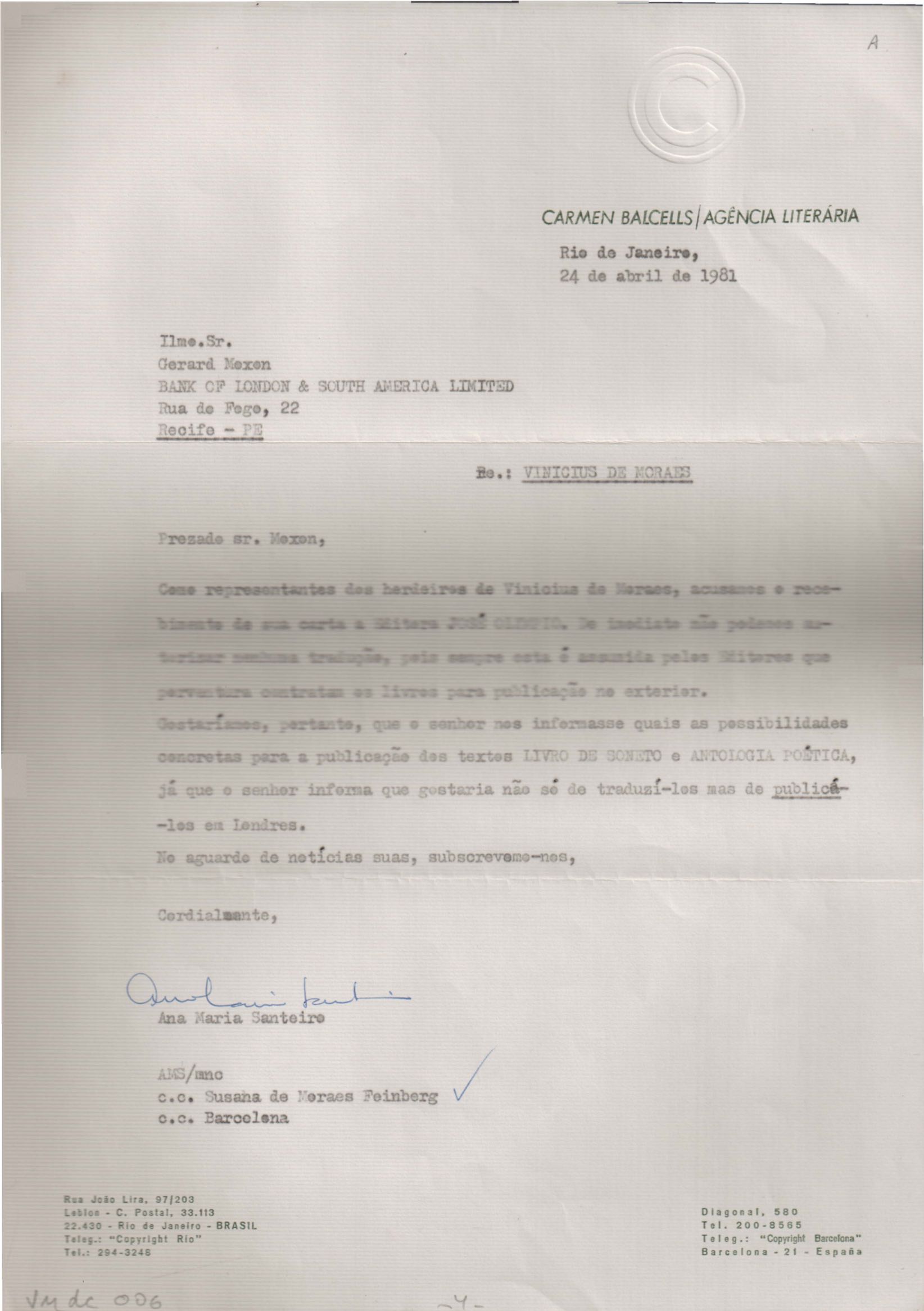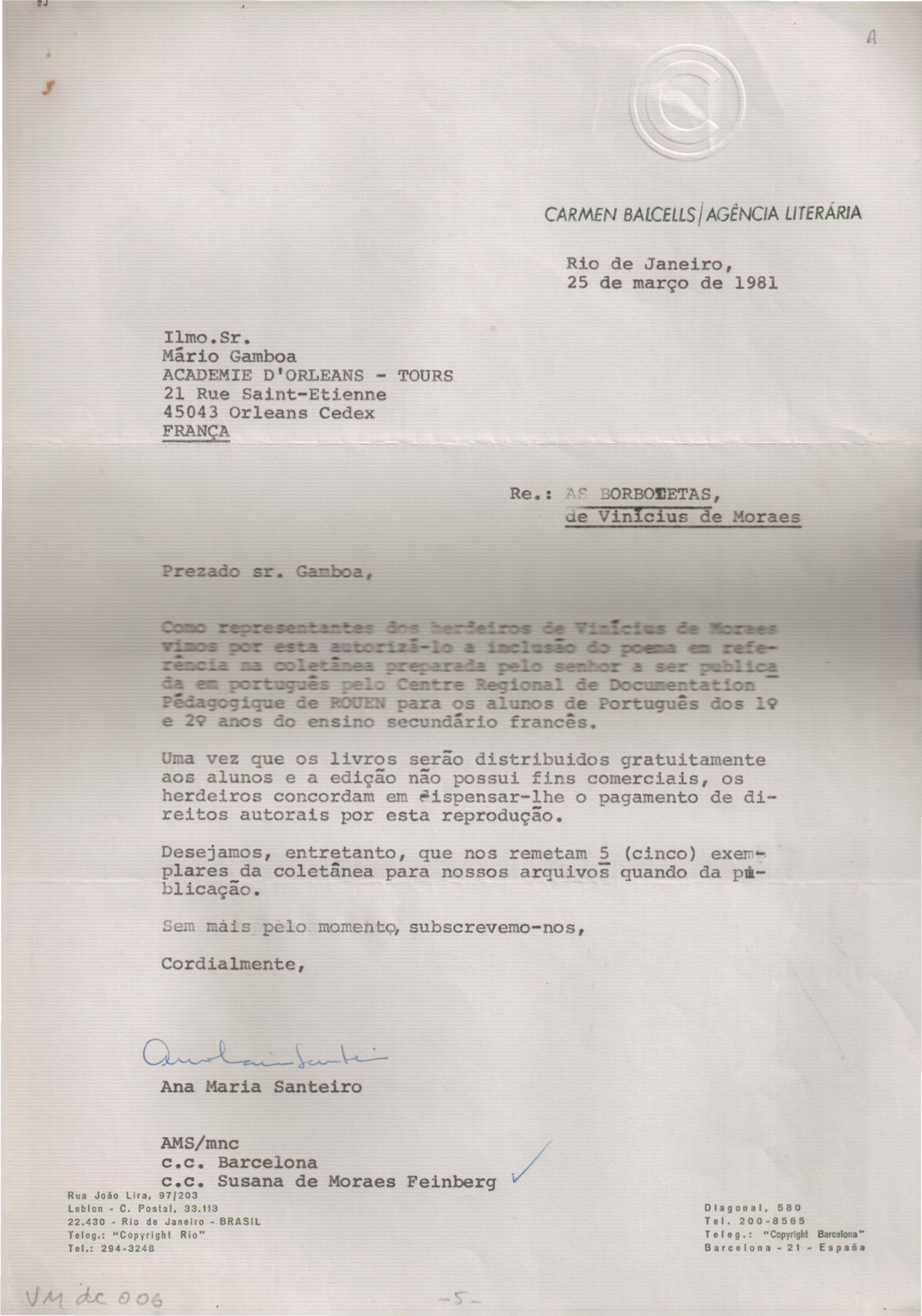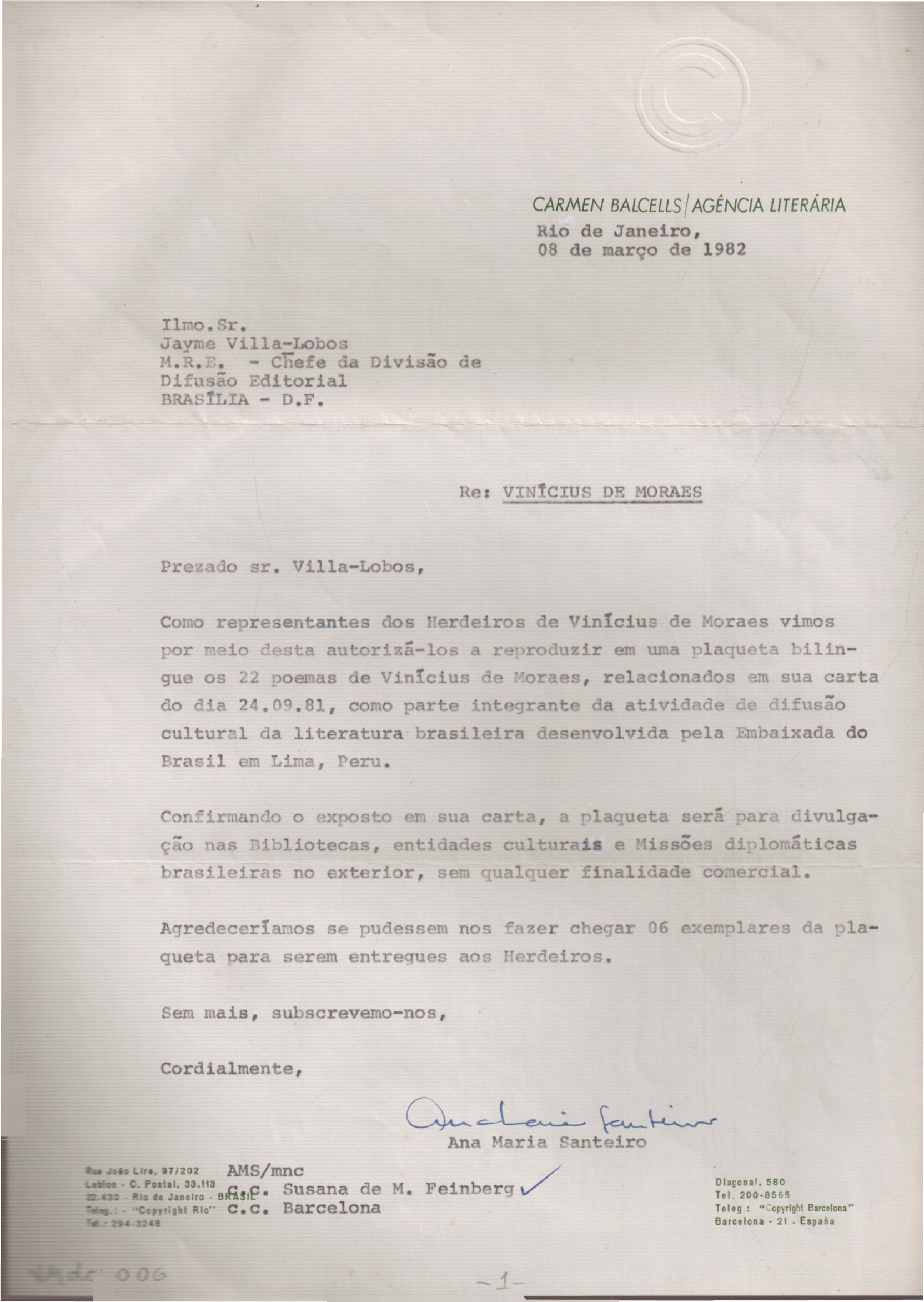Autorização para reprodução de 22 poemas de VM. Anexo: Cartas referentes à autorização para a publicação de obras de VM.
