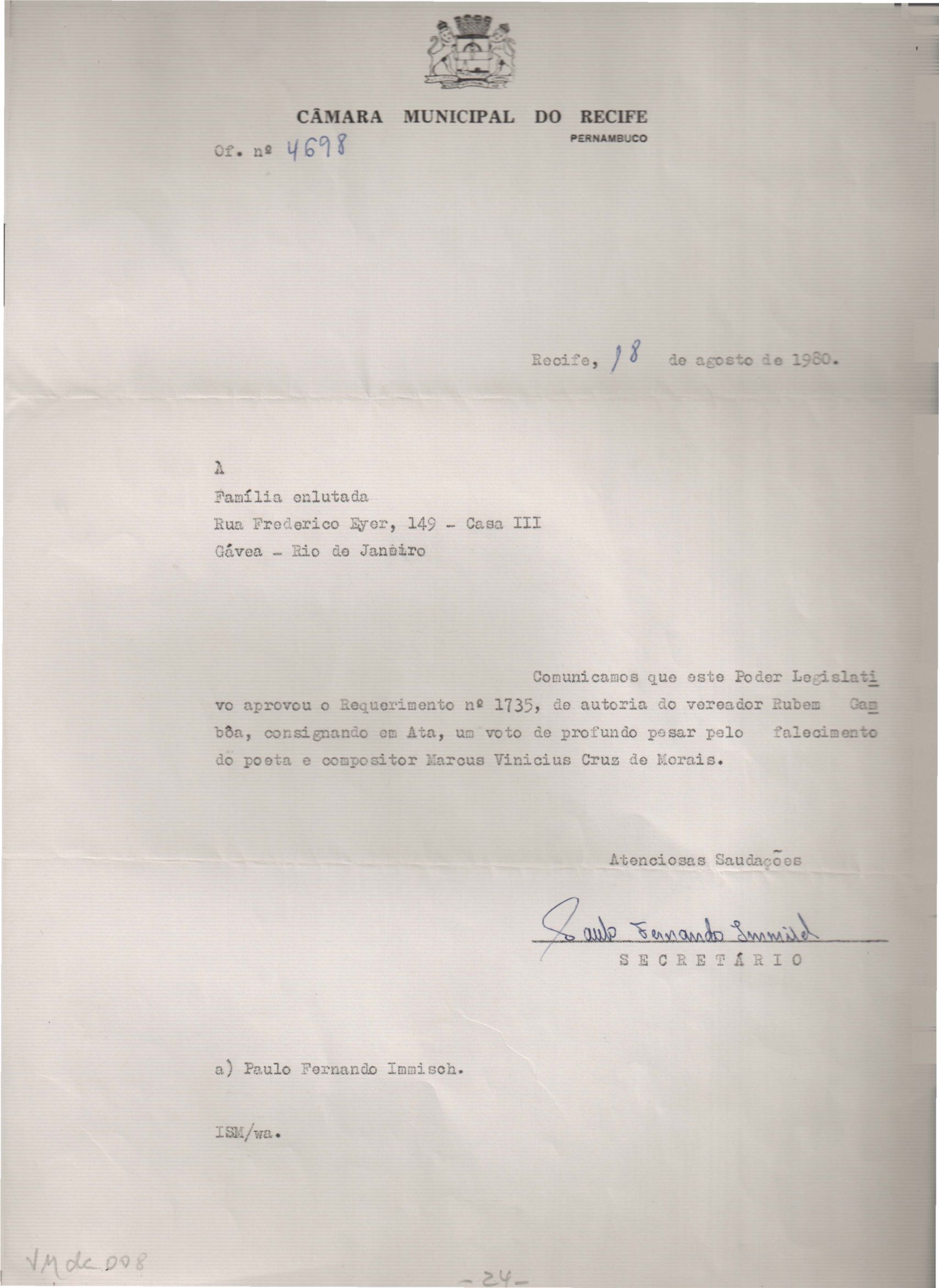 Votos de pesar pelo falecimento de VM