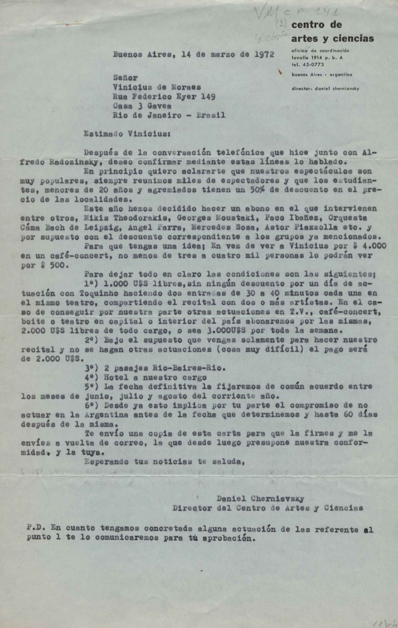 Condições para realização de shows de VM e/ou VM e Toquinho em Buenos Aires.